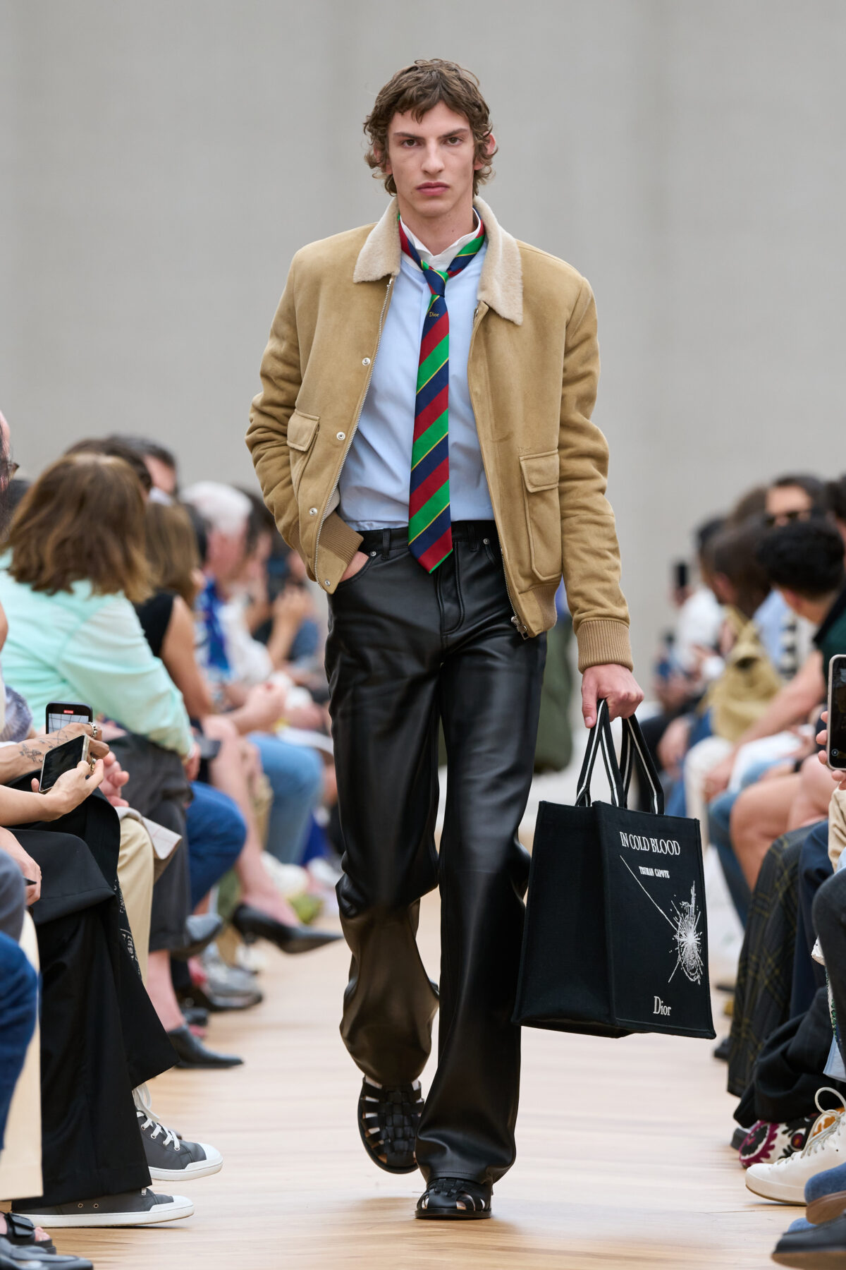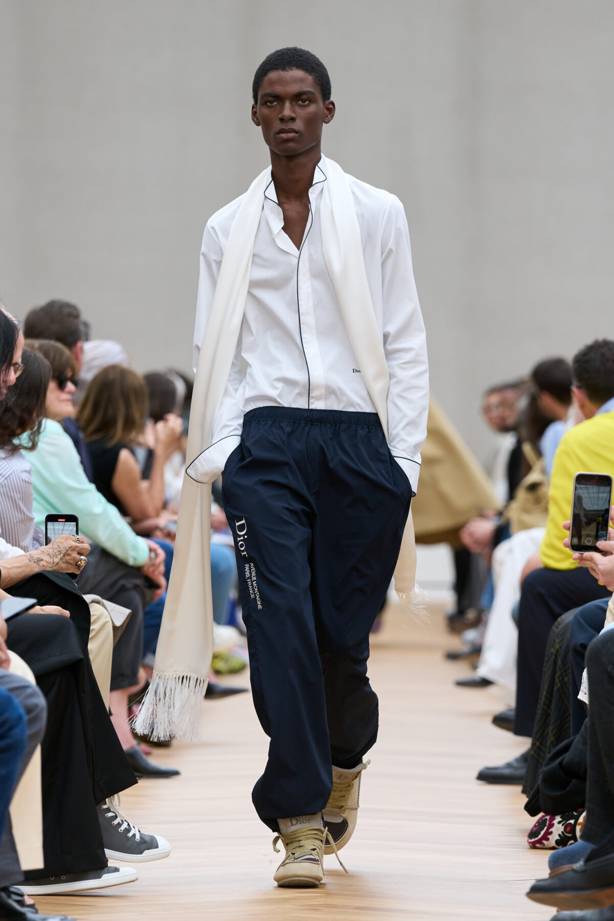 在這當中Jean-Michel Basquiat扮演了甚麼角色?Jonathan特別諮詢了已故藝術家的密友Karen Binns,她受Dior委託製作了一個關於1980年代紐約的播客,邀請了Hilton Als和藝術家Toxic。或許他那種將領帶打結於牛仔恤衫上的天賦在多重領帶過渡中得以體現?如今,恤衫上的領帶是年輕時尚的象徵。這一點有效:這是多代Dior消費者都能認同的風格。