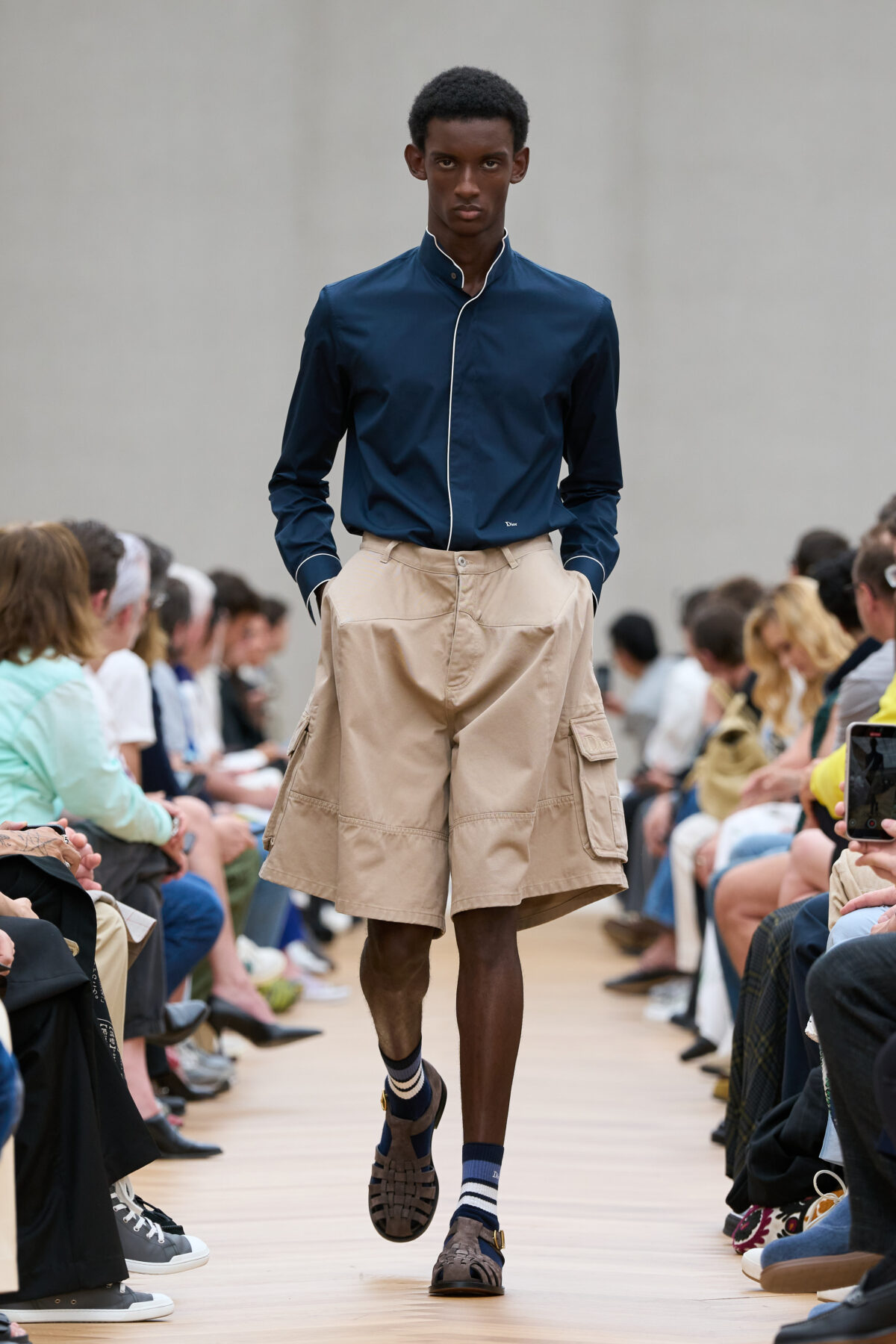 當然,對於Dior本人的處理也至關重要。Jonathan在他的首個造型中直面了Dior。Bar jacket採用了愛爾蘭的Donegal花呢,這對Jonathan來說是一種民族驕傲,並在整個系列中多次出現。至於那件造型中 cargo 短褲上邊緣連接的flanges?那靈感來自Jonathan對1948年Dior冬季高級訂製服裝“Delft”的研究。「這是舊的,它曾經失敗過。這激發了我,」他笑著說,並補充道,「我認為這是歷史、商業、風格和製作之間很好的橋樑。」