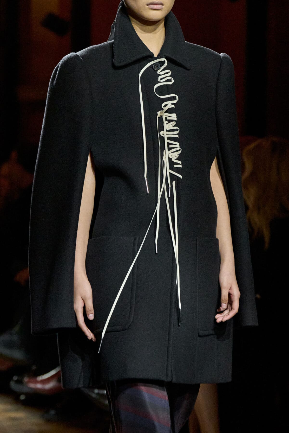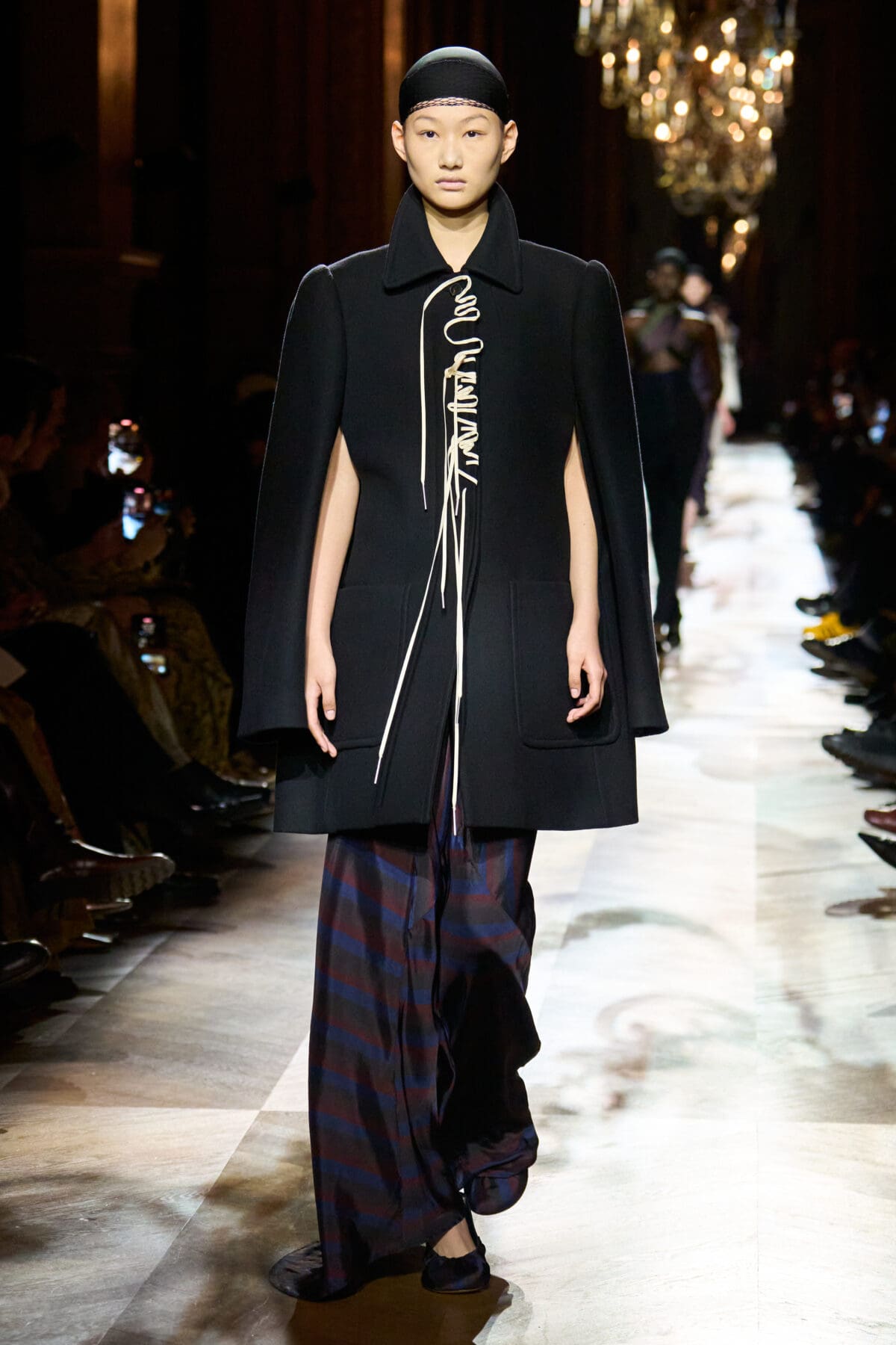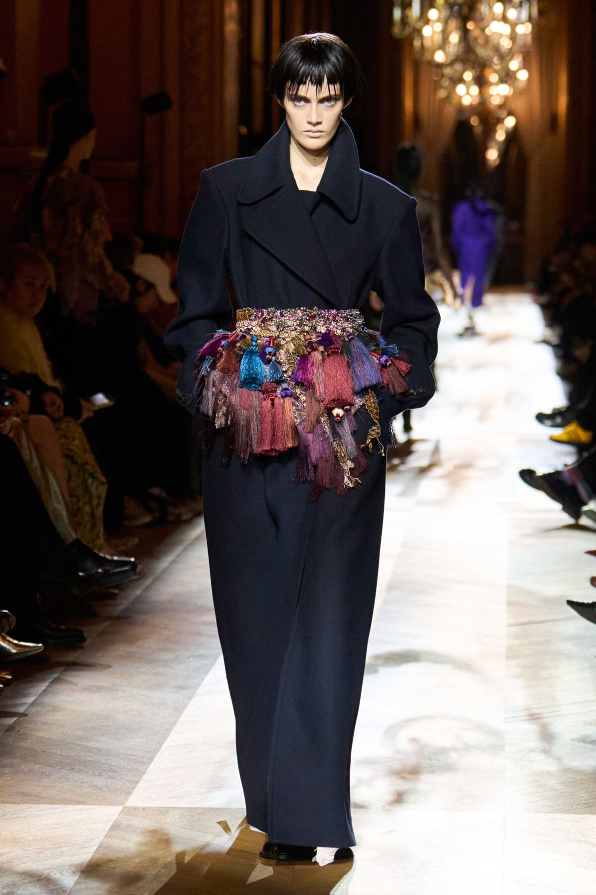 雖然Klausner希望在今個系列展現強力的設計,但考慮到Van Noten著重衣服實用性的理念,他轉為小心地加入有趣細節。他在首個系列重拾初心,訴說自己愛上時尚的故事:「我對於時尚的熱愛起源於家族的衣箱,不同布料間的觸感差異令人著迷。」因此,我們看到黑色外套的袖口與領部被誇張的放大,或變成形狀堅挺的設計,像小孩拿取大人的衣服試穿一樣。同時也有領呔、圍巾、腰帶貫穿造型,使人想到小時候替玩偶搭配造型的手感。
