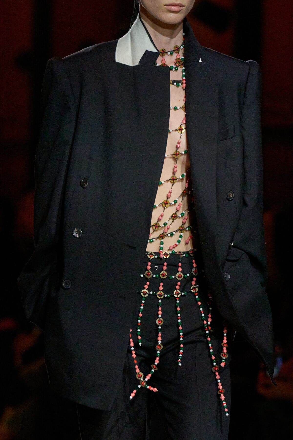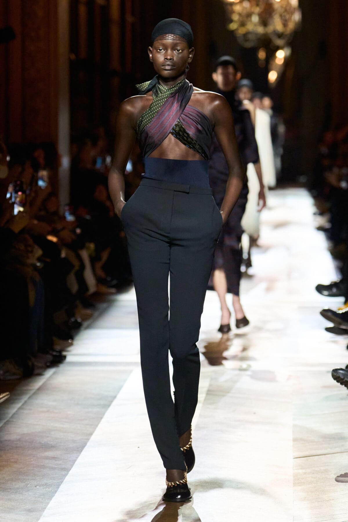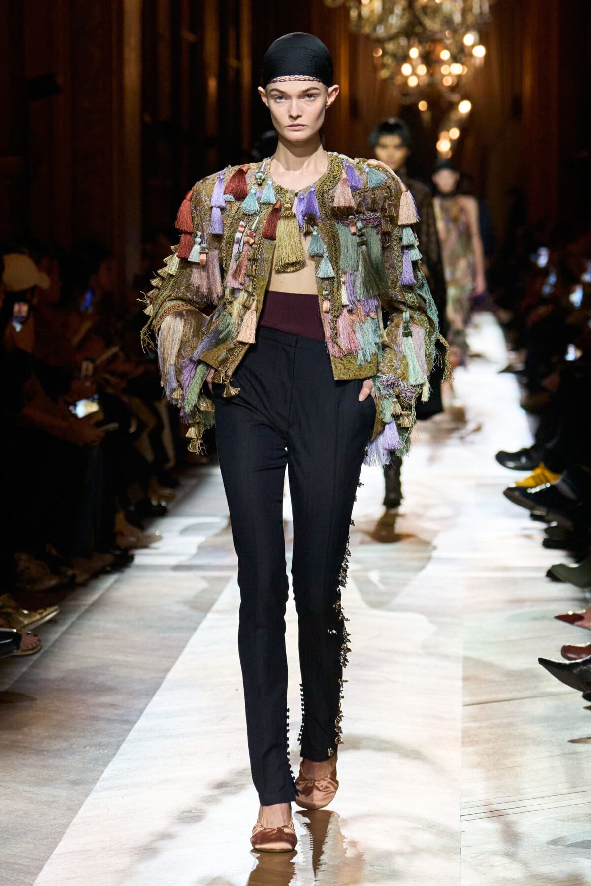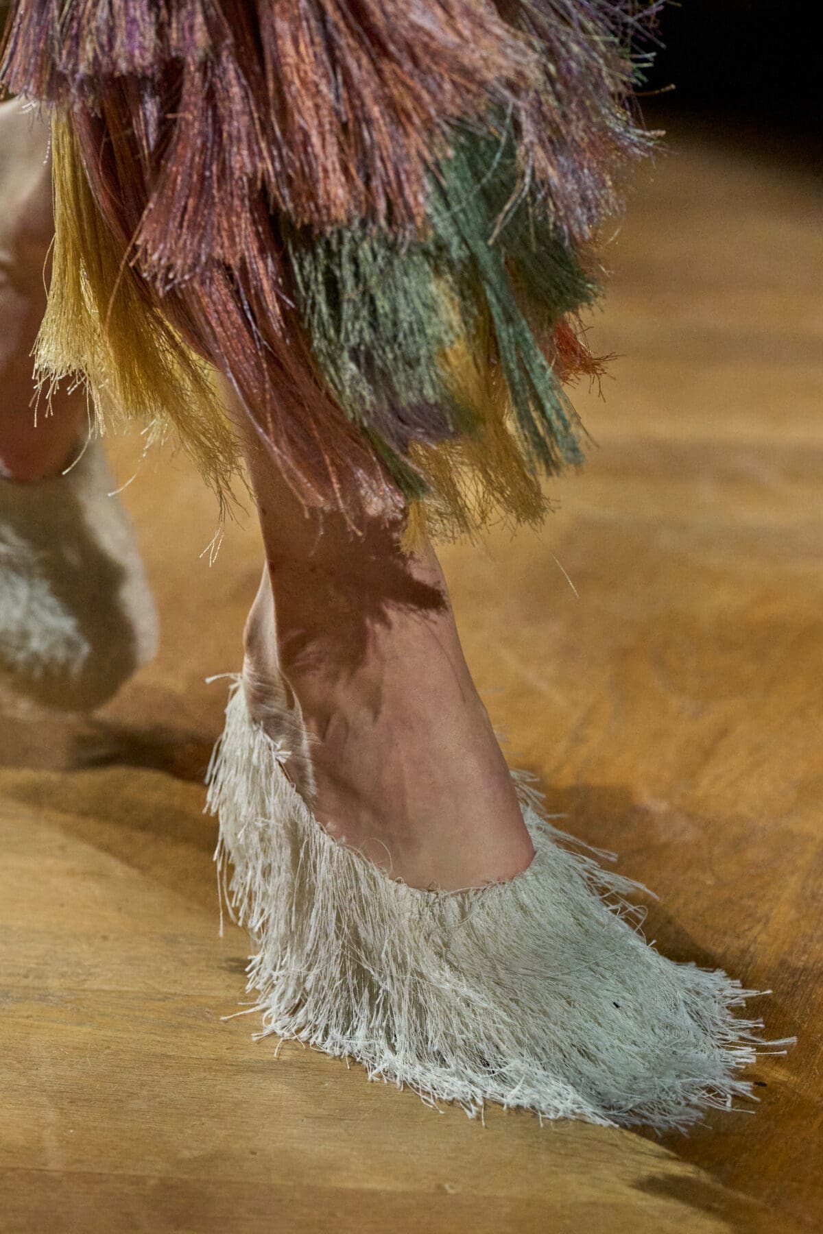 受到歌劇院的啟發,他在造型中穿插天鵝絨、提花地毯、帷幕流蘇等裝飾元素,馬鎧緊身褲的流暢線條則讓人想到舞台上的芭蕾韻律。穿梭幕後的女子,也許會用鞋帶和織物繫出屬於自己的戲服。呼應他的幻想,他在衣服、鞋履和首飾加入鞭縫技法處理的鞋帶,展現即興手工感。