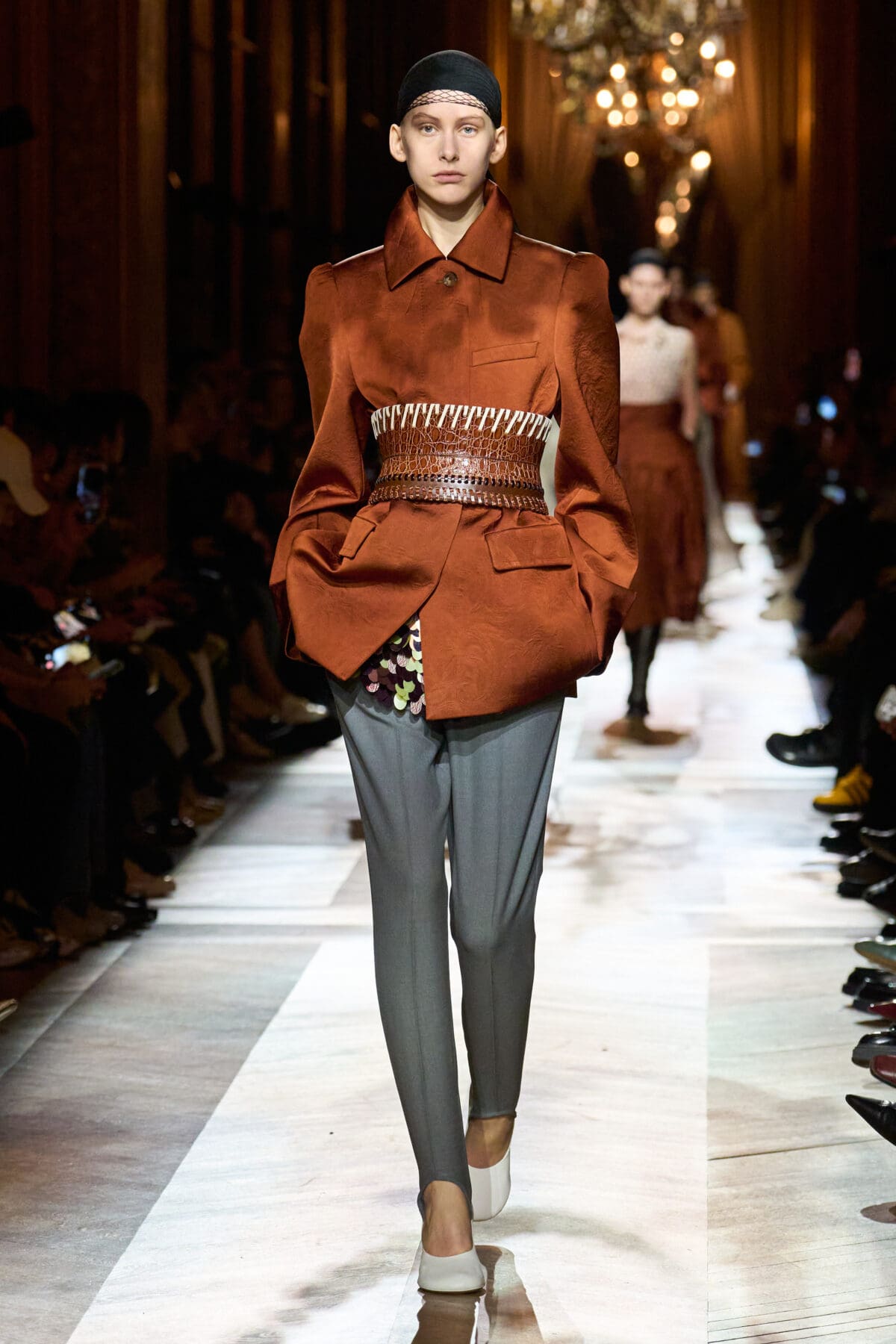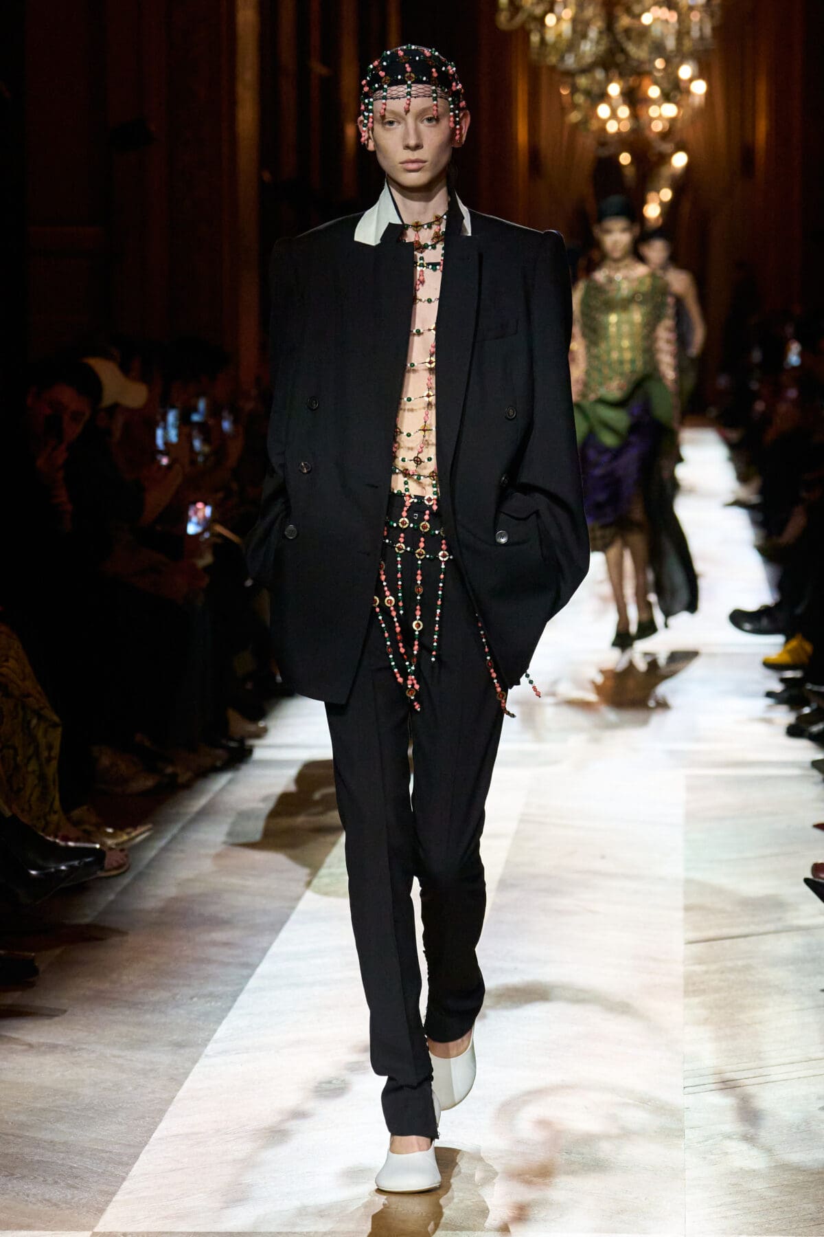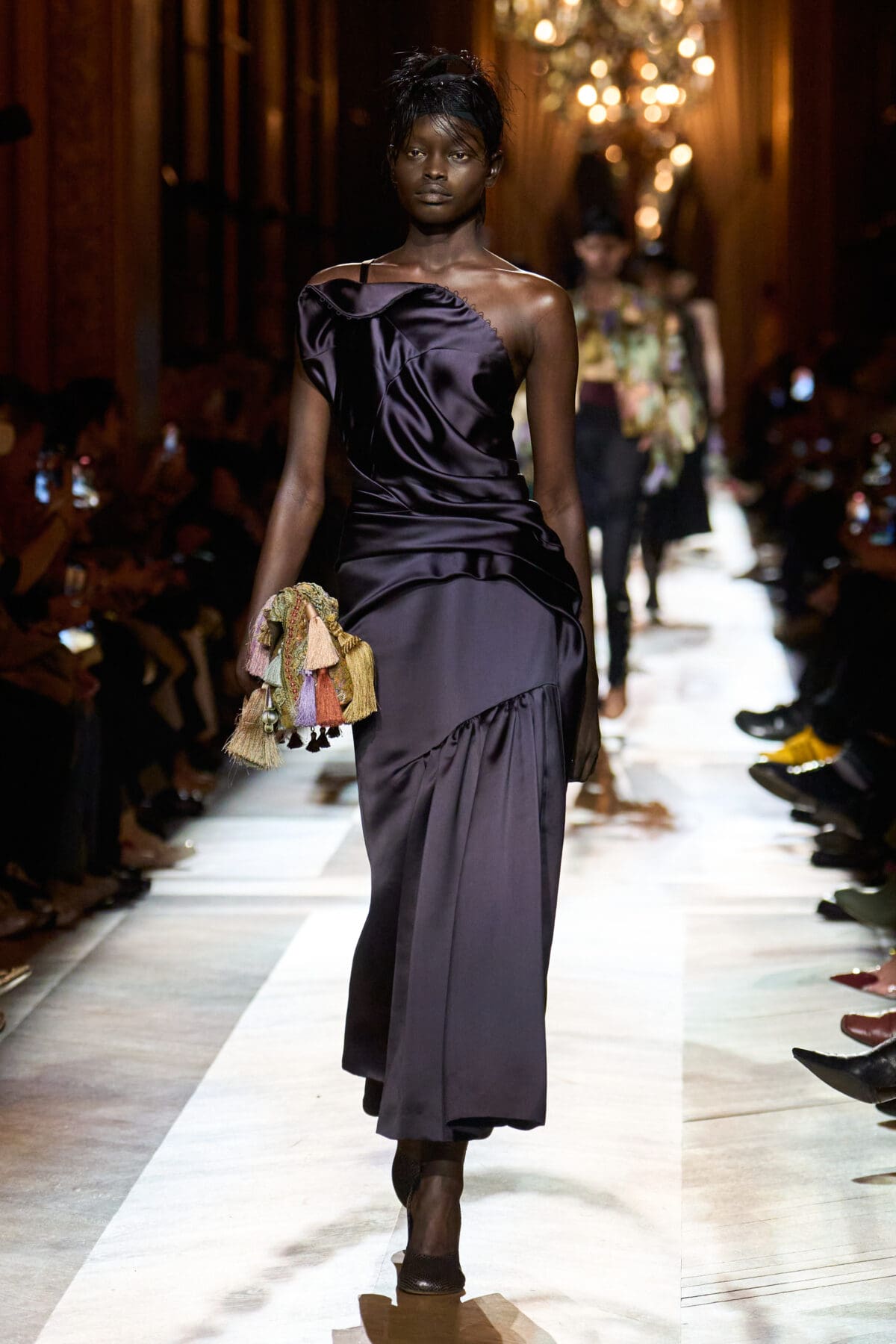 今次時裝展選址像為Julian Klausner隆重開幕,選在宏偉古雅的巴黎歌劇院。跟隨Dries Van Noten 6年時間的Klausner,與Van Noten有著一份默契。以前Van Noten的選址時常給人親密、原始的感覺,今次在巴黎歌劇院,Klausner把焦點搬離舞台,拉向帷幕背後的人與事:「此刻我想像著那些穿越歌劇殿堂的女子,隨手拾取緞帶與織物,以鞋帶在幕後的創作場域中追尋未知問題的答案。」
