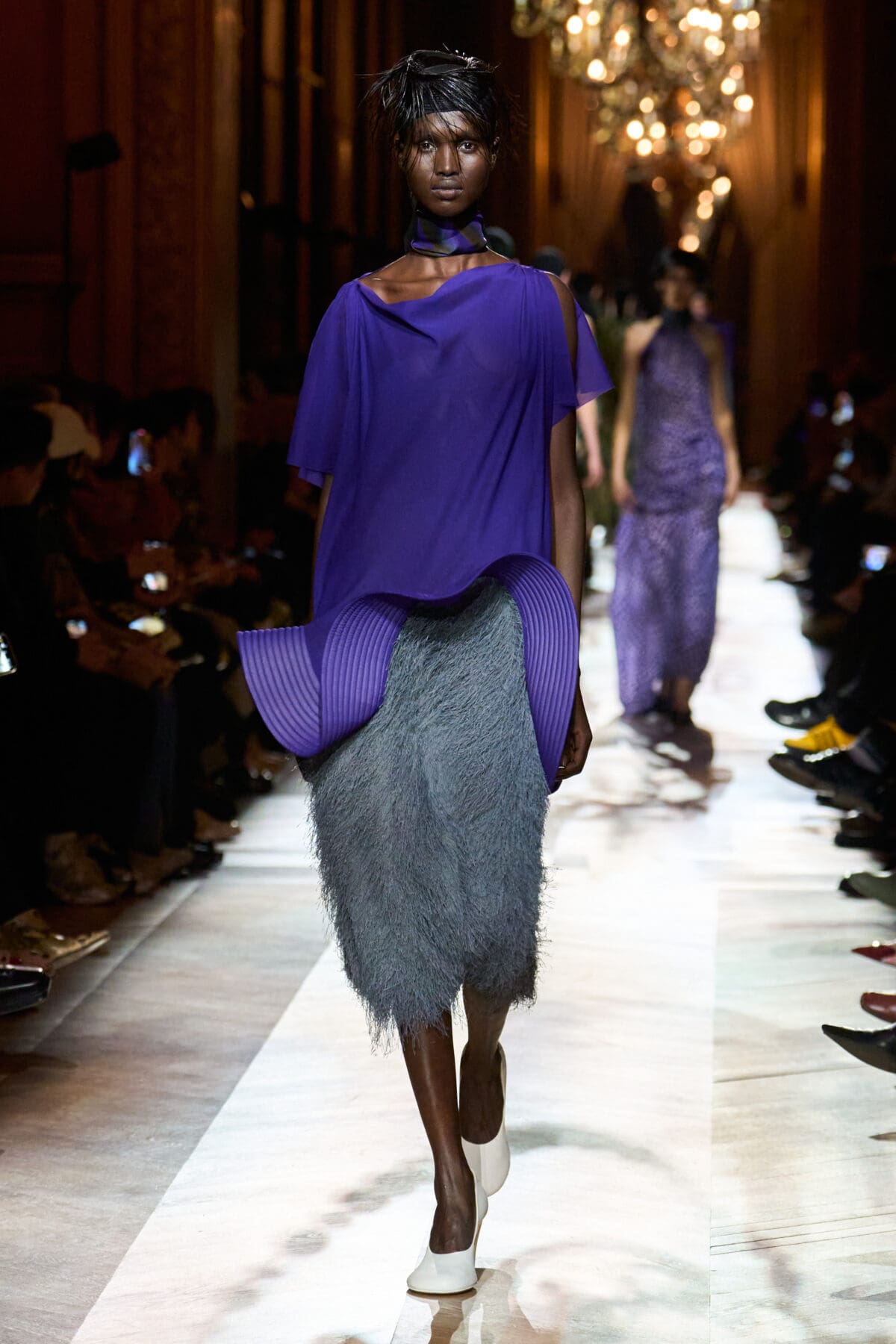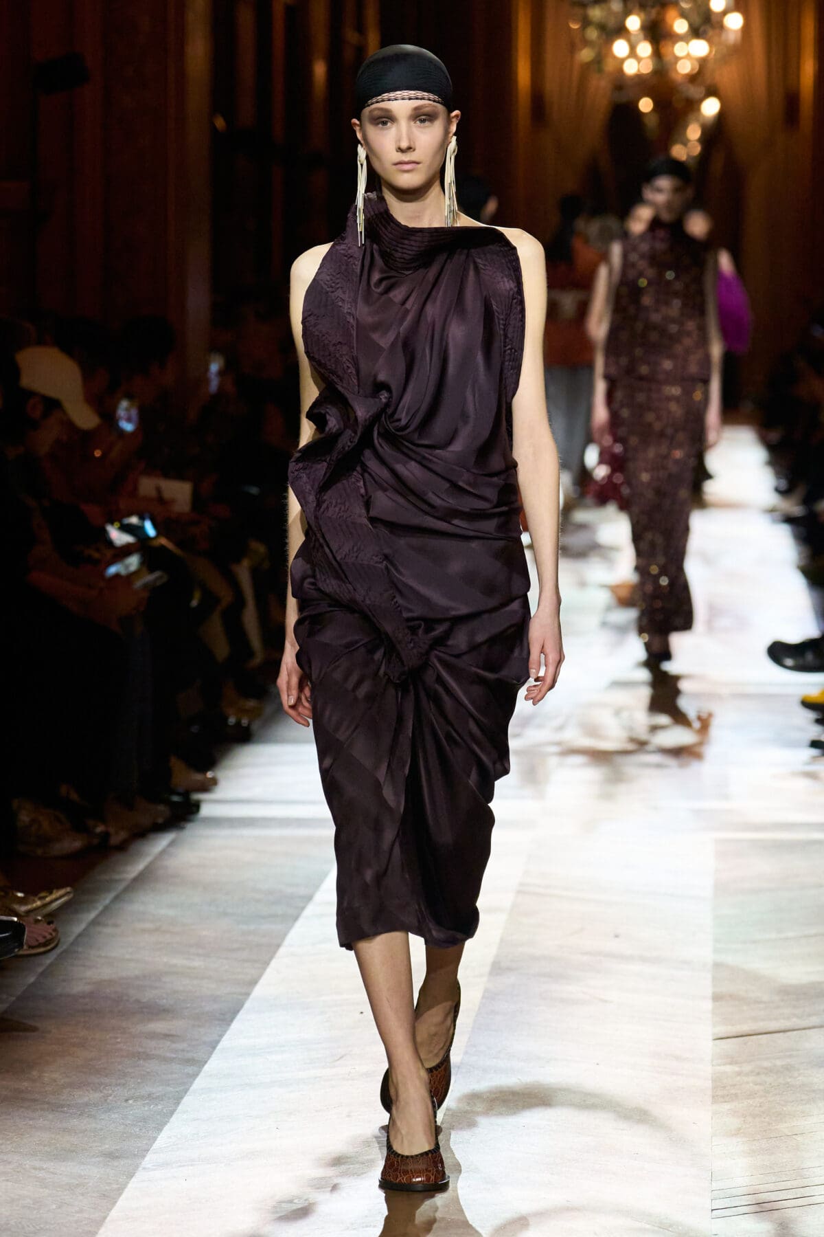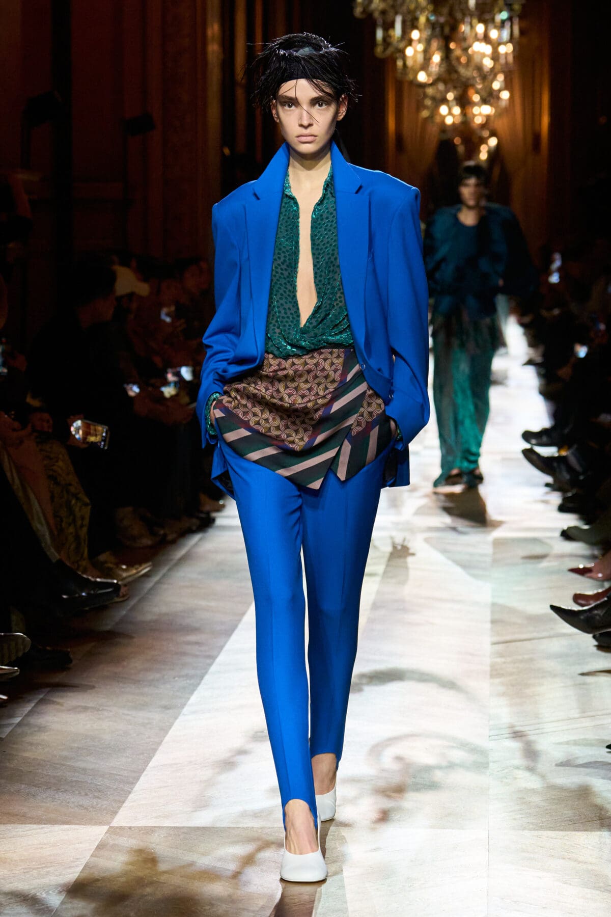 今次時裝展選址像為Julian Klausner隆重開幕,選在宏偉古雅的巴黎歌劇院。跟隨Dries Van Noten 6年時間的Klausner,與Van Noten有著一份默契。以前Van Noten的選址時常給人親密、原始的感覺,今次在巴黎歌劇院,Klausner把焦點搬離舞台,拉向帷幕背後的人與事:「此刻我想像著那些穿越歌劇殿堂的女子,隨手拾取緞帶與織物,以鞋帶在幕後的創作場域中追尋未知問題的答案。」