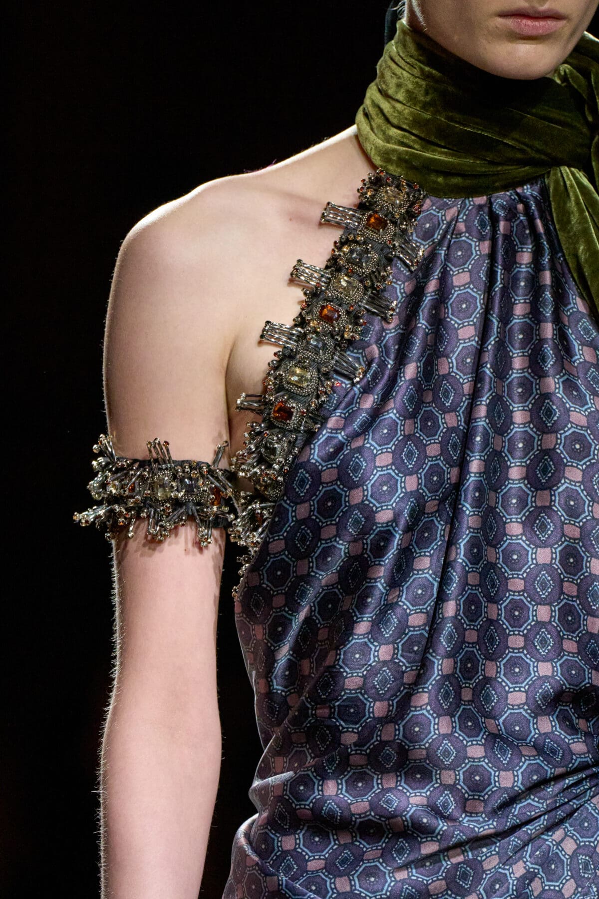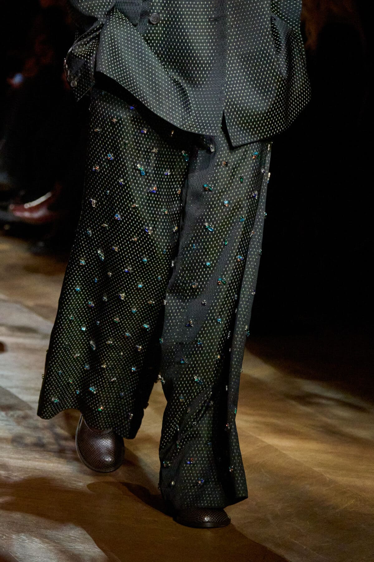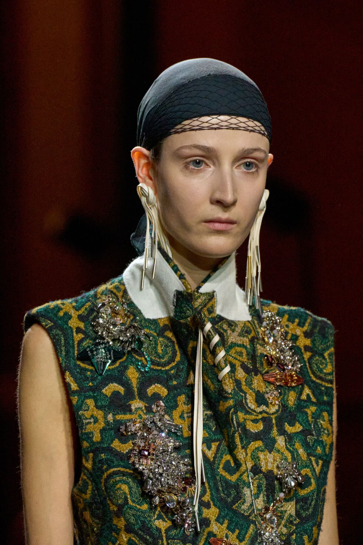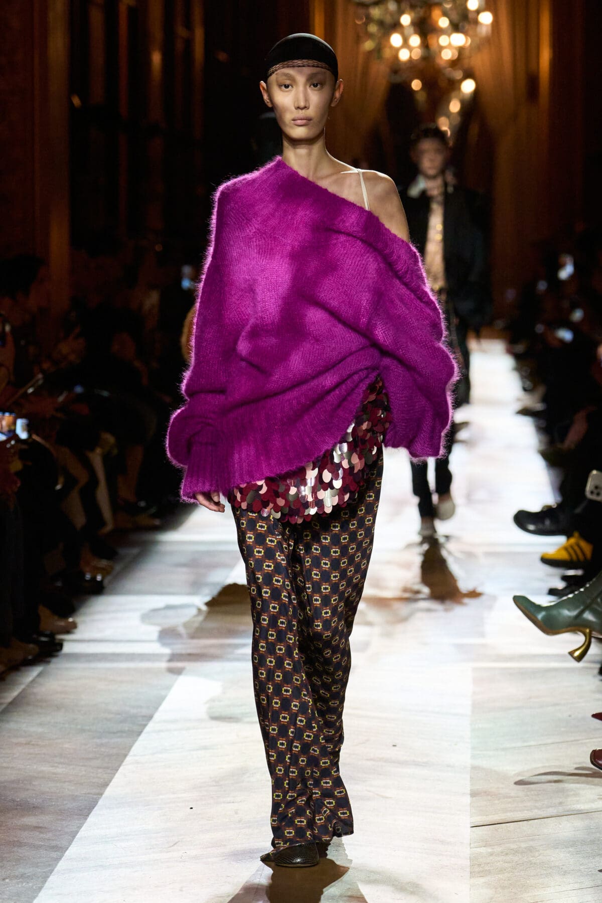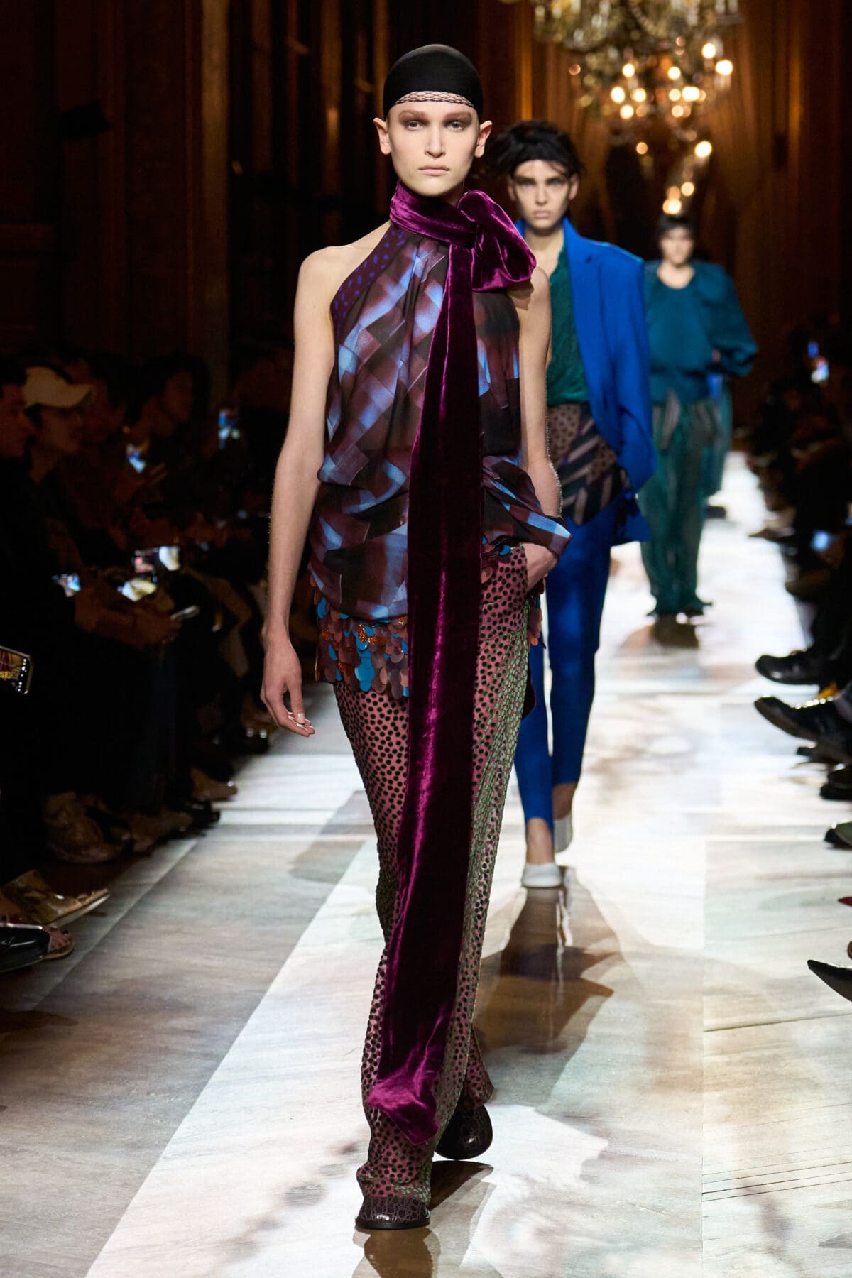 新系列在剪裁、工藝、印花與色彩表現Dries Van Noten的設計語言。優雅流麗的剪裁中總有驚喜,大衣翻領後變為折疊腰線,毛衣單邊滑落帶來不對稱的效果,睡衣式垂褶布料搭配立體絎縫卷邊,以剪裁實力帶來多變設計。模特兒身上的多種印花,如浪漫波希米亞風、活潑波點、經典格紋,在墨綠、石油藍與紫羅蘭的色調下完美交織。Klausner一直欣賞Van Noten以珠飾點綴衣服的做法,今次他在領口、衣服沿邊加入珠飾,把漸變亮片層疊在衣服層次之間,甚至只用珠飾網紗代替上衣。