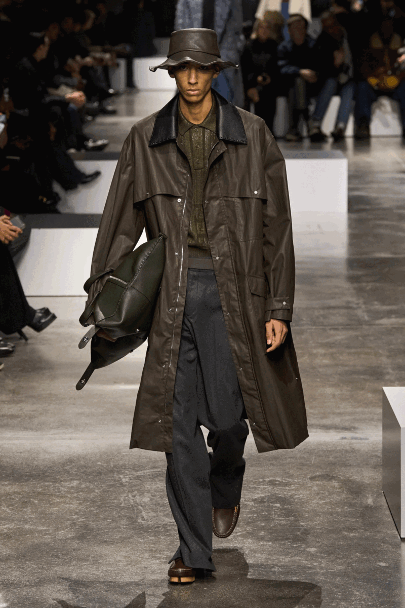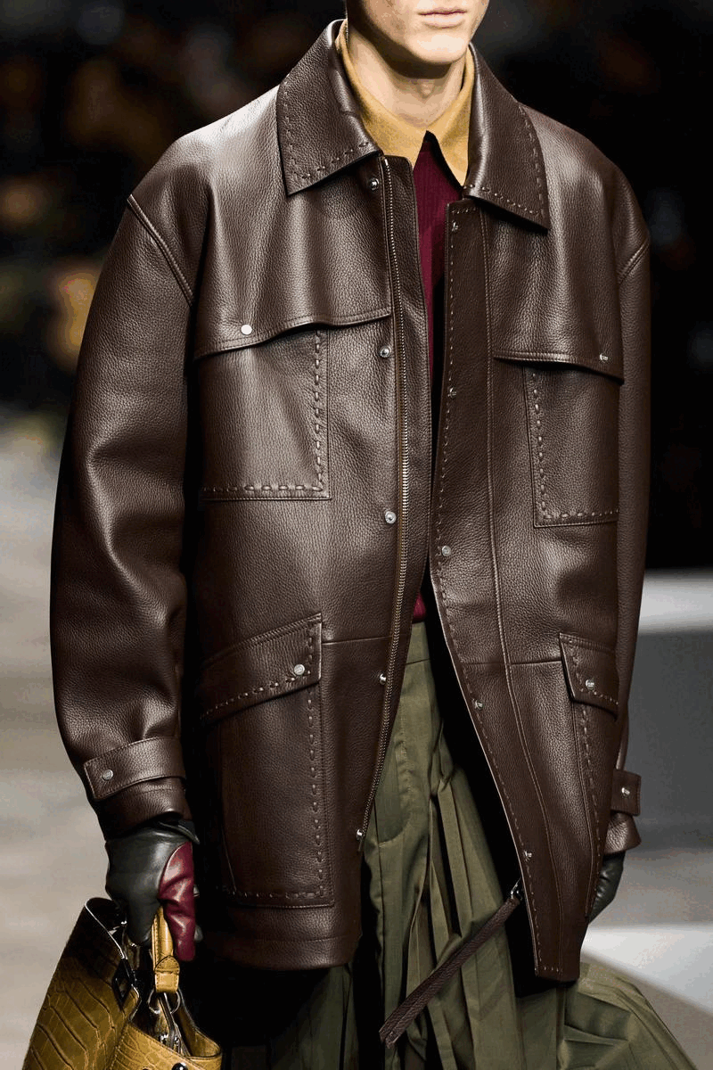由藝術總監Silvia Venturini Fendi設計的2024秋冬系列,物料和用色上都充斥著城市與森林混合的氣息。焦糖棕色、炭黑和森林綠色等色調,加上玉米花藍、丹寧藍、櫻桃紅、草綠等較為亮麗的色彩做小點綴,讓觀者在色調配搭上保持敏銳;同時,品牌在輪廓上也注入細節,服裝造型多偏向長版設計,功能性十足的對稱外套,並加插蘇格蘭裙、長款裙褶短褲以及皮質威靈頓靴等元素,讓設計更豐富也能呼應主題。部分外套加上Selleria皮革領口,用料上則選擇皮質和防水蠟面等多變材質,整體輪廓寬鬆卻不會過分累贅,帶出慵懶氛圍;不僅如此,洗水牛仔和織物的運用,都為系列帶來相當豐富的設計元素,展現品牌美學與精細造工。