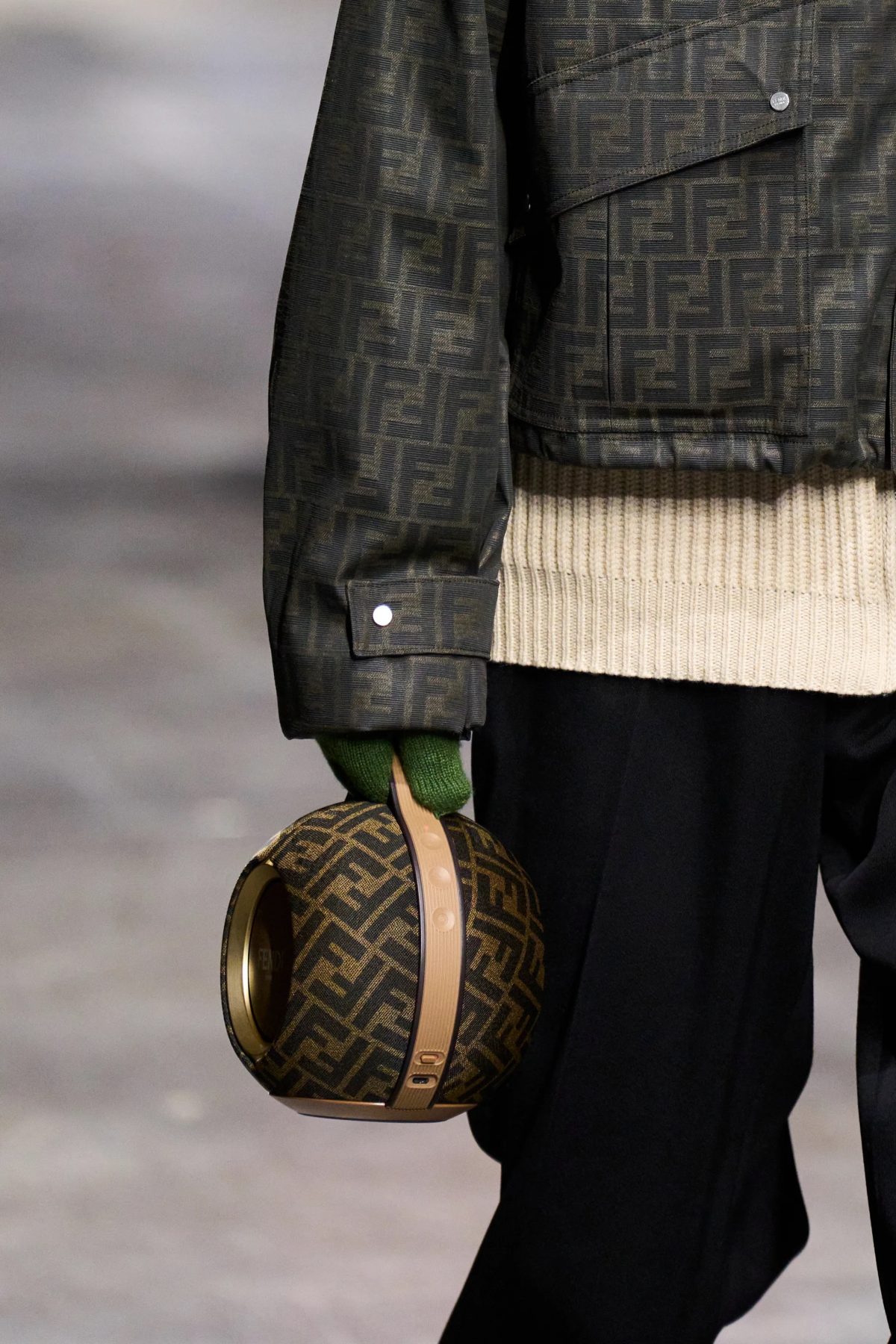 至於配飾,新系列同樣包含各款手袋,大小各異,用色偏向沉實,與系列服裝相互呼應。值得一提的是,Fendi積極拓展服裝以外的領域。在這次秋冬時裝騷中,他們展示了Fendi x Devialet Mania便攜式手持音箱,使用棕色和煙草色搭配金色或灰色、以及黑色搭配銀色的技術FF外殼,被放到模特兒的穿搭中,與時裝系列融為一體,化成時尚配飾的一部分。從放大圖中所見,360度立體音箱因為結構設計,帶點未來感的球形設計,能在不同環境下調整音色,提供出色的音頻純度,絕對是時尚界的一大進步。