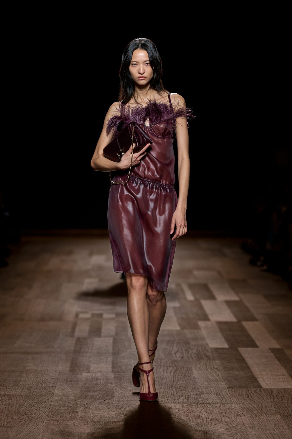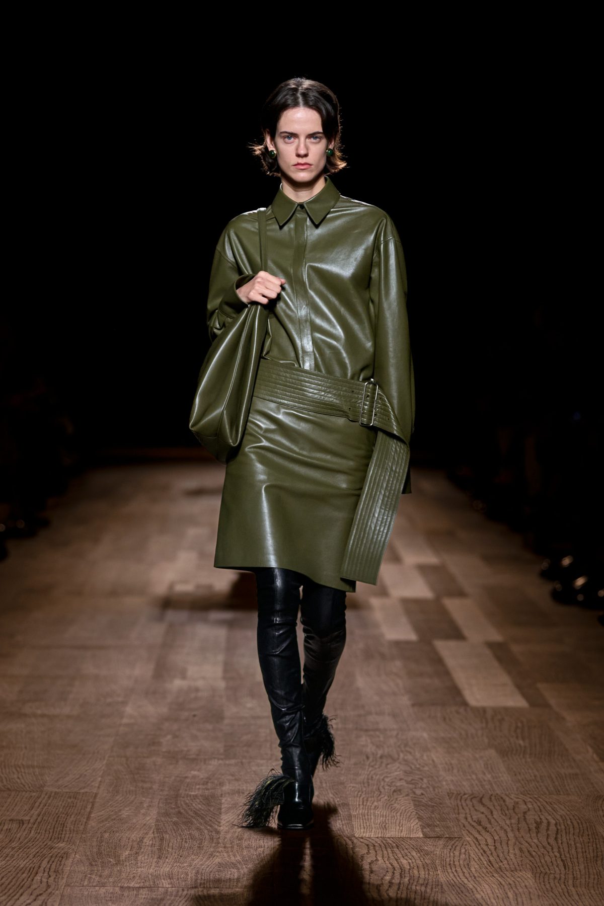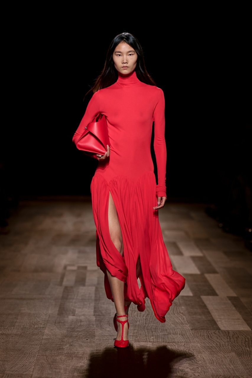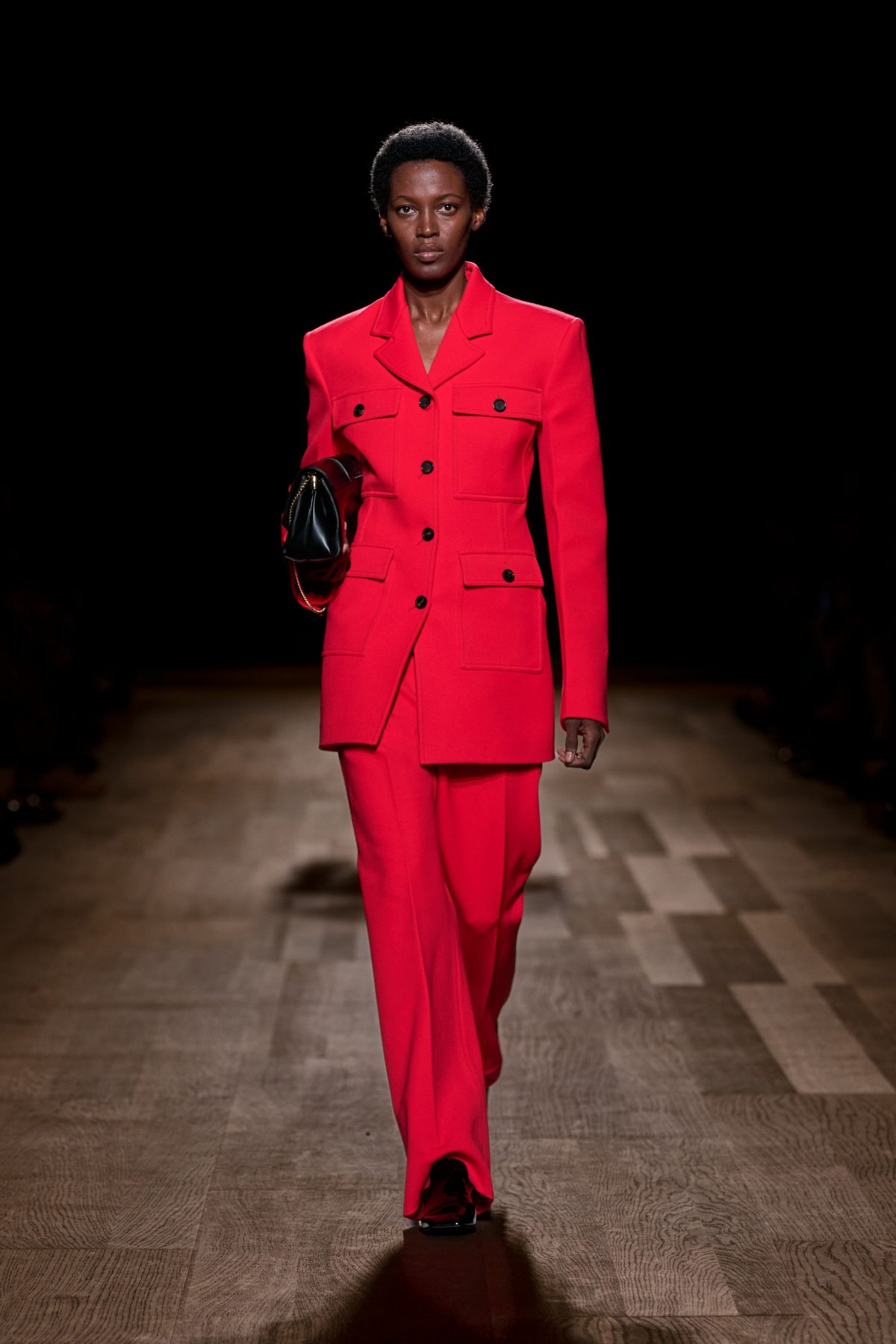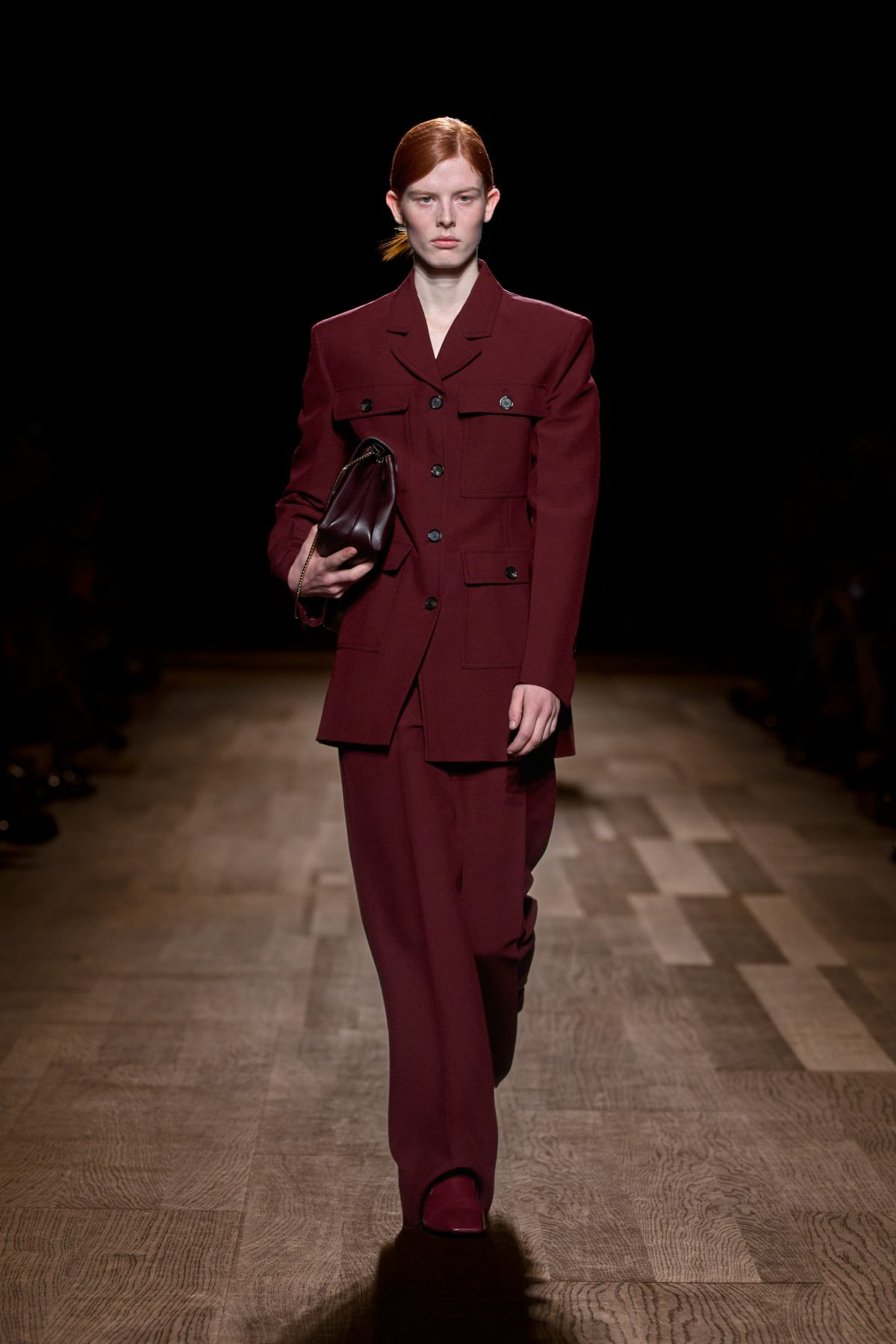 就整體趨勢而言,單色系趨勢在這裡依然能夠感受到餘熱,不論是鮮豔的亮紅和莓紅,還是柔和的橄欖綠和山楂紅,都佔據主場。整個系列猶如流水,絲滑細緻,乳膠皮質、羊毛大衣增添奢華氣質,但又不會產生遙遠的距離感。