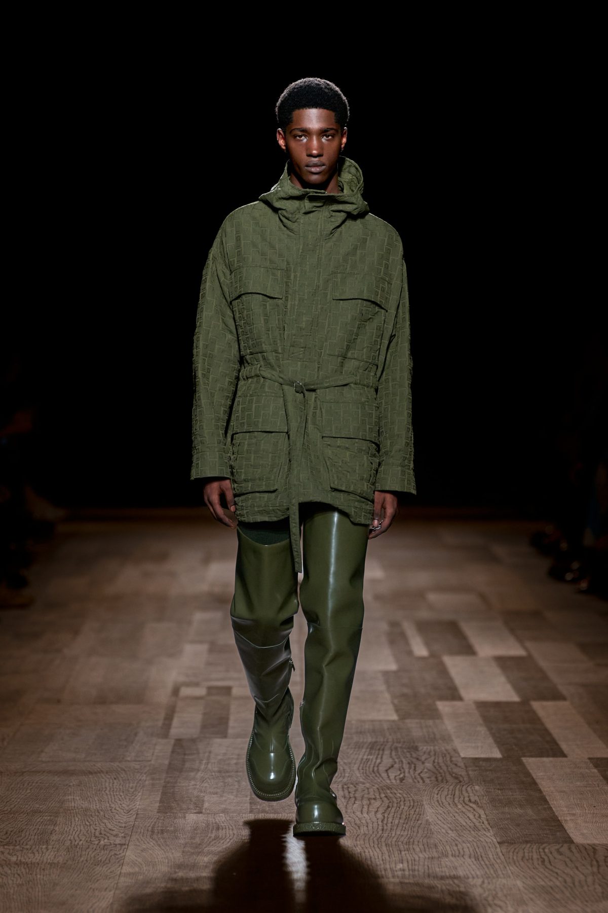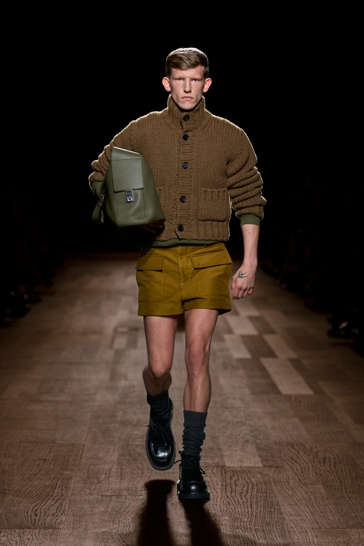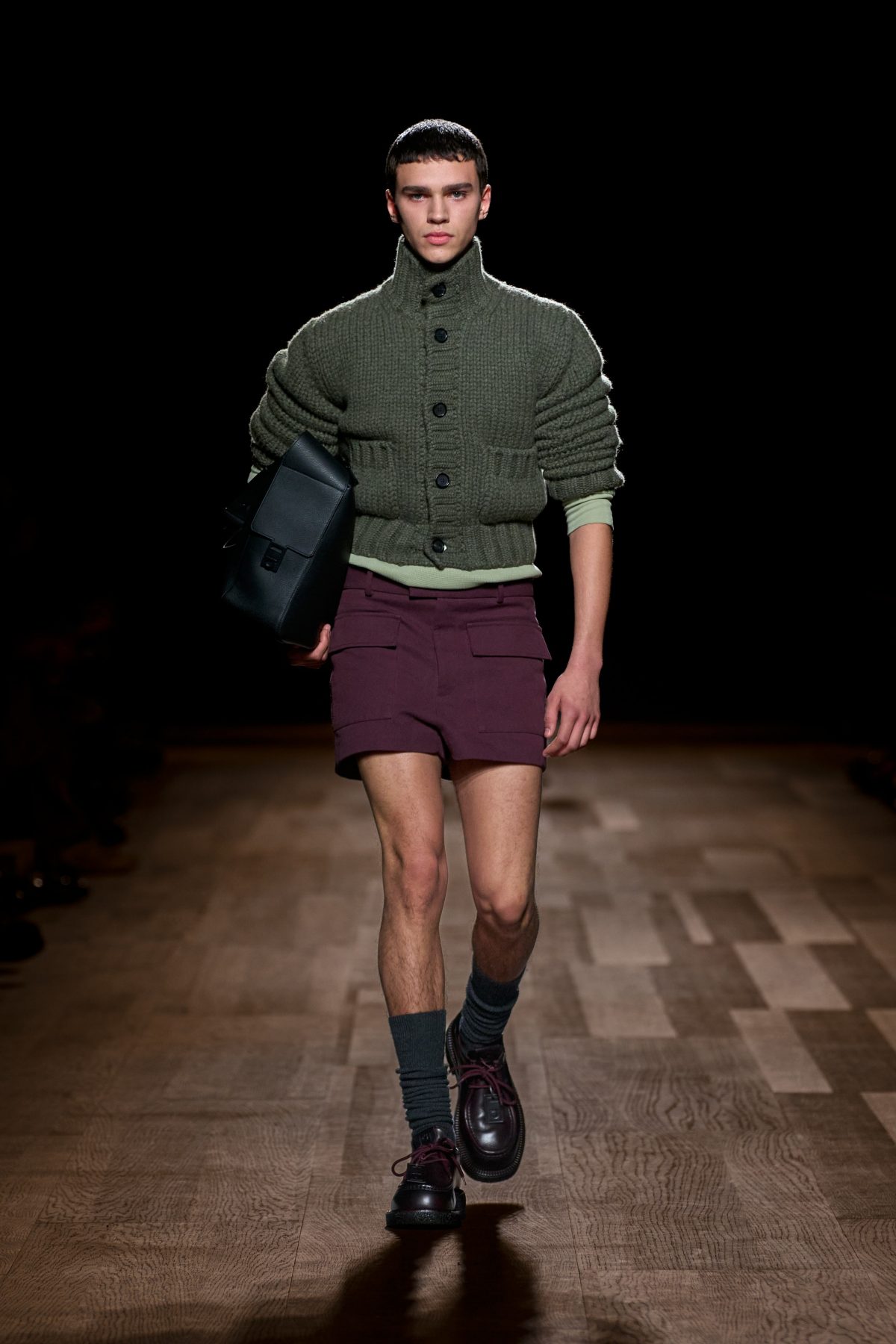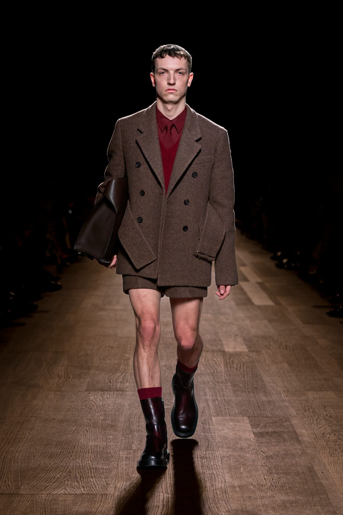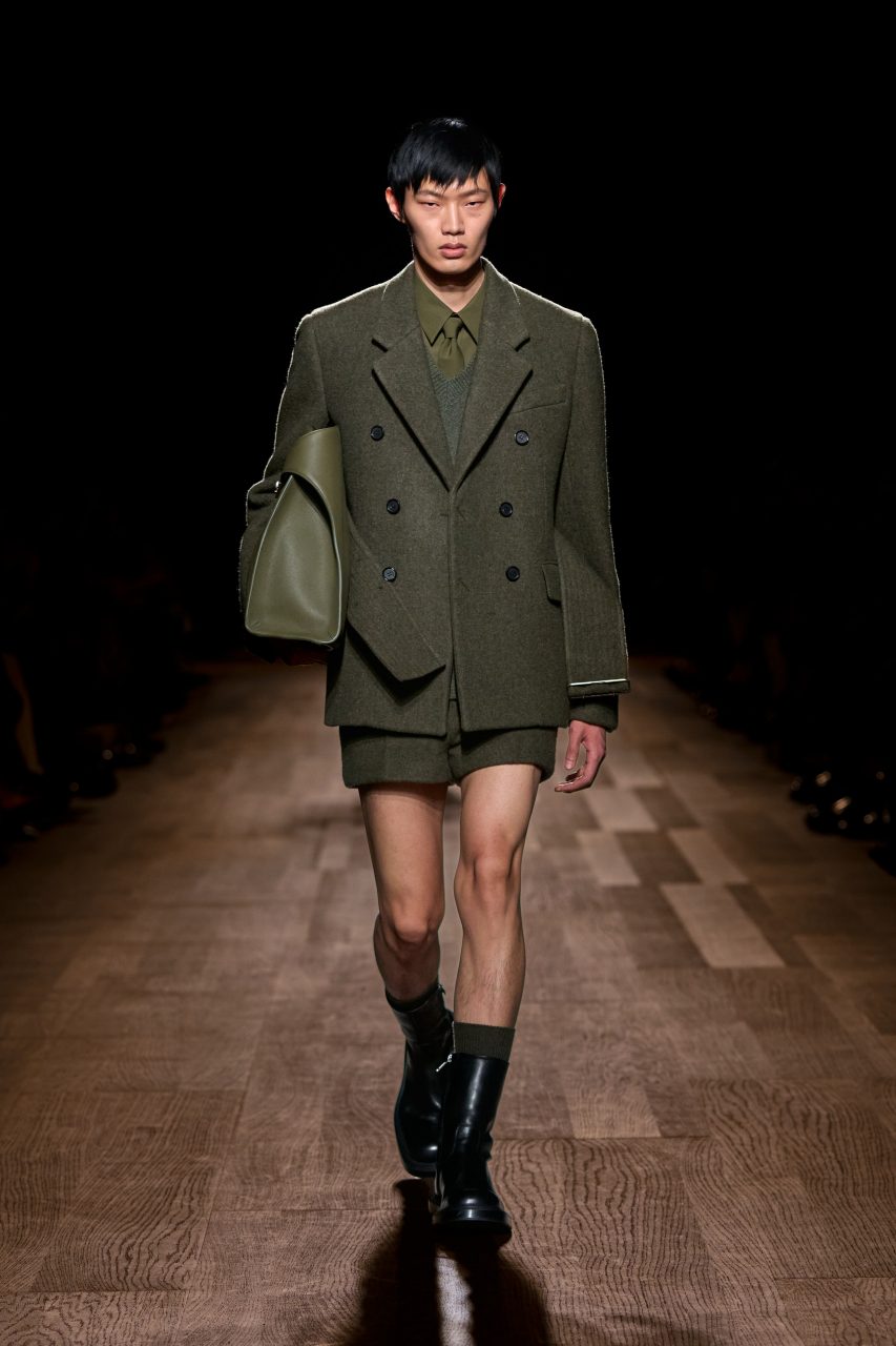 鞋履方面,女裝的高筒靴桶男裝短褲有趣地搭配在一起,配有流蘇裝飾像鳥巢一般的鞋履和橄欖綠的樣貌大衣搭配,內搭絲質長裙,看起來既有高格調的品質,但又流露出一絲挑逗的趣味。還有秋季的粗呢貿易搭配男裝短褲的趣味對比,都讓一切變得更加有韻味。