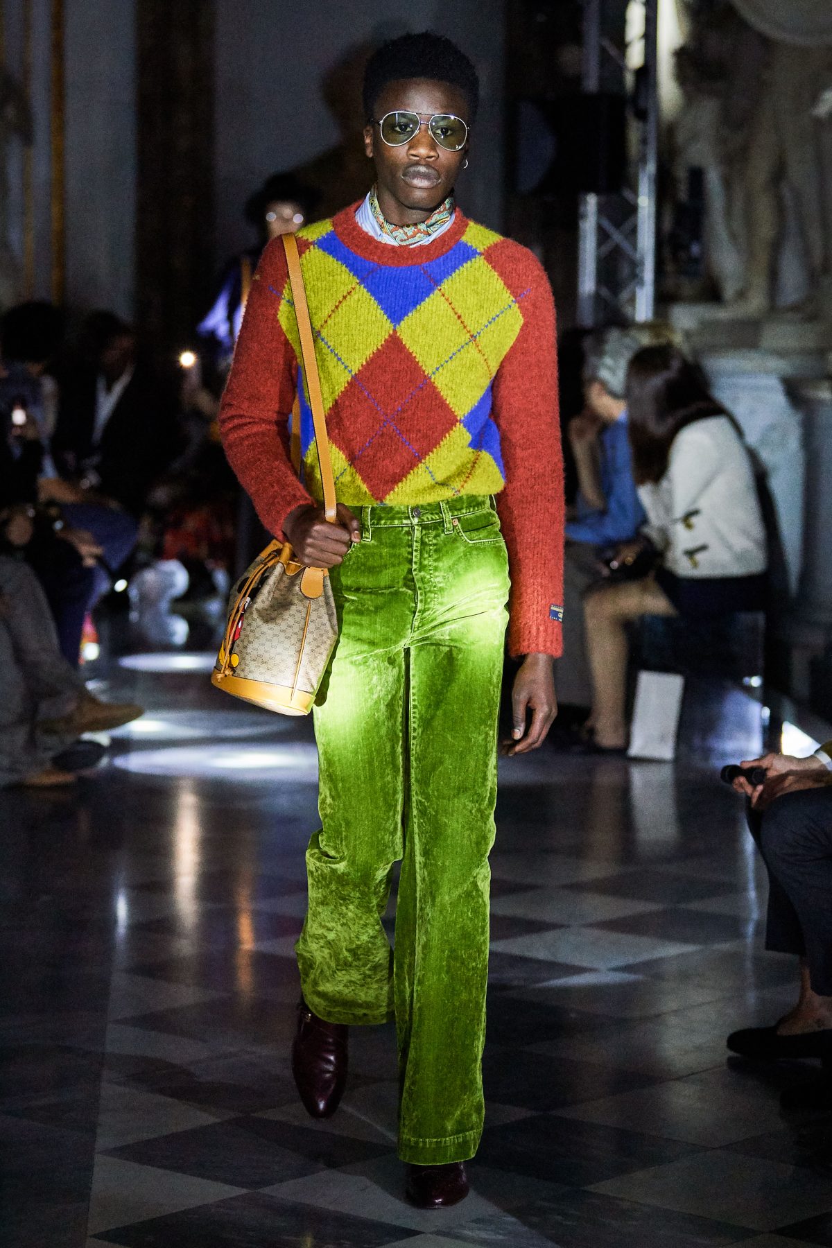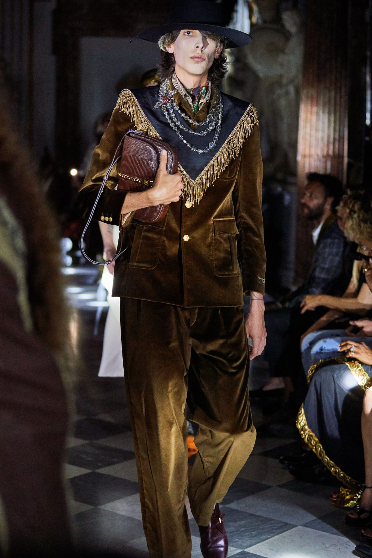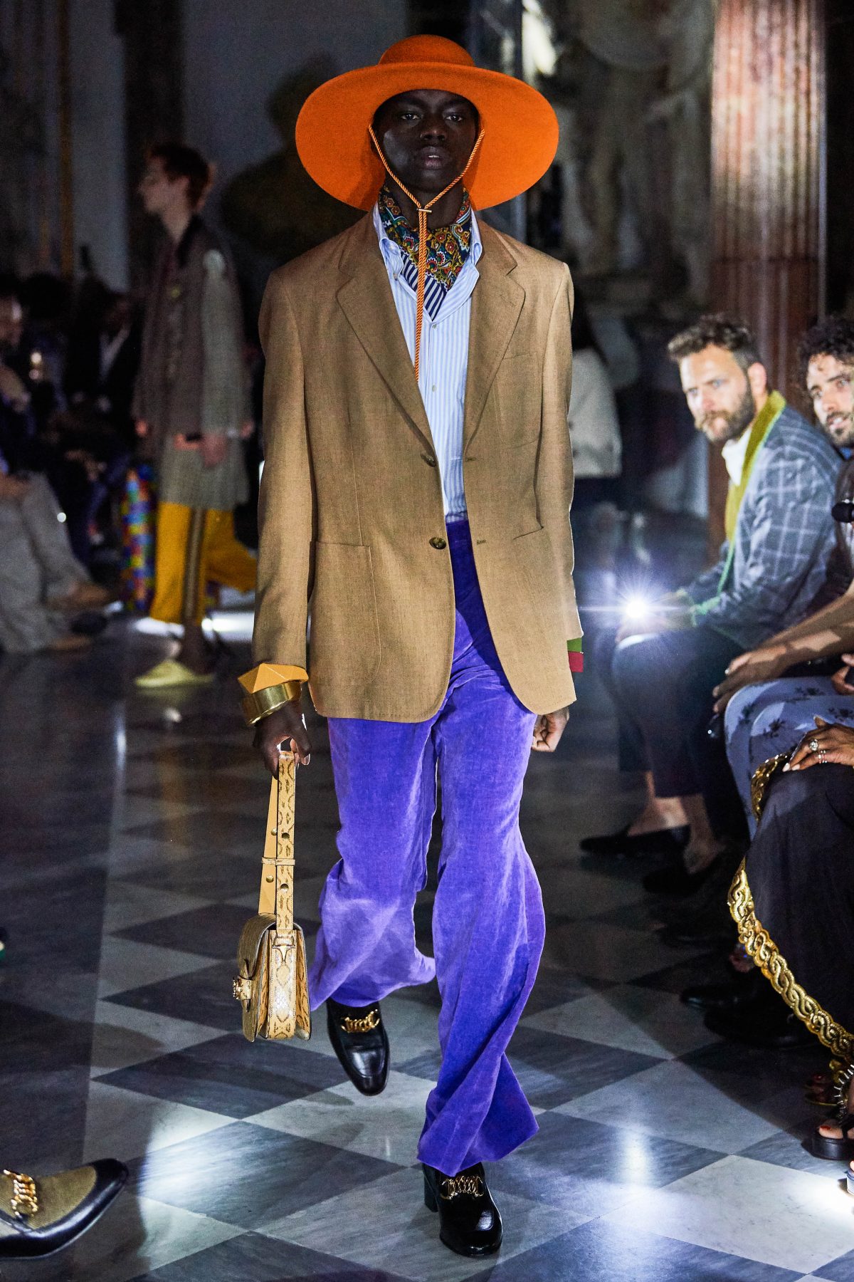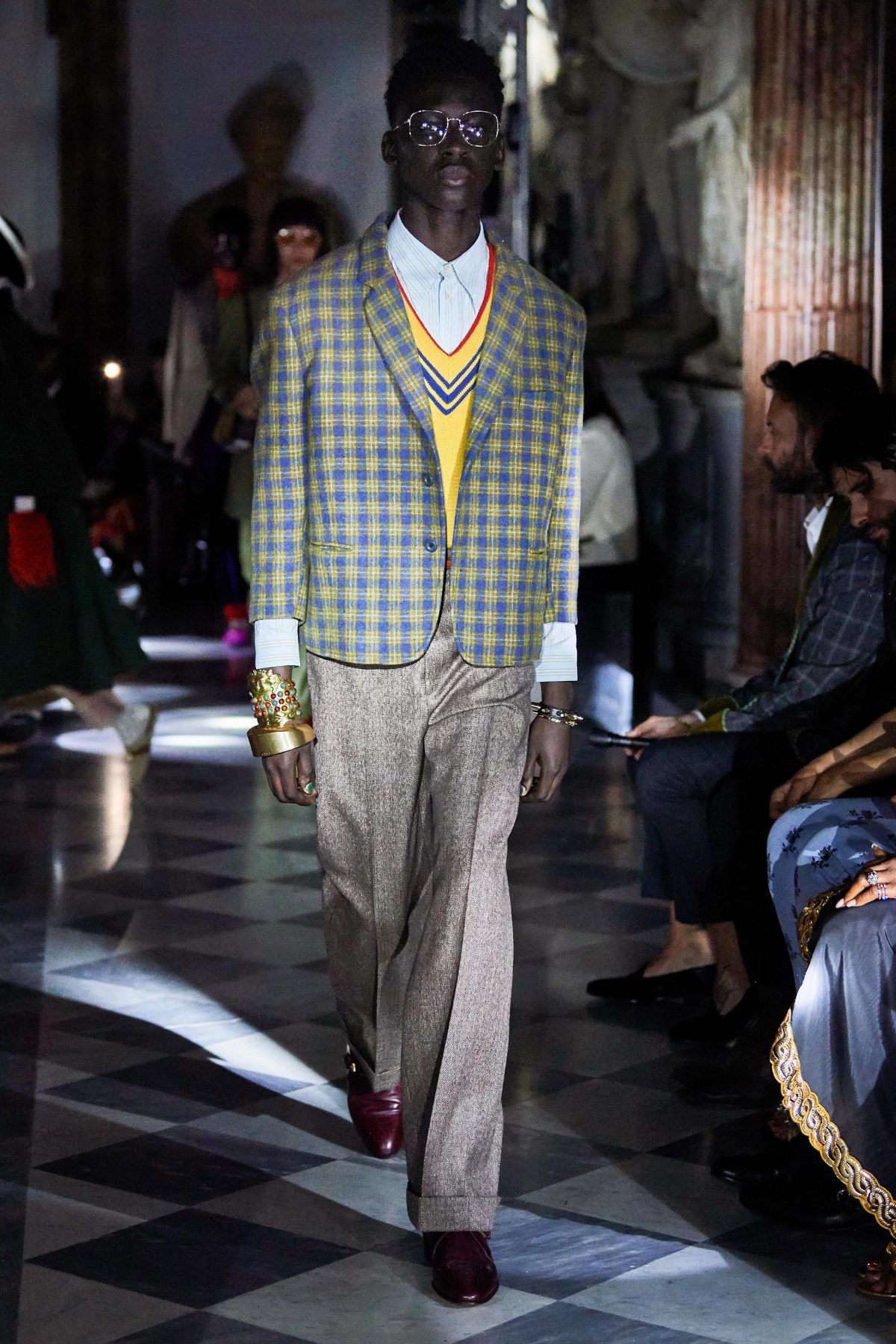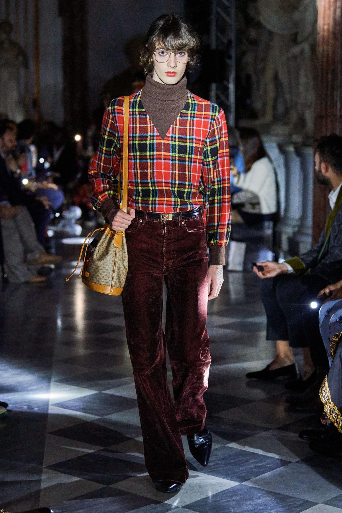 除了絢爛奪目的女裝服飾,男裝的格紋西裝外套、絲絨面料、燈芯絨喇叭褲互相呼應1970年代的氛圍,不過仔細看,Michele 筆下不再區分男女服裝或搭配外表,女性可以中性化、男士可以女性化,任何人都能配搭出錯綜複雜的柔和優雅風格,毫無遺和感,也從不讓人失望。