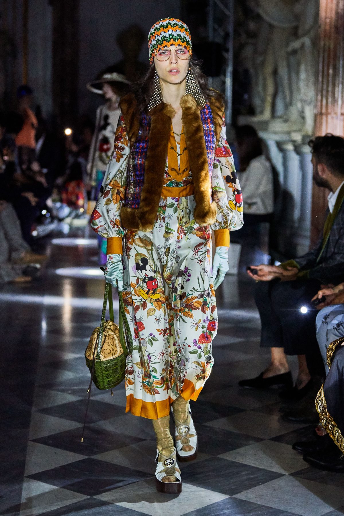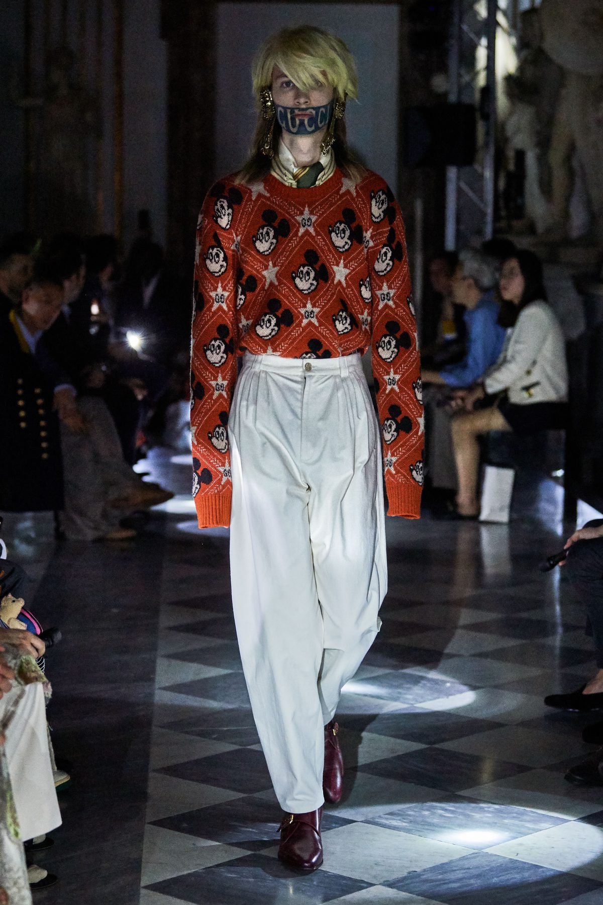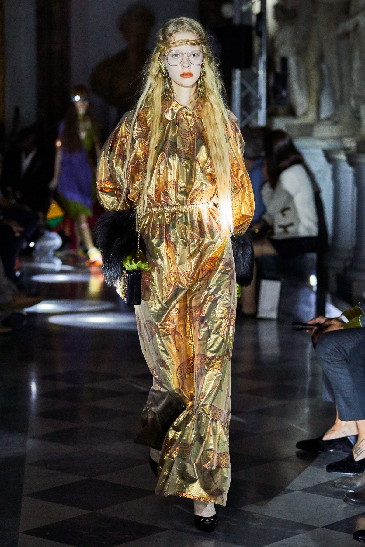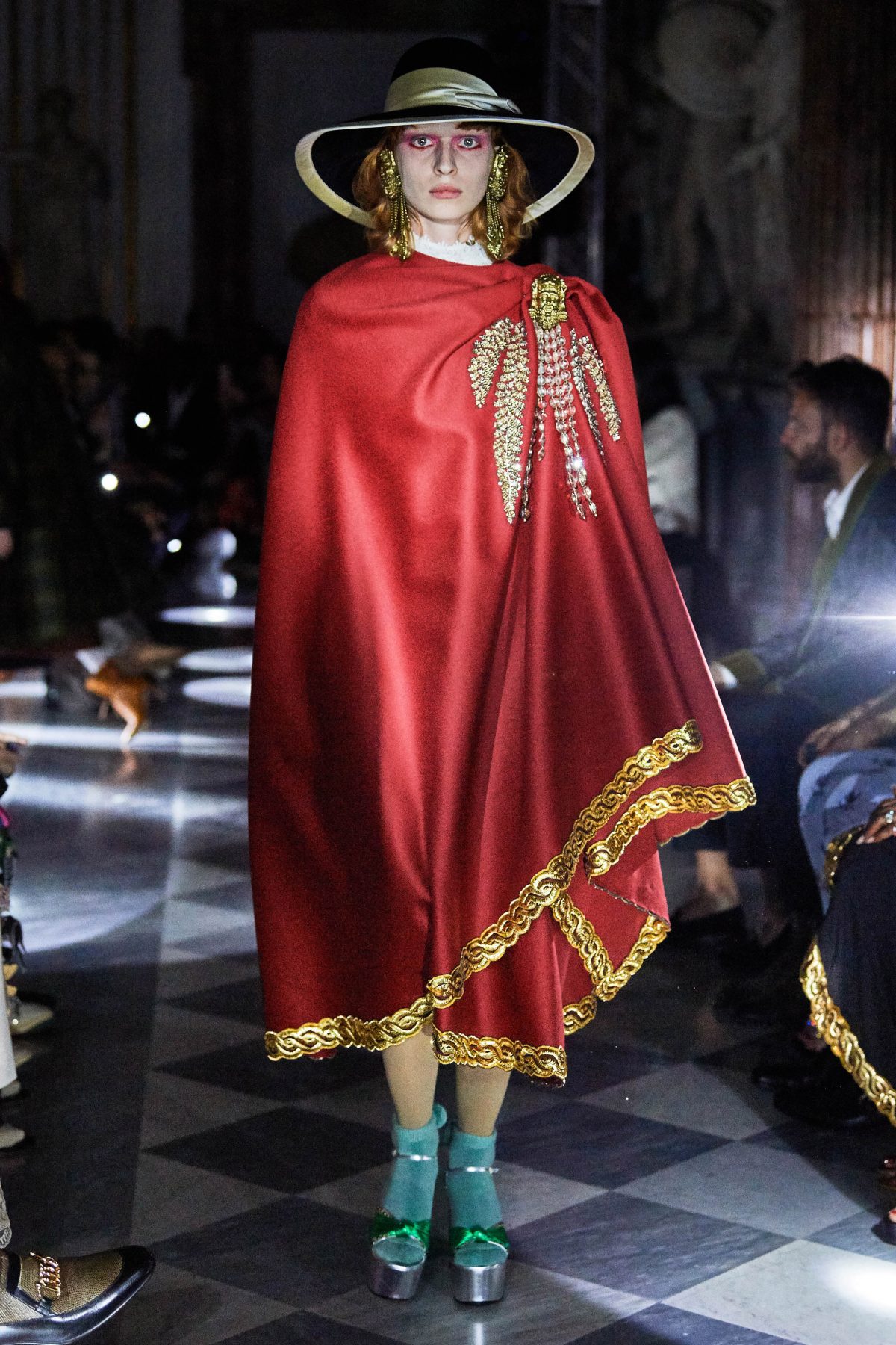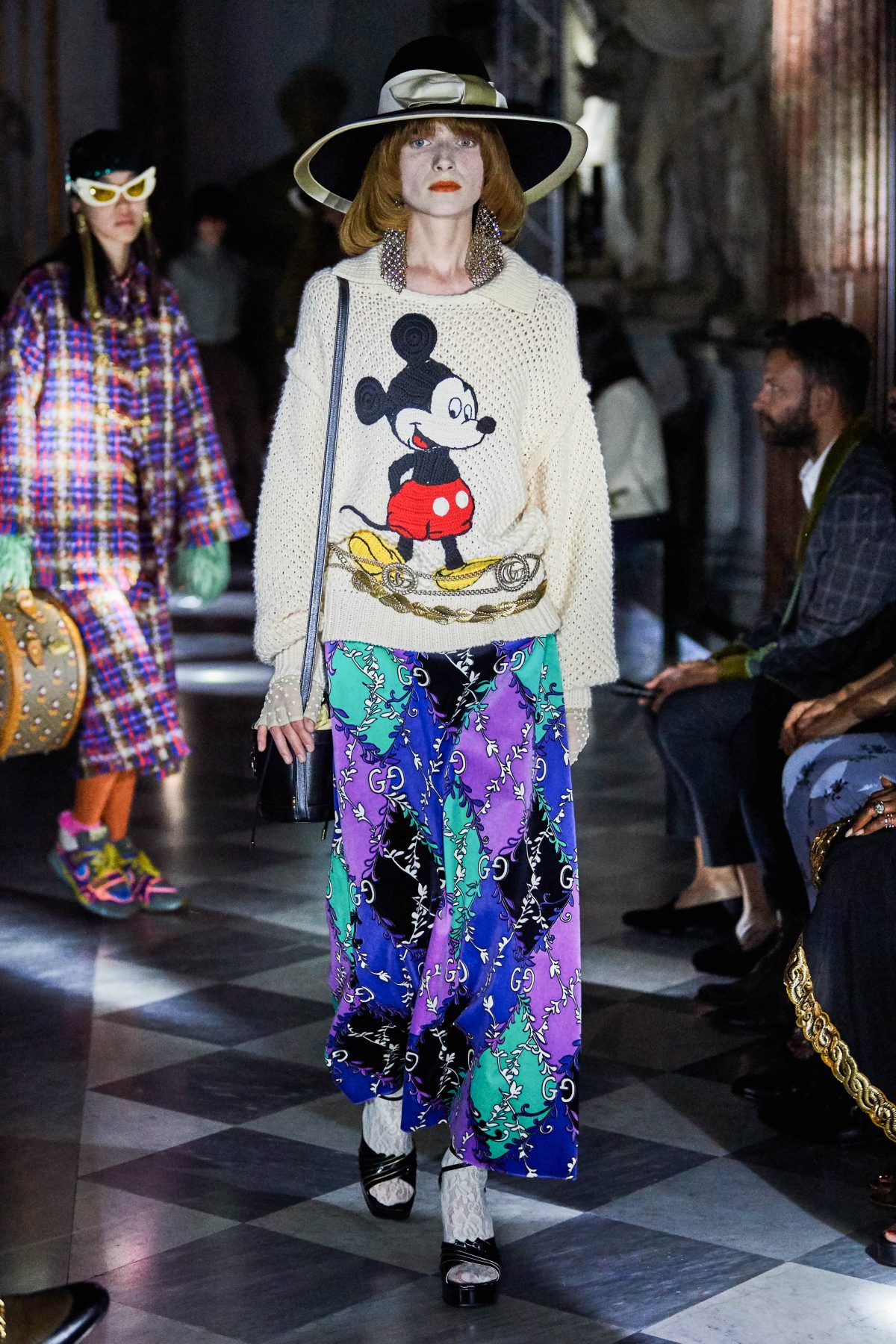當晚時裝展所有座上客都分配一支電筒用來照亮天橋上的時裝,大家仿佛成為 Gucci 的考古學家,在黑暗中隨着光線尋找神秘莫測的隱藏物體。其實無論是現代還是古代,系列仍然離不開設計師最愛的1970年代元素,復古浮誇的墊肩、公主袖剪綵、花俏而年代感十足的金色刺繡、金黃滾邊鮮紅色斗篷等等,還有延續多季的米奇及米妮角色也在絲綢背心上出現,看似反覆使用的元素卻有嶄新的演繹展示,將未來與過去空間交錯在古老羅馬,激盪出強烈又美妙絕倫的共融信念:解放女性。