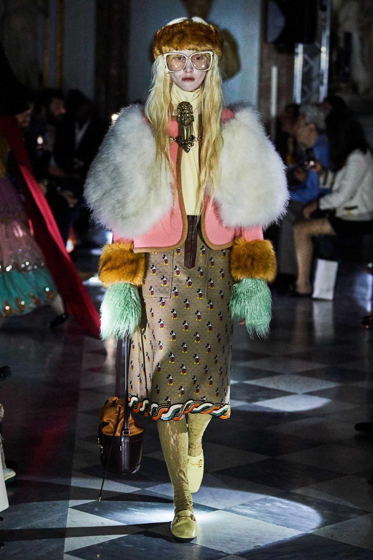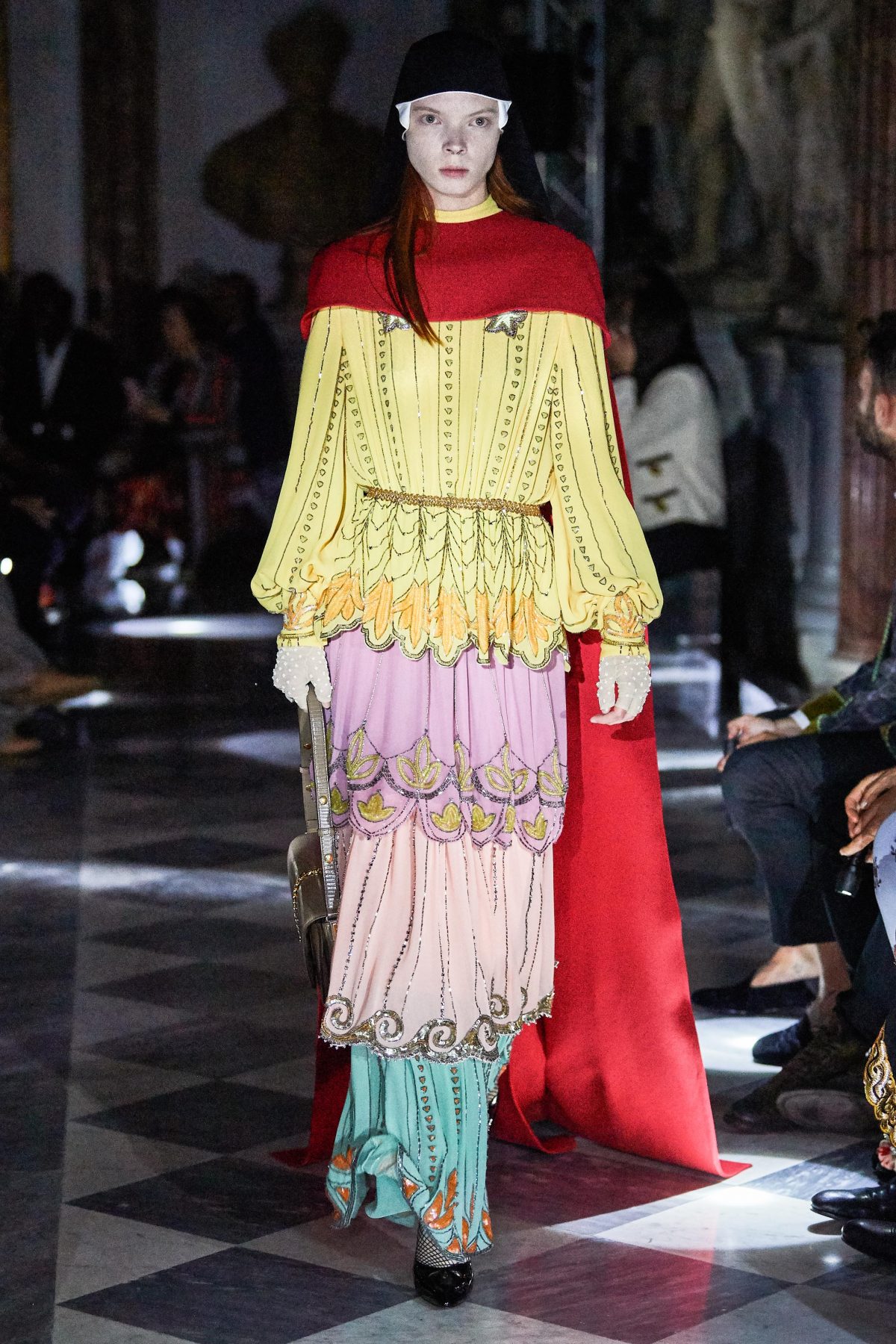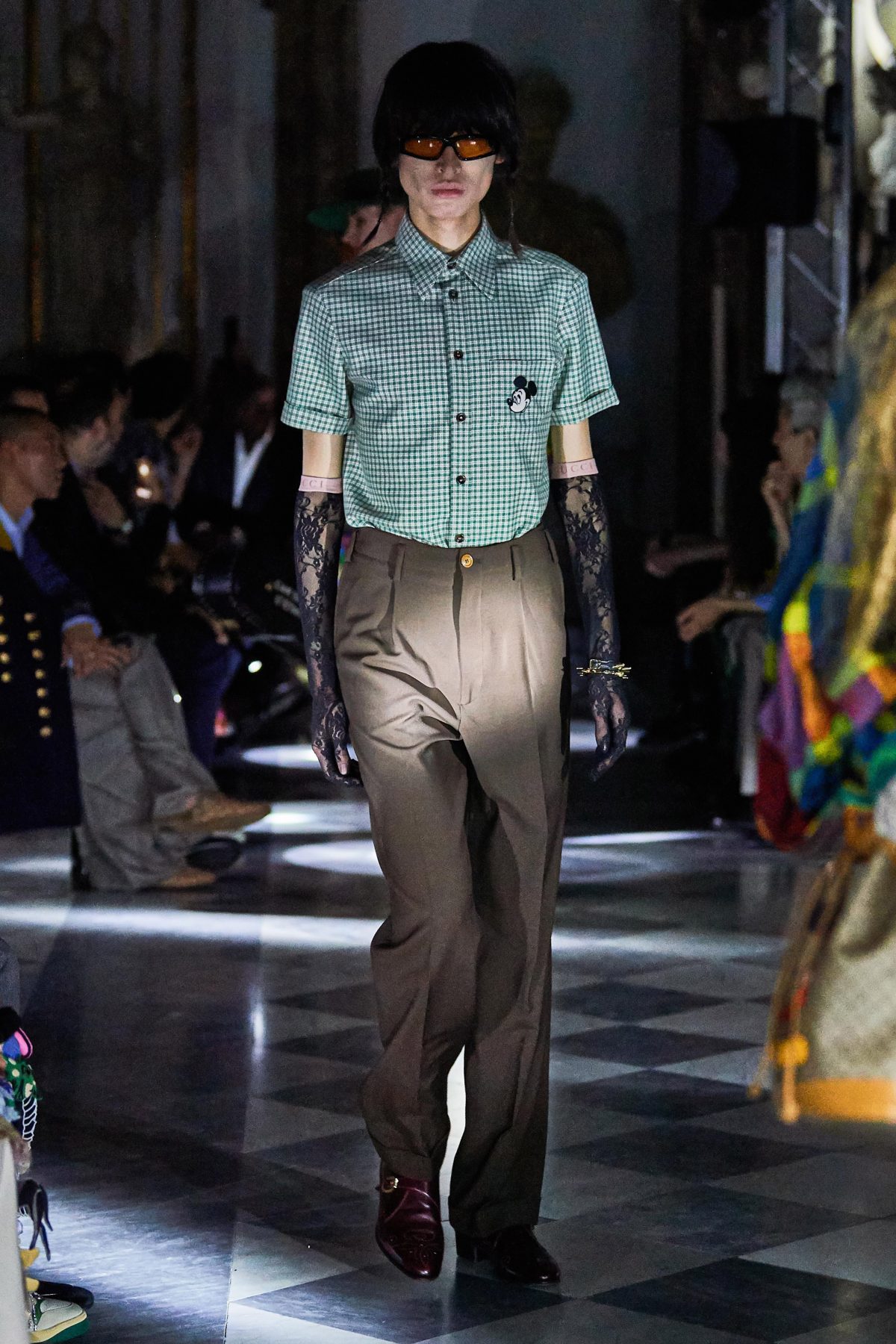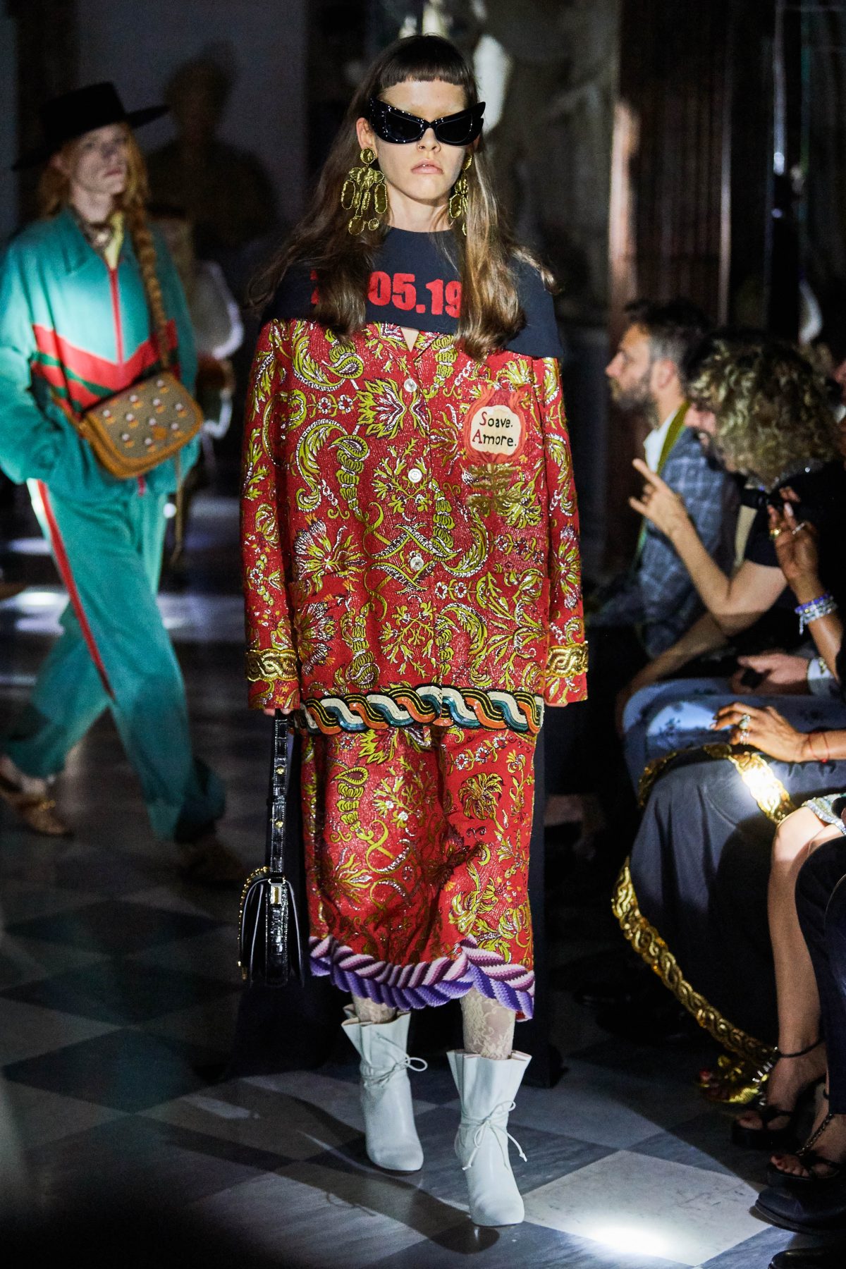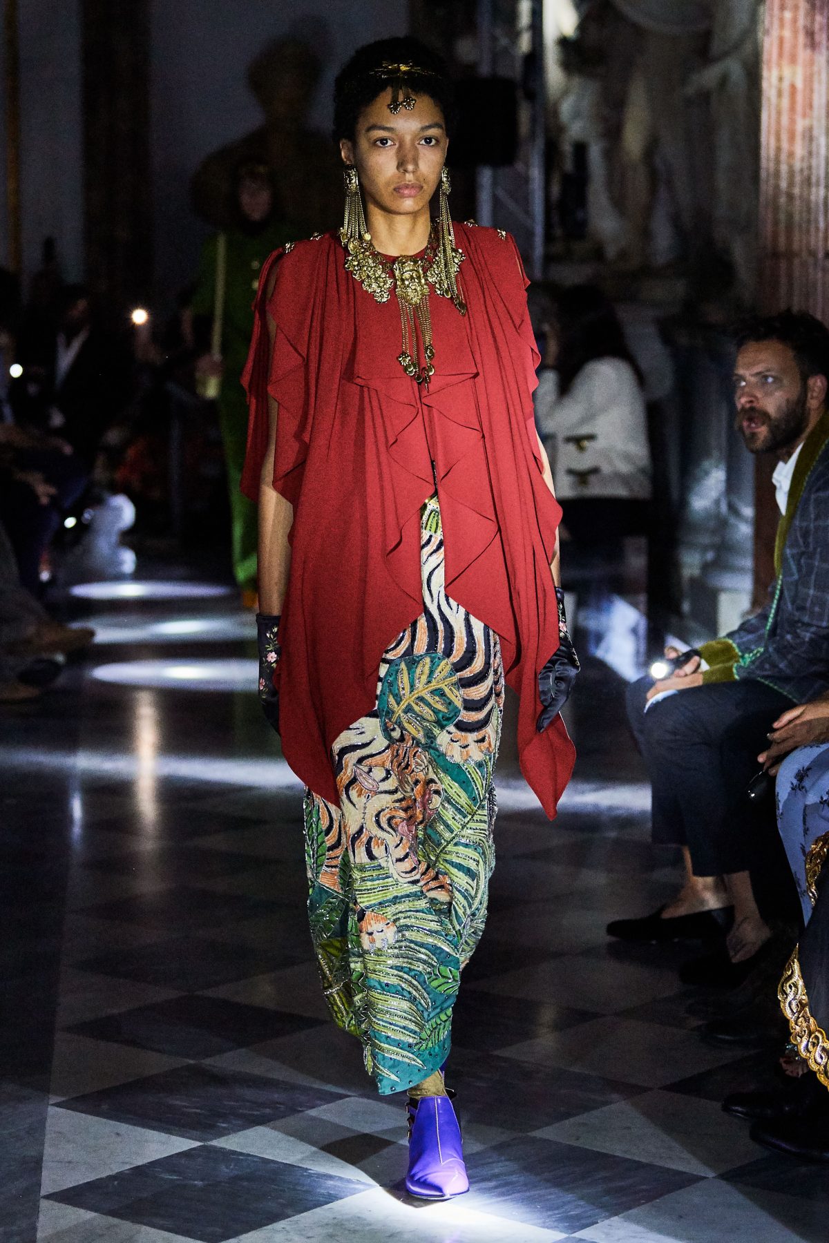 當晚時裝展所有座上客都分配一支電筒用來照亮天橋上的時裝,大家仿佛成為 Gucci 的考古學家,在黑暗中隨着光線尋找神秘莫測的隱藏物體。其實無論是現代還是古代,系列仍然離不開設計師最愛的1970年代元素,復古浮誇的墊肩、公主袖剪綵、花俏而年代感十足的金色刺繡、金黃滾邊鮮紅色斗篷等等,還有延續多季的米奇及米妮角色也在絲綢背心上出現,看似反覆使用的元素卻有嶄新的演繹展示,將未來與過去空間交錯在古老羅馬,激盪出強烈又美妙絕倫的共融信念:解放女性。