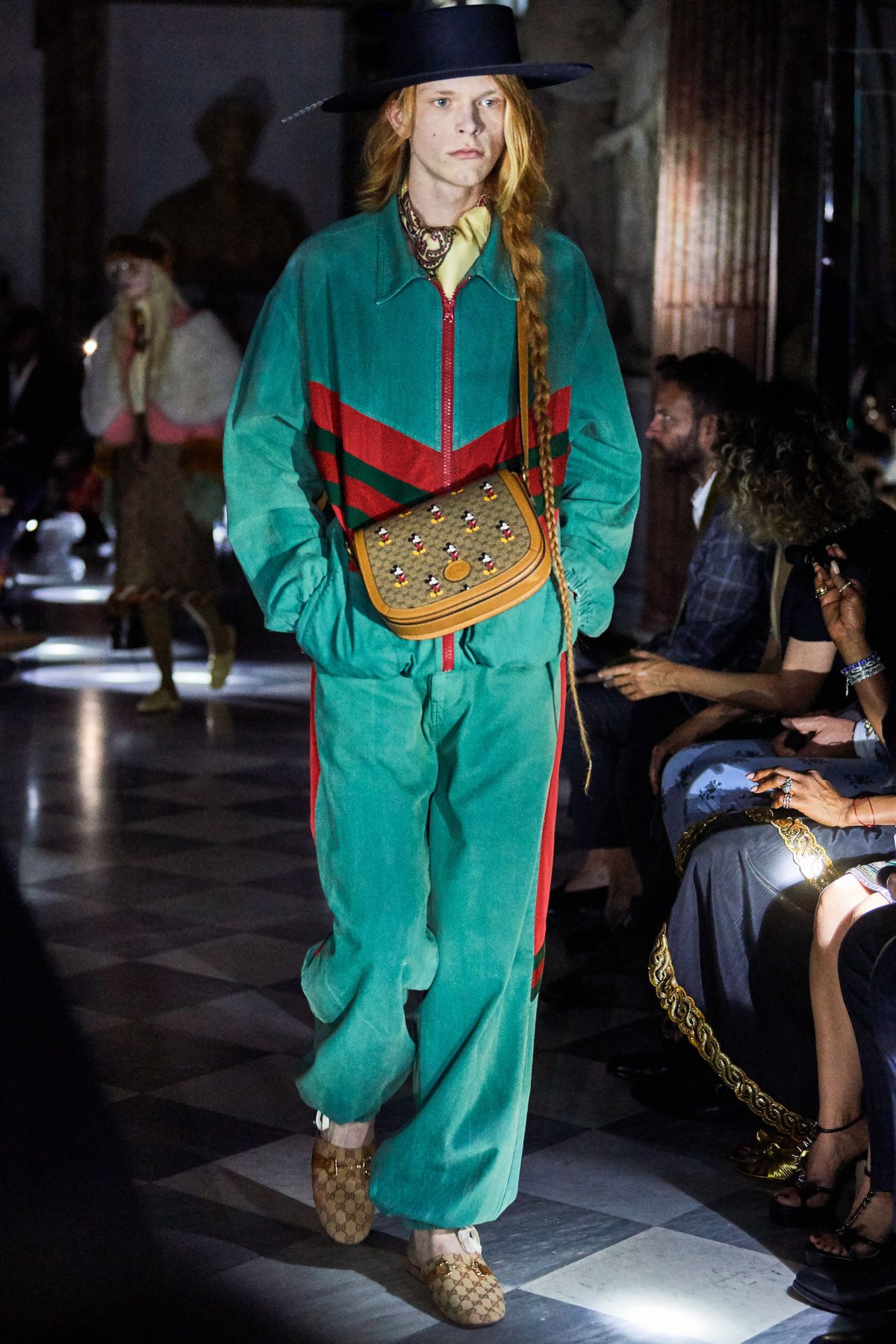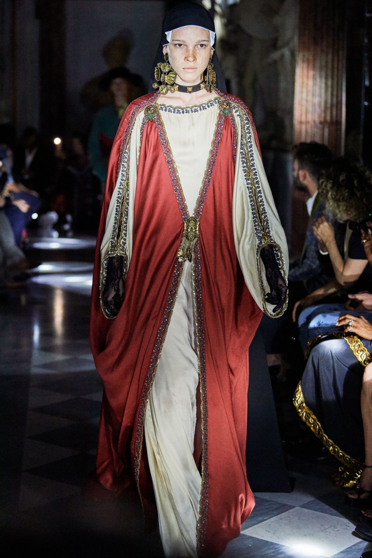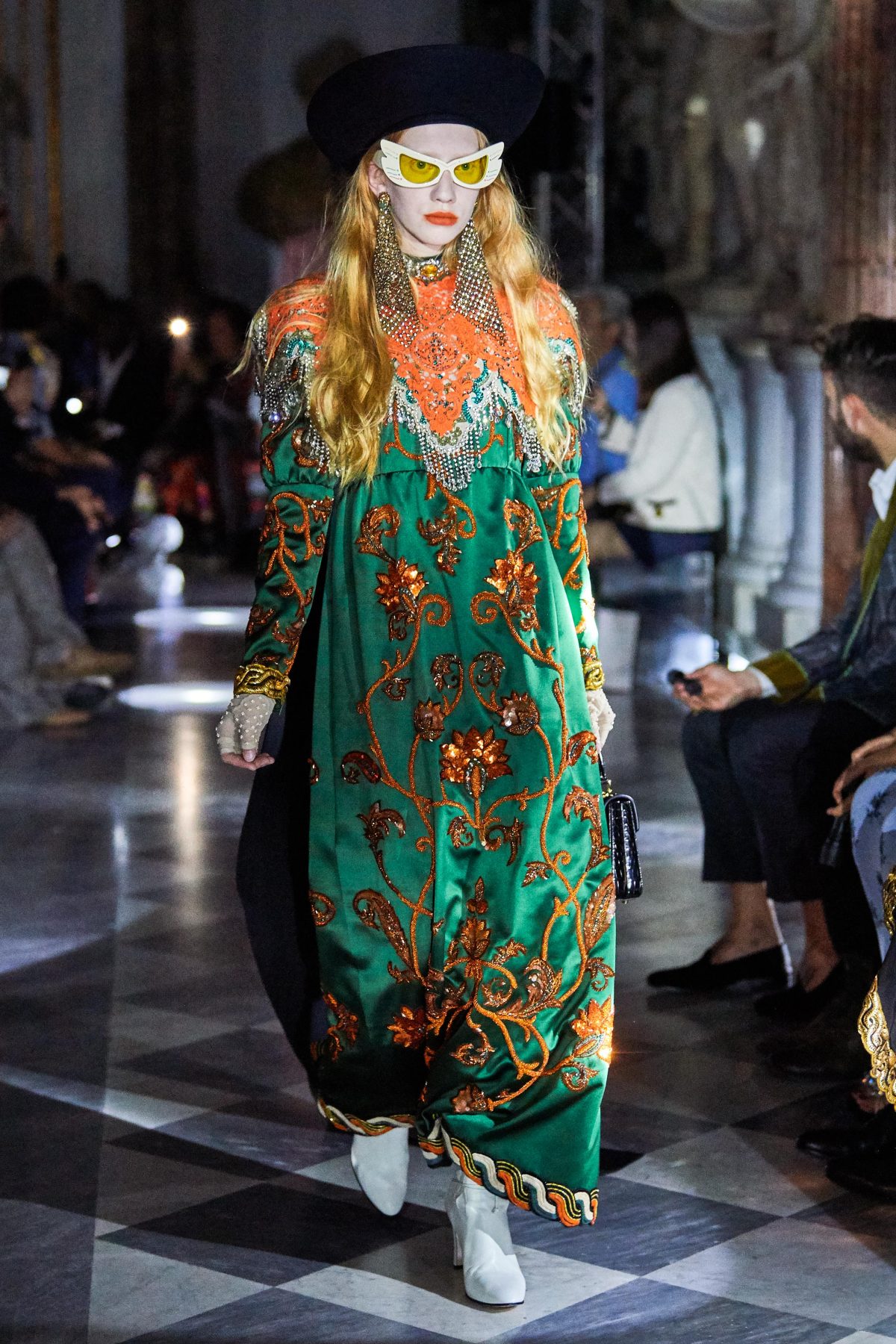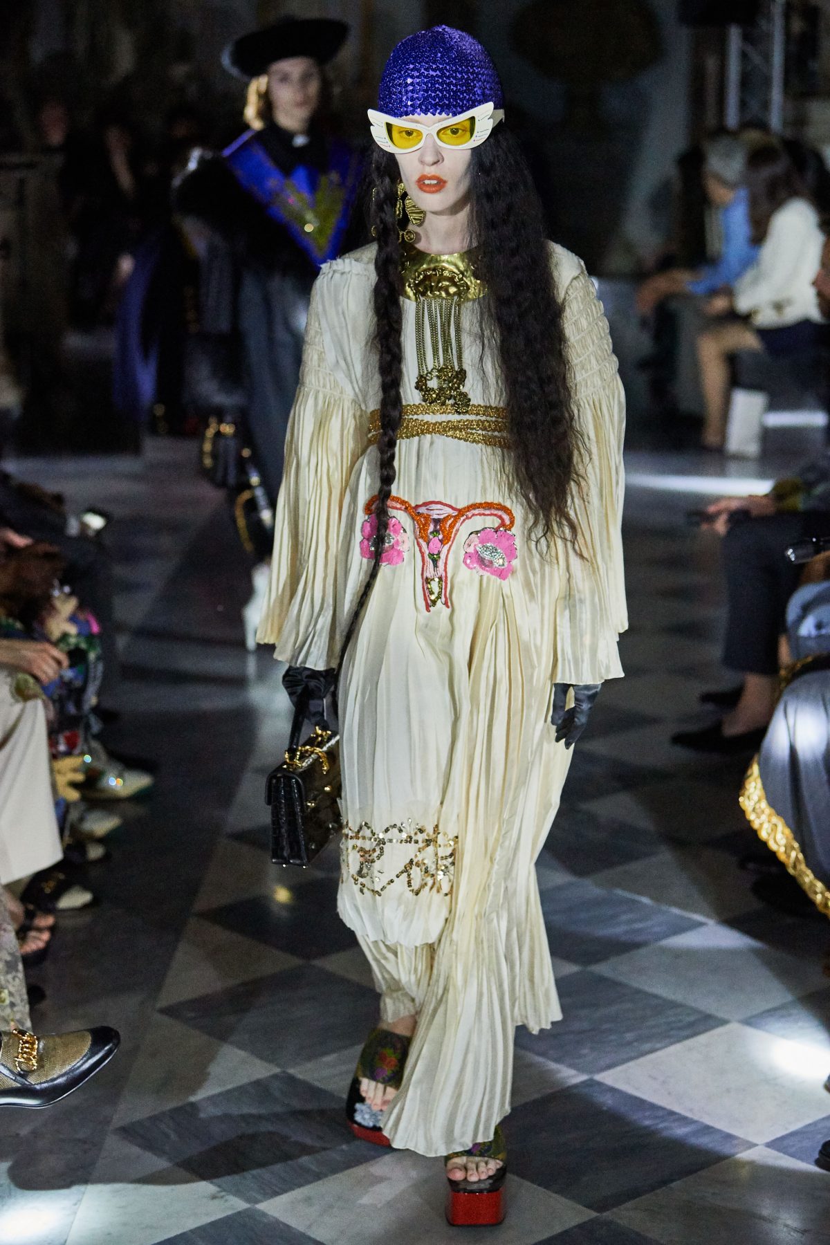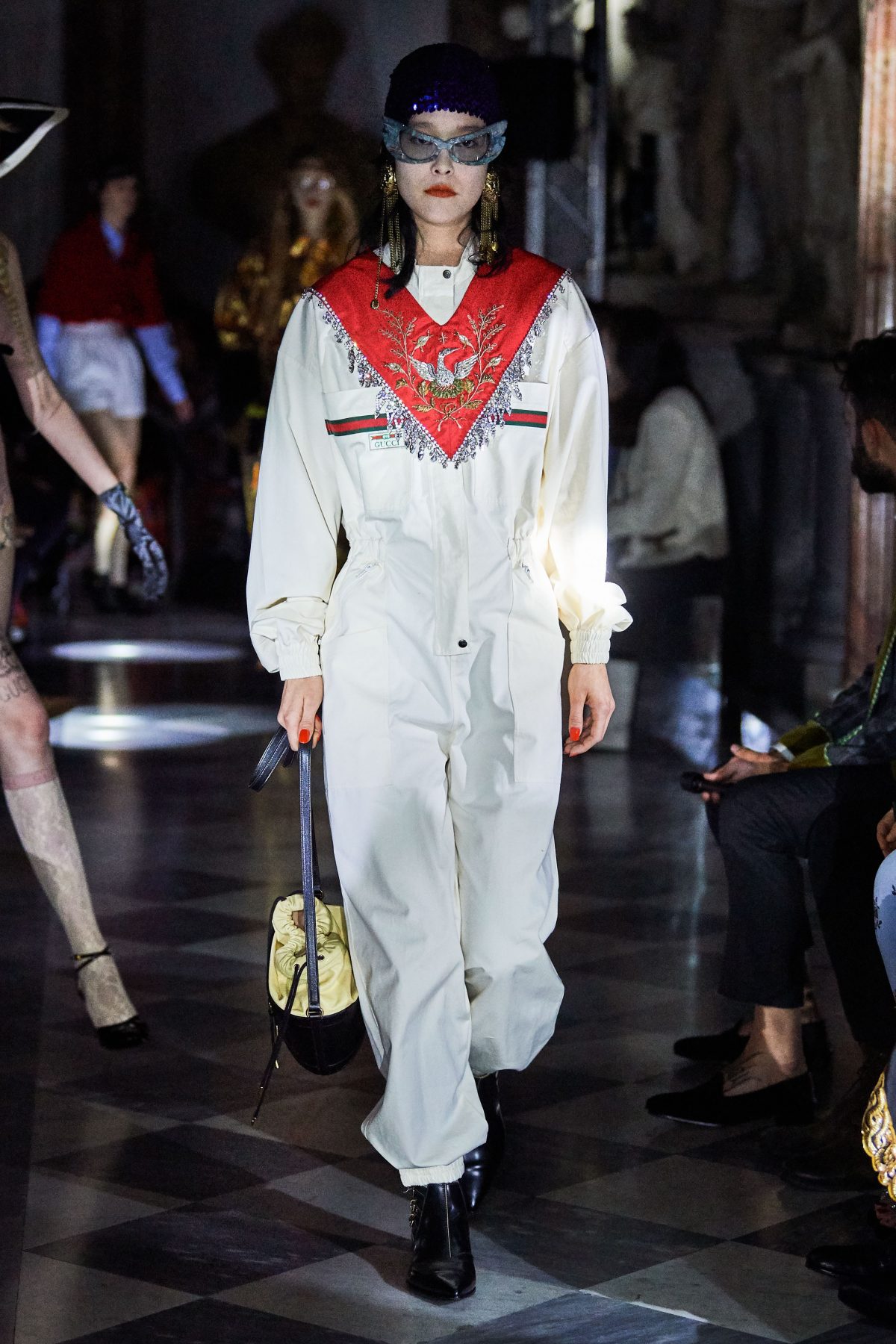 當晚時裝展所有座上客都分配一支電筒用來照亮天橋上的時裝,大家仿佛成為 Gucci 的考古學家,在黑暗中隨着光線尋找神秘莫測的隱藏物體。其實無論是現代還是古代,系列仍然離不開設計師最愛的1970年代元素,復古浮誇的墊肩、公主袖剪綵、花俏而年代感十足的金色刺繡、金黃滾邊鮮紅色斗篷等等,還有延續多季的米奇及米妮角色也在絲綢背心上出現,看似反覆使用的元素卻有嶄新的演繹展示,將未來與過去空間交錯在古老羅馬,激盪出強烈又美妙絕倫的共融信念:解放女性。