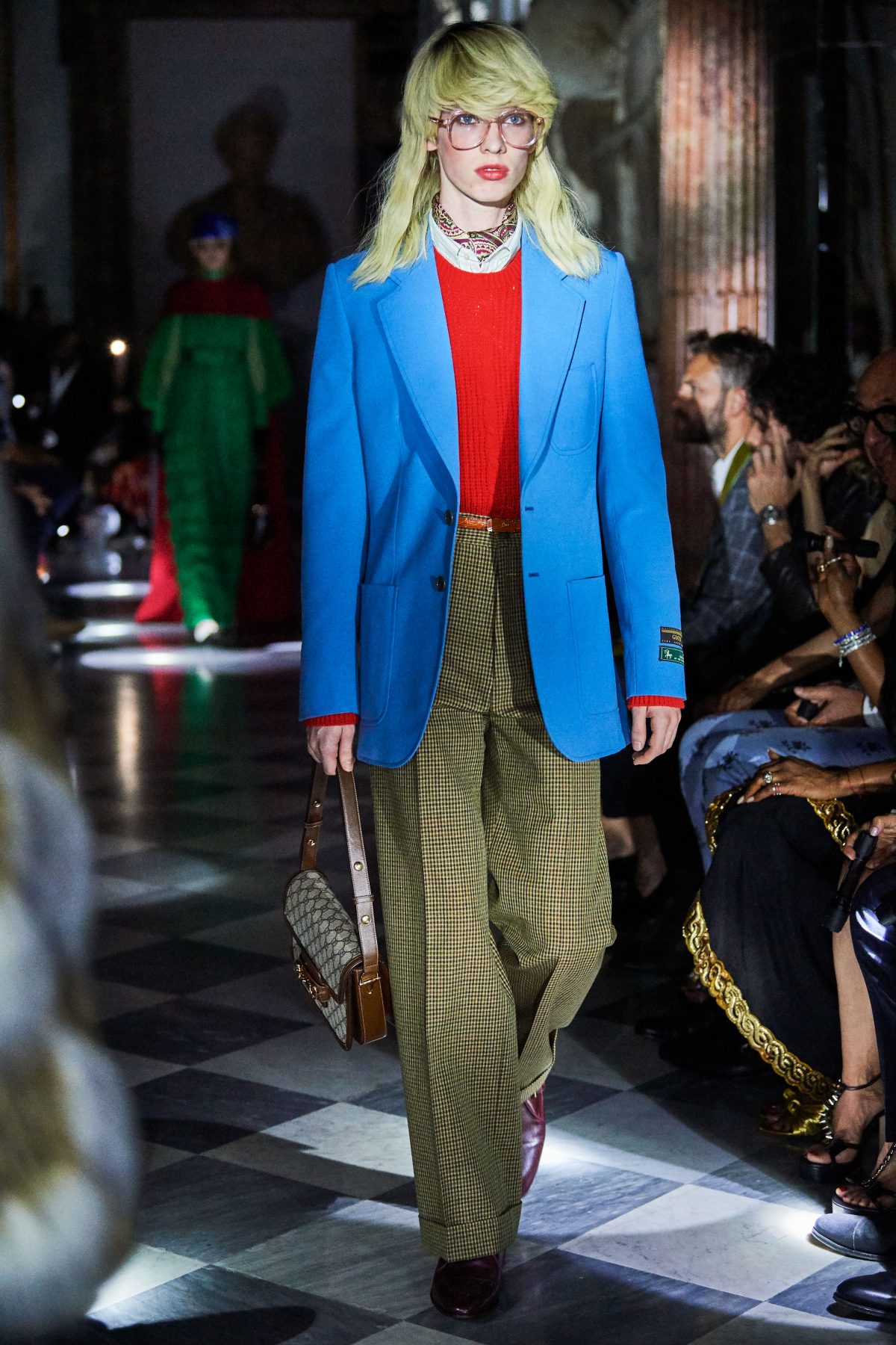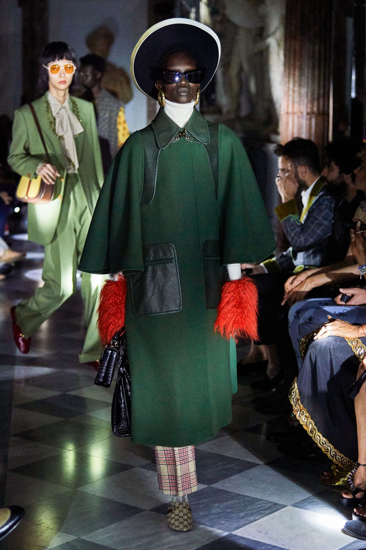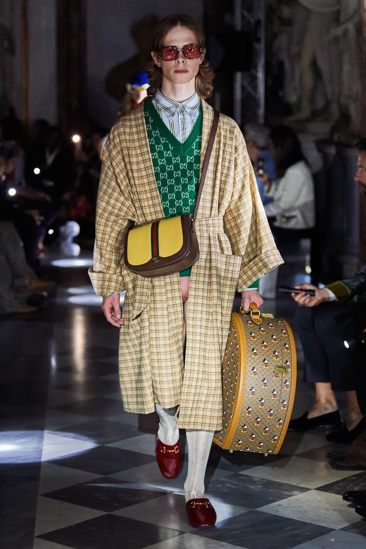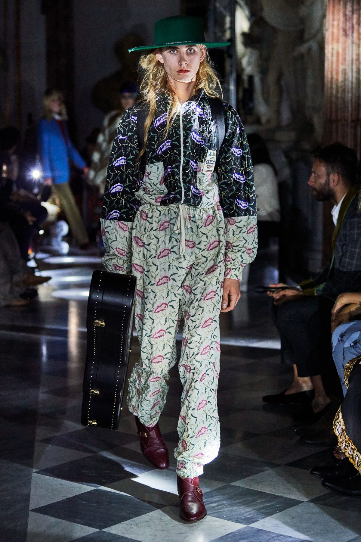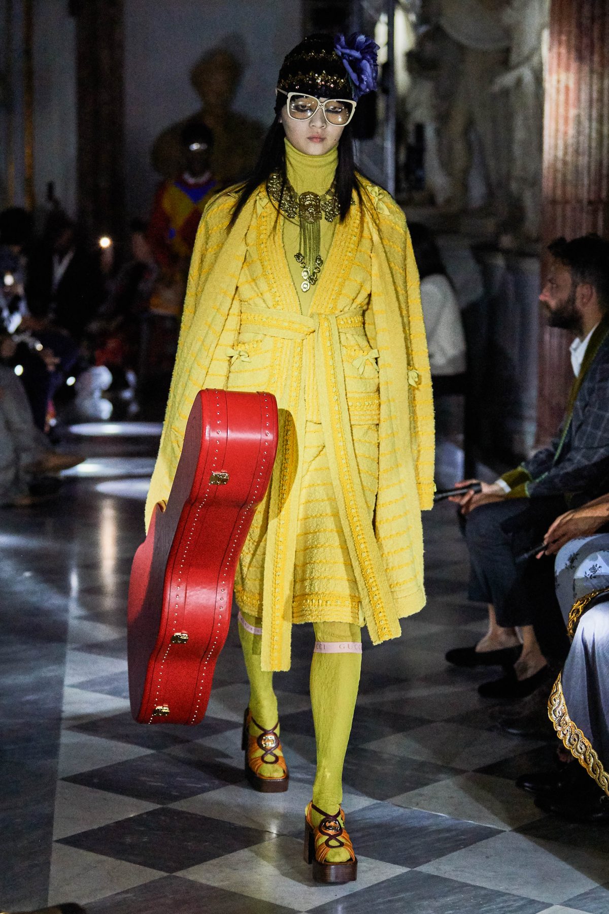 當晚時裝展所有座上客都分配一支電筒用來照亮天橋上的時裝,大家仿佛成為 Gucci 的考古學家,在黑暗中隨着光線尋找神秘莫測的隱藏物體。其實無論是現代還是古代,系列仍然離不開設計師最愛的1970年代元素,復古浮誇的墊肩、公主袖剪綵、花俏而年代感十足的金色刺繡、金黃滾邊鮮紅色斗篷等等,還有延續多季的米奇及米妮角色也在絲綢背心上出現,看似反覆使用的元素卻有嶄新的演繹展示,將未來與過去空間交錯在古老羅馬,激盪出強烈又美妙絕倫的共融信念:解放女性。