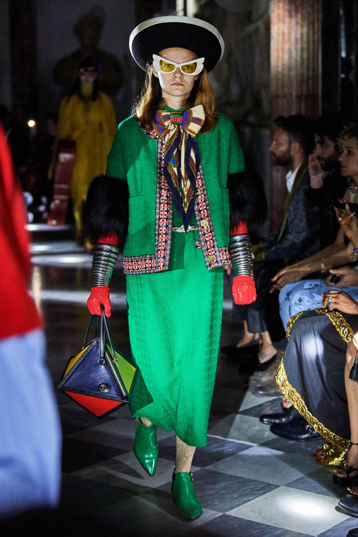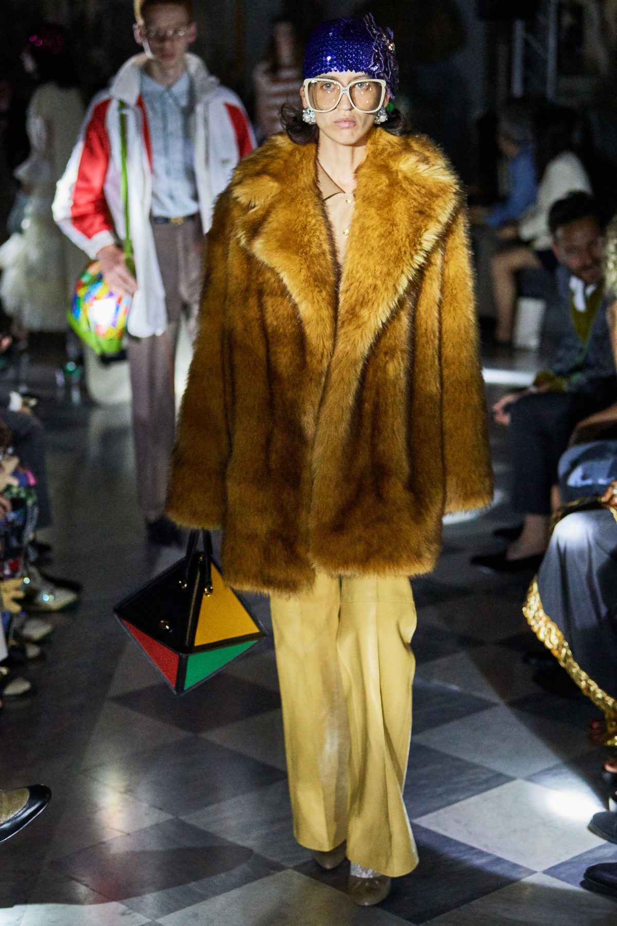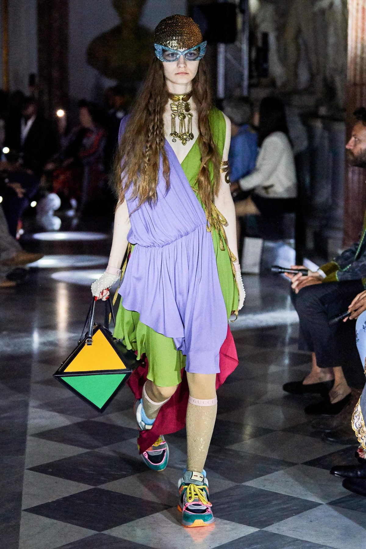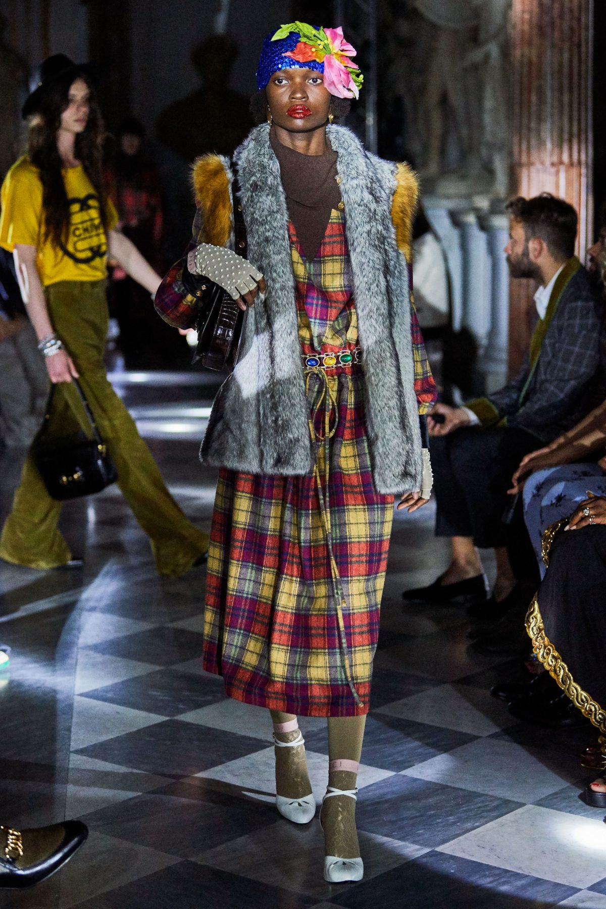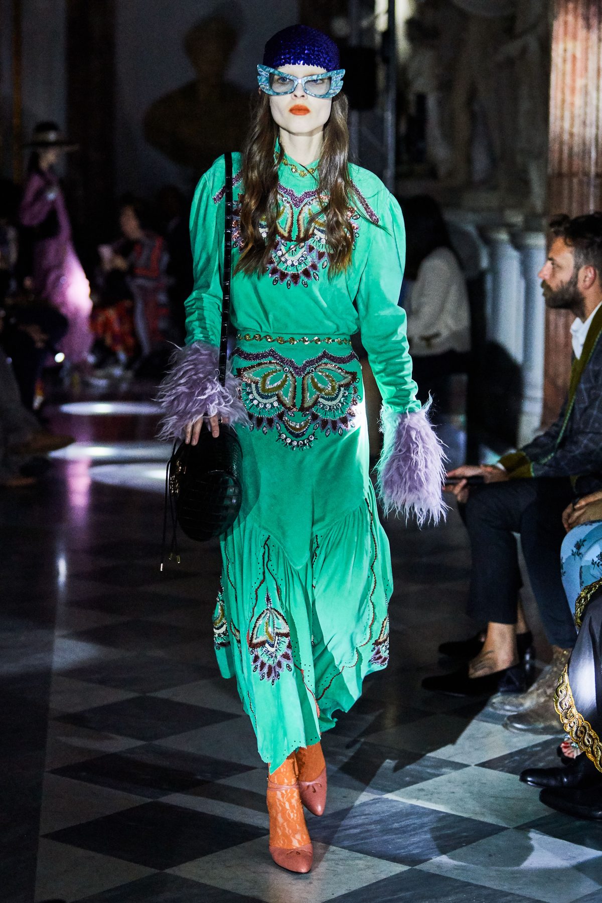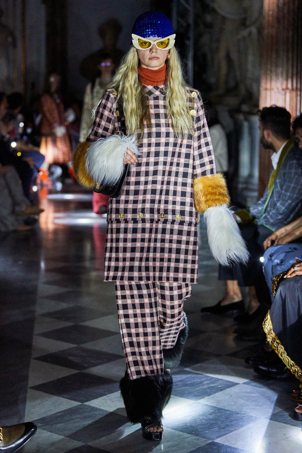 當晚時裝展所有座上客都分配一支電筒用來照亮天橋上的時裝,大家仿佛成為 Gucci 的考古學家,在黑暗中隨着光線尋找神秘莫測的隱藏物體。其實無論是現代還是古代,系列仍然離不開設計師最愛的1970年代元素,復古浮誇的墊肩、公主袖剪綵、花俏而年代感十足的金色刺繡、金黃滾邊鮮紅色斗篷等等,還有延續多季的米奇及米妮角色也在絲綢背心上出現,看似反覆使用的元素卻有嶄新的演繹展示,將未來與過去空間交錯在古老羅馬,激盪出強烈又美妙絕倫的共融信念:解放女性。