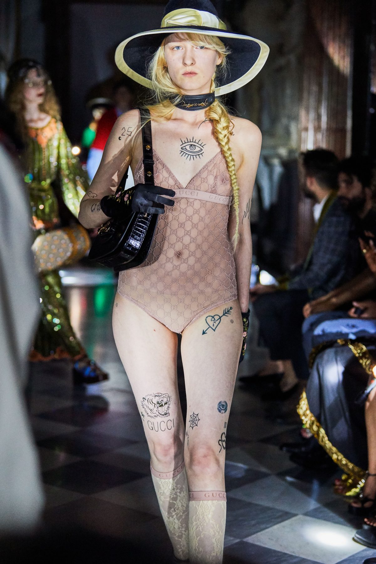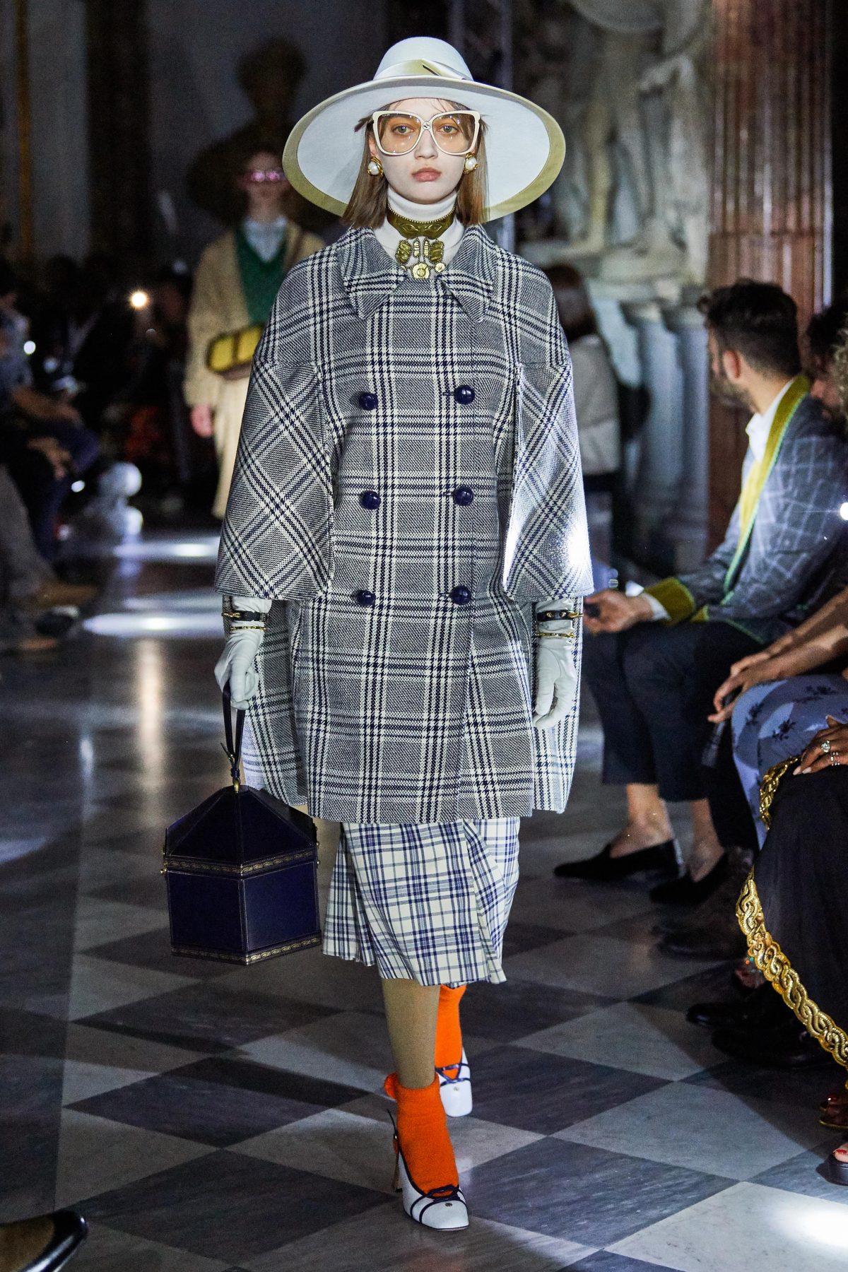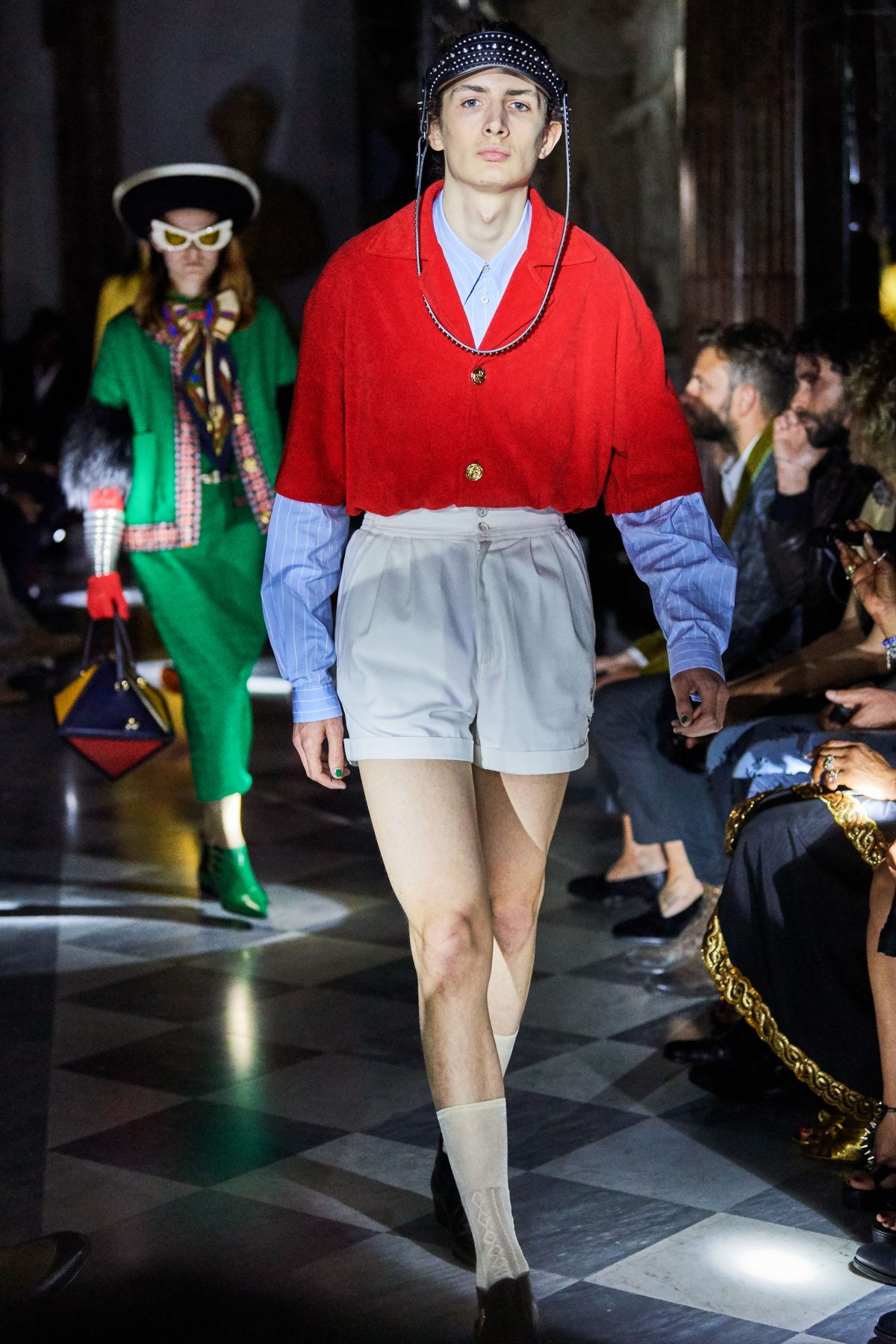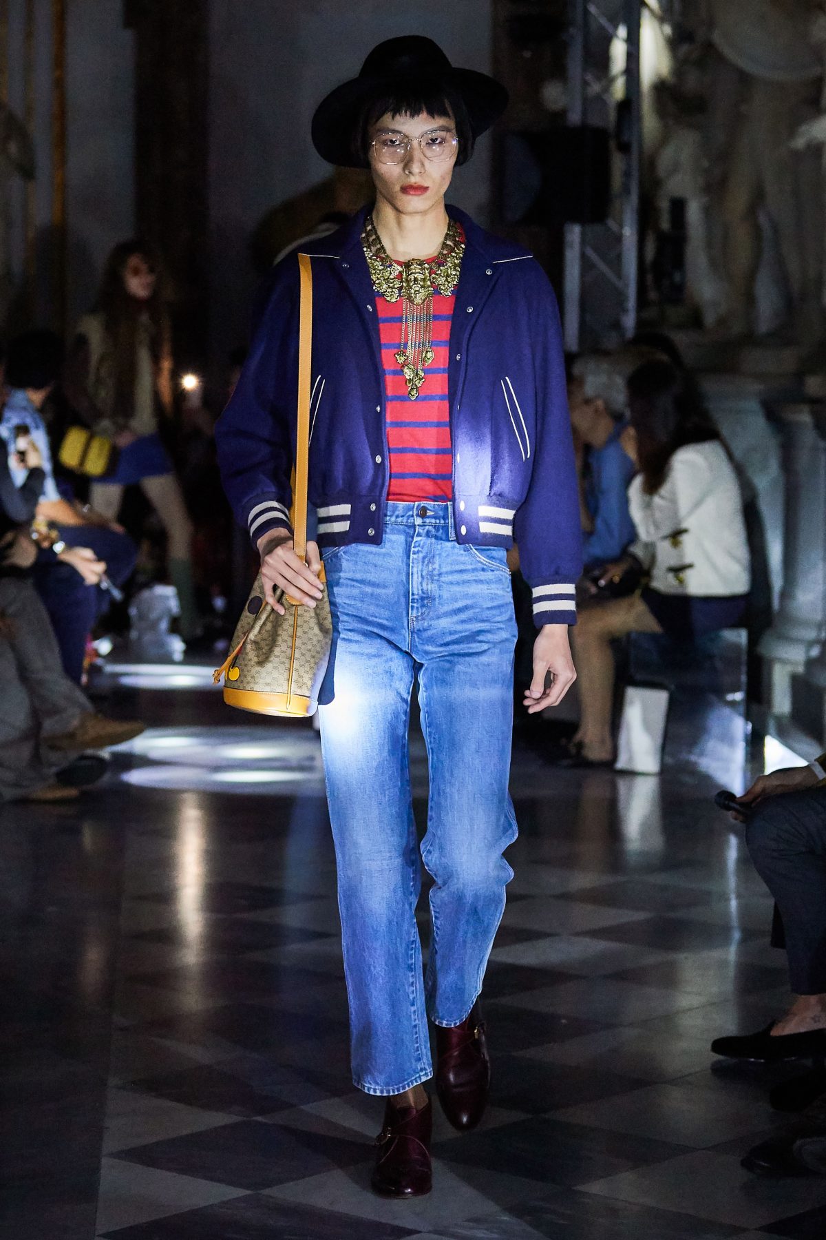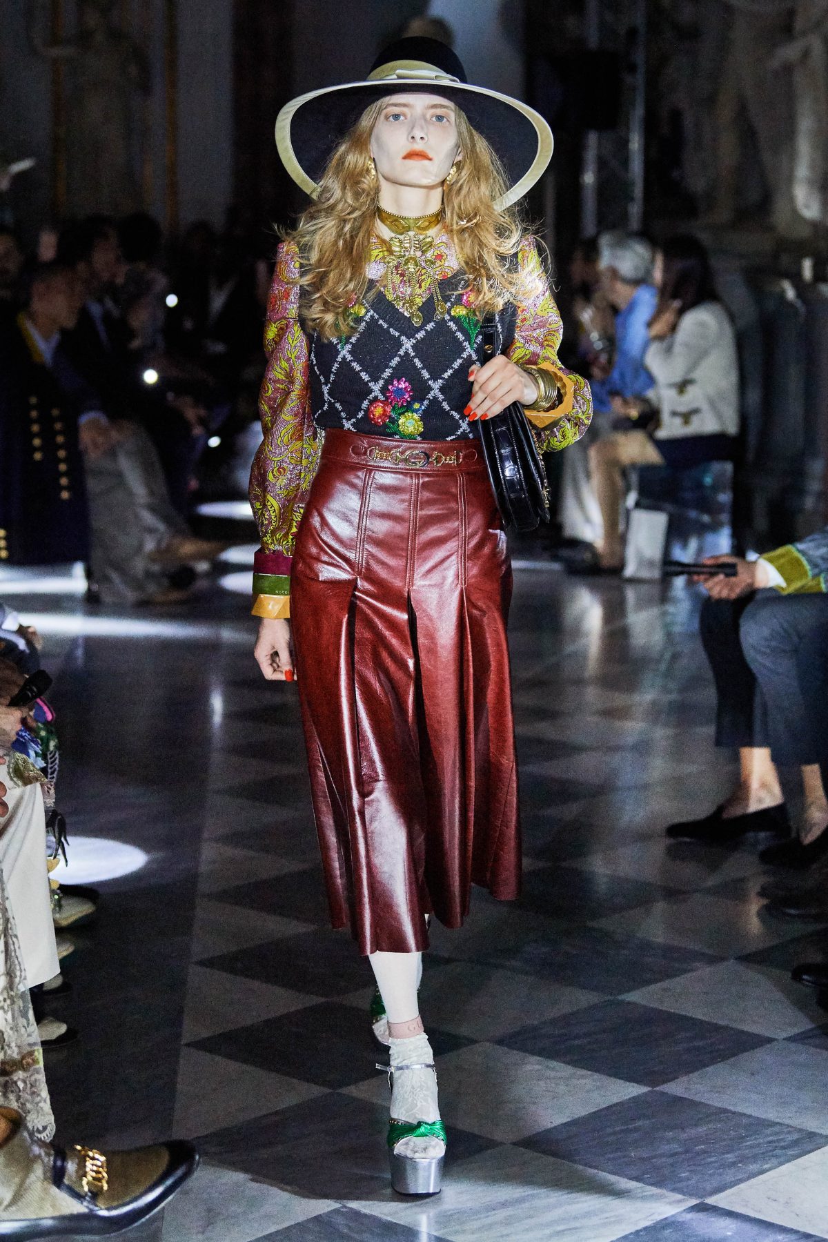 當晚時裝展所有座上客都分配一支電筒用來照亮天橋上的時裝,大家仿佛成為 Gucci 的考古學家,在黑暗中隨着光線尋找神秘莫測的隱藏物體。其實無論是現代還是古代,系列仍然離不開設計師最愛的1970年代元素,復古浮誇的墊肩、公主袖剪綵、花俏而年代感十足的金色刺繡、金黃滾邊鮮紅色斗篷等等,還有延續多季的米奇及米妮角色也在絲綢背心上出現,看似反覆使用的元素卻有嶄新的演繹展示,將未來與過去空間交錯在古老羅馬,激盪出強烈又美妙絕倫的共融信念:解放女性。