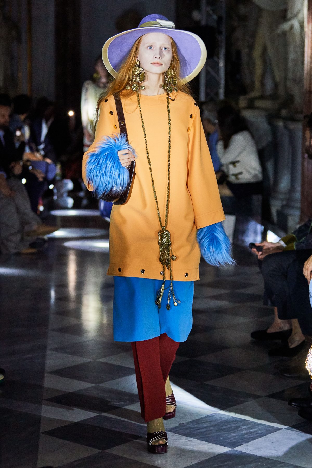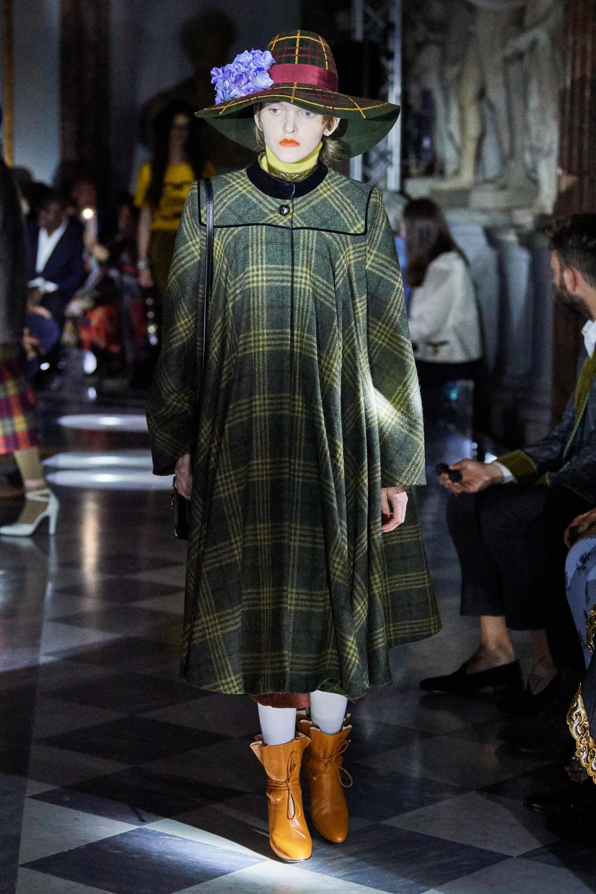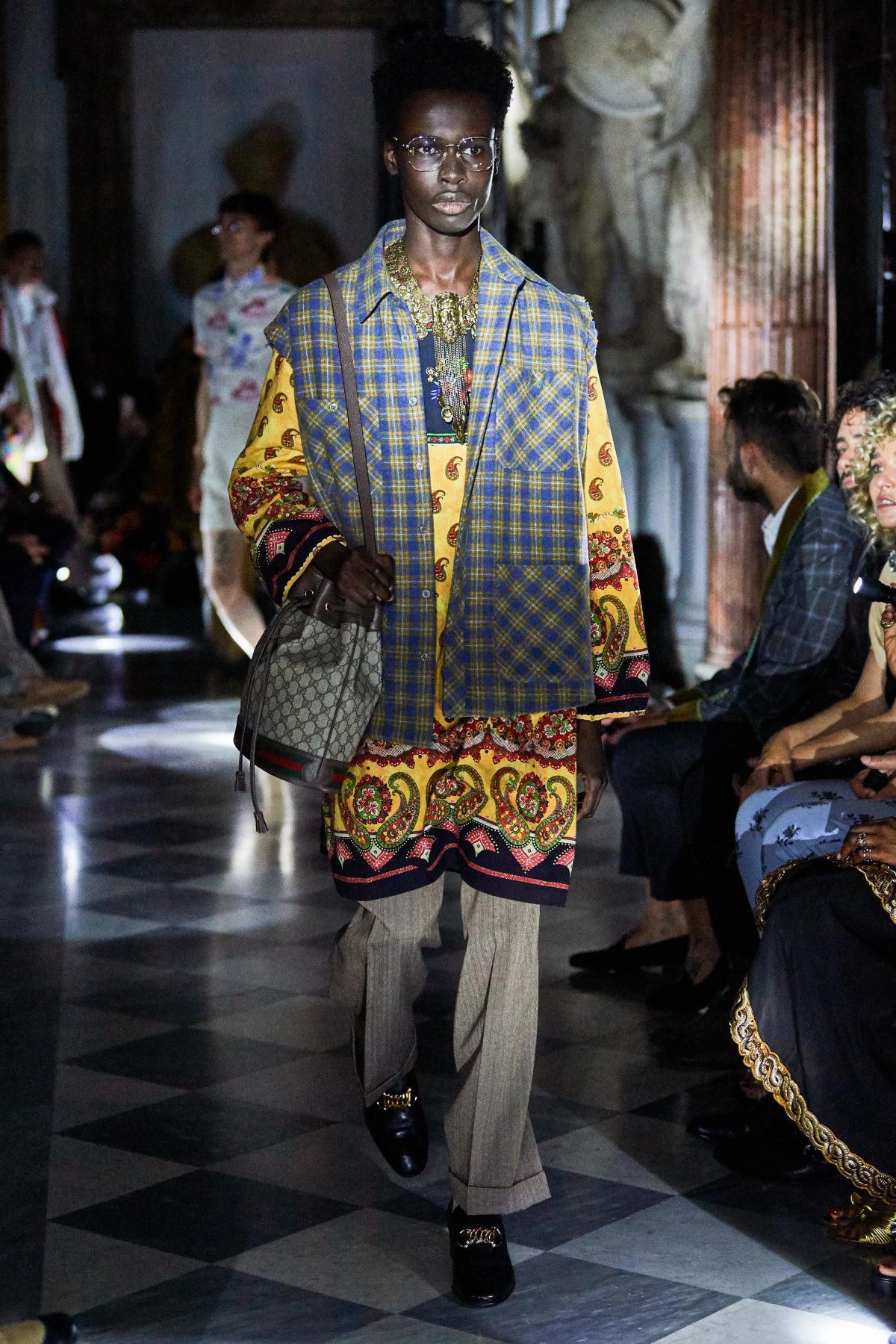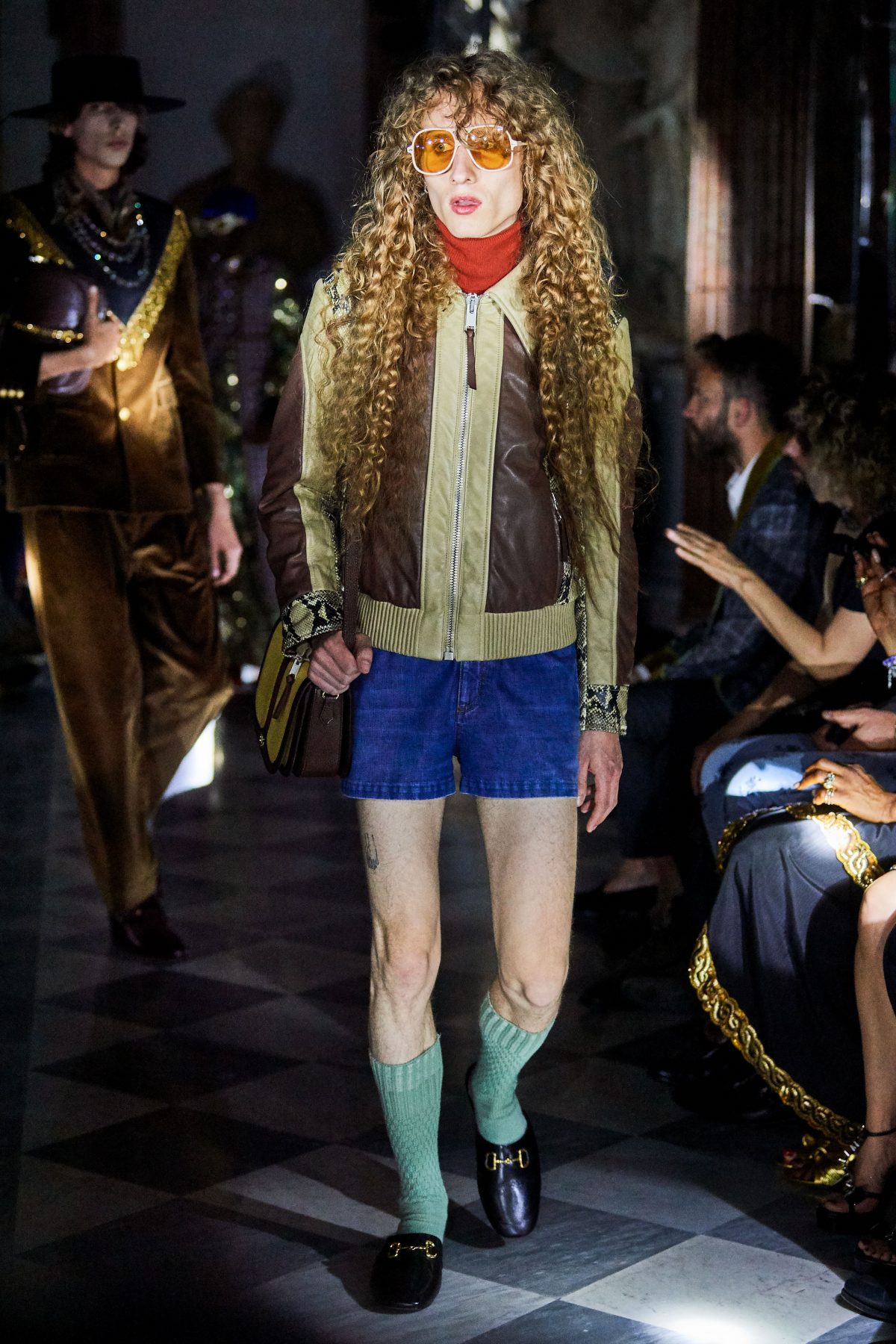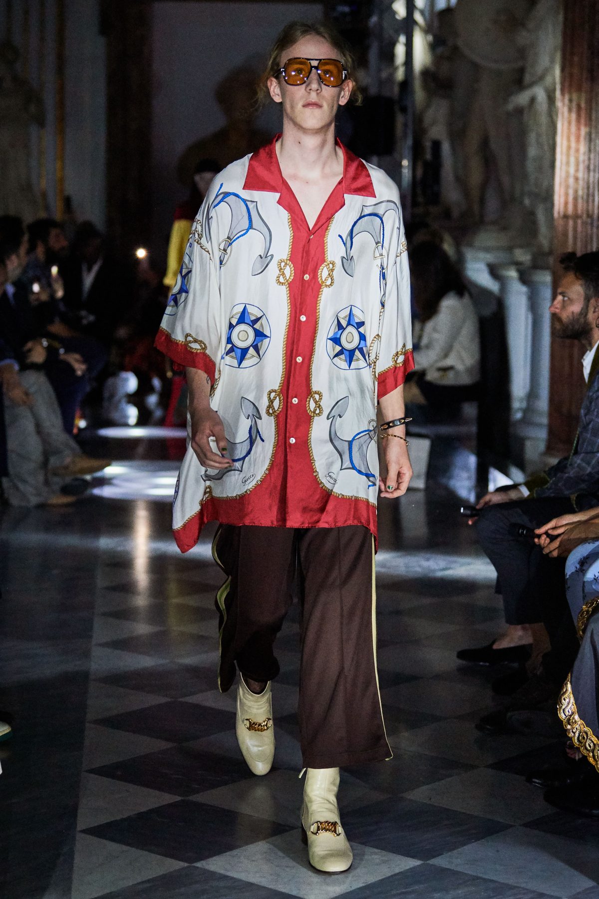 當晚時裝展所有座上客都分配一支電筒用來照亮天橋上的時裝,大家仿佛成為 Gucci 的考古學家,在黑暗中隨着光線尋找神秘莫測的隱藏物體。其實無論是現代還是古代,系列仍然離不開設計師最愛的1970年代元素,復古浮誇的墊肩、公主袖剪綵、花俏而年代感十足的金色刺繡、金黃滾邊鮮紅色斗篷等等,還有延續多季的米奇及米妮角色也在絲綢背心上出現,看似反覆使用的元素卻有嶄新的演繹展示,將未來與過去空間交錯在古老羅馬,激盪出強烈又美妙絕倫的共融信念:解放女性。