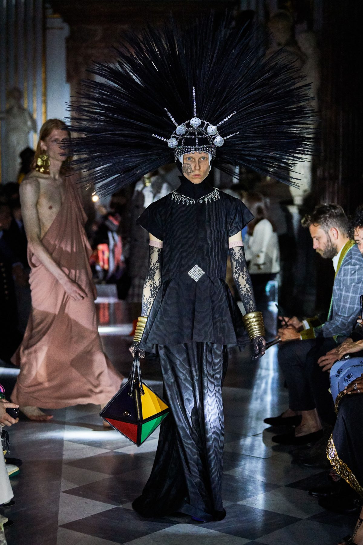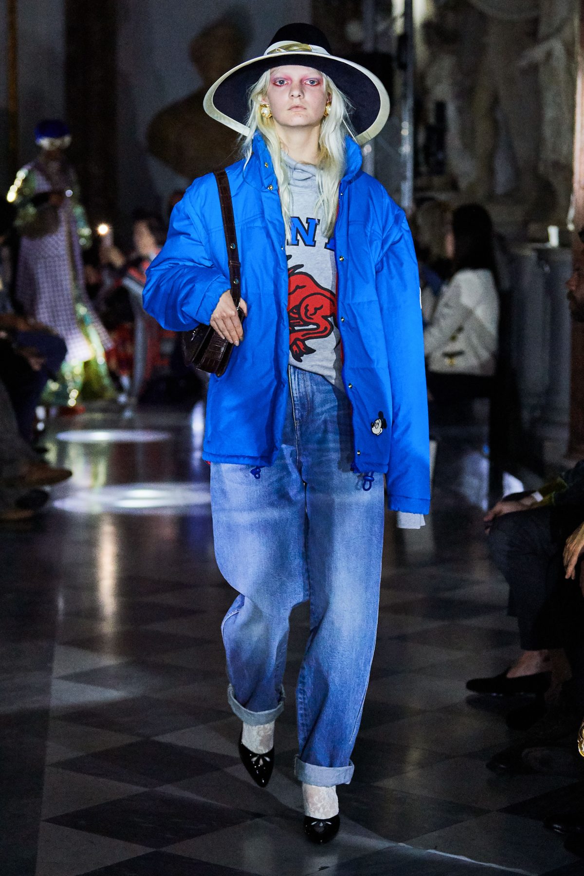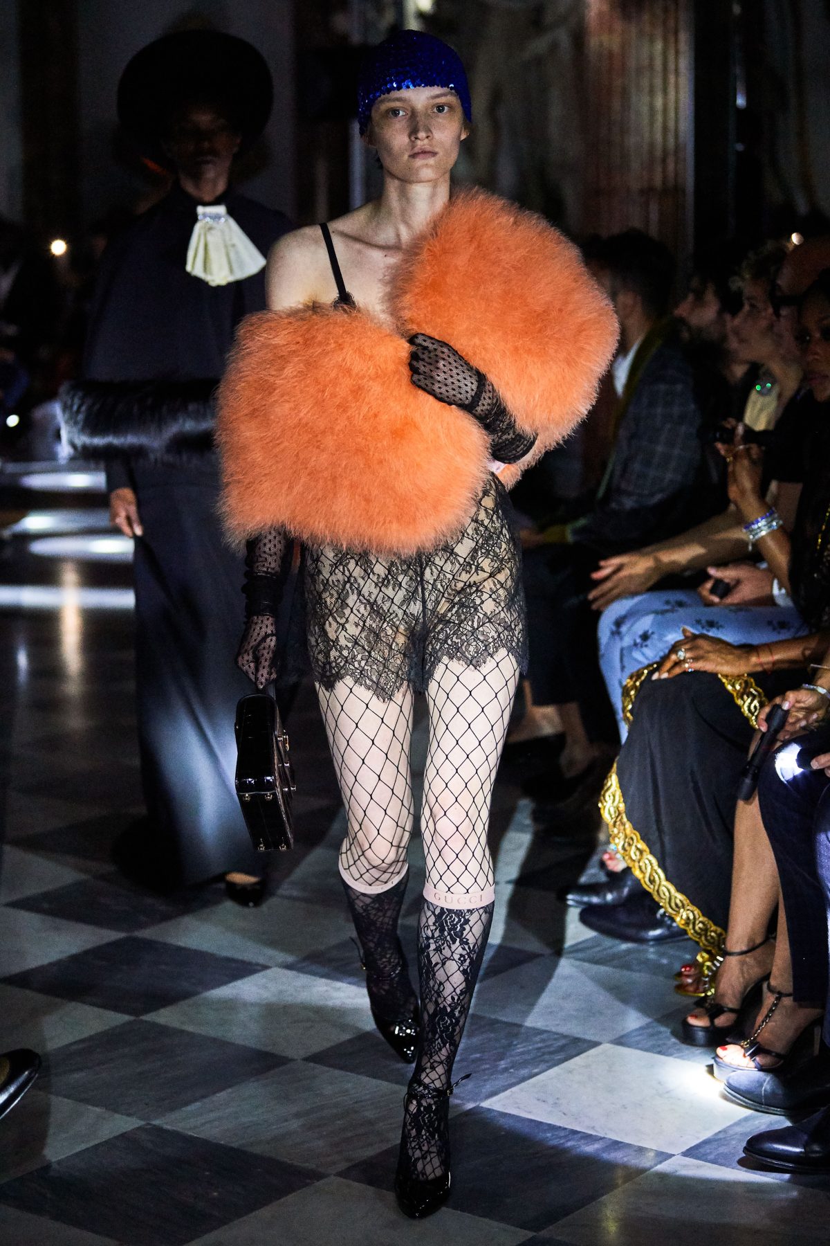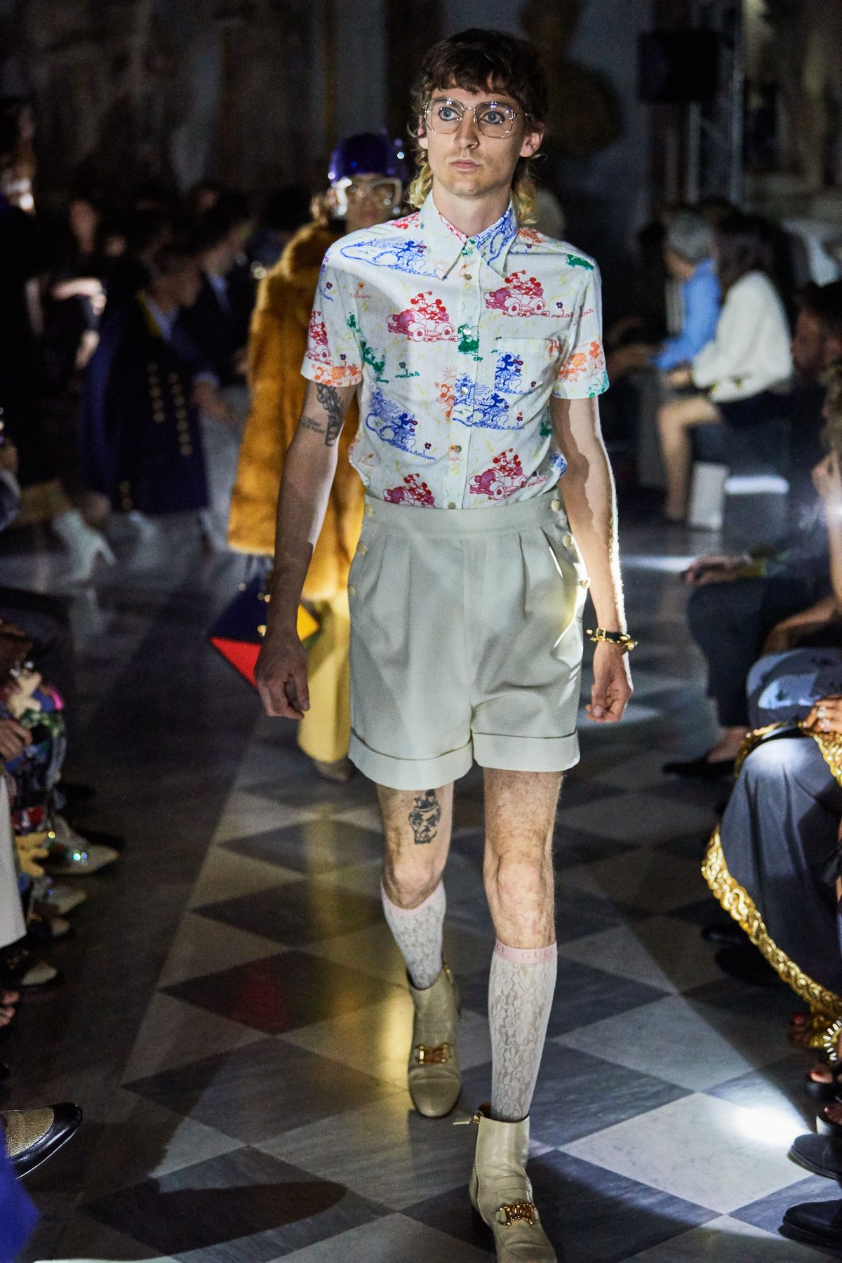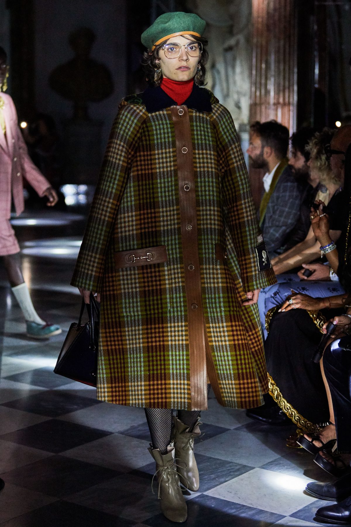 當晚時裝展所有座上客都分配一支電筒用來照亮天橋上的時裝,大家仿佛成為 Gucci 的考古學家,在黑暗中隨着光線尋找神秘莫測的隱藏物體。其實無論是現代還是古代,系列仍然離不開設計師最愛的1970年代元素,復古浮誇的墊肩、公主袖剪綵、花俏而年代感十足的金色刺繡、金黃滾邊鮮紅色斗篷等等,還有延續多季的米奇及米妮角色也在絲綢背心上出現,看似反覆使用的元素卻有嶄新的演繹展示,將未來與過去空間交錯在古老羅馬,激盪出強烈又美妙絕倫的共融信念:解放女性。