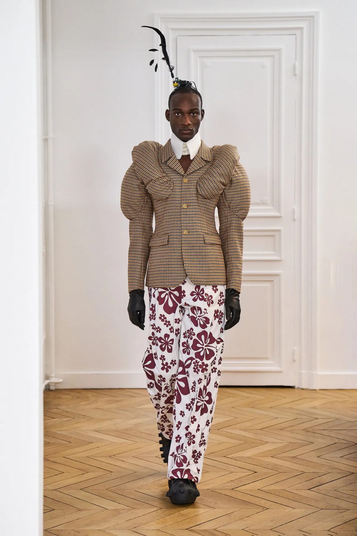團隊將水晶吊燈圖案拼貼成圖案,並用於襯衣與褲子上;修身的開鈕花襯衫作為 70 年代的標誌性產物,設計師們索性讓模特兒穿上藍色條文長褲,戴上浮誇的金色扣子皮帶與黑墨鏡,帶出復古氛圍。除了襯衫上的水晶吊燈圖案,一款有如惡作劇般戲謔的頭巾也引起觀眾注意——繪有女裝銀髮的白色絲質頭巾。確實,在既定概念中,頭巾是一般婦女的常用頭飾,讓男模特兒戴上假髮頭巾,除了模糊性別界線,更營造出錯視效果。同樣應用了錯視效果的,還有結合了飛行員外套的西裝,不論是紅色絨毛或是白色毛絨外套,基本上都與西裝毫無關係,效果宛如 AI 生產出的奇特圖像,衝突的兩者讓人耳目一新。