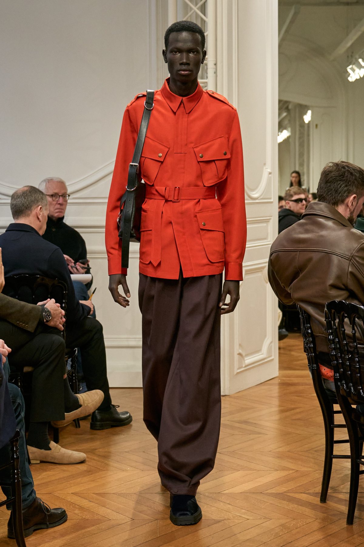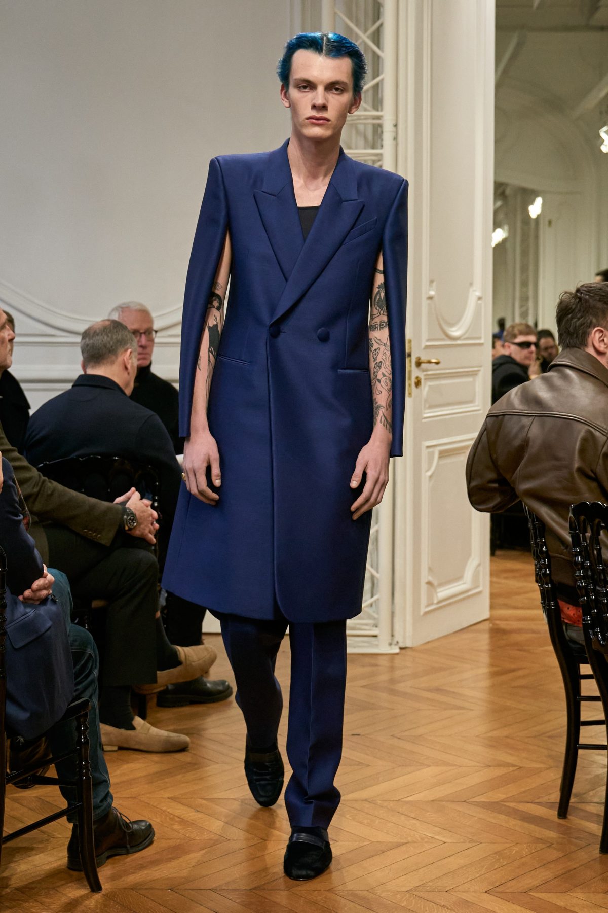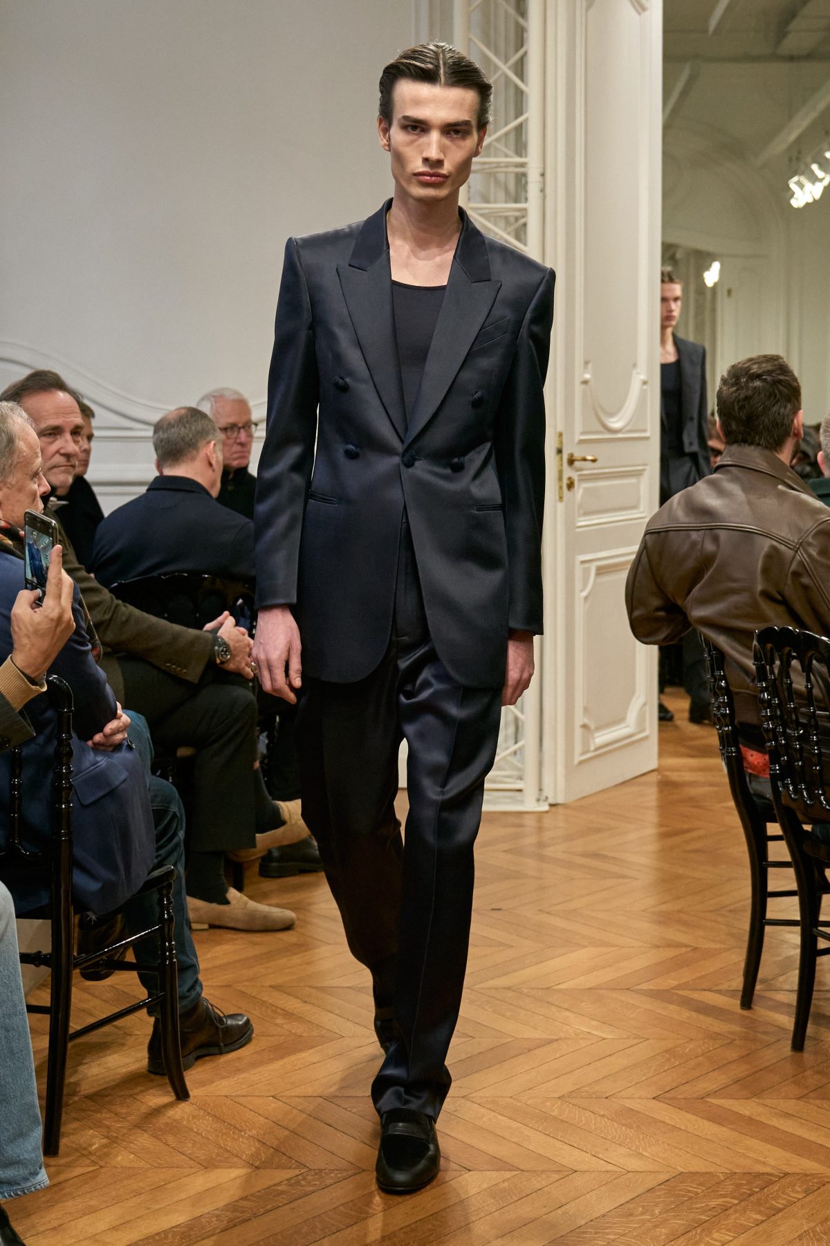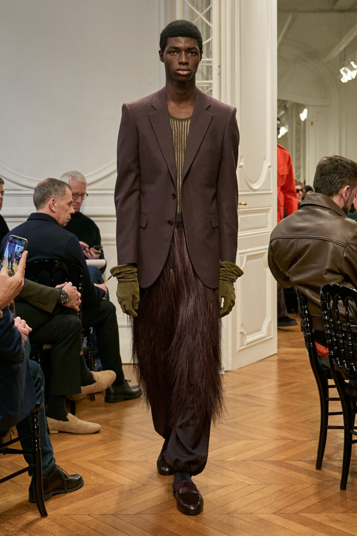 首先從 Givenchy 喬治五世大道的閣樓工作室,步入陳列室的模特兒,穿着 Hubert de Givenchy 在家整理時會穿的灰白色外套,搭配一條筆直的西裝褲與皮鞋,重現這位傳奇設計師的貴族公子形象,亦以乾淨簡潔造型為系列掀開序幕。本季不乏品牌拿手經典正裝,設計團隊為傳統的西裝革履加上不完美的配飾,例如鬆垮的保暖手套、顏色與造型不統一的皮鞋,又或者像是隨手可得女裝流蘇圍巾,都為造型增添了一絲生活氣息,似乎帶有瑕疵的穿搭更顯毫不費力的隨性魅力。