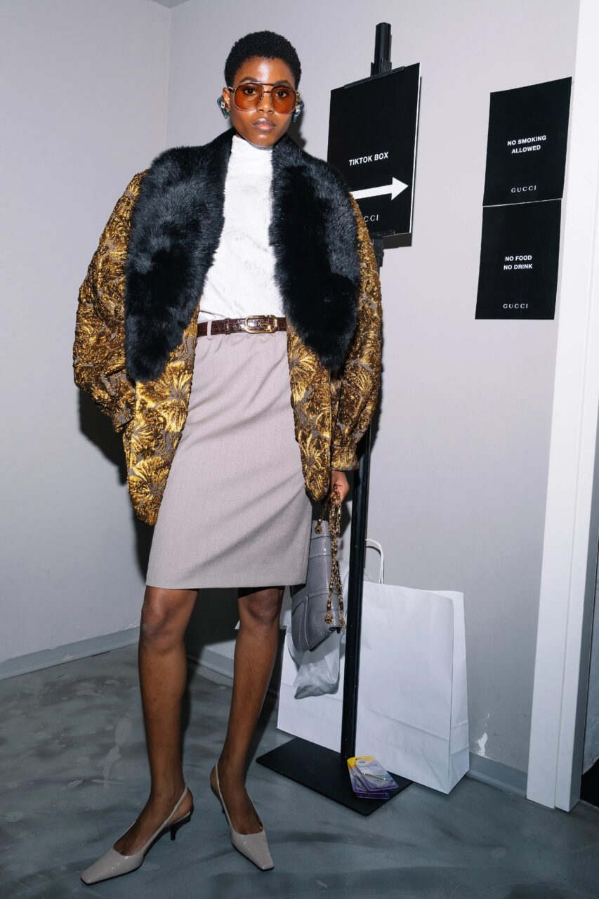 90年代與千禧年的時尚元素則透過標誌性設計重現視野:經典雙G標誌的腰帶以品牌檔案中的歷史符號重新演繹,而尖頭設計的極簡風格高跟鞋則是Tom Ford時期美學的傳承,展現出那個時代的精緻與摩登魅力。