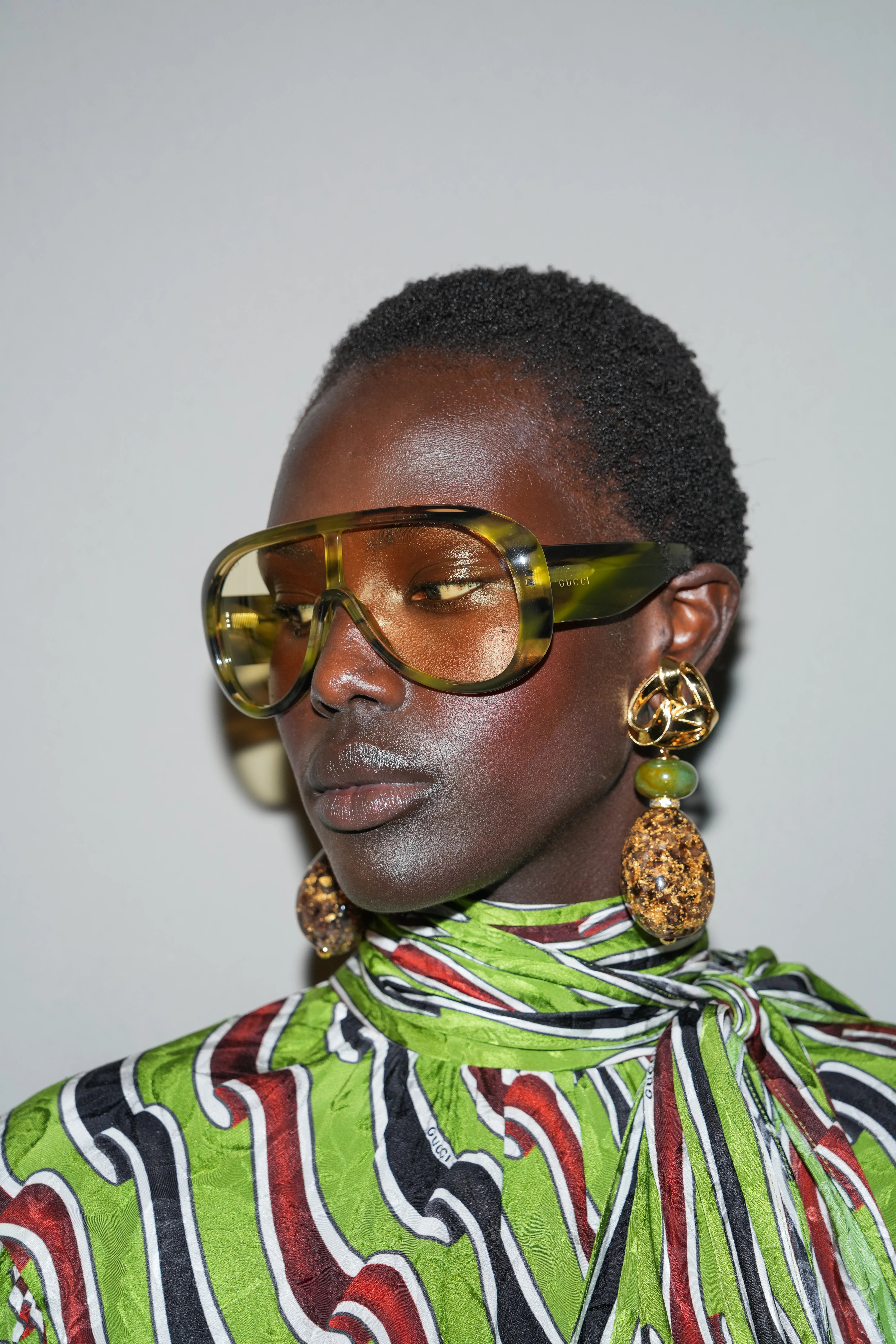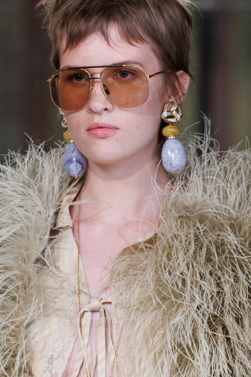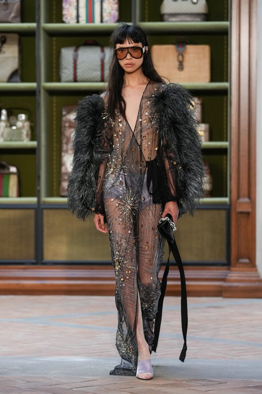 在歷史悠久的Palazzo Settimanni——Gucci檔案館所在地舉行的時裝騷中,這次系列將佛羅倫斯豐厚的歷史底蘊與一場跨越數十年風格的視覺敘事結合,形成了一種大膽且不拘一格的混搭風格,並向“Bling Ring”精神致敬。 70年代的復古風情在系列中重現:超大飛行員眼鏡搭配漸變鏡片與玳瑁框架、明亮色調的Chubby外套,以及帶有閃亮細節的睡衣風長袍,加上重新演繹的華麗薄紗緊身褲襪,展現出極具魅力的時尚風格。