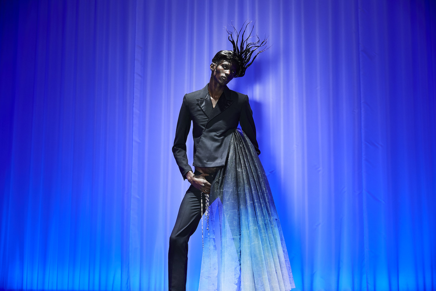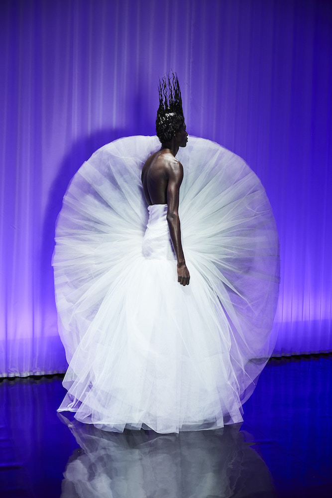 這些作品都是由 Harris Reed 和他的團隊使用新的和升級改造的紡織品手工製作的。在他的學生作品中,男性化的 Savile Row 剪裁和女性化的薄紗之間的混搭仍被保留下來,並以更大膽的輪廓重心演繹。其中一個造型,橙色薄紗人魚裙在前面扇動,露出褲腿和西服,後面是多層的薄紗。另一個造型則是深紅色面料與黑色斜紋布橫跨胸前和肩部,將傳統的領口轉化成了一個具有代表性的造型。最後一個造型,是一件白色婚紗,肯定會引發許多訂製新娘的要求,它是由Reed在一家慈善商店找到的一件再利用的婚紗製成的,衣身被改造成高腰長褲,薄紗裙被設計成肩部拱起,並開了一個小孔,供穿著者的手臂偷看。光是這件作品,團隊就花了兩週時間來完善。