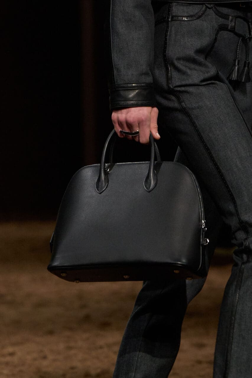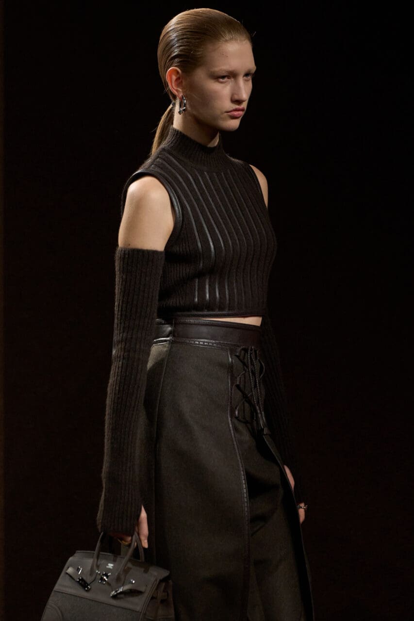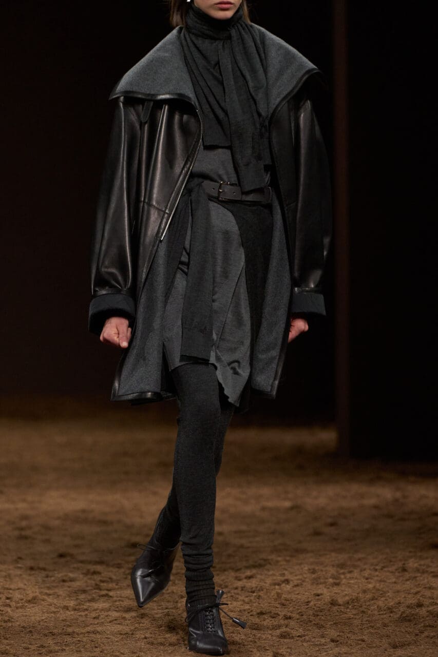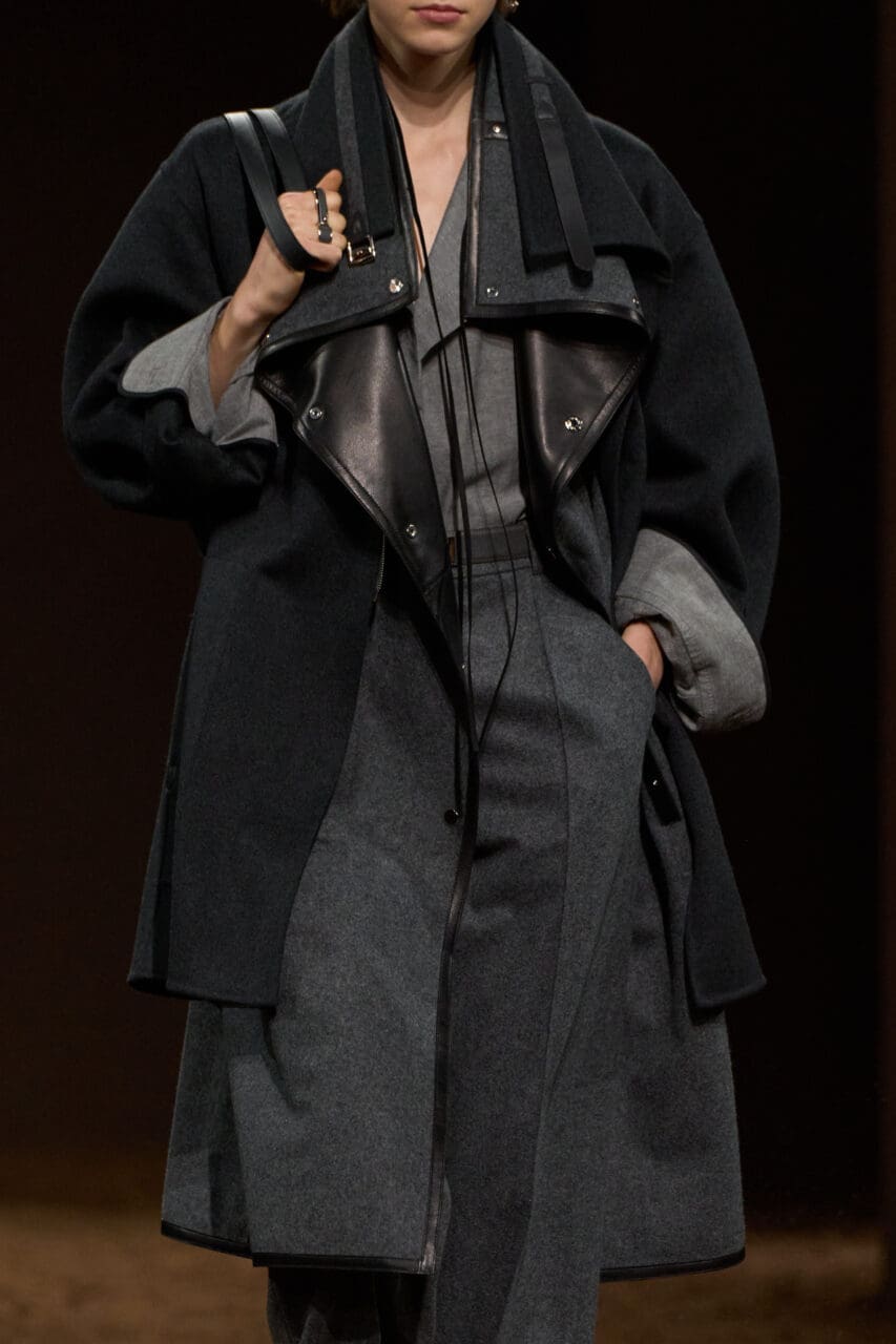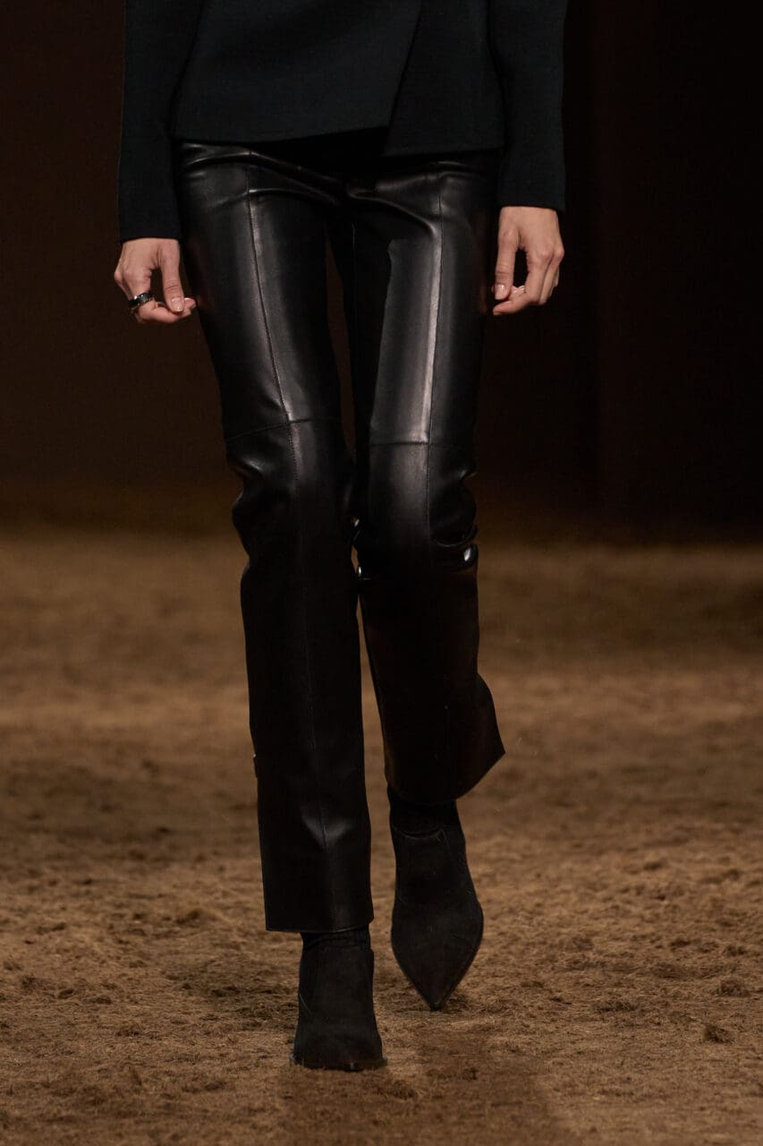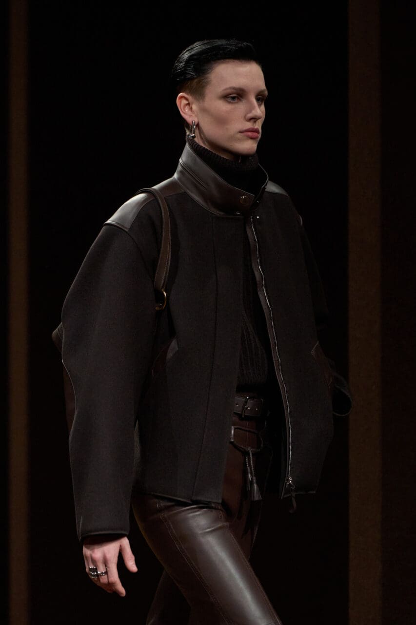 她將這個系列命名為 “Leather Dandy”。到了第六套造型——一件短版絎縫外套,拉鍊敞開露出黑色高領毛衣,搭配高腰窄褲,由光亮的黑色手套皮革製成,展現出一種「馬術騎士」風格——這已經成為Vanhée加入品牌十年來最出色的系列。為甚麼?因為Hermès的核心在於極致精緻的皮革材質與工藝,馬術元素的細膩詮釋,以及令收藏家心動的細節。Vanhée觸及了這些元素中略帶戀物癖的一面,並首次將其從中產階級的框架中解放出來。