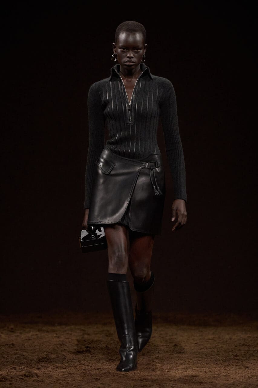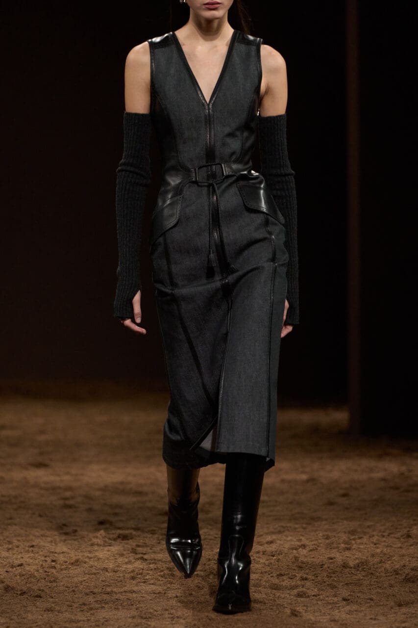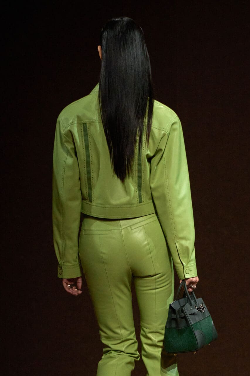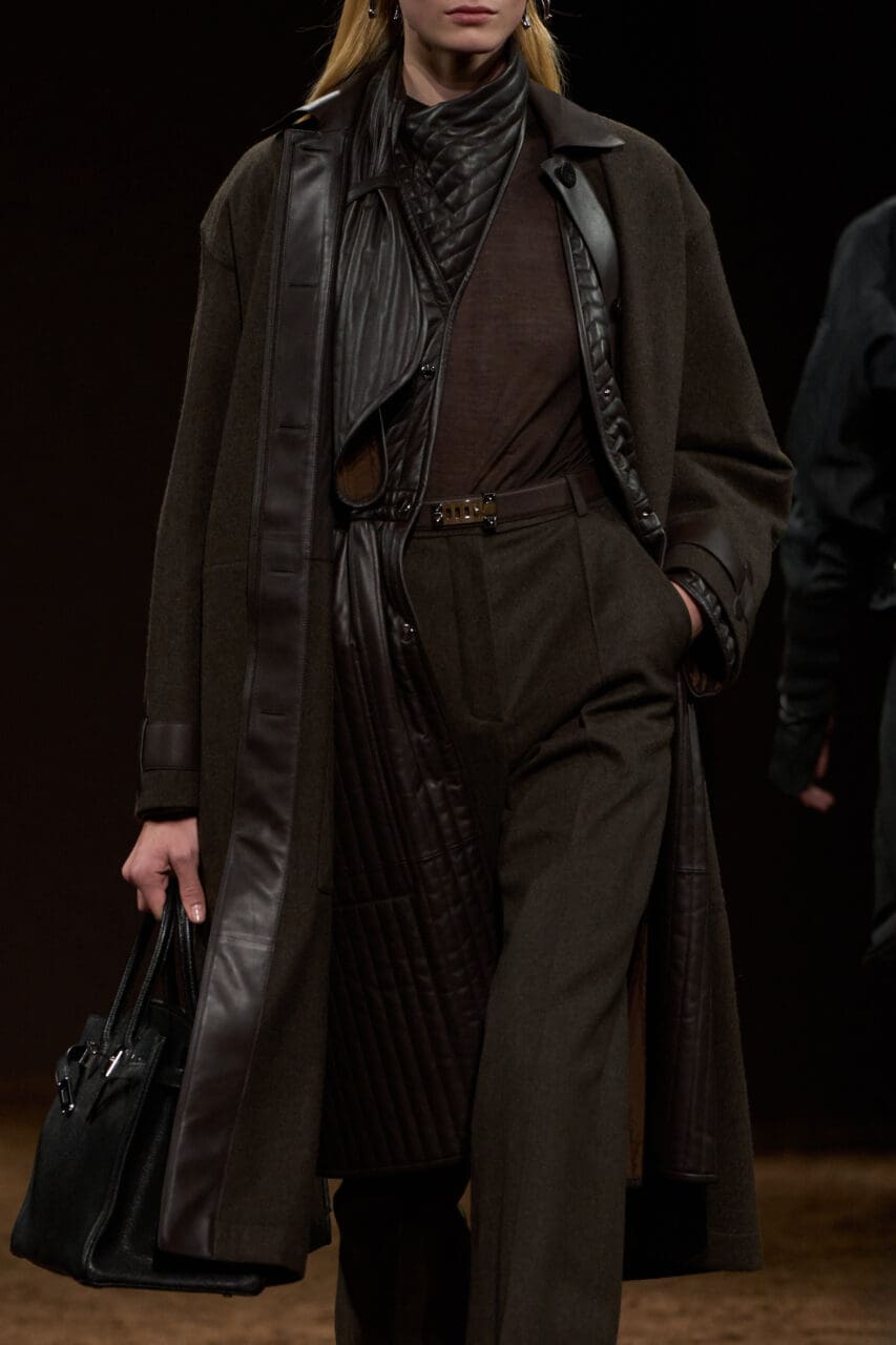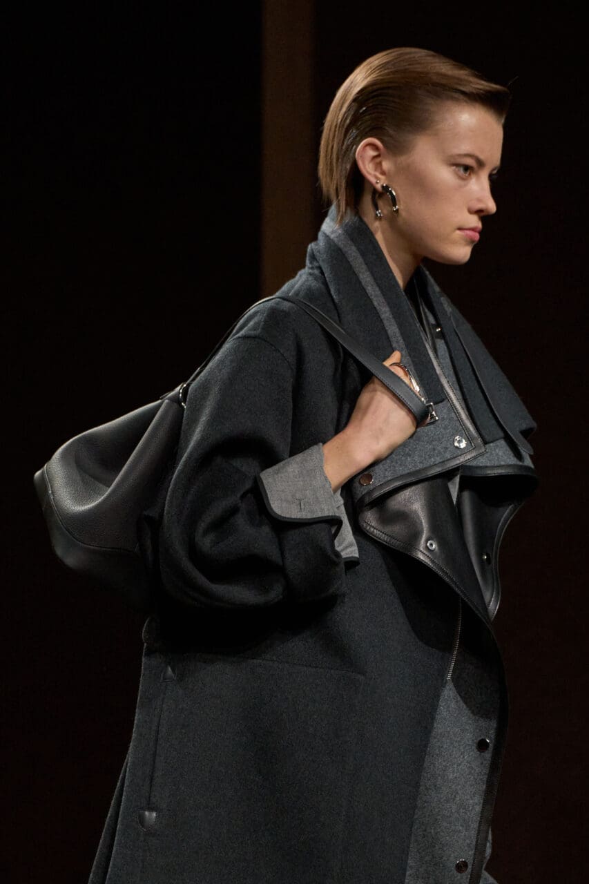 她將這個系列命名為 “Leather Dandy”。到了第六套造型——一件短版絎縫外套,拉鍊敞開露出黑色高領毛衣,搭配高腰窄褲,由光亮的黑色手套皮革製成,展現出一種「馬術騎士」風格——這已經成為Vanhée加入品牌十年來最出色的系列。為甚麼?因為Hermès的核心在於極致精緻的皮革材質與工藝,馬術元素的細膩詮釋,以及令收藏家心動的細節。Vanhée觸及了這些元素中略帶戀物癖的一面,並首次將其從中產階級的框架中解放出來。