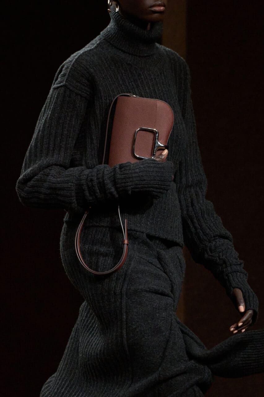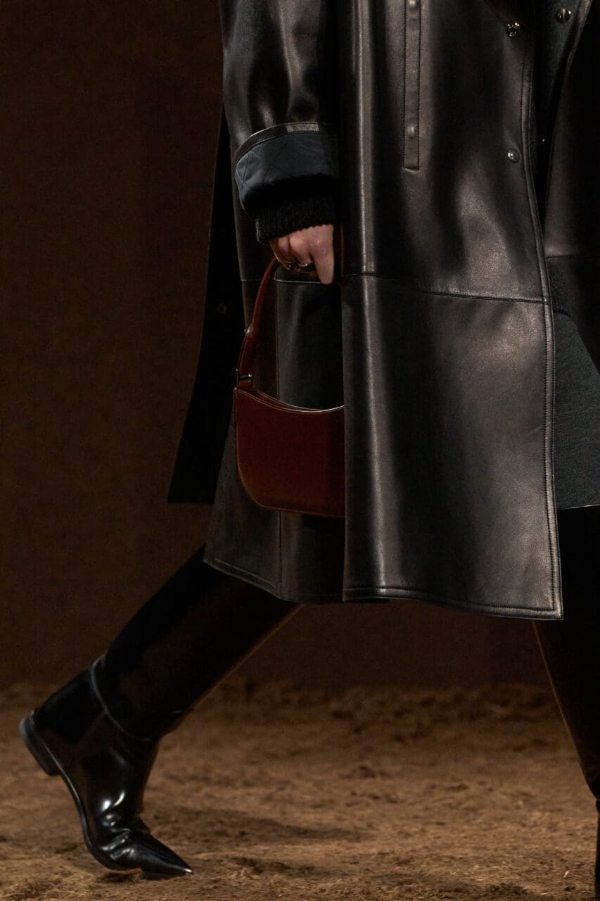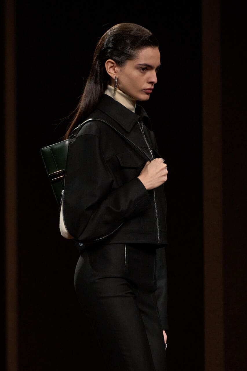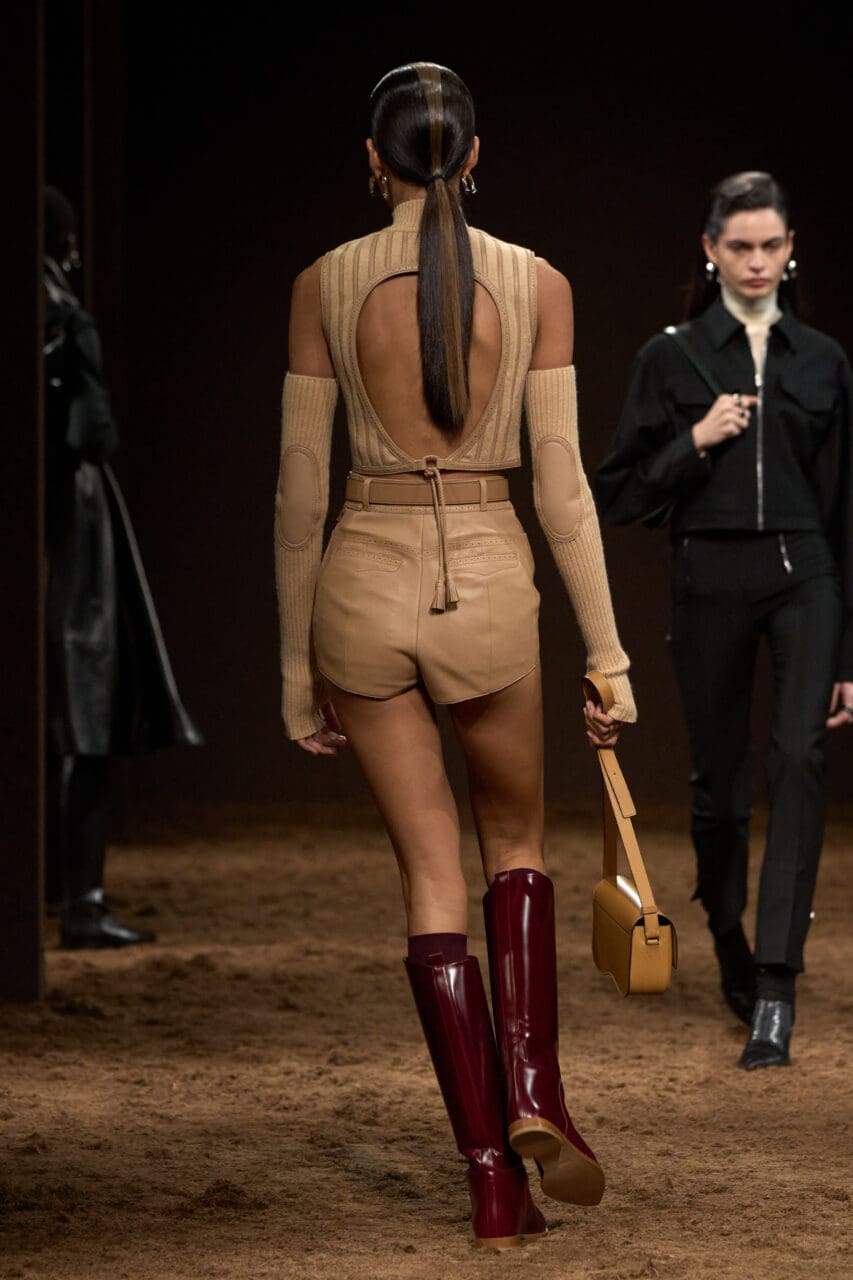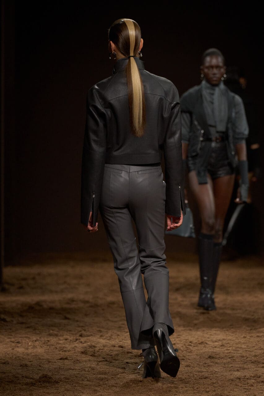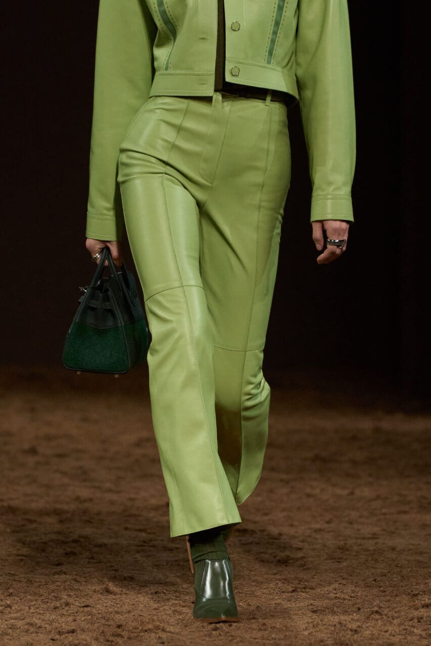 她將這個系列命名為 “Leather Dandy”。到了第六套造型——一件短版絎縫外套,拉鍊敞開露出黑色高領毛衣,搭配高腰窄褲,由光亮的黑色手套皮革製成,展現出一種「馬術騎士」風格——這已經成為Vanhée加入品牌十年來最出色的系列。為甚麼?因為Hermès的核心在於極致精緻的皮革材質與工藝,馬術元素的細膩詮釋,以及令收藏家心動的細節。Vanhée觸及了這些元素中略帶戀物癖的一面,並首次將其從中產階級的框架中解放出來。