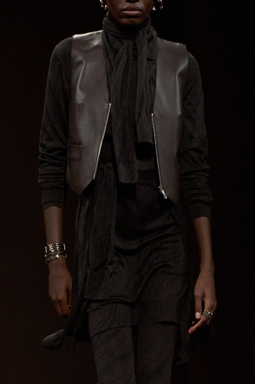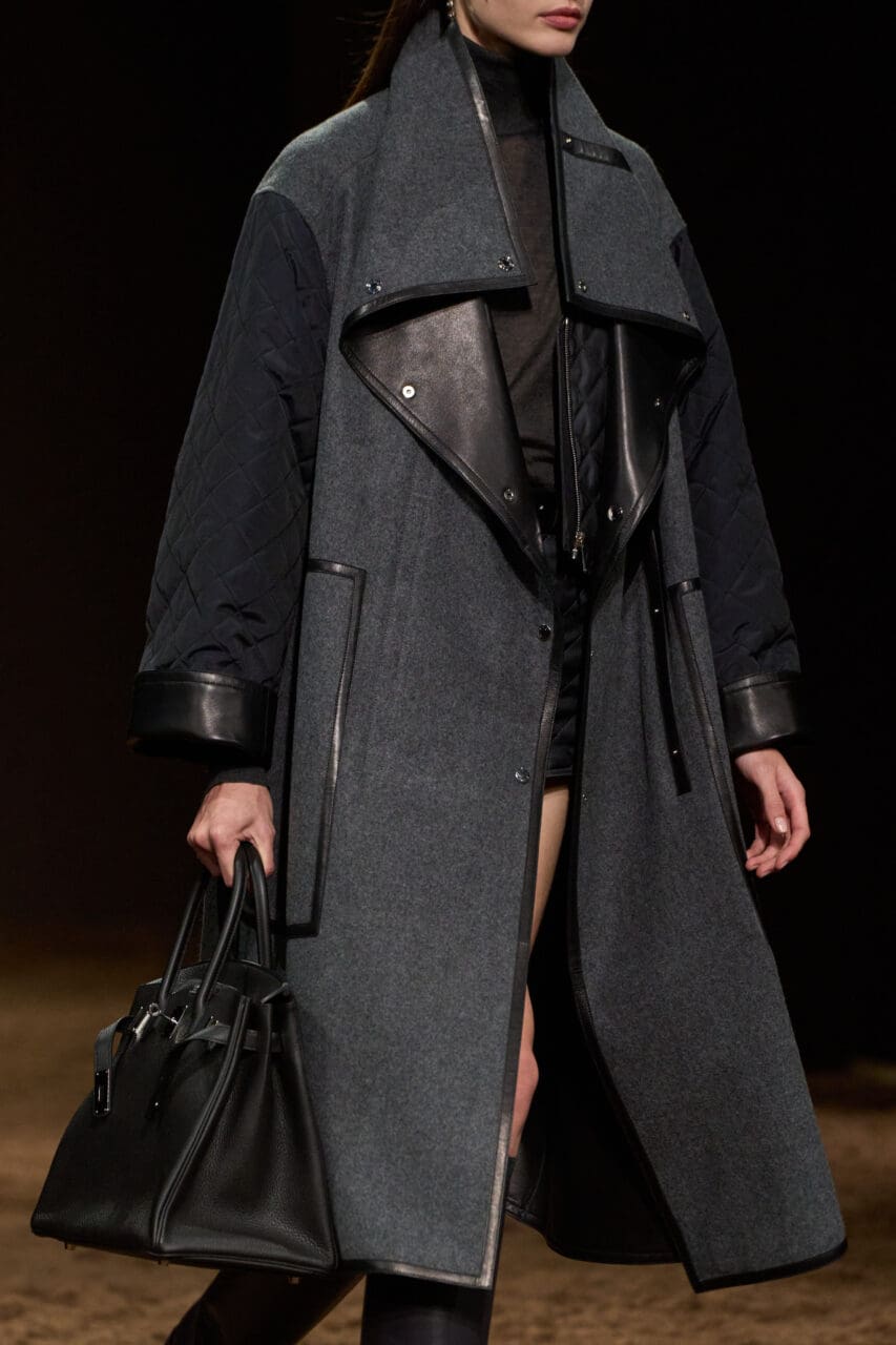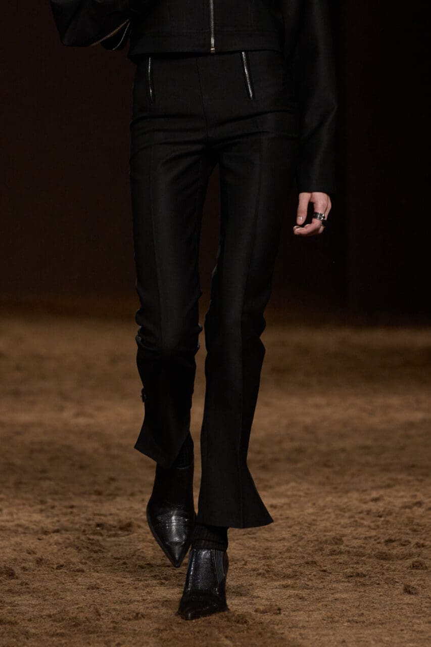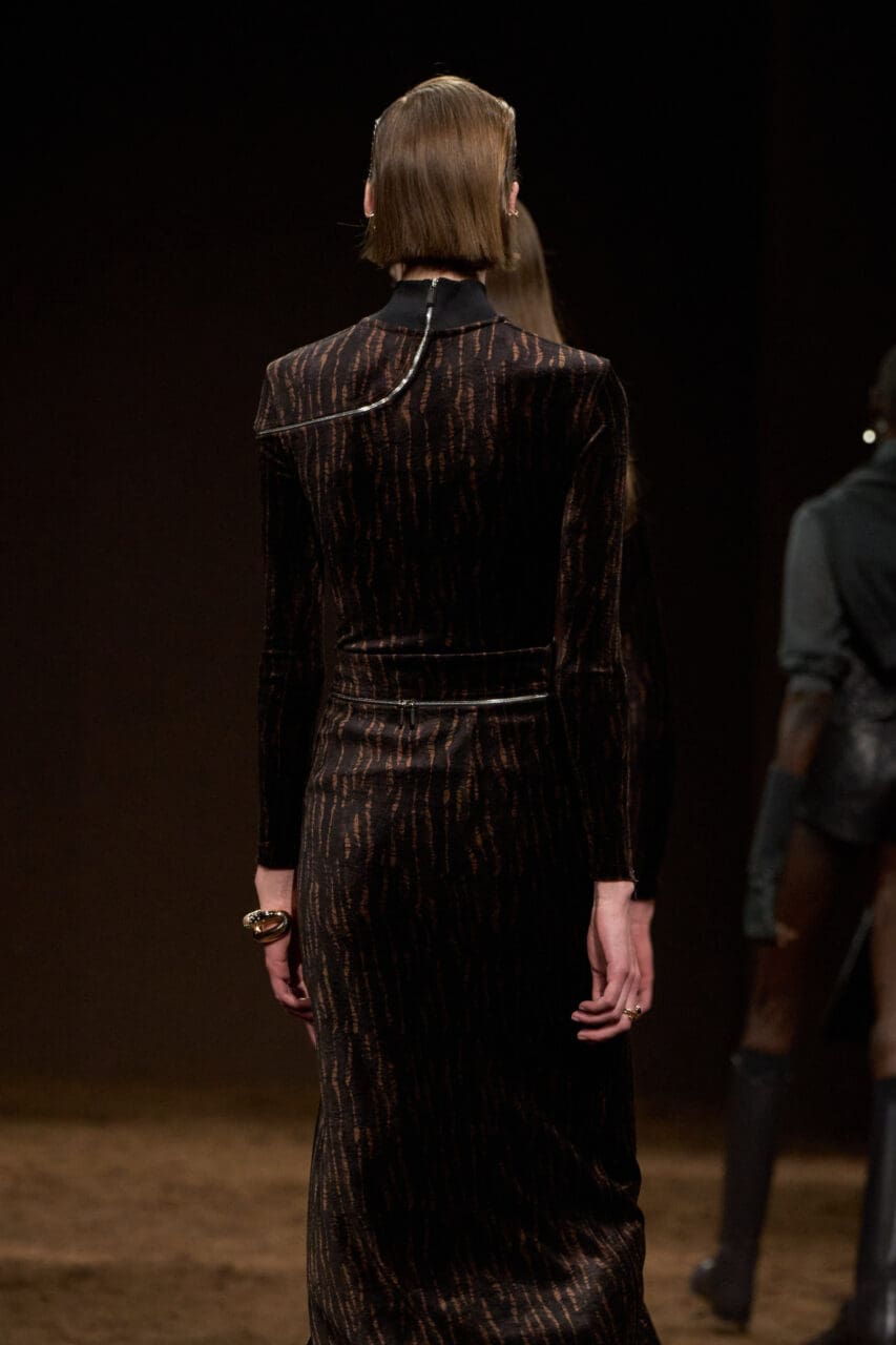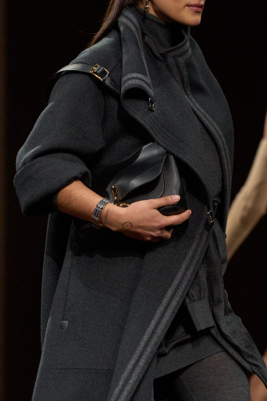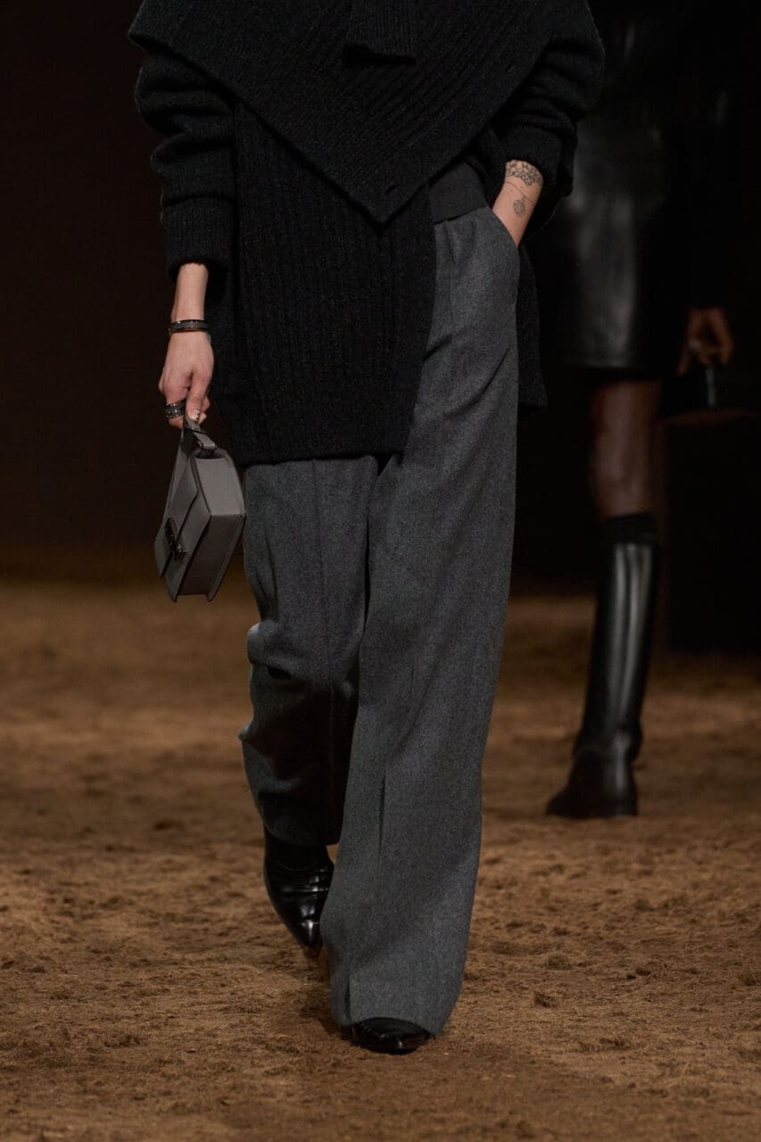 她將這個系列命名為 “Leather Dandy”。到了第六套造型——一件短版絎縫外套,拉鍊敞開露出黑色高領毛衣,搭配高腰窄褲,由光亮的黑色手套皮革製成,展現出一種「馬術騎士」風格——這已經成為Vanhée加入品牌十年來最出色的系列。為甚麼?因為Hermès的核心在於極致精緻的皮革材質與工藝,馬術元素的細膩詮釋,以及令收藏家心動的細節。Vanhée觸及了這些元素中略帶戀物癖的一面,並首次將其從中產階級的框架中解放出來。