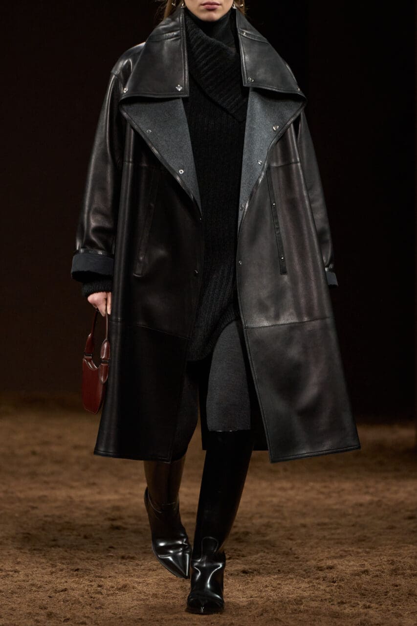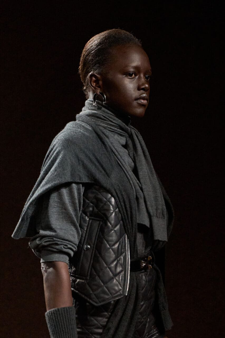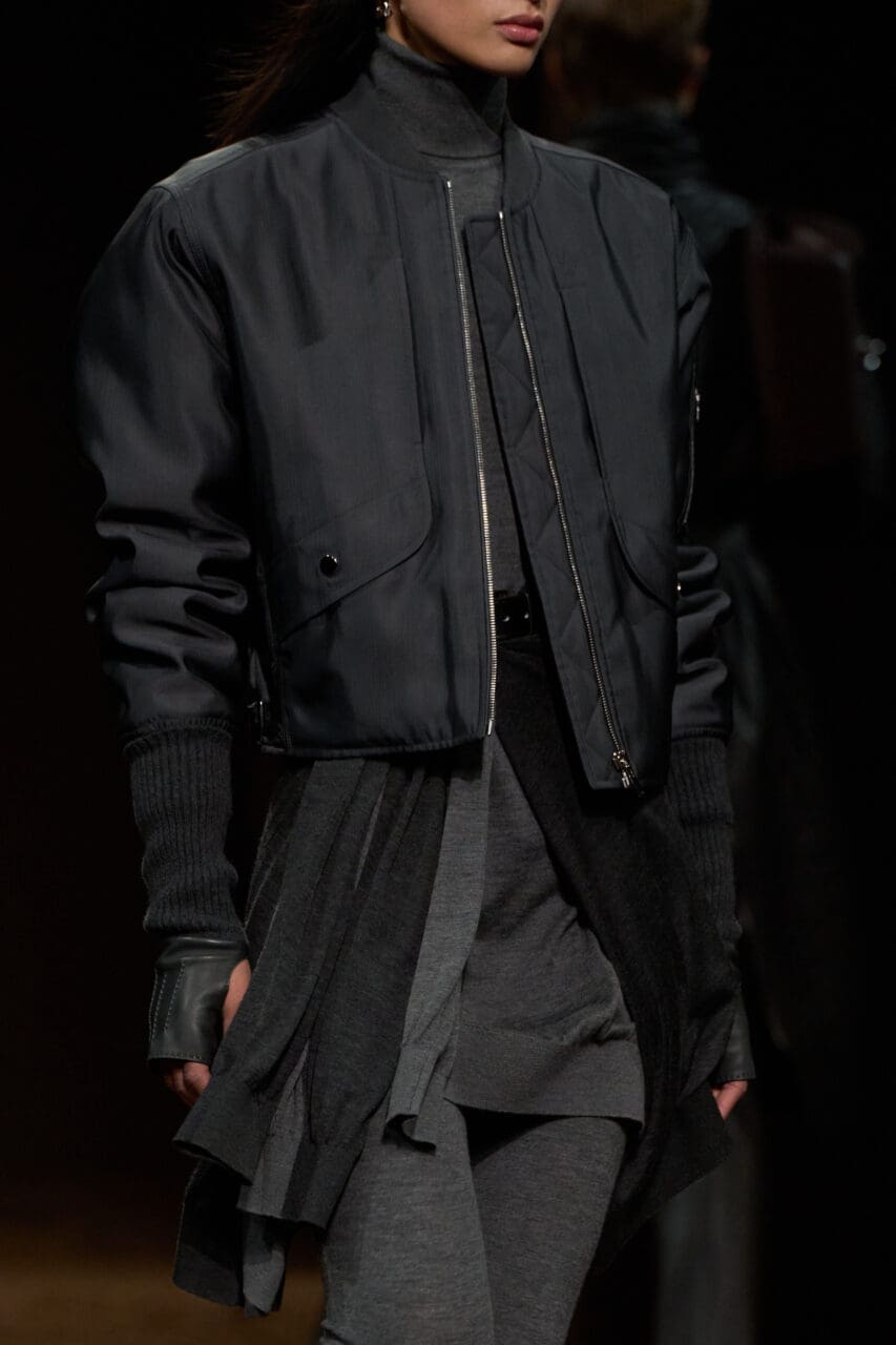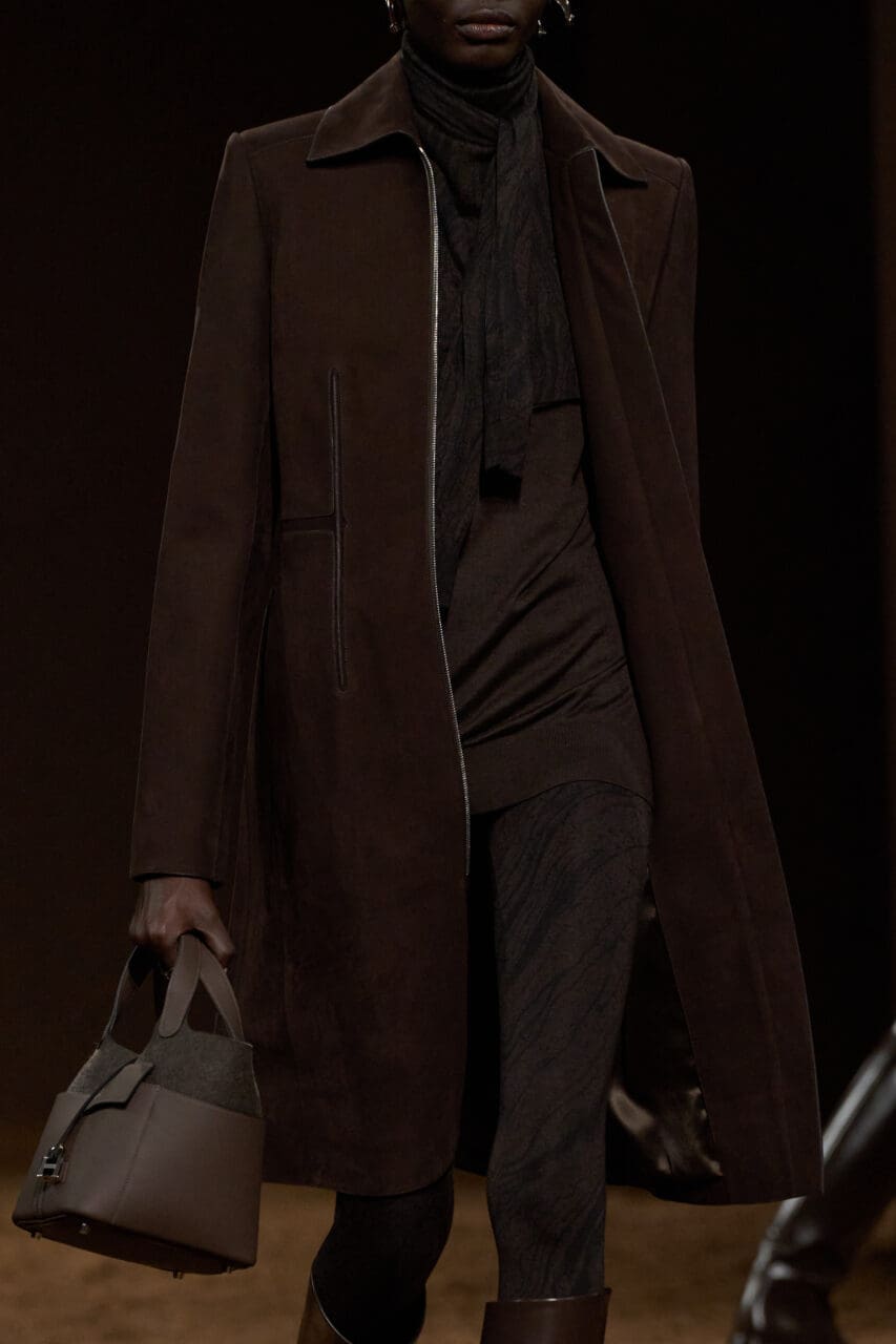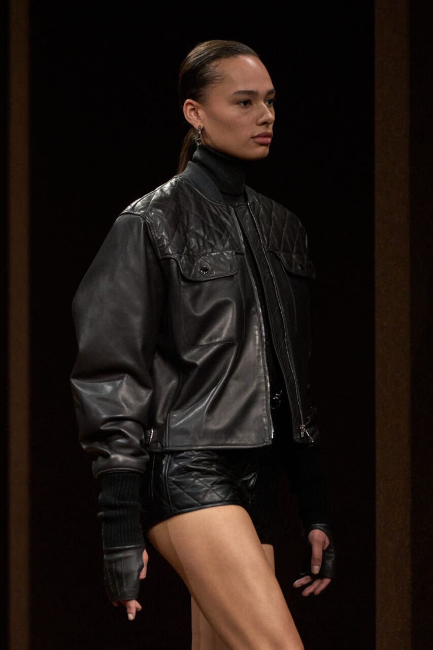 她將這個系列命名為 “Leather Dandy”。到了第六套造型——一件短版絎縫外套,拉鍊敞開露出黑色高領毛衣,搭配高腰窄褲,由光亮的黑色手套皮革製成,展現出一種「馬術騎士」風格——這已經成為Vanhée加入品牌十年來最出色的系列。為甚麼?因為Hermès的核心在於極致精緻的皮革材質與工藝,馬術元素的細膩詮釋,以及令收藏家心動的細節。Vanhée觸及了這些元素中略帶戀物癖的一面,並首次將其從中產階級的框架中解放出來。