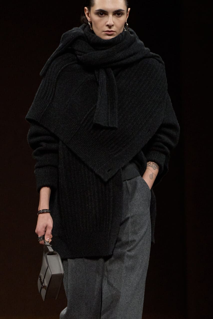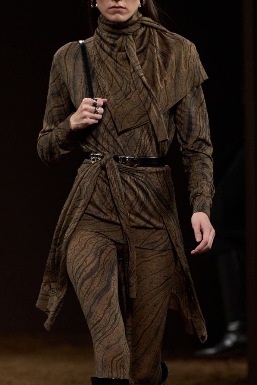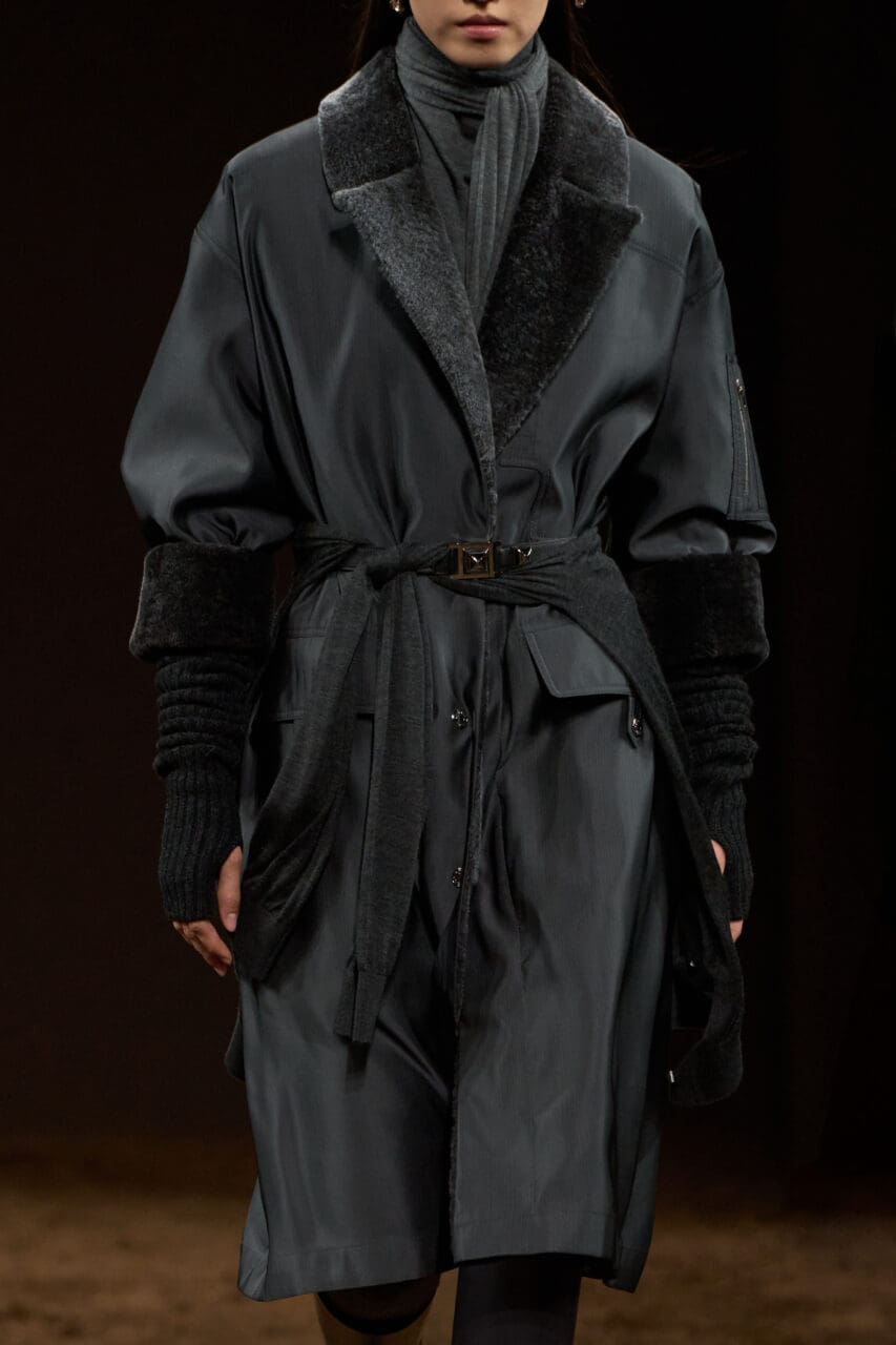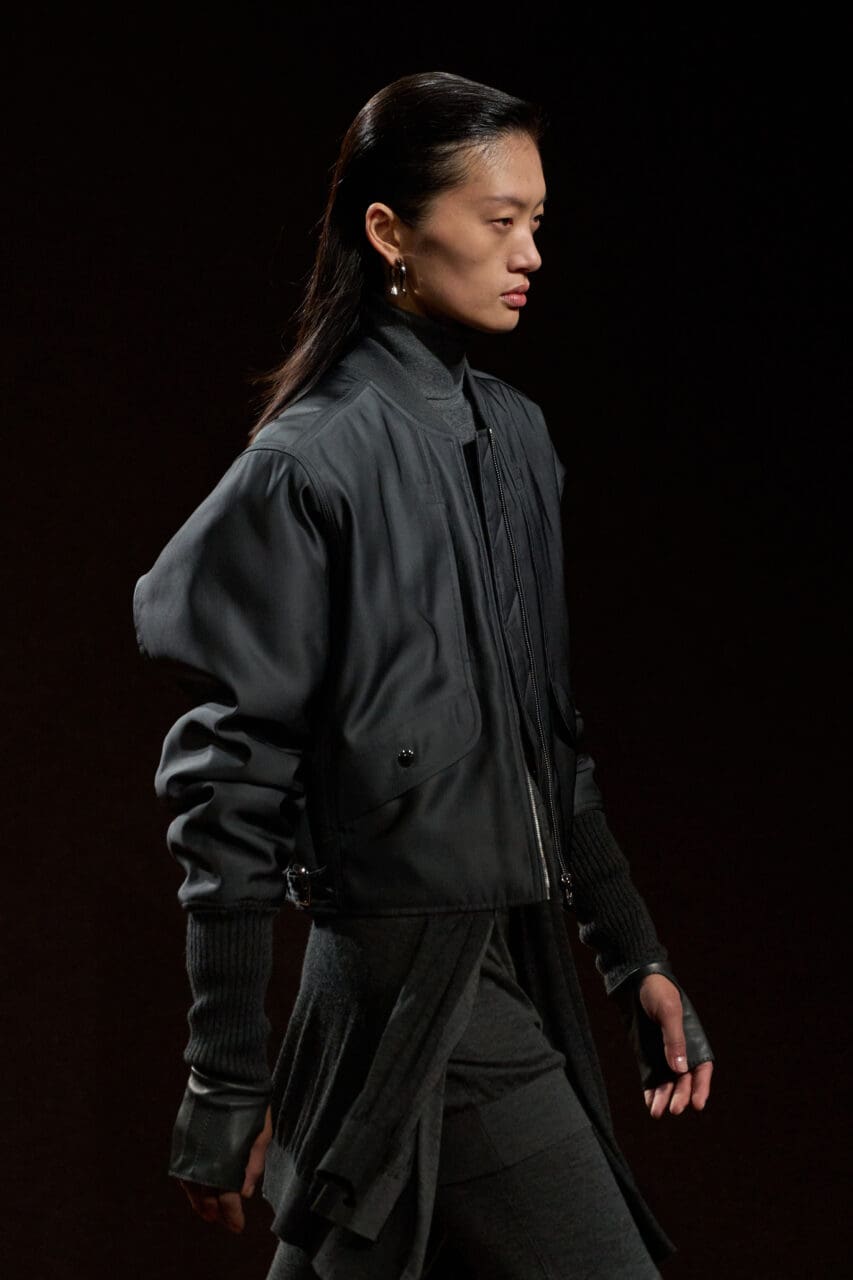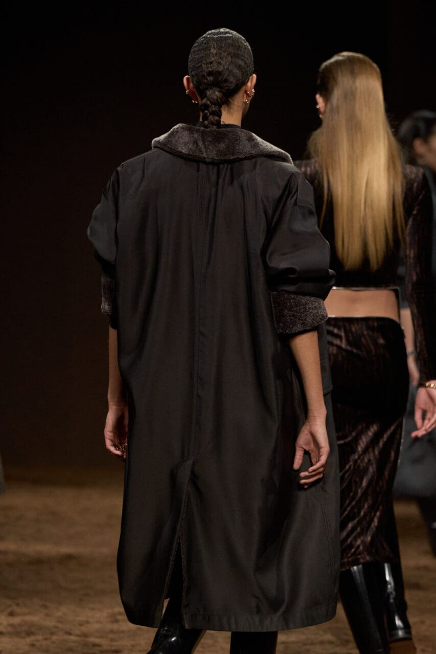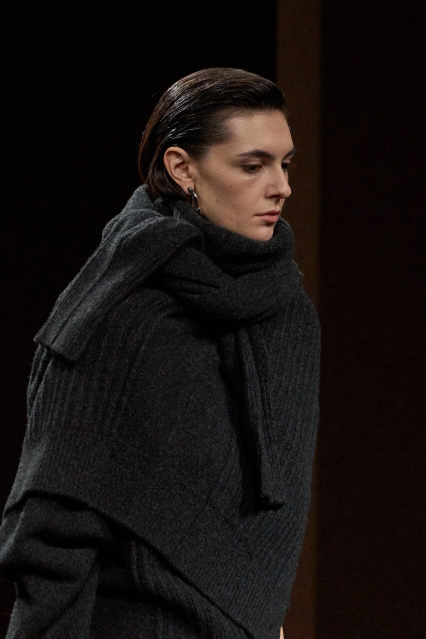 她將這個系列命名為 “Leather Dandy”。到了第六套造型——一件短版絎縫外套,拉鍊敞開露出黑色高領毛衣,搭配高腰窄褲,由光亮的黑色手套皮革製成,展現出一種「馬術騎士」風格——這已經成為Vanhée加入品牌十年來最出色的系列。為甚麼?因為Hermès的核心在於極致精緻的皮革材質與工藝,馬術元素的細膩詮釋,以及令收藏家心動的細節。Vanhée觸及了這些元素中略帶戀物癖的一面,並首次將其從中產階級的框架中解放出來。