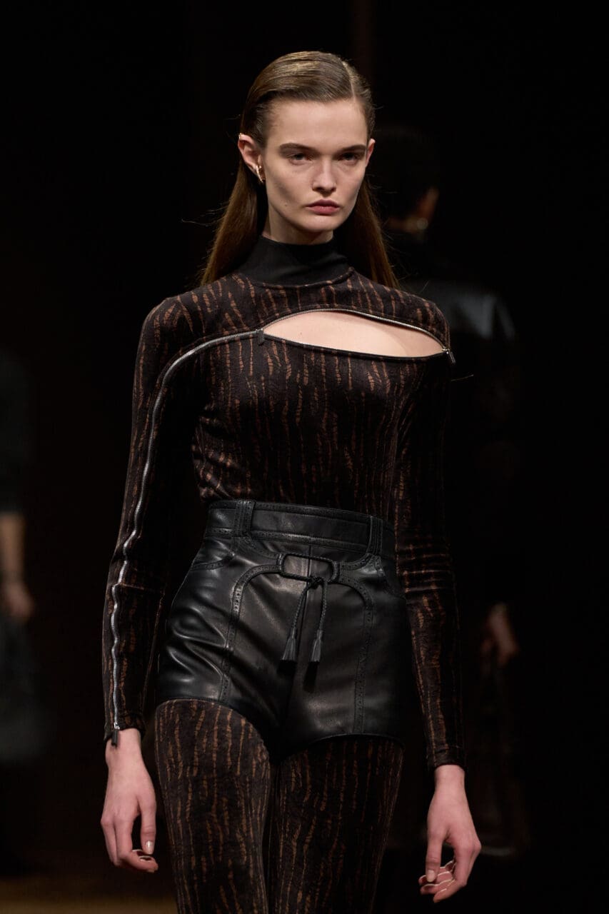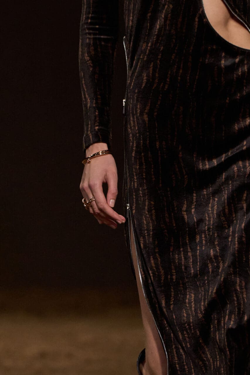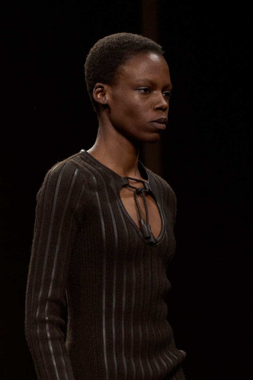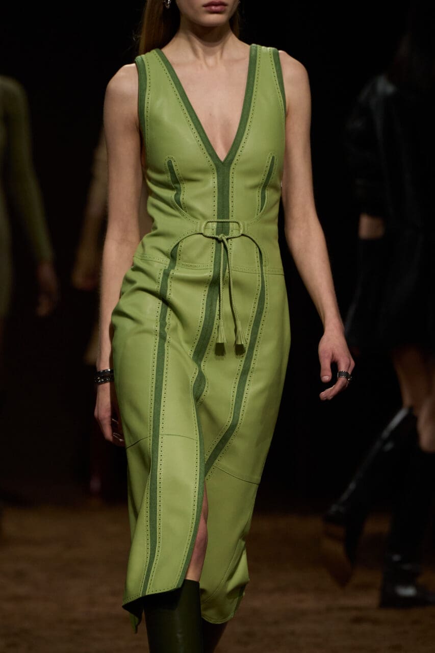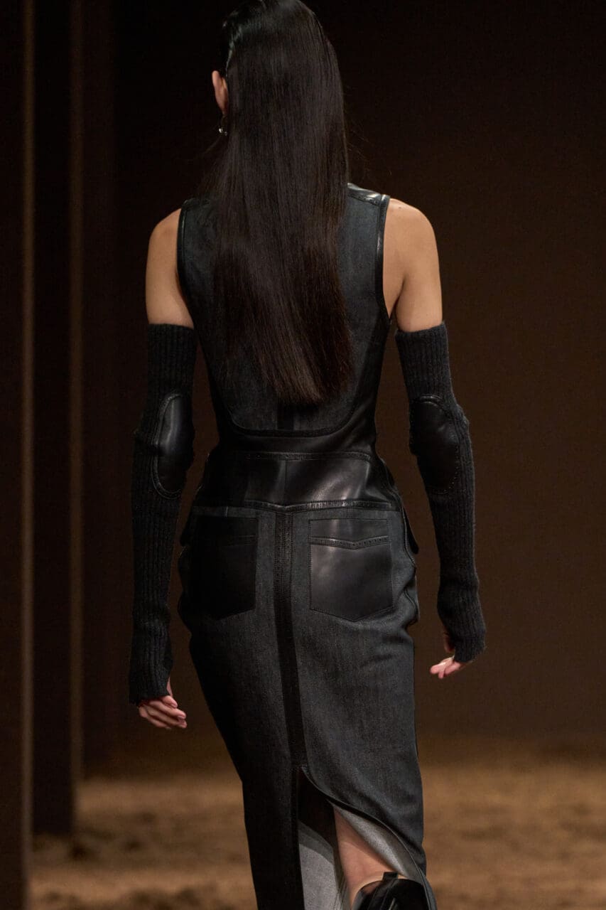她描述創作起點的方式聽起來相當平凡:「最初,它是毛氈——皮革的好朋友與支持者。還有雕花鞋。」直到你看到這些元素如何在超修身深V禮服中完美結合,禮服由皮革與毛氈面料製成,飾以雕花工具的穿孔線條,並以繫帶、環扣與流蘇點綴。這並非意味著顛覆性的女性力量與過於誇張的性感,實際上這些設計是被限制在實用主義、隨性時尚與極致性感之間的一種極簡平衡中,反而更加有力。