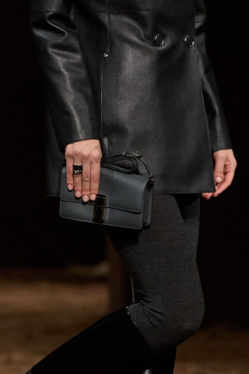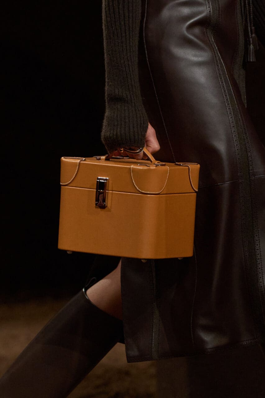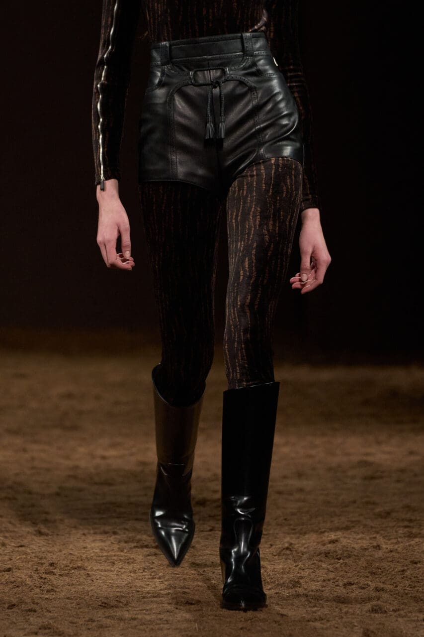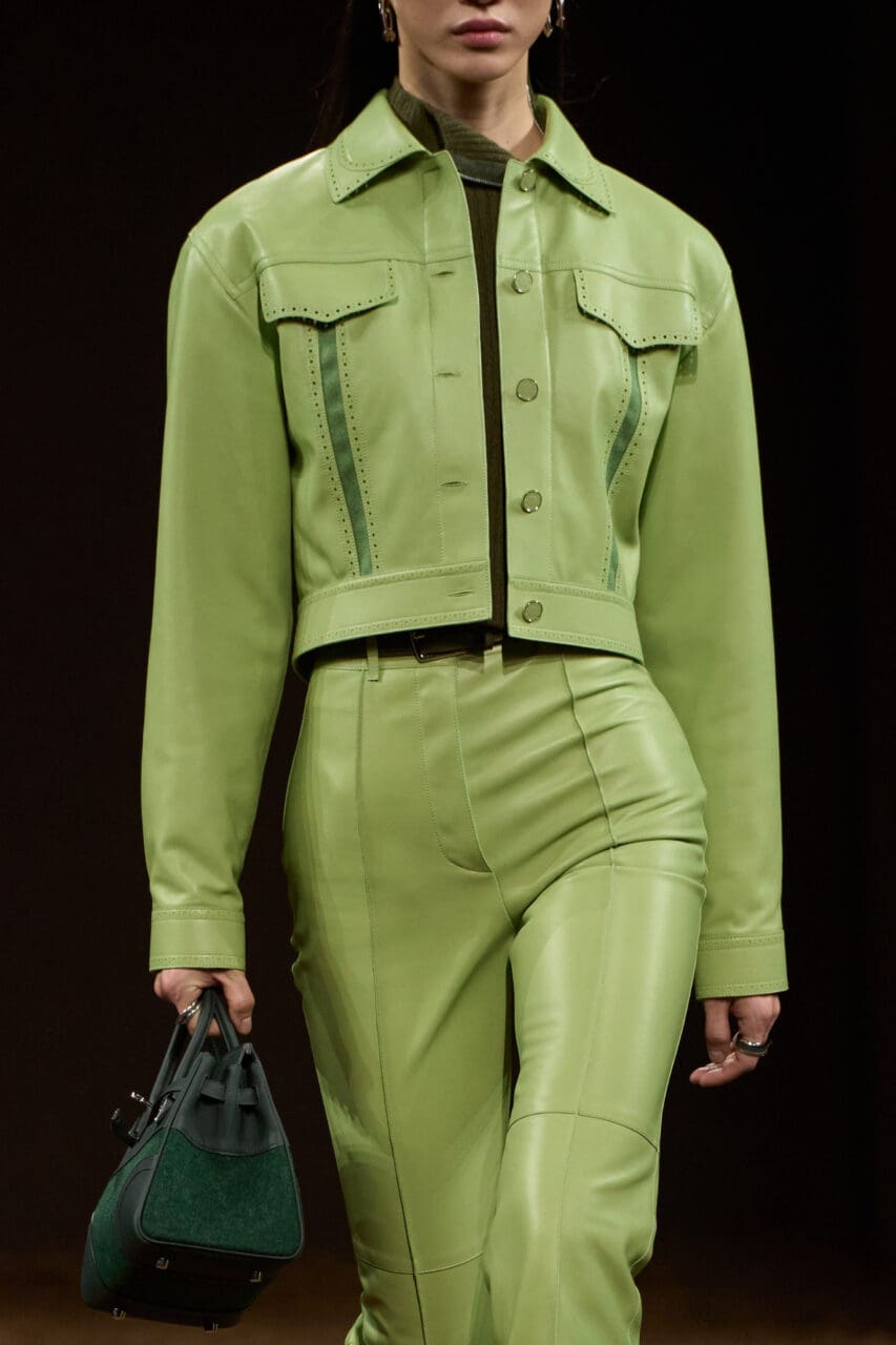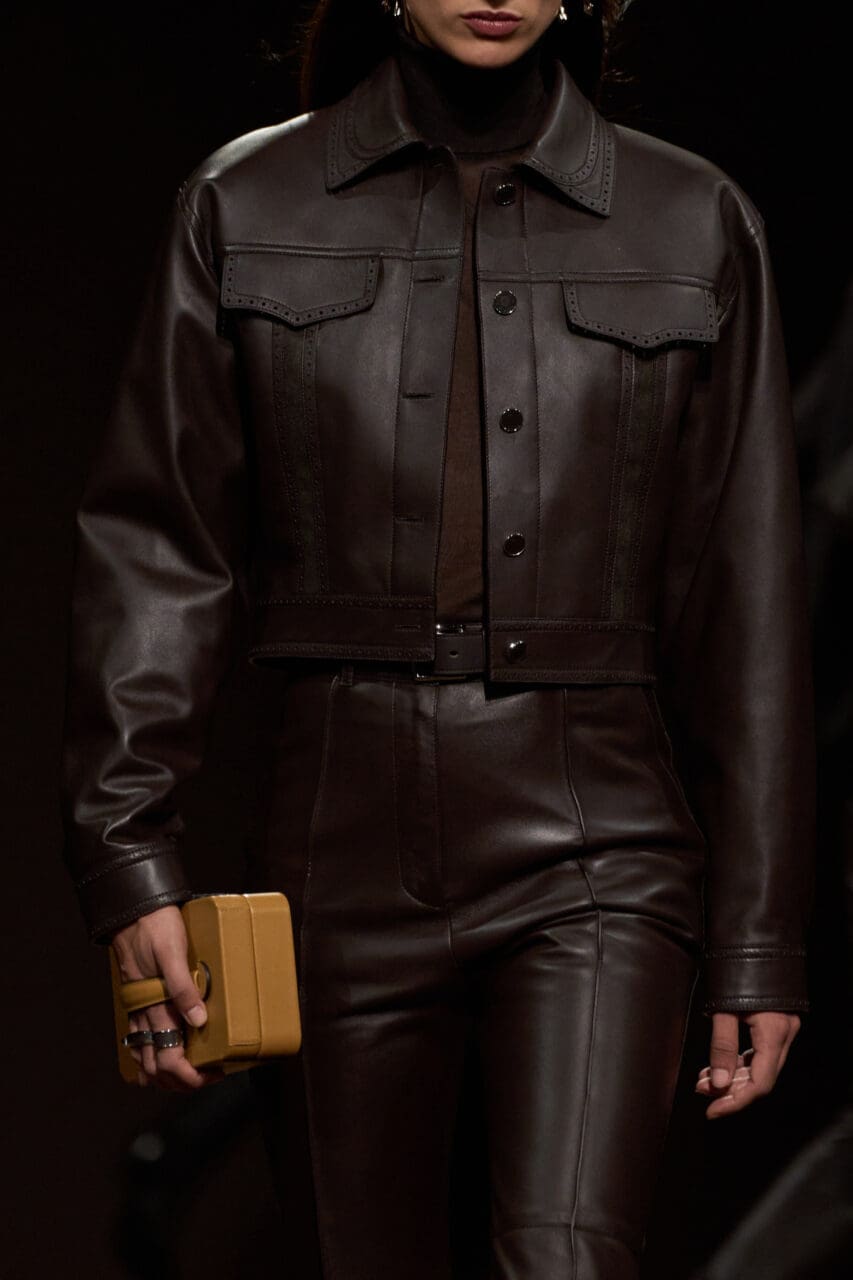 一些具體例子:一件有著強勢肩線的棕色皮革無領Spencer外套,搭配一種馬鞍袋式裙襬,以鉻扣固定;一件拉鍊直達背部的騎行外套,露出絎縫皮革內襯,這件內襯本身也可作為第二件外套呈現。還有許多皮革短褲、喇叭皮革褲,以及小巧迷人的「小手袋」夾在腋下,還有一個單獨的小型、符合人體工學的梅紫色馬鞍袋,配以大型銀色馬銜扣。