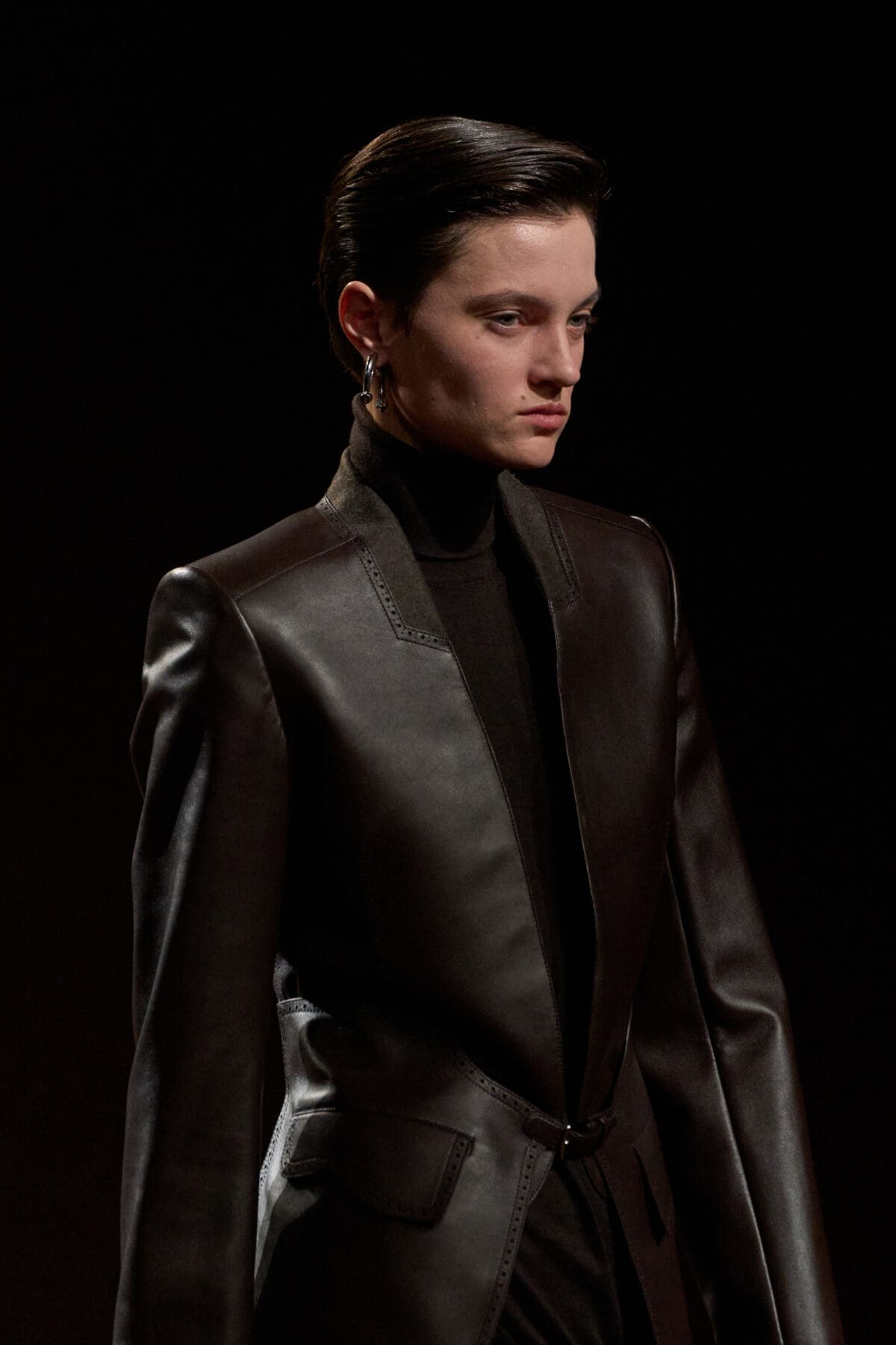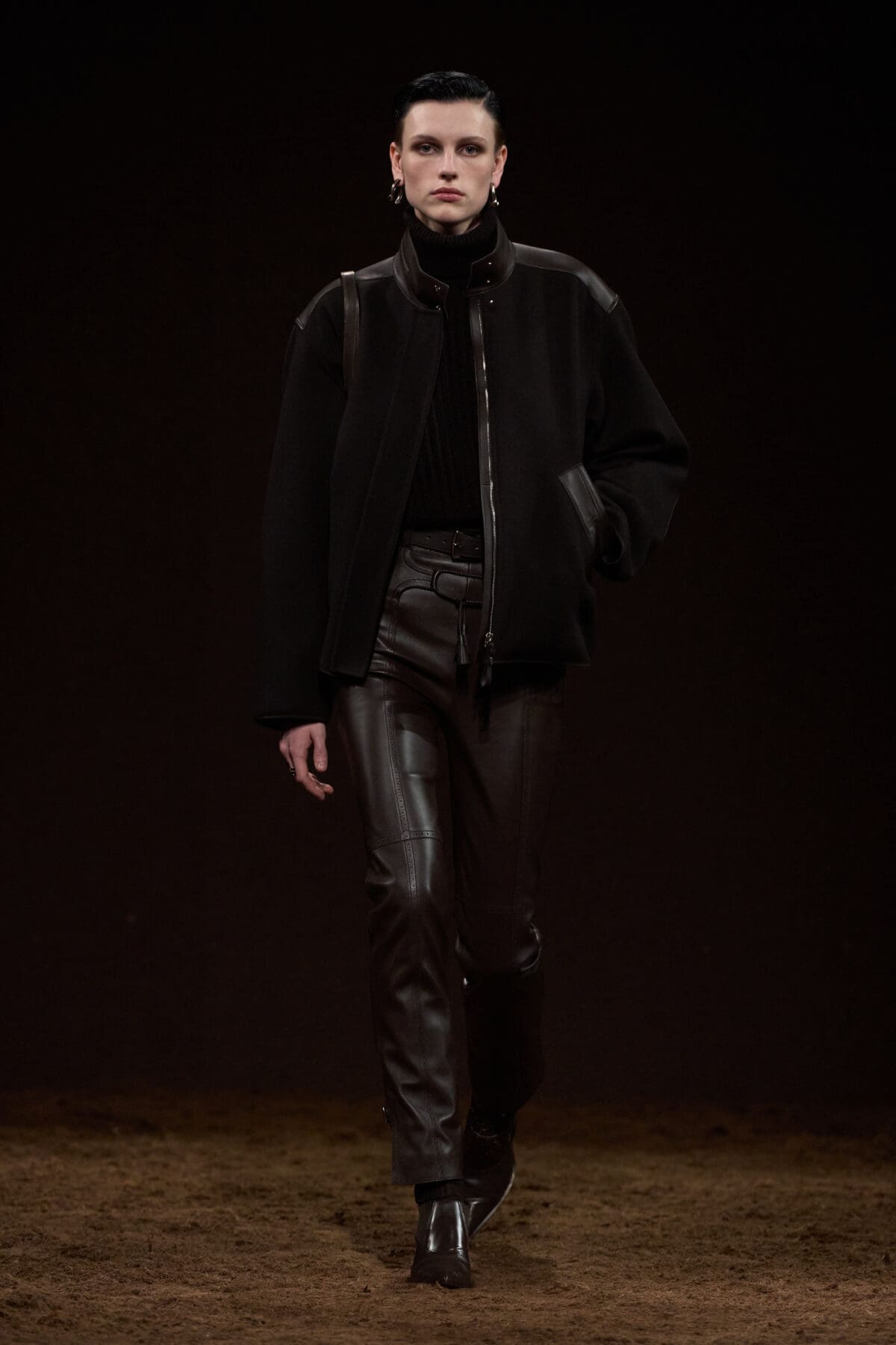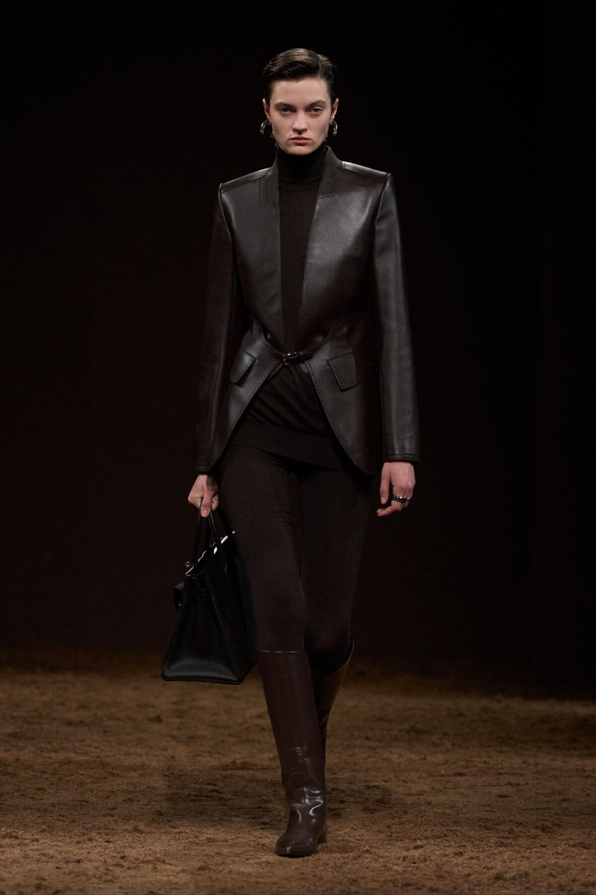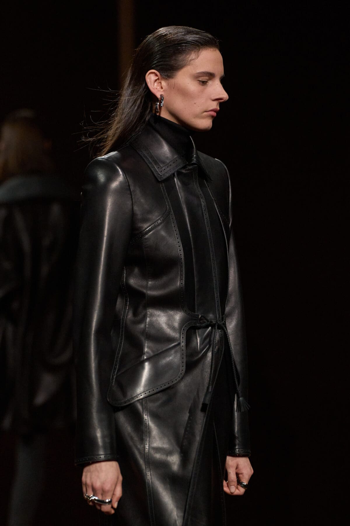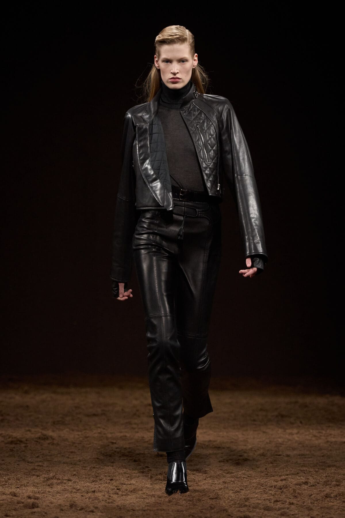 她將這個系列命名為 “Leather Dandy”。到了第六套造型——一件短版絎縫外套,拉鍊敞開露出黑色高領毛衣,搭配高腰窄褲,由光亮的黑色手套皮革製成,展現出一種「馬術騎士」風格——這已經成為Vanhée加入品牌十年來最出色的系列。為甚麼?因為Hermès的核心在於極致精緻的皮革材質與工藝,馬術元素的細膩詮釋,以及令收藏家心動的細節。Vanhée觸及了這些元素中略帶戀物癖的一面,並首次將其從中產階級的框架中解放出來。