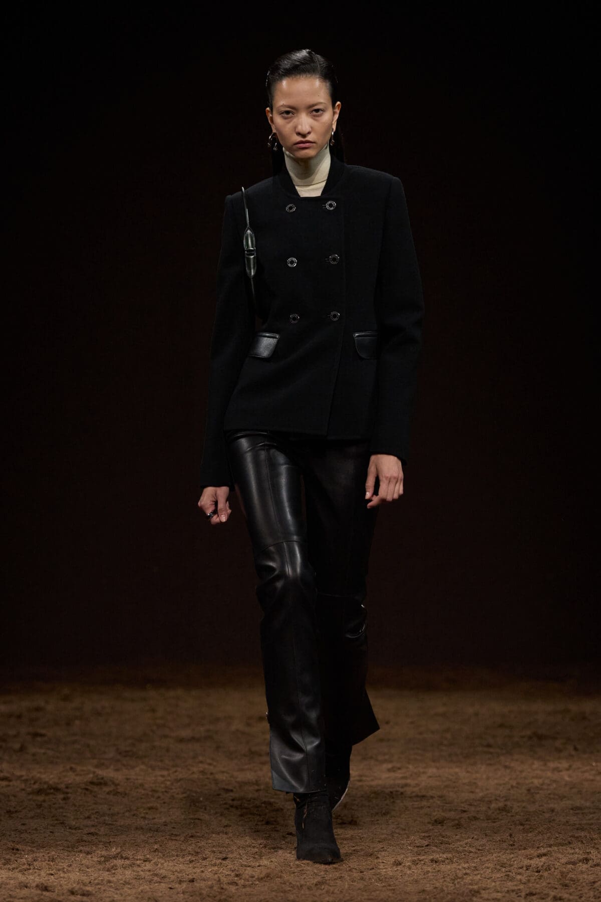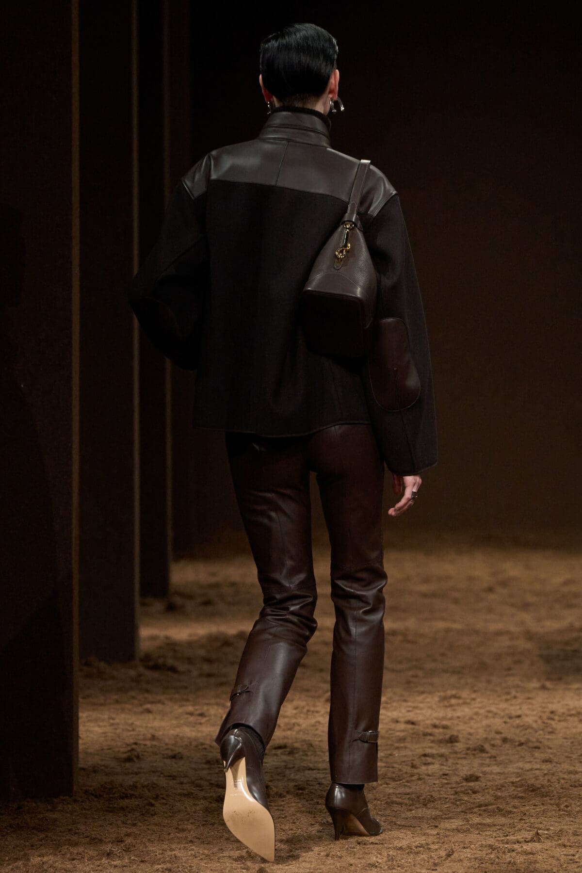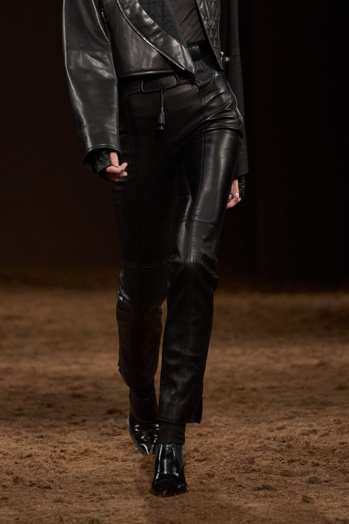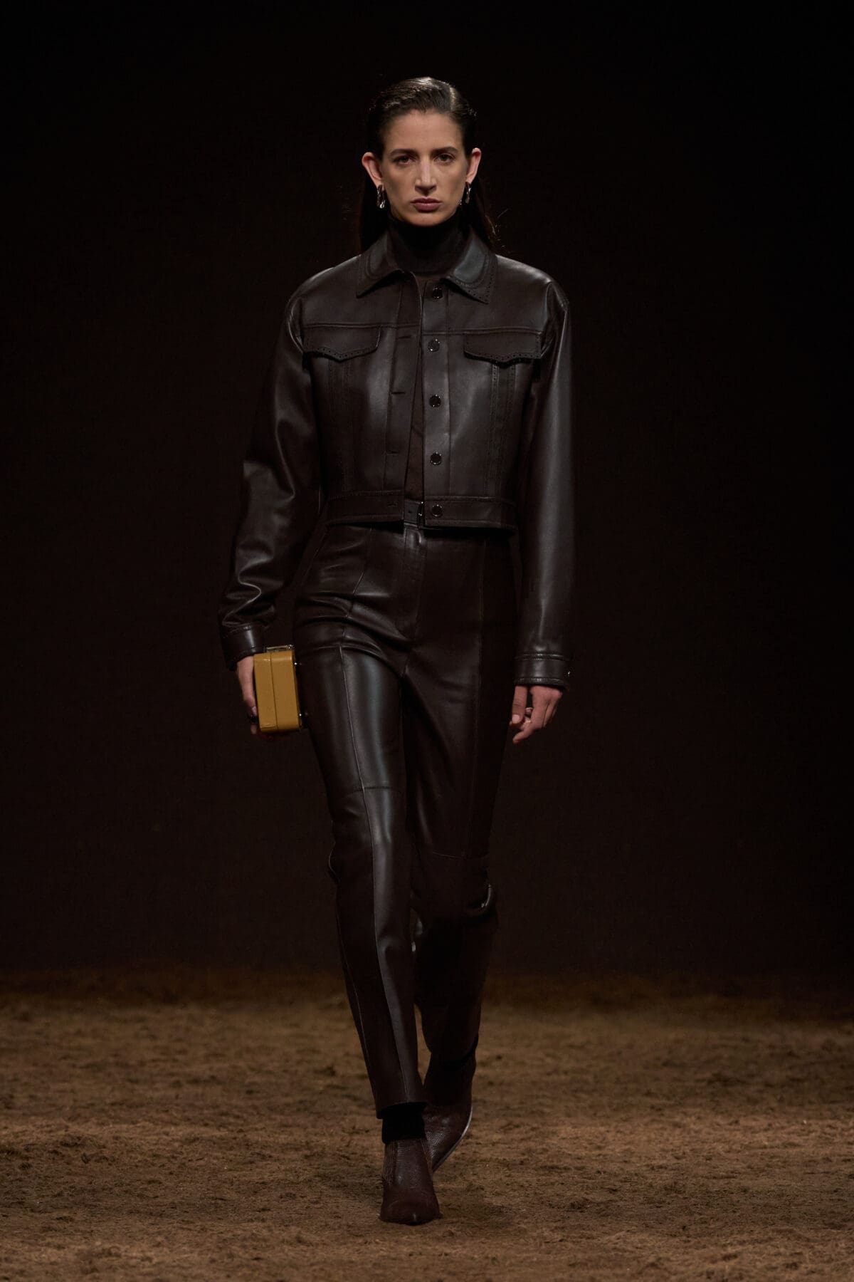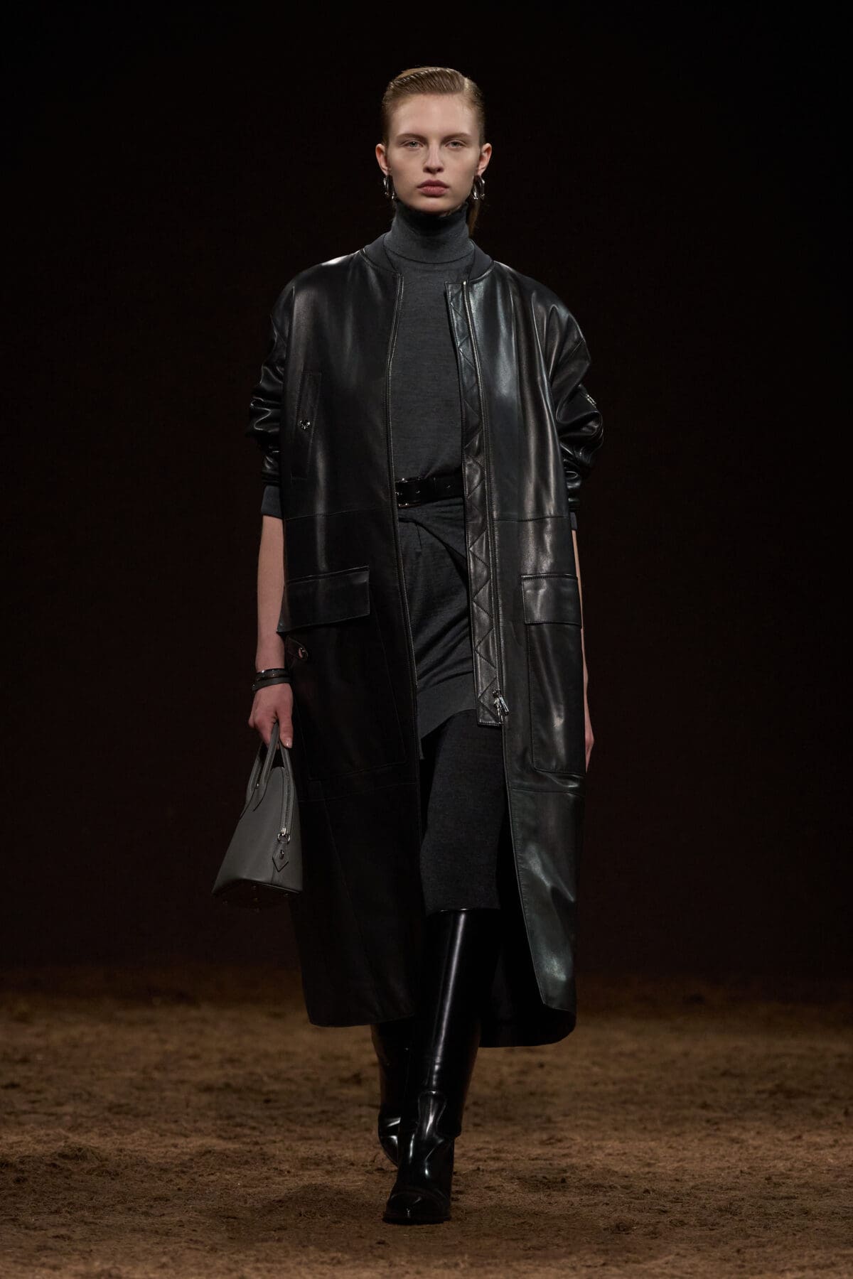 她將這個系列命名為 “Leather Dandy”。到了第六套造型——一件短版絎縫外套,拉鍊敞開露出黑色高領毛衣,搭配高腰窄褲,由光亮的黑色手套皮革製成,展現出一種「馬術騎士」風格——這已經成為Vanhée加入品牌十年來最出色的系列。為甚麼?因為Hermès的核心在於極致精緻的皮革材質與工藝,馬術元素的細膩詮釋,以及令收藏家心動的細節。Vanhée觸及了這些元素中略帶戀物癖的一面,並首次將其從中產階級的框架中解放出來。
