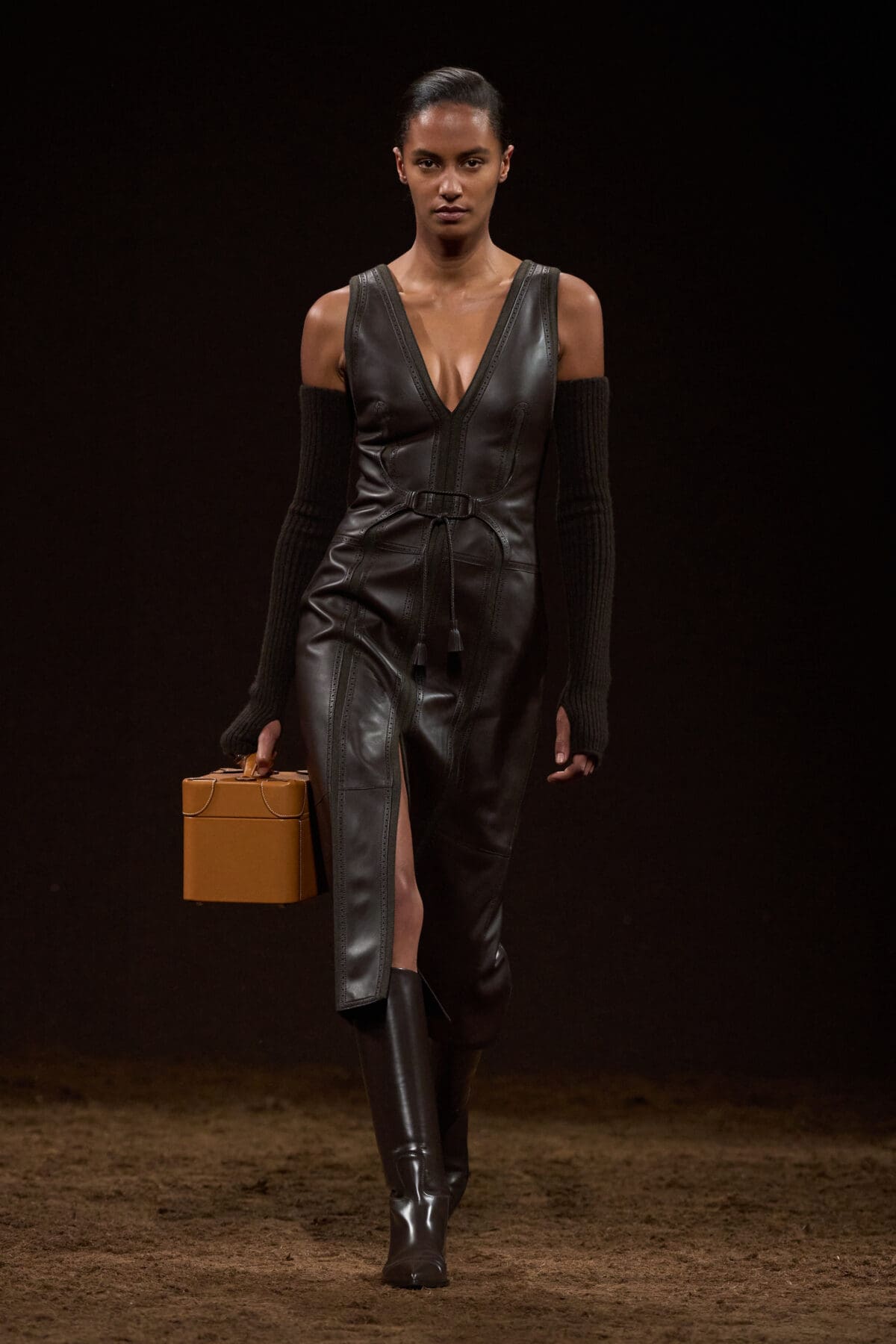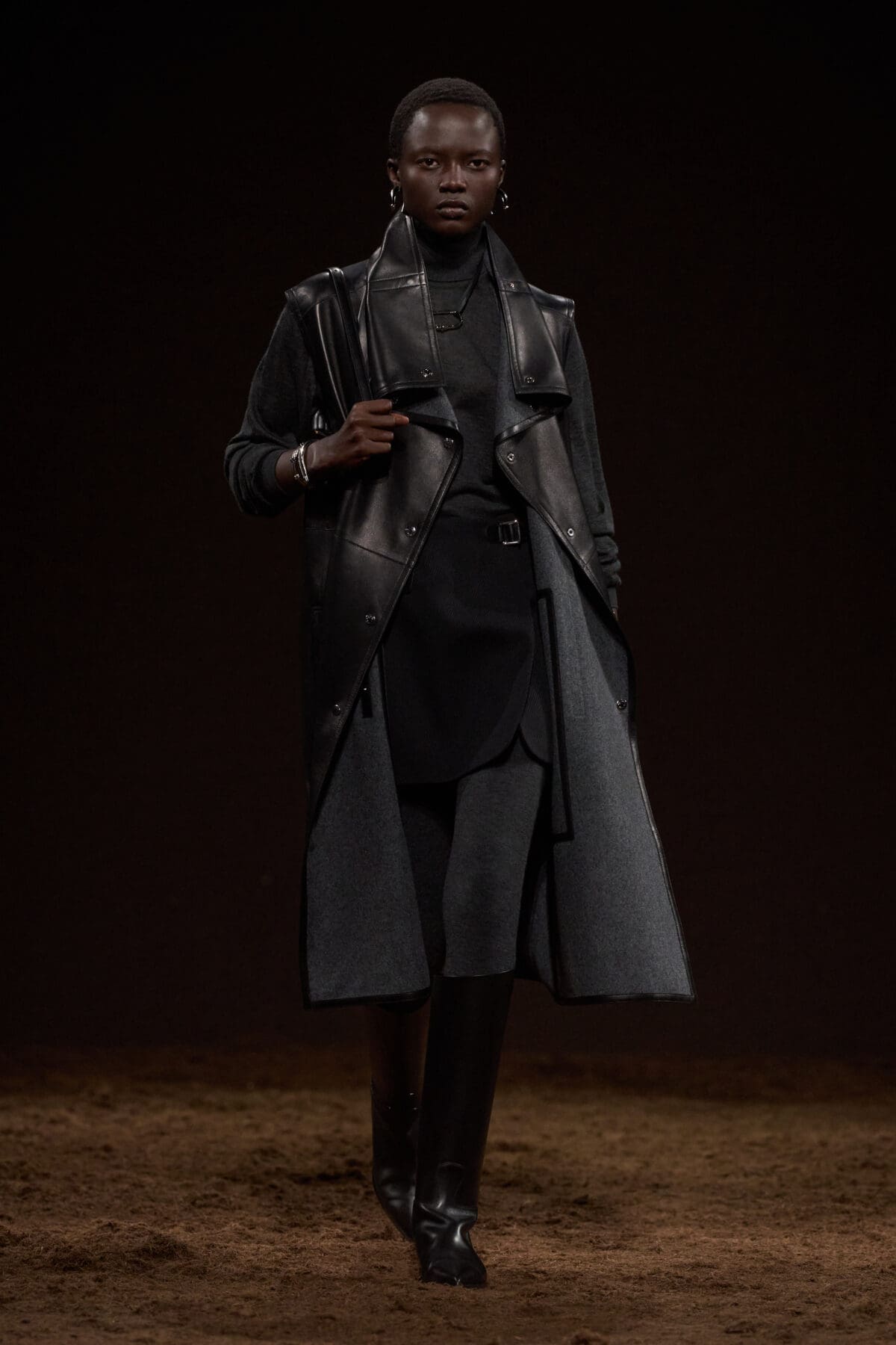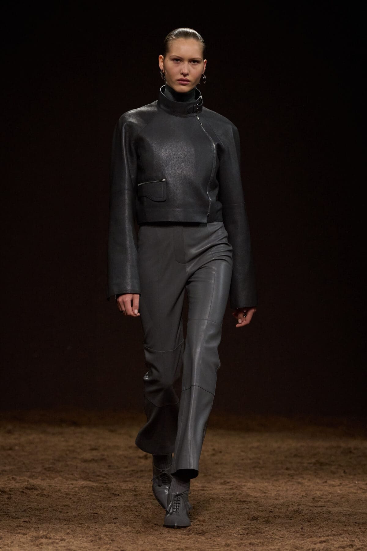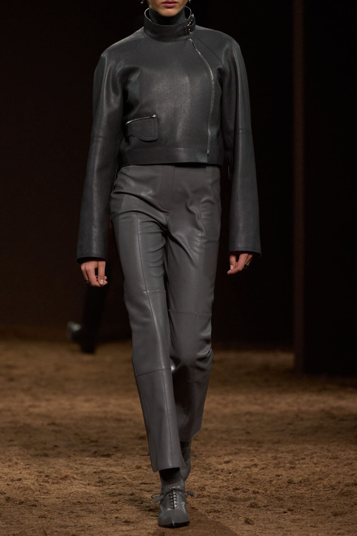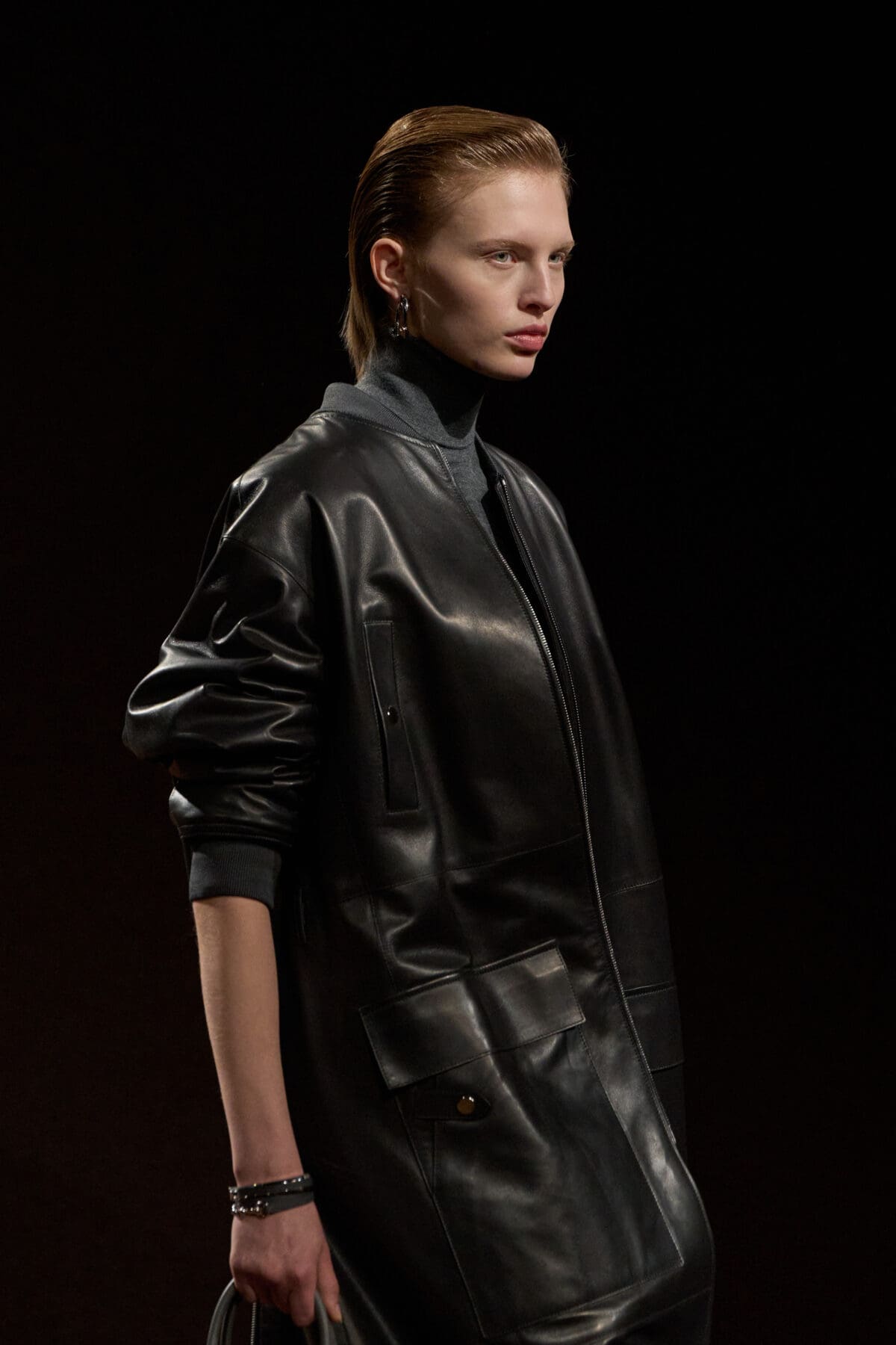 她將這個系列命名為 “Leather Dandy”。到了第六套造型——一件短版絎縫外套,拉鍊敞開露出黑色高領毛衣,搭配高腰窄褲,由光亮的黑色手套皮革製成,展現出一種「馬術騎士」風格——這已經成為Vanhée加入品牌十年來最出色的系列。為甚麼?因為Hermès的核心在於極致精緻的皮革材質與工藝,馬術元素的細膩詮釋,以及令收藏家心動的細節。Vanhée觸及了這些元素中略帶戀物癖的一面,並首次將其從中產階級的框架中解放出來。