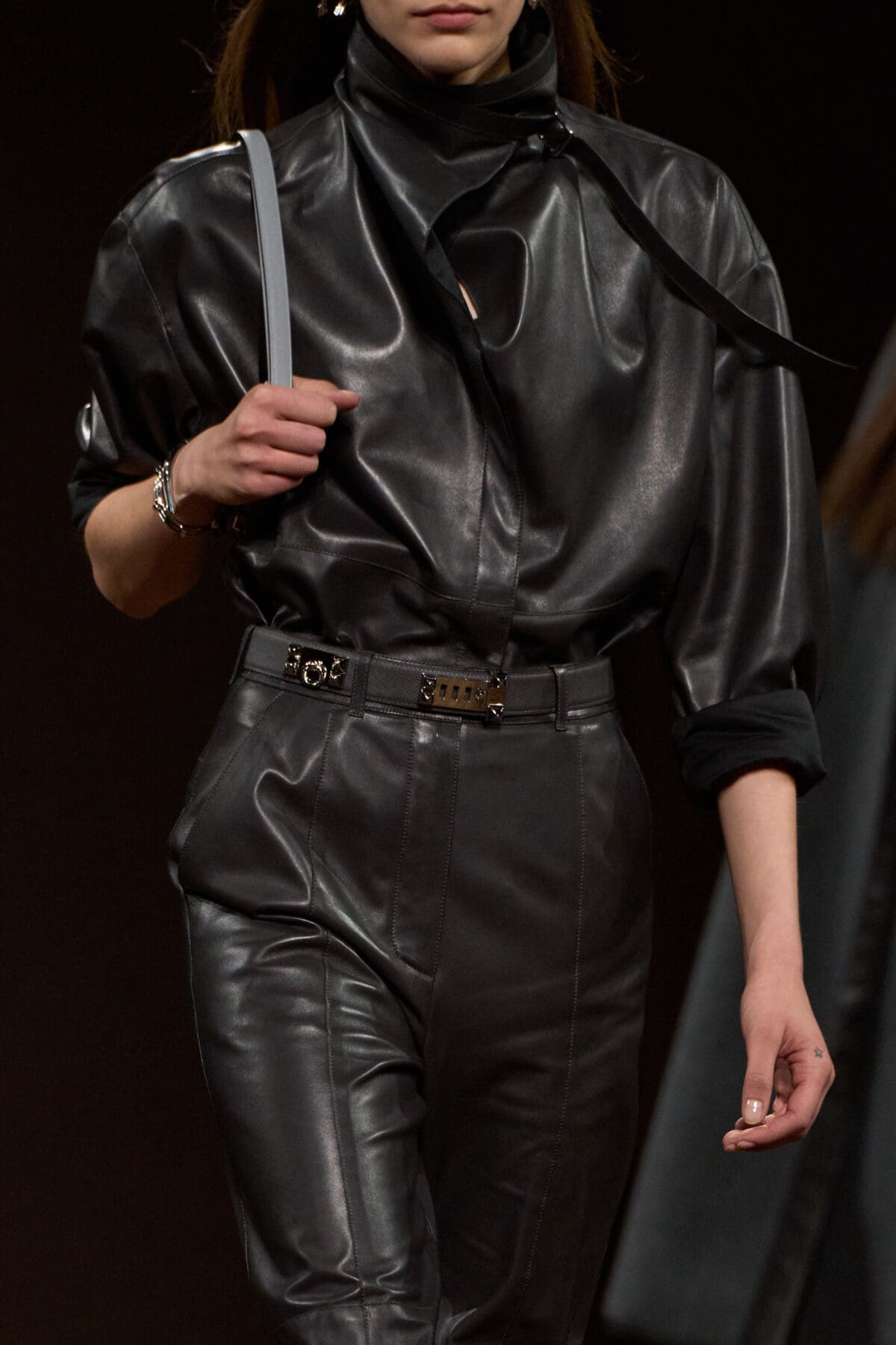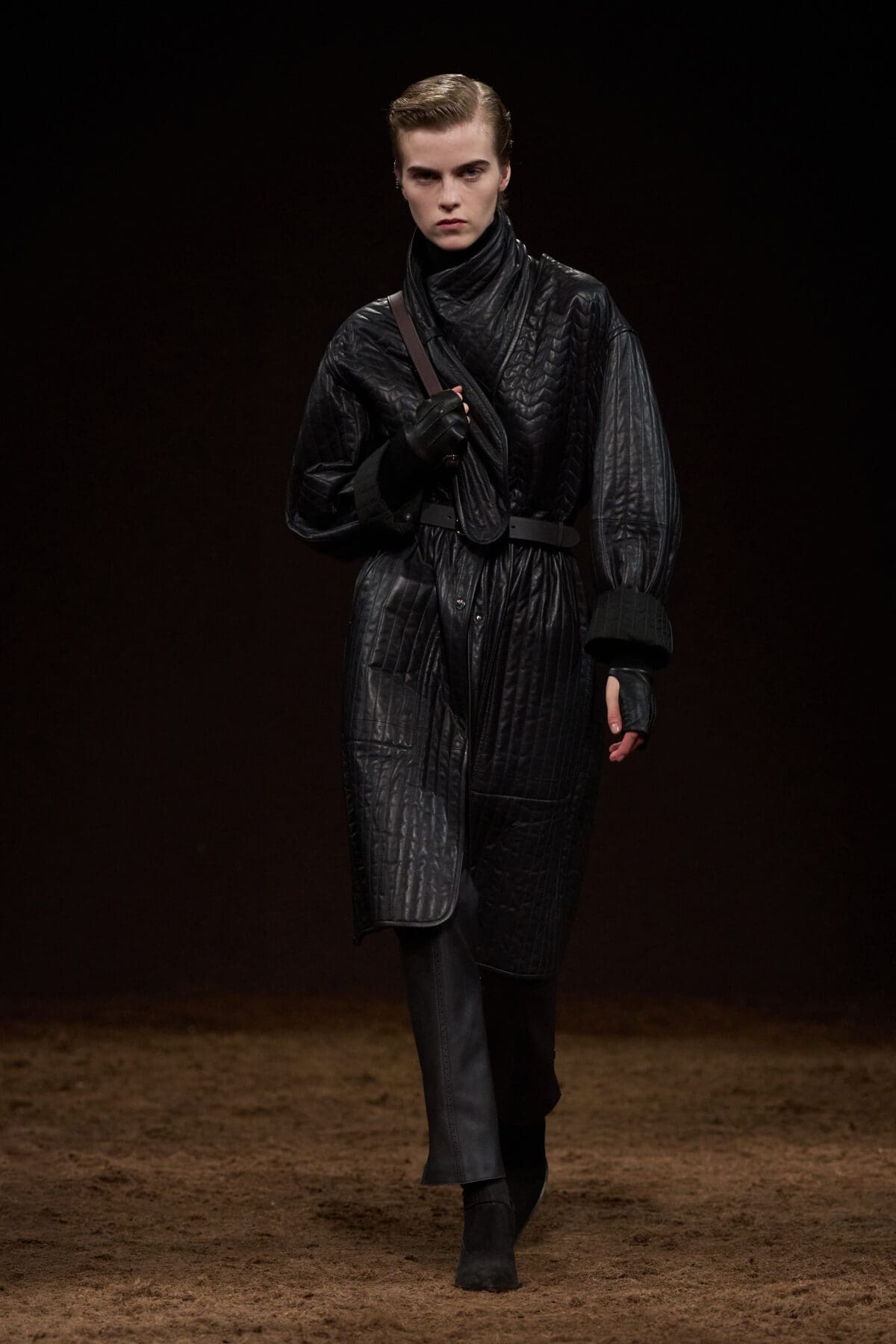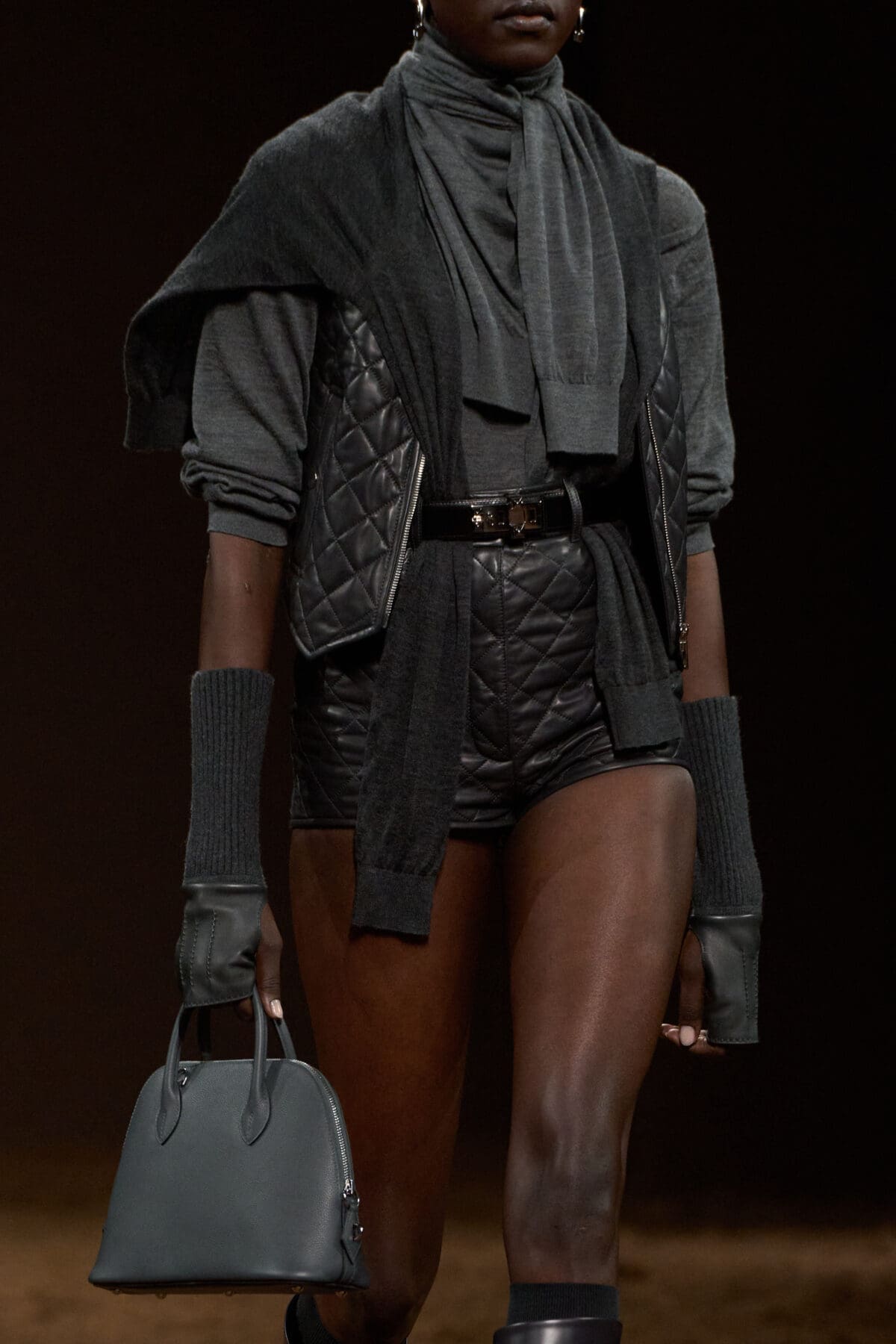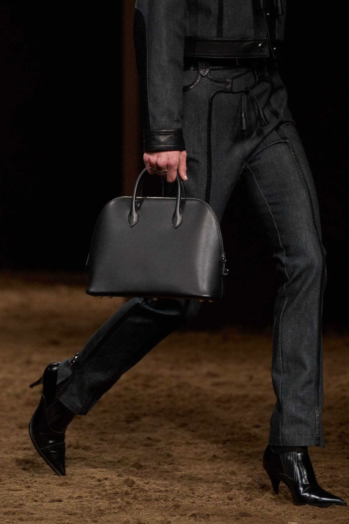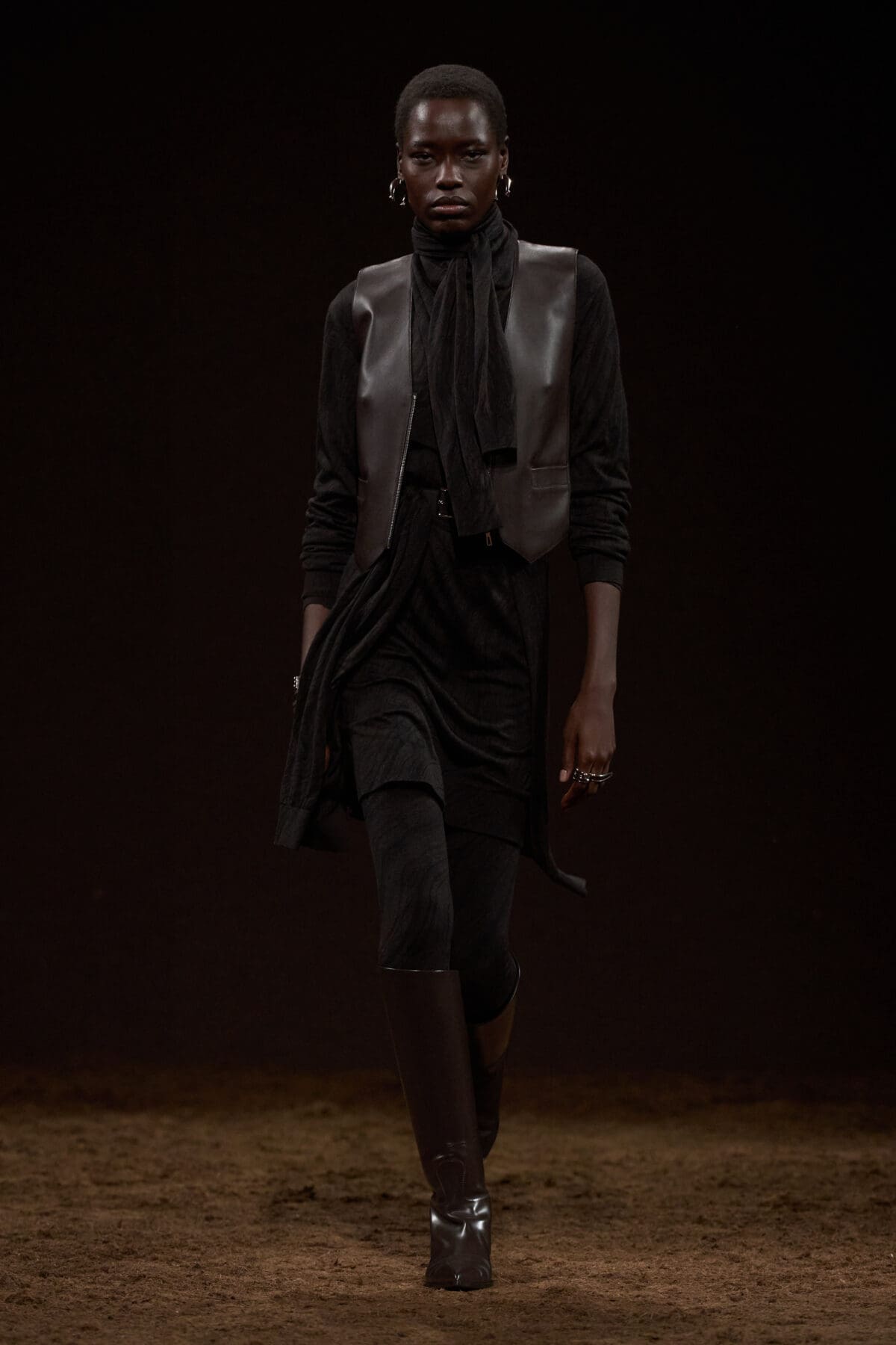 她將這個系列命名為 “Leather Dandy”。到了第六套造型——一件短版絎縫外套,拉鍊敞開露出黑色高領毛衣,搭配高腰窄褲,由光亮的黑色手套皮革製成,展現出一種「馬術騎士」風格——這已經成為Vanhée加入品牌十年來最出色的系列。為甚麼?因為Hermès的核心在於極致精緻的皮革材質與工藝,馬術元素的細膩詮釋,以及令收藏家心動的細節。Vanhée觸及了這些元素中略帶戀物癖的一面,並首次將其從中產階級的框架中解放出來。