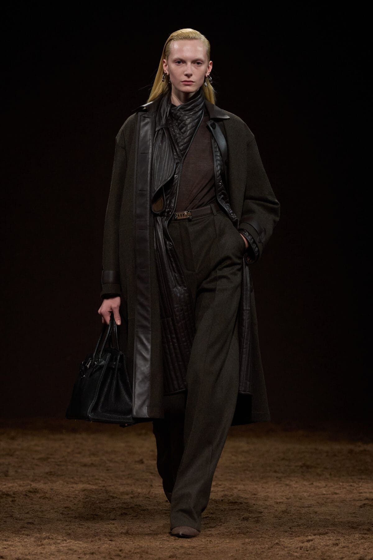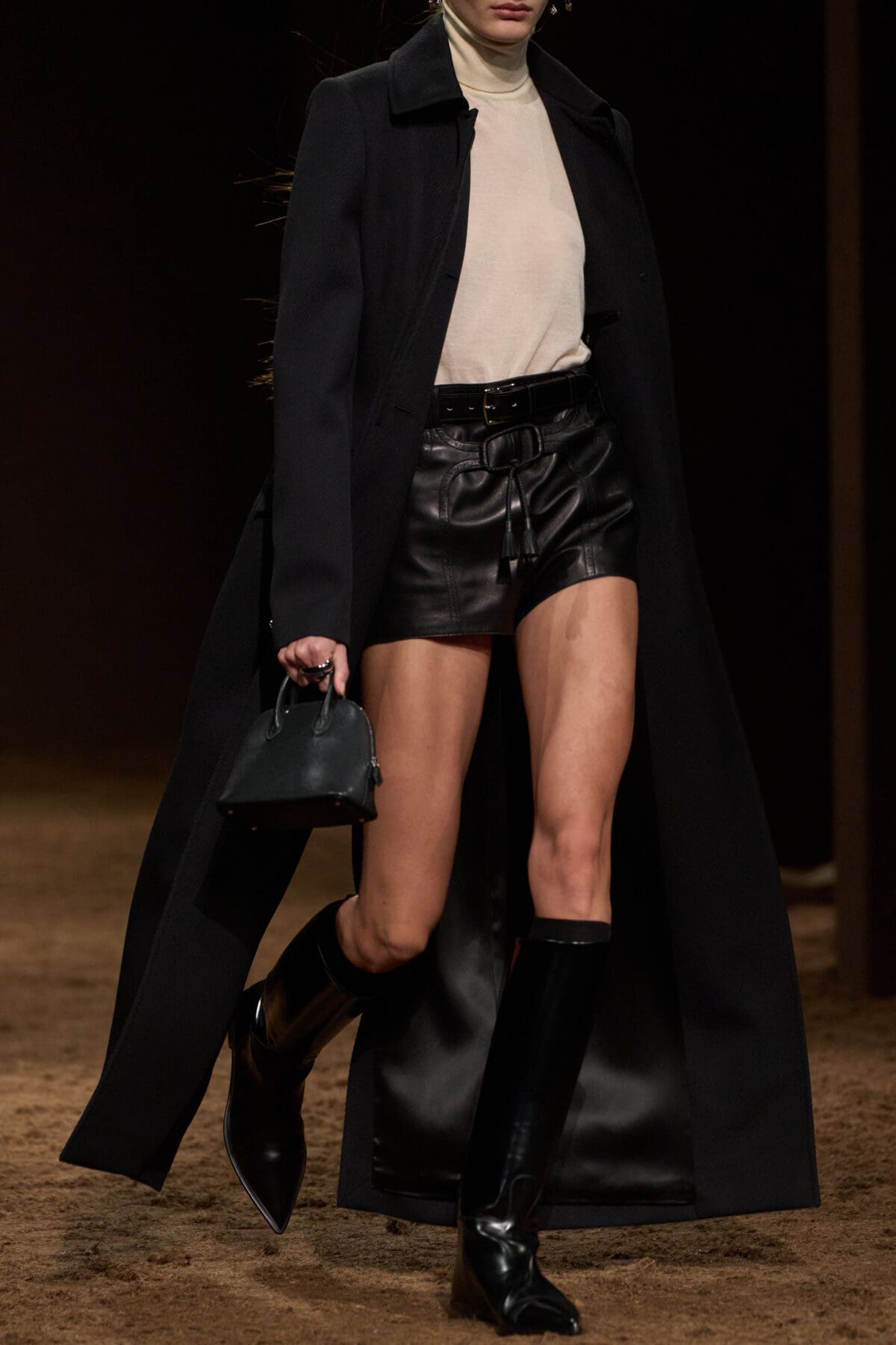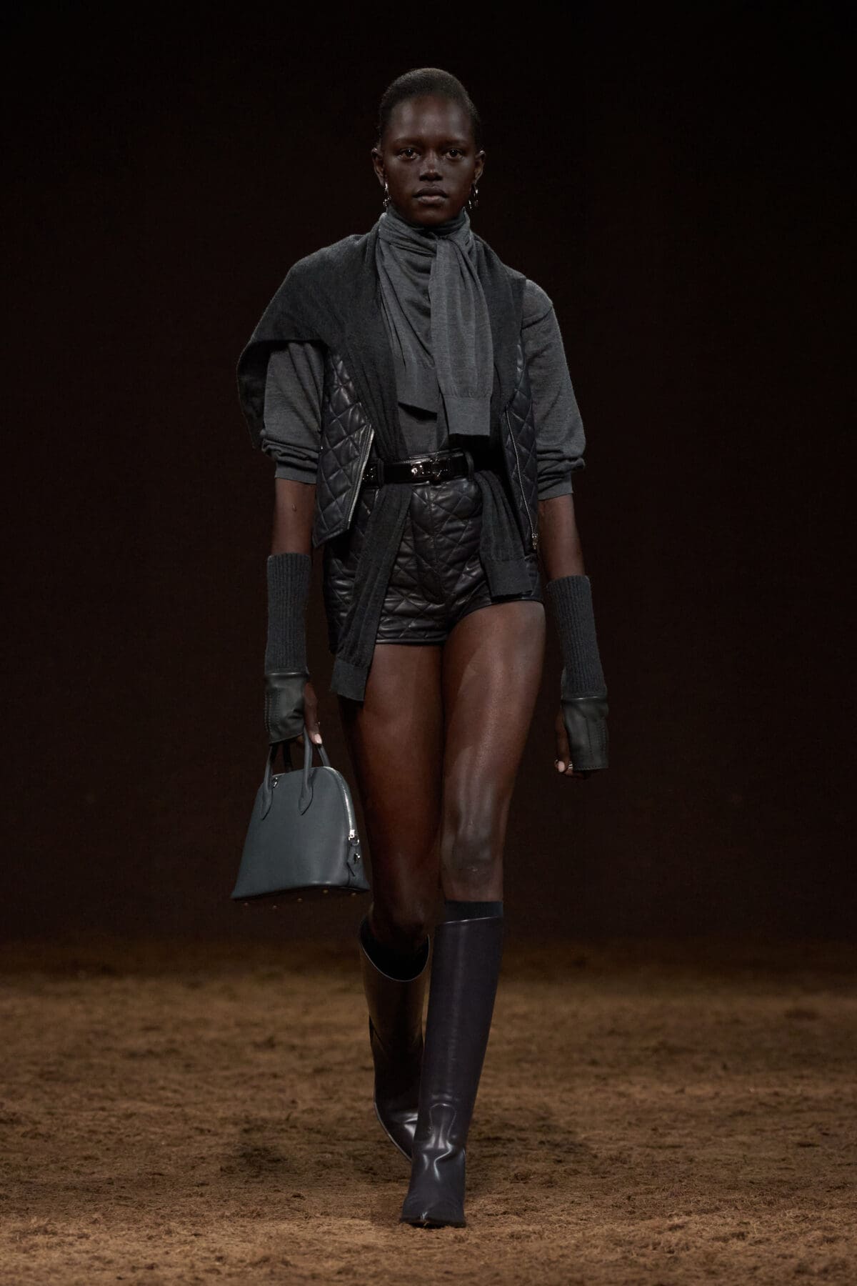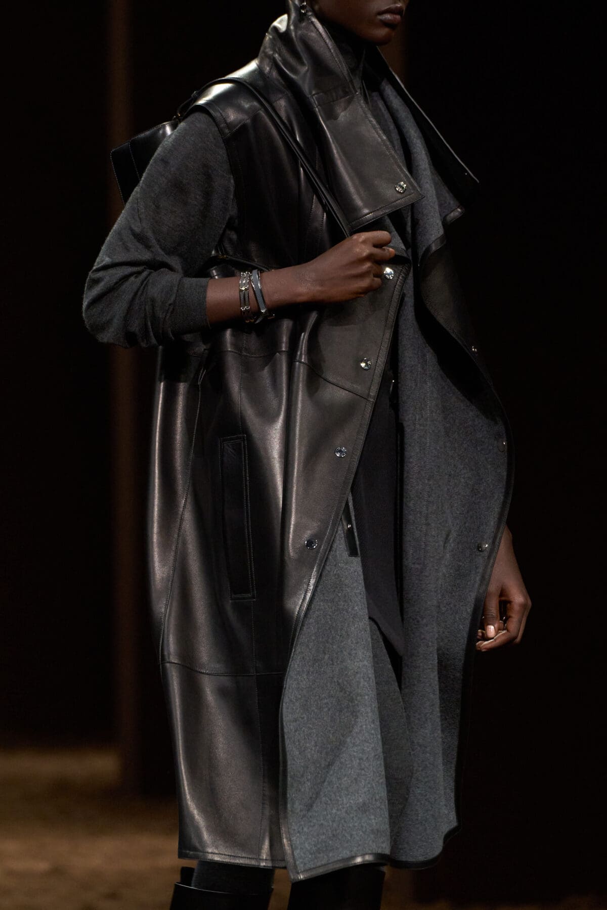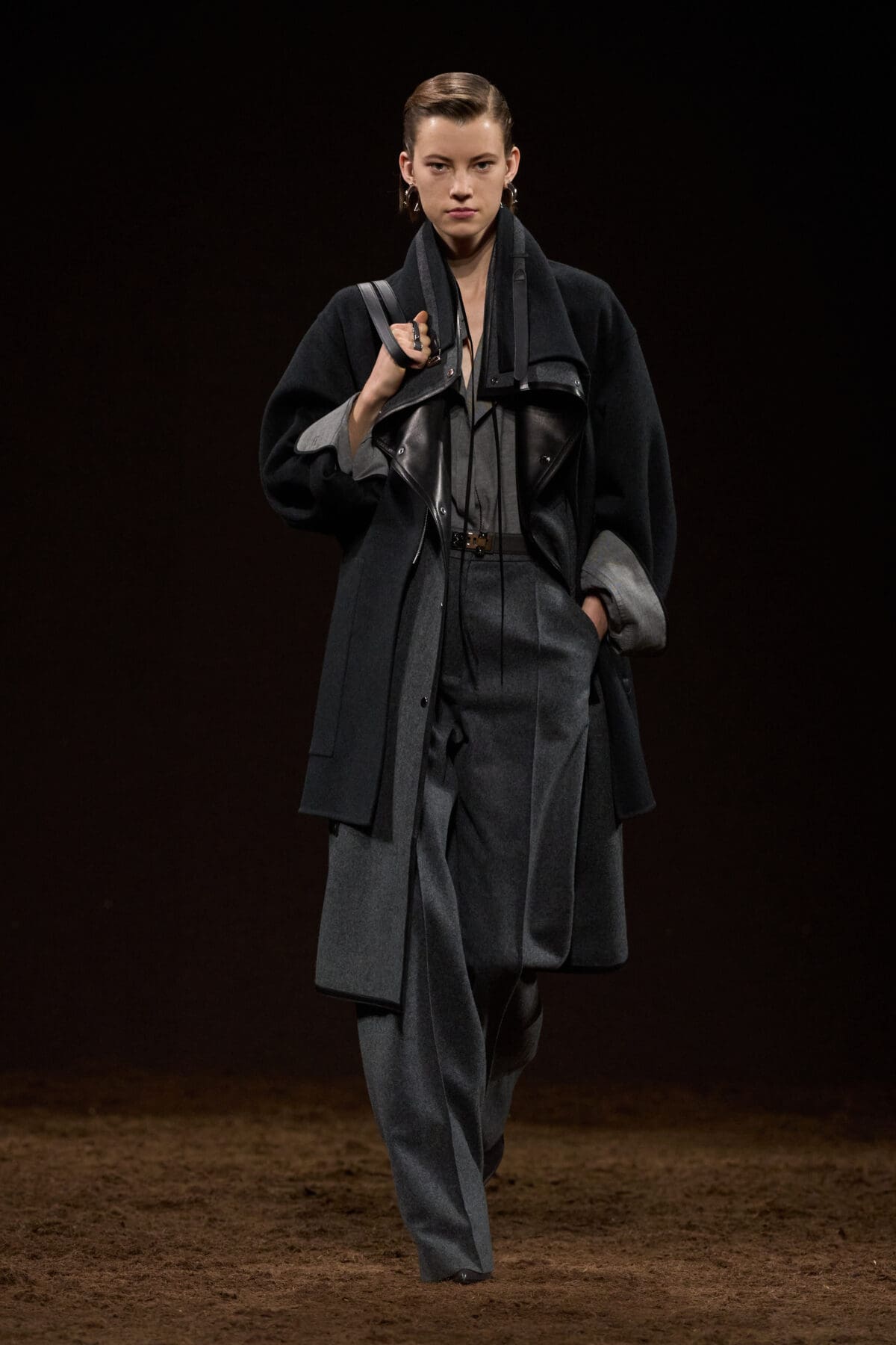 她將這個系列命名為 “Leather Dandy”。到了第六套造型——一件短版絎縫外套,拉鍊敞開露出黑色高領毛衣,搭配高腰窄褲,由光亮的黑色手套皮革製成,展現出一種「馬術騎士」風格——這已經成為Vanhée加入品牌十年來最出色的系列。為甚麼?因為Hermès的核心在於極致精緻的皮革材質與工藝,馬術元素的細膩詮釋,以及令收藏家心動的細節。Vanhée觸及了這些元素中略帶戀物癖的一面,並首次將其從中產階級的框架中解放出來。