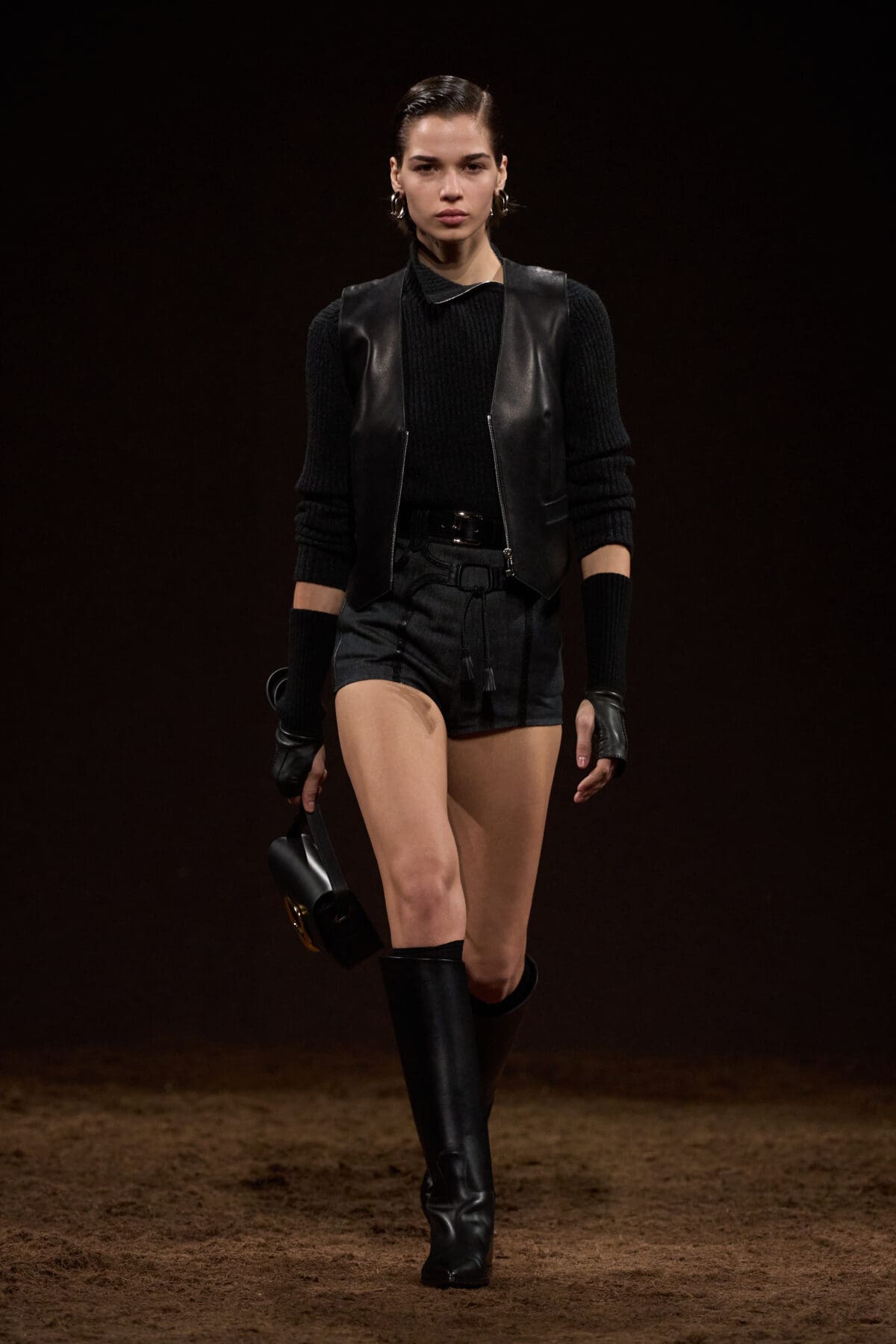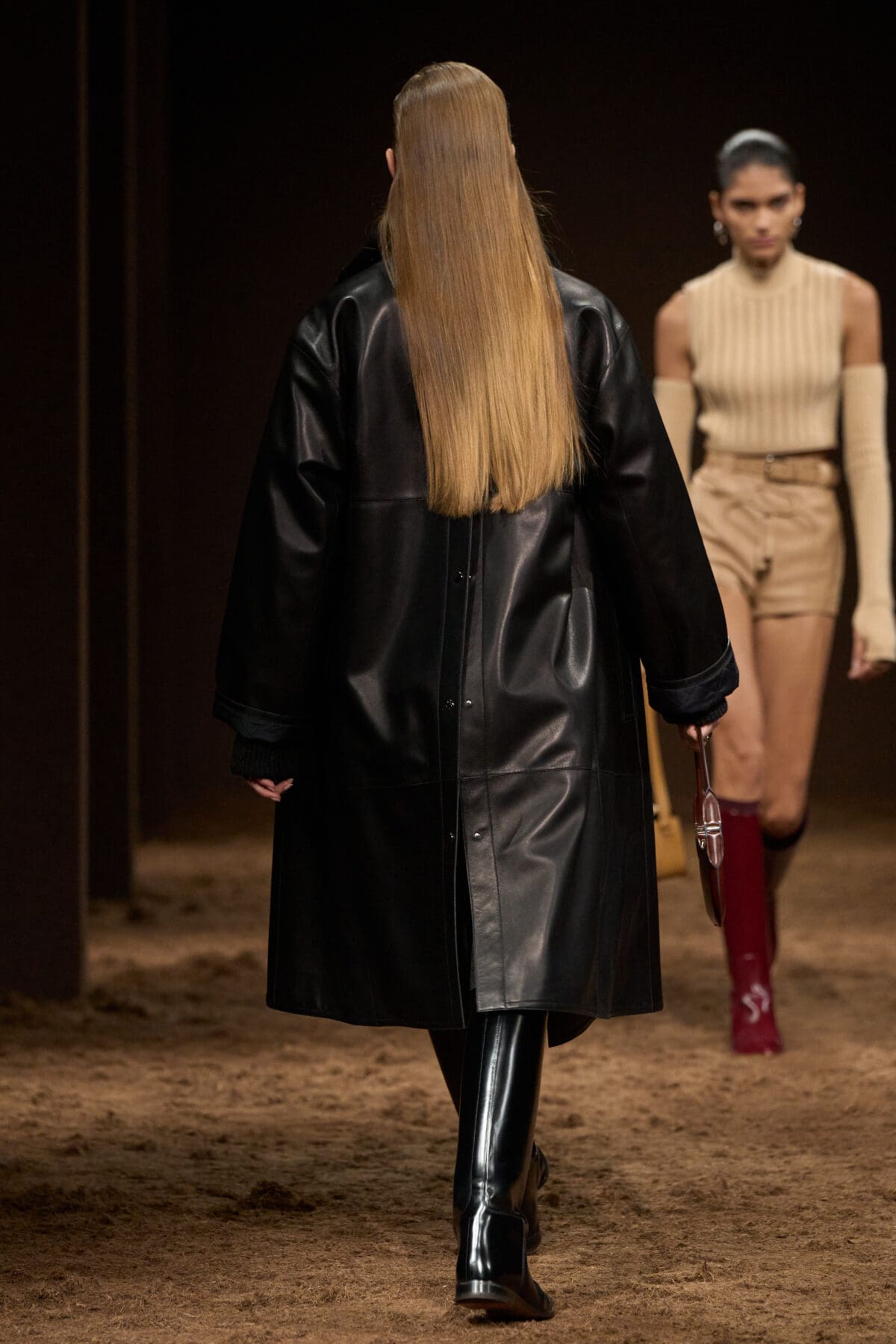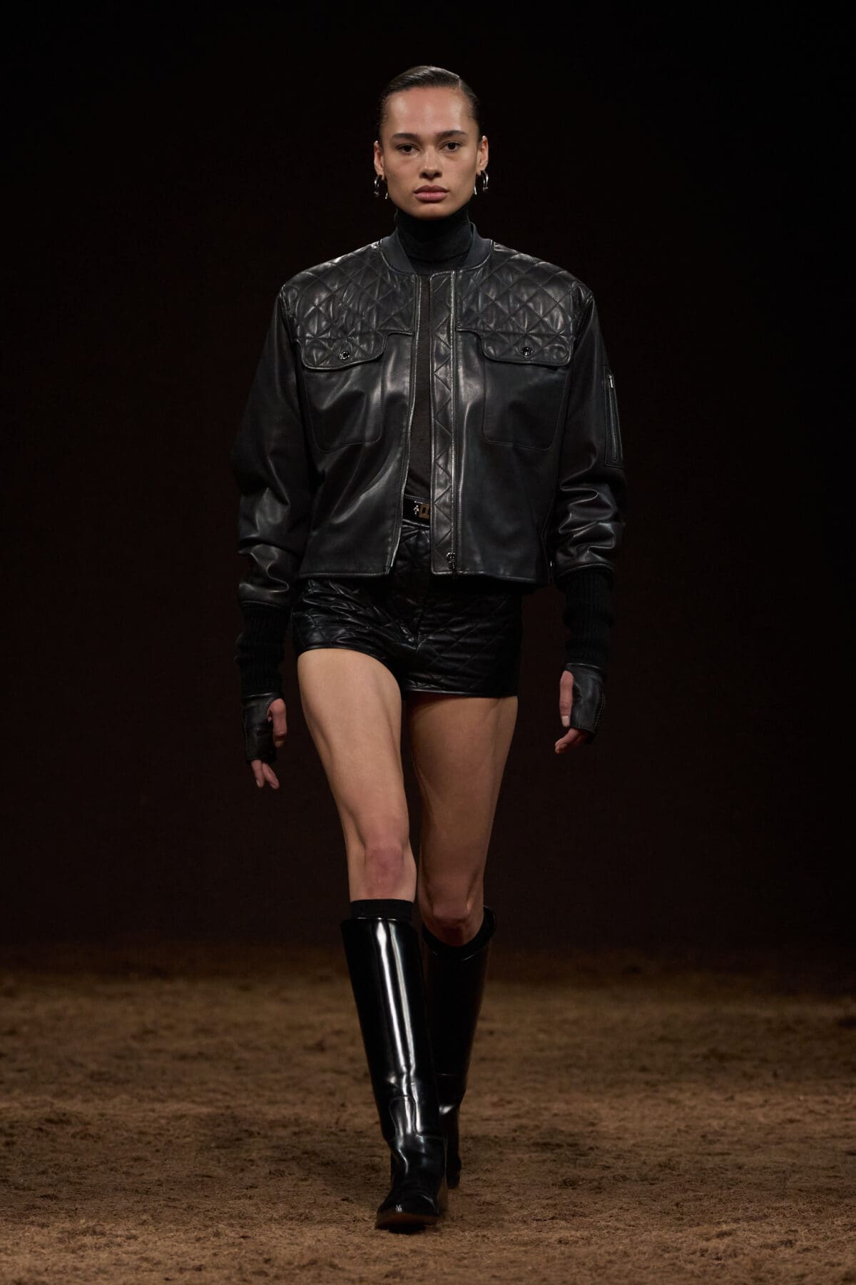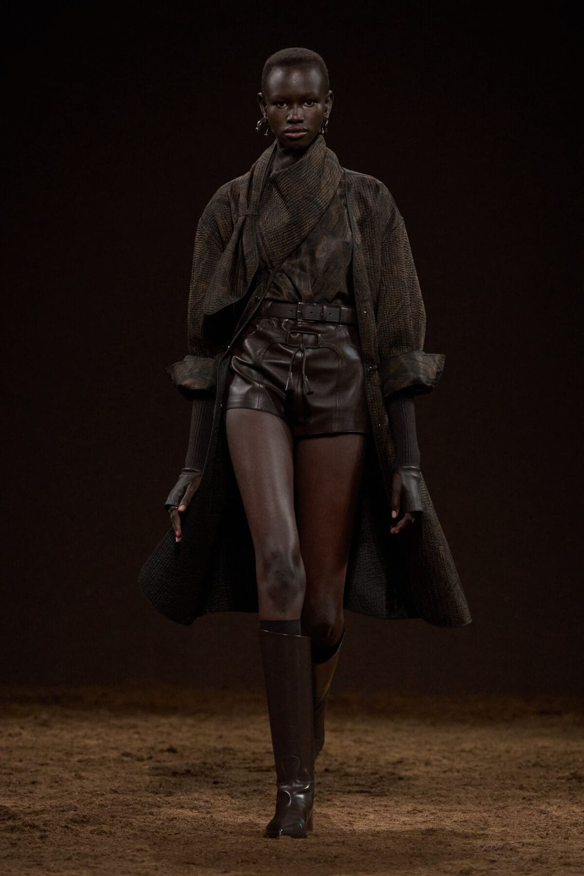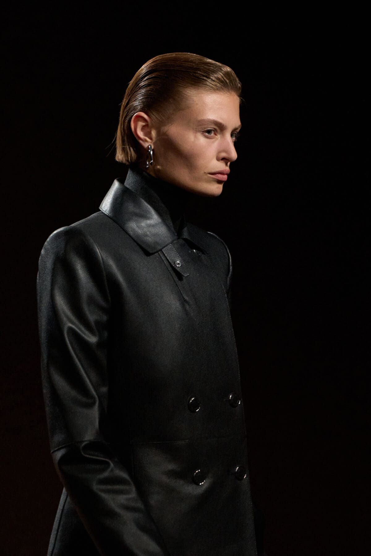 她將這個系列命名為 “Leather Dandy”。到了第六套造型——一件短版絎縫外套,拉鍊敞開露出黑色高領毛衣,搭配高腰窄褲,由光亮的黑色手套皮革製成,展現出一種「馬術騎士」風格——這已經成為Vanhée加入品牌十年來最出色的系列。為甚麼?因為Hermès的核心在於極致精緻的皮革材質與工藝,馬術元素的細膩詮釋,以及令收藏家心動的細節。Vanhée觸及了這些元素中略帶戀物癖的一面,並首次將其從中產階級的框架中解放出來。