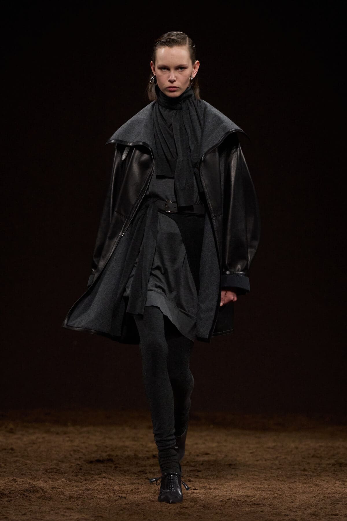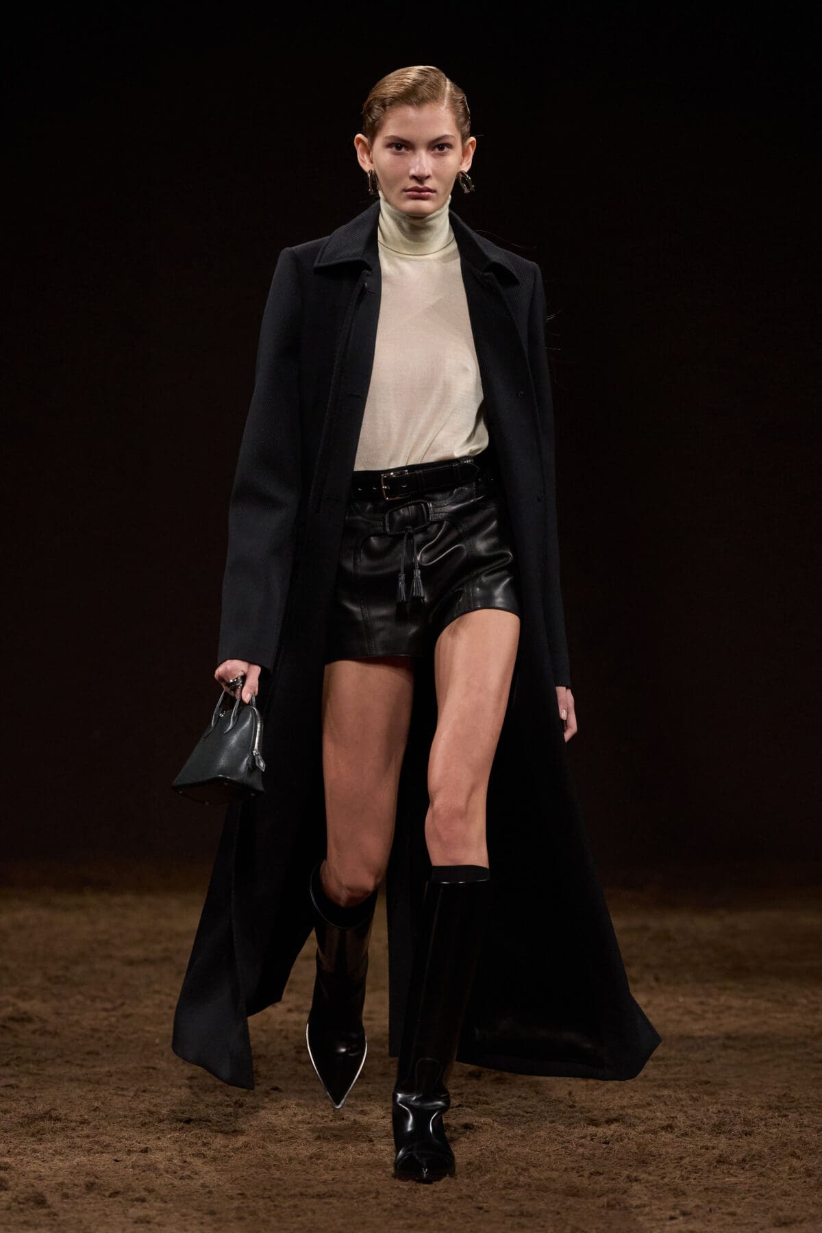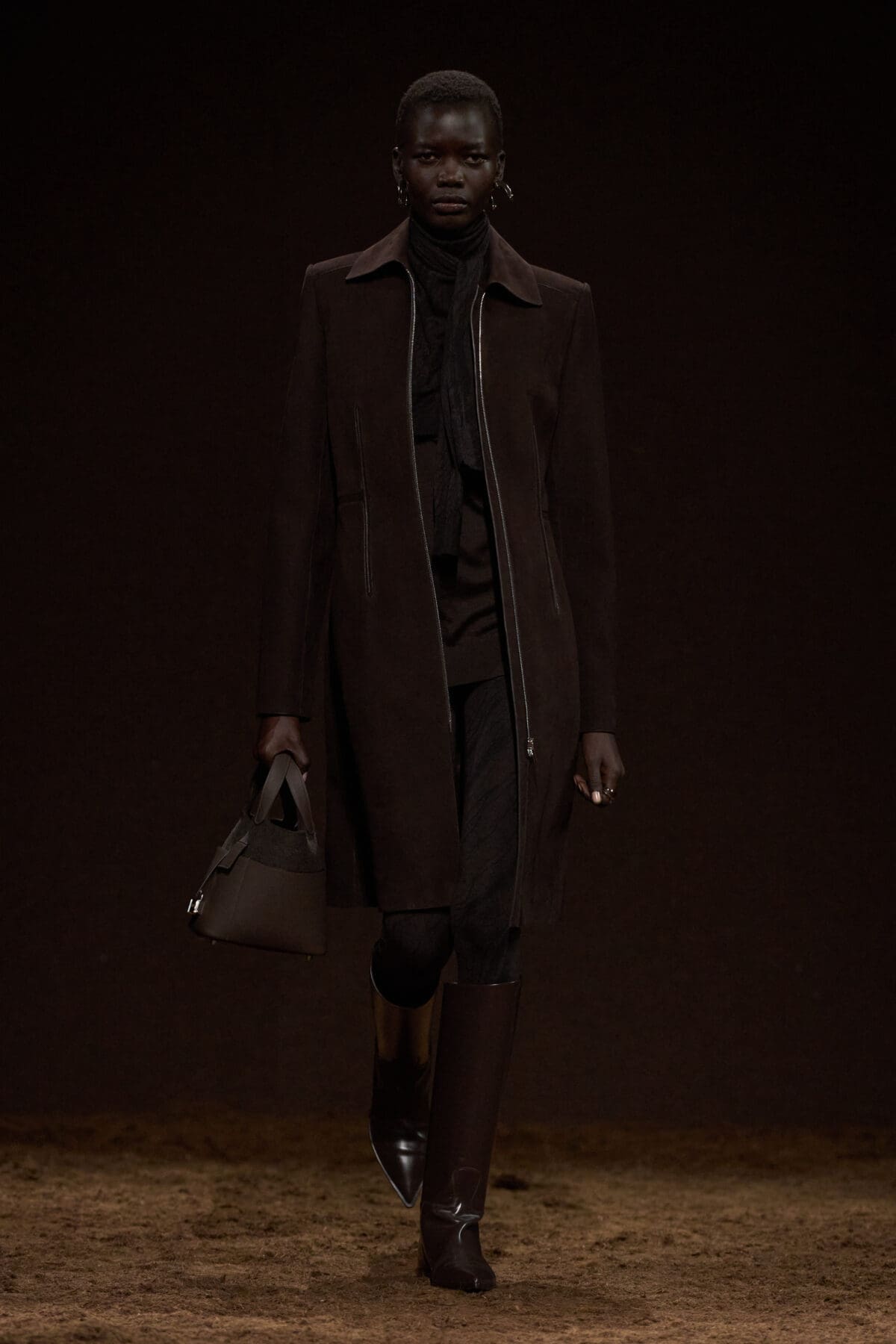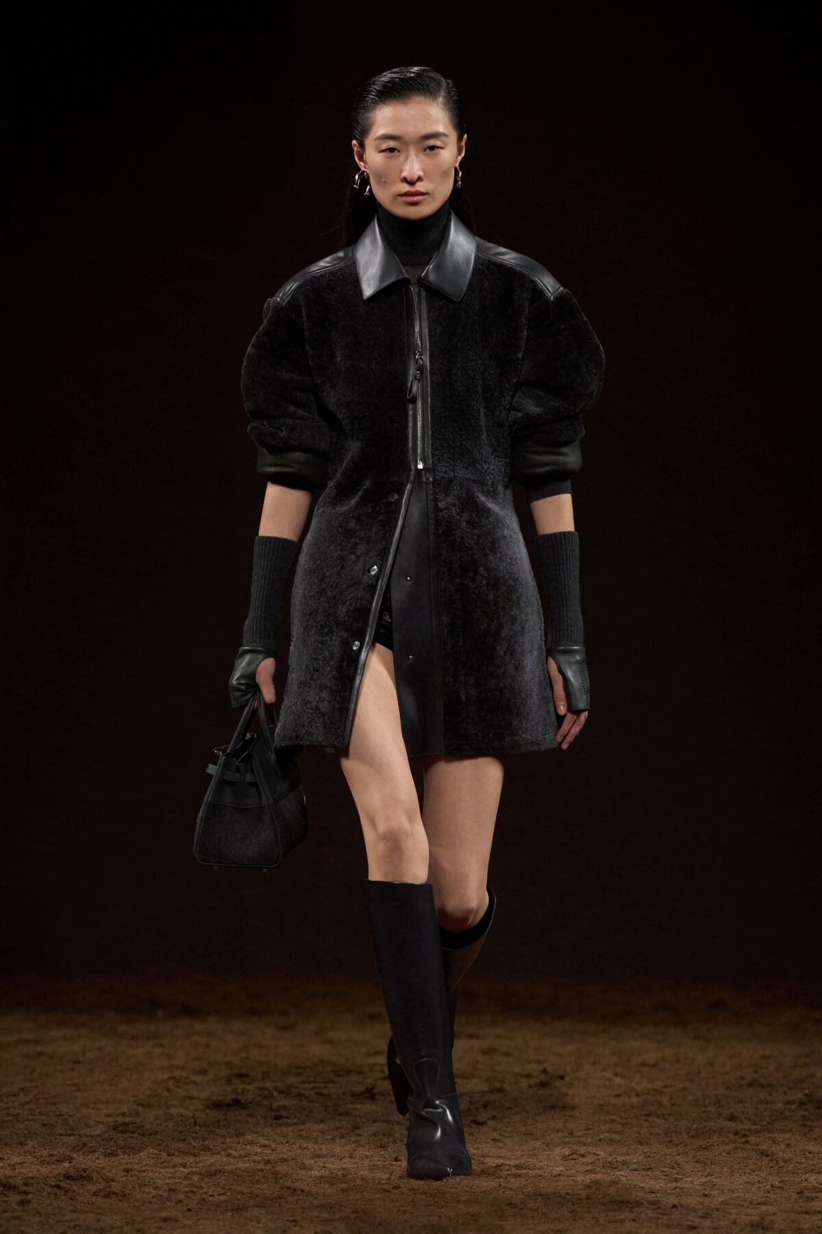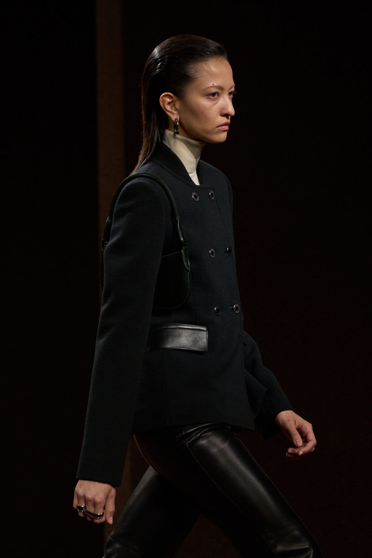 她將這個系列命名為 “Leather Dandy”。到了第六套造型——一件短版絎縫外套,拉鍊敞開露出黑色高領毛衣,搭配高腰窄褲,由光亮的黑色手套皮革製成,展現出一種「馬術騎士」風格——這已經成為Vanhée加入品牌十年來最出色的系列。為甚麼?因為Hermès的核心在於極致精緻的皮革材質與工藝,馬術元素的細膩詮釋,以及令收藏家心動的細節。Vanhée觸及了這些元素中略帶戀物癖的一面,並首次將其從中產階級的框架中解放出來。
