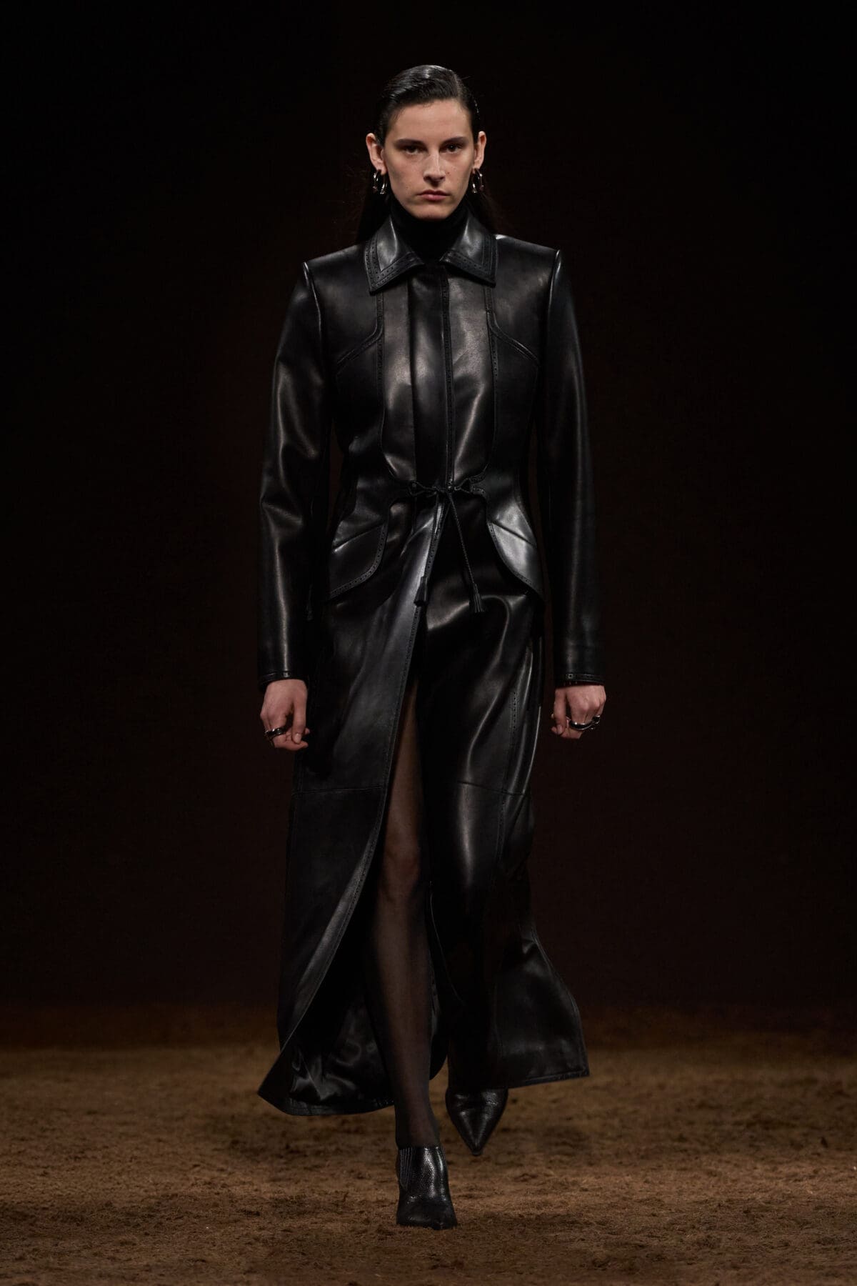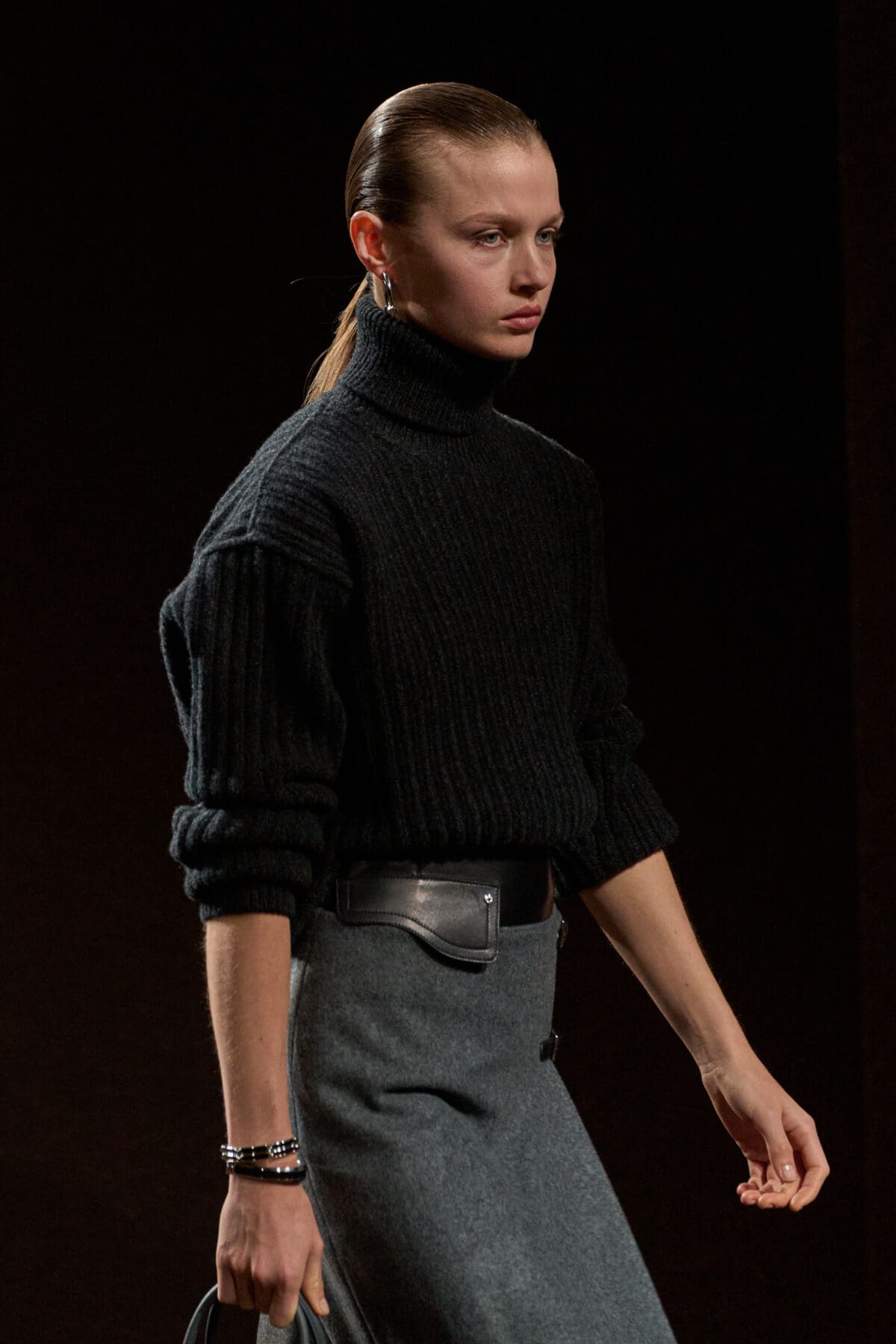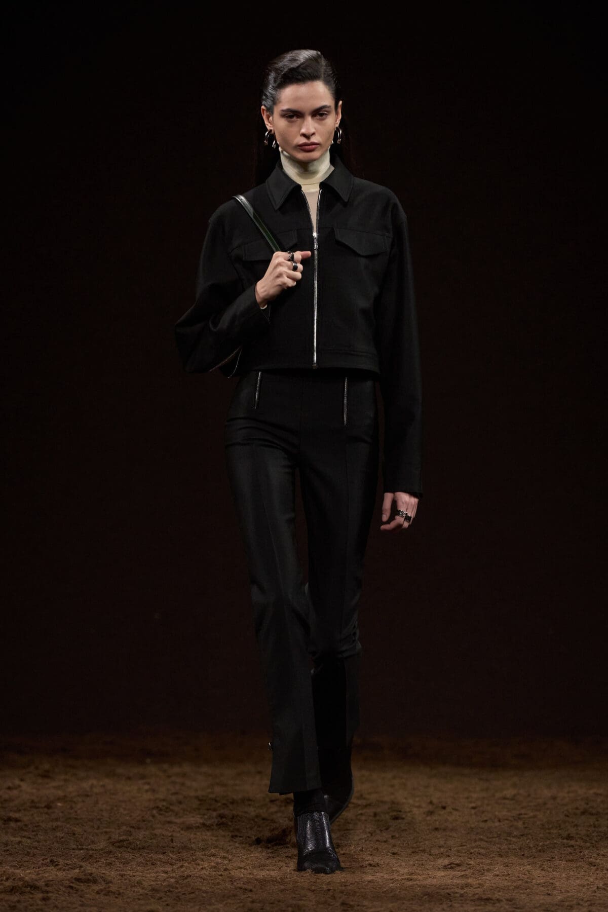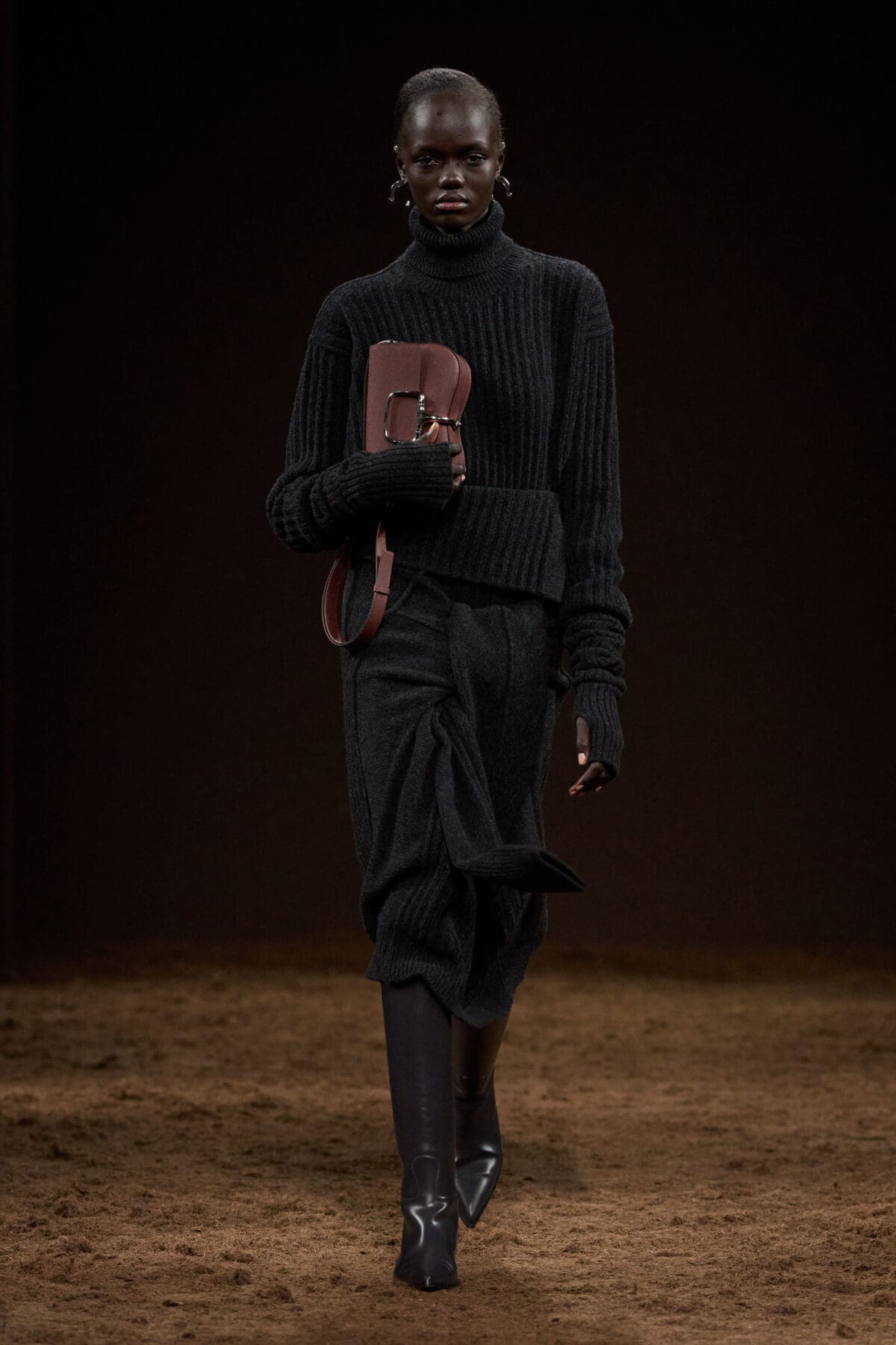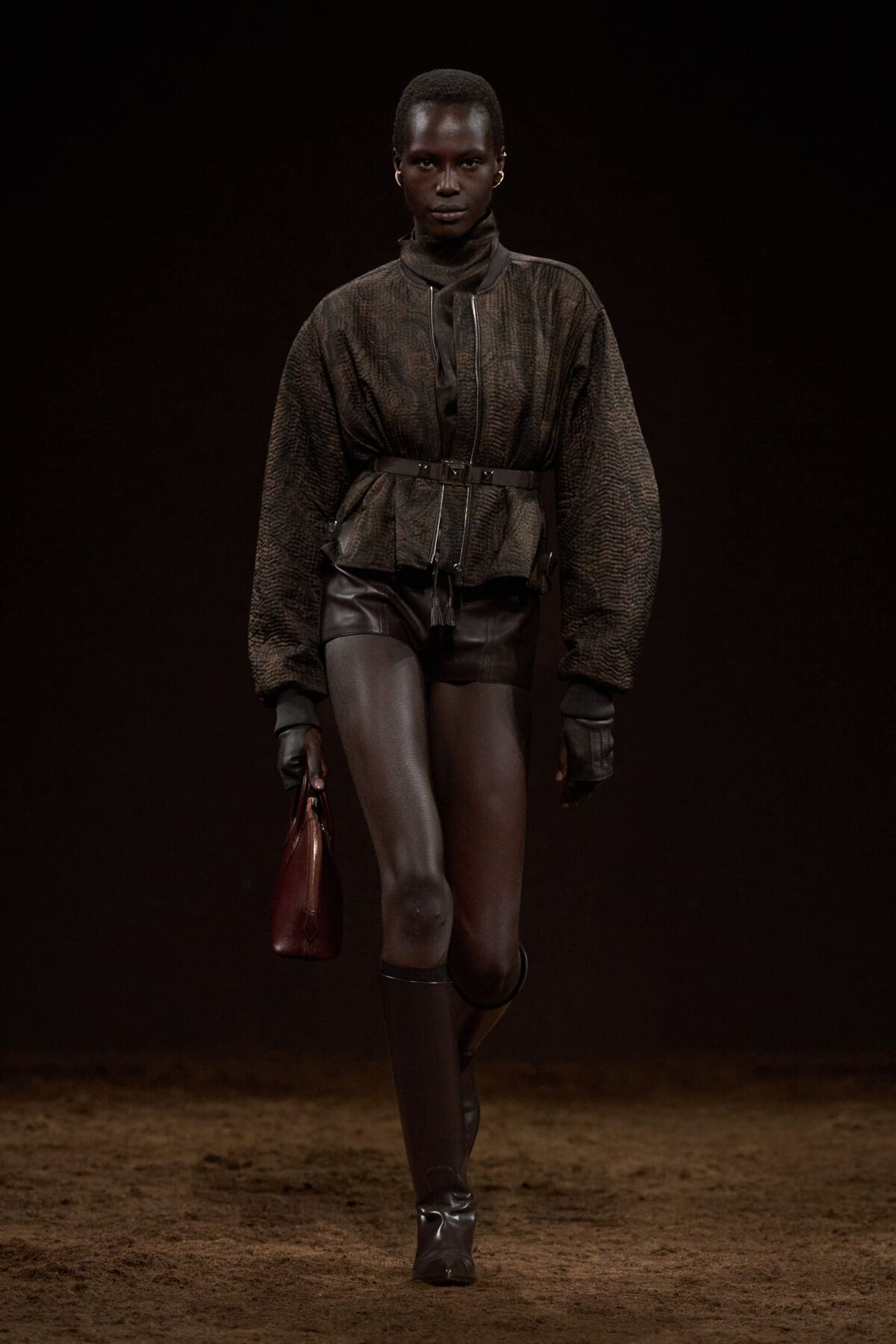 她將這個系列命名為 “Leather Dandy”。到了第六套造型——一件短版絎縫外套,拉鍊敞開露出黑色高領毛衣,搭配高腰窄褲,由光亮的黑色手套皮革製成,展現出一種「馬術騎士」風格——這已經成為Vanhée加入品牌十年來最出色的系列。為甚麼?因為Hermès的核心在於極致精緻的皮革材質與工藝,馬術元素的細膩詮釋,以及令收藏家心動的細節。Vanhée觸及了這些元素中略帶戀物癖的一面,並首次將其從中產階級的框架中解放出來。