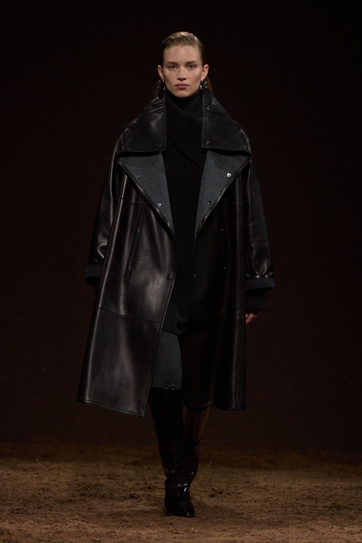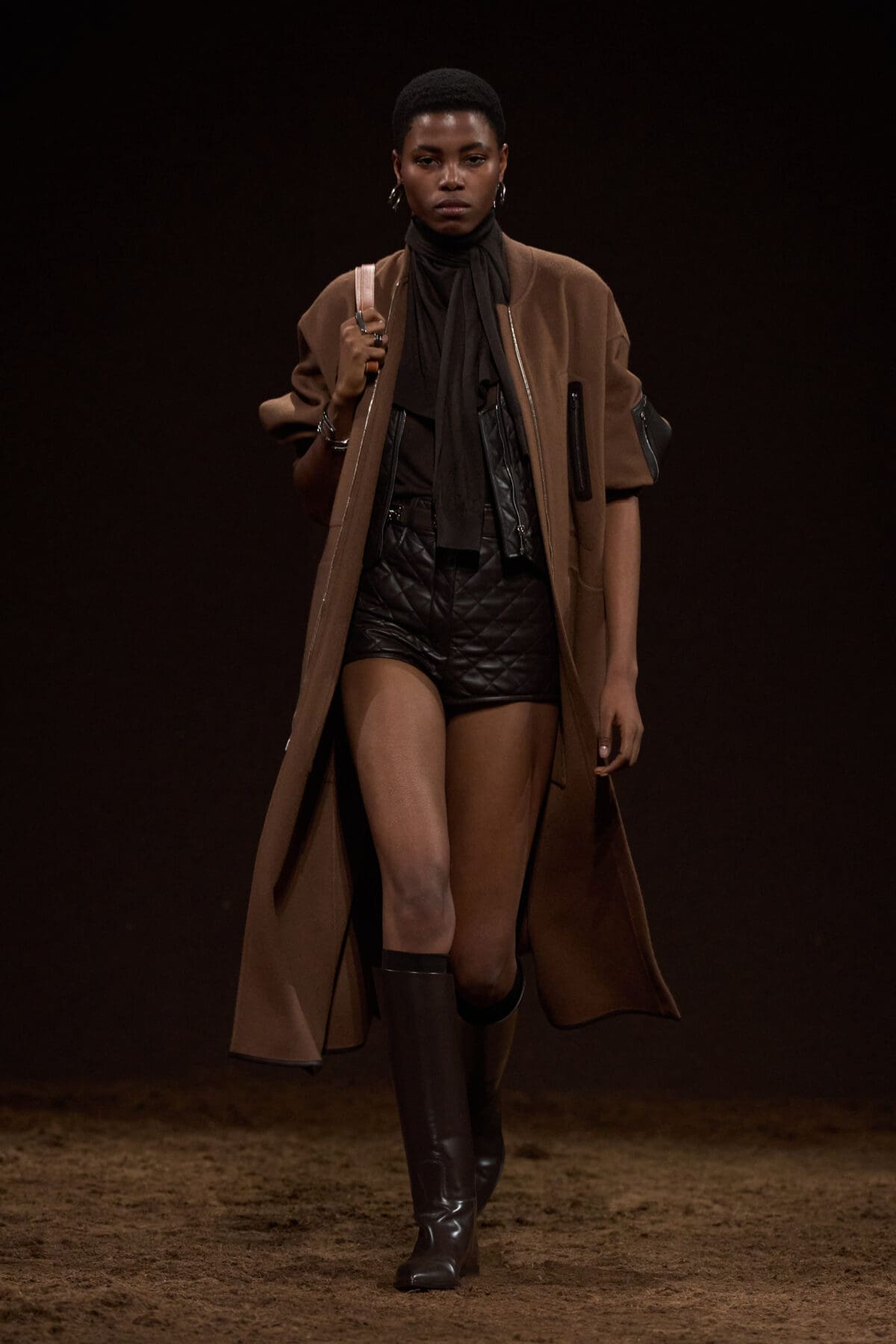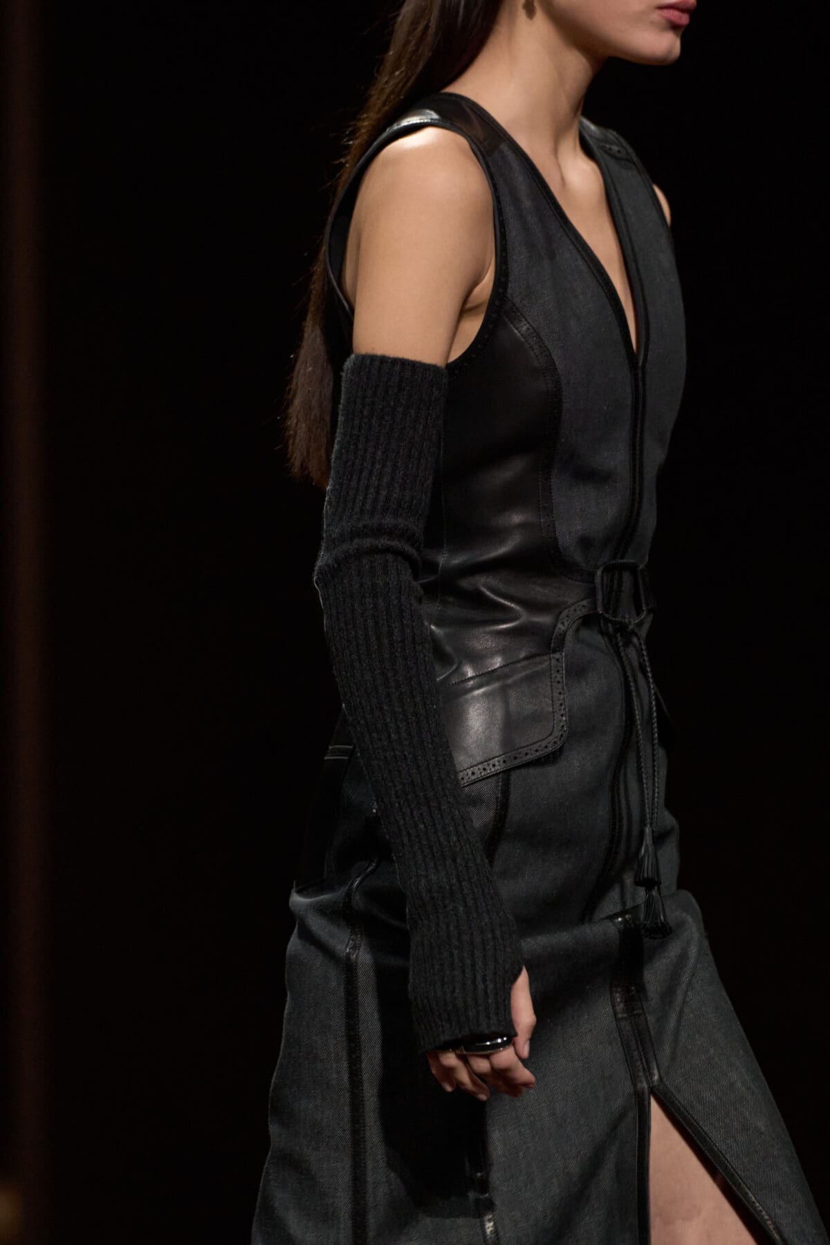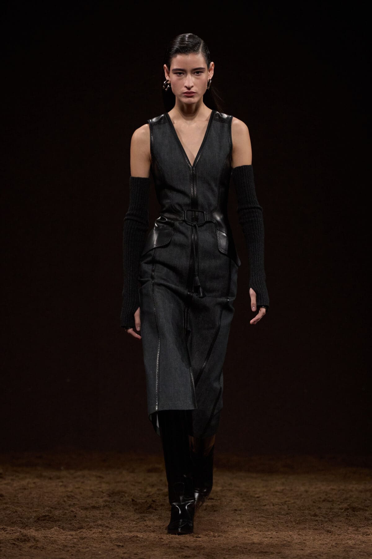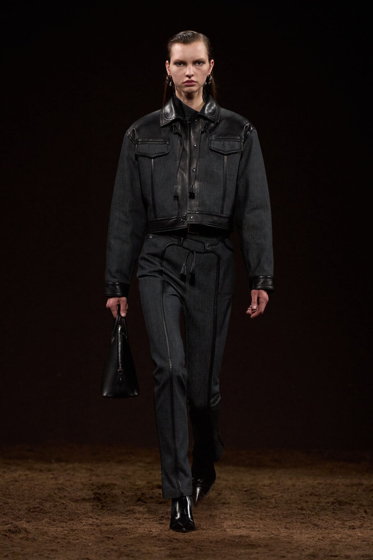 她將這個系列命名為 “Leather Dandy”。到了第六套造型——一件短版絎縫外套,拉鍊敞開露出黑色高領毛衣,搭配高腰窄褲,由光亮的黑色手套皮革製成,展現出一種「馬術騎士」風格——這已經成為Vanhée加入品牌十年來最出色的系列。為甚麼?因為Hermès的核心在於極致精緻的皮革材質與工藝,馬術元素的細膩詮釋,以及令收藏家心動的細節。Vanhée觸及了這些元素中略帶戀物癖的一面,並首次將其從中產階級的框架中解放出來。