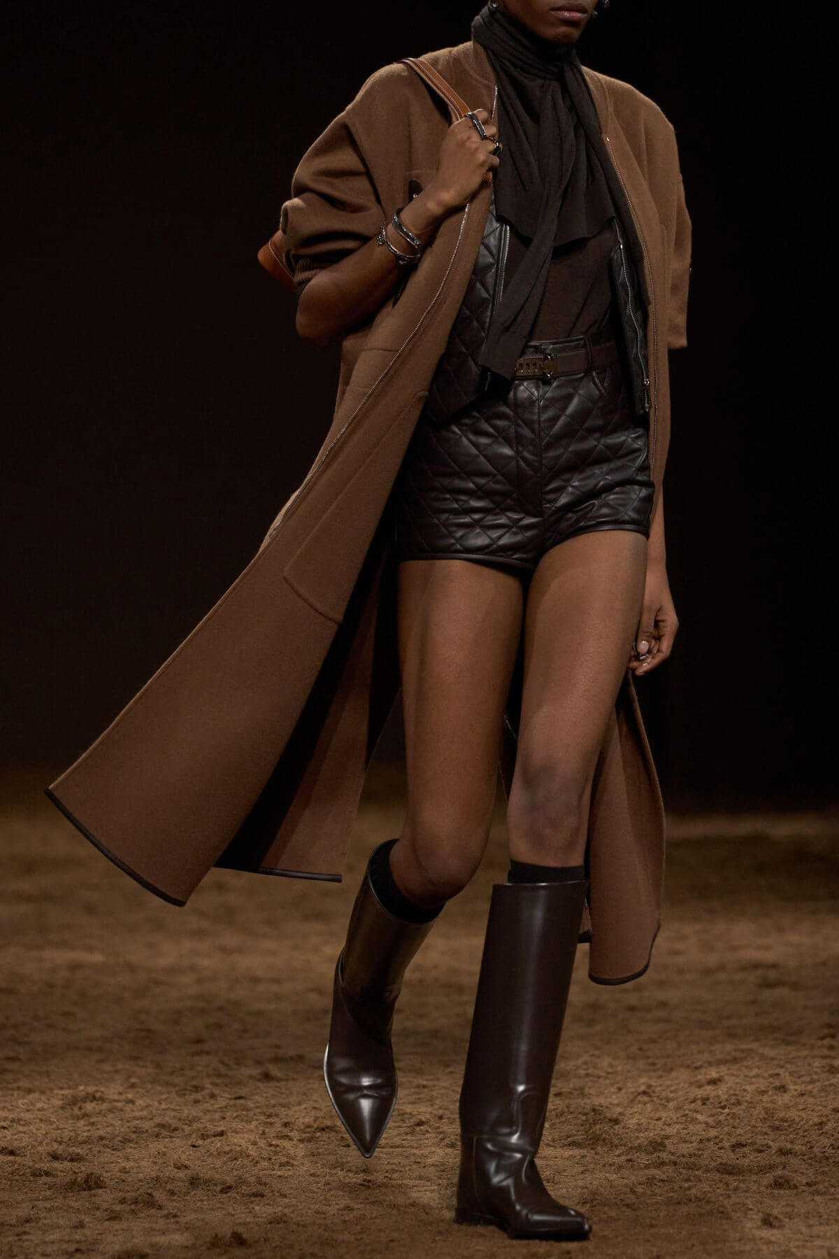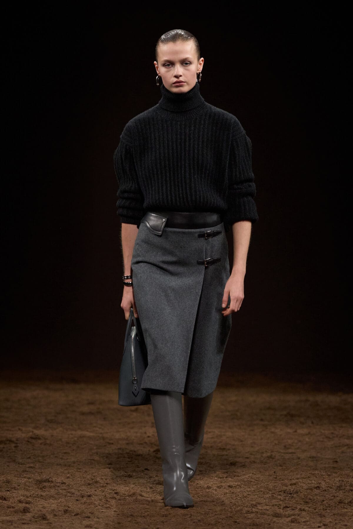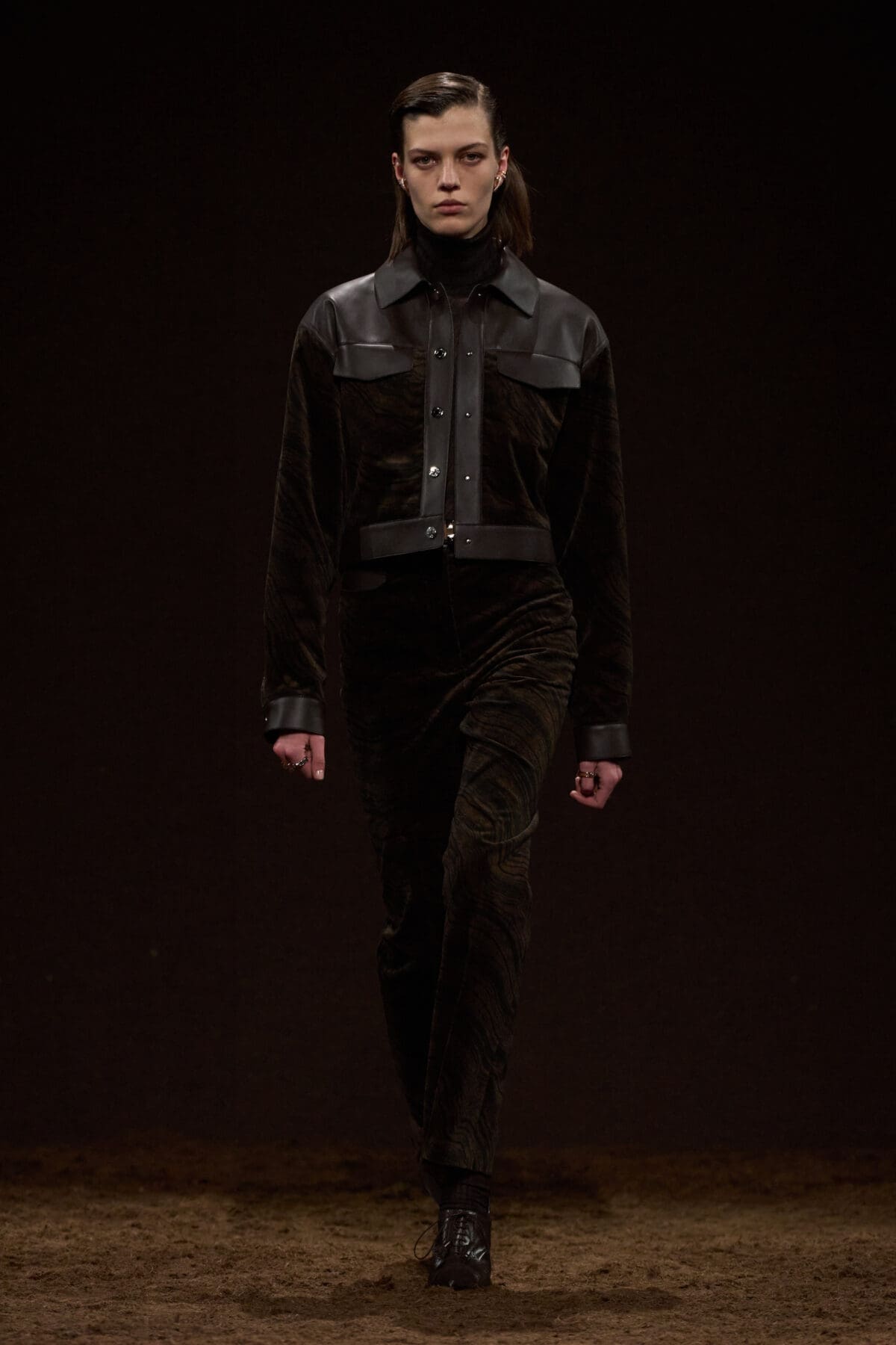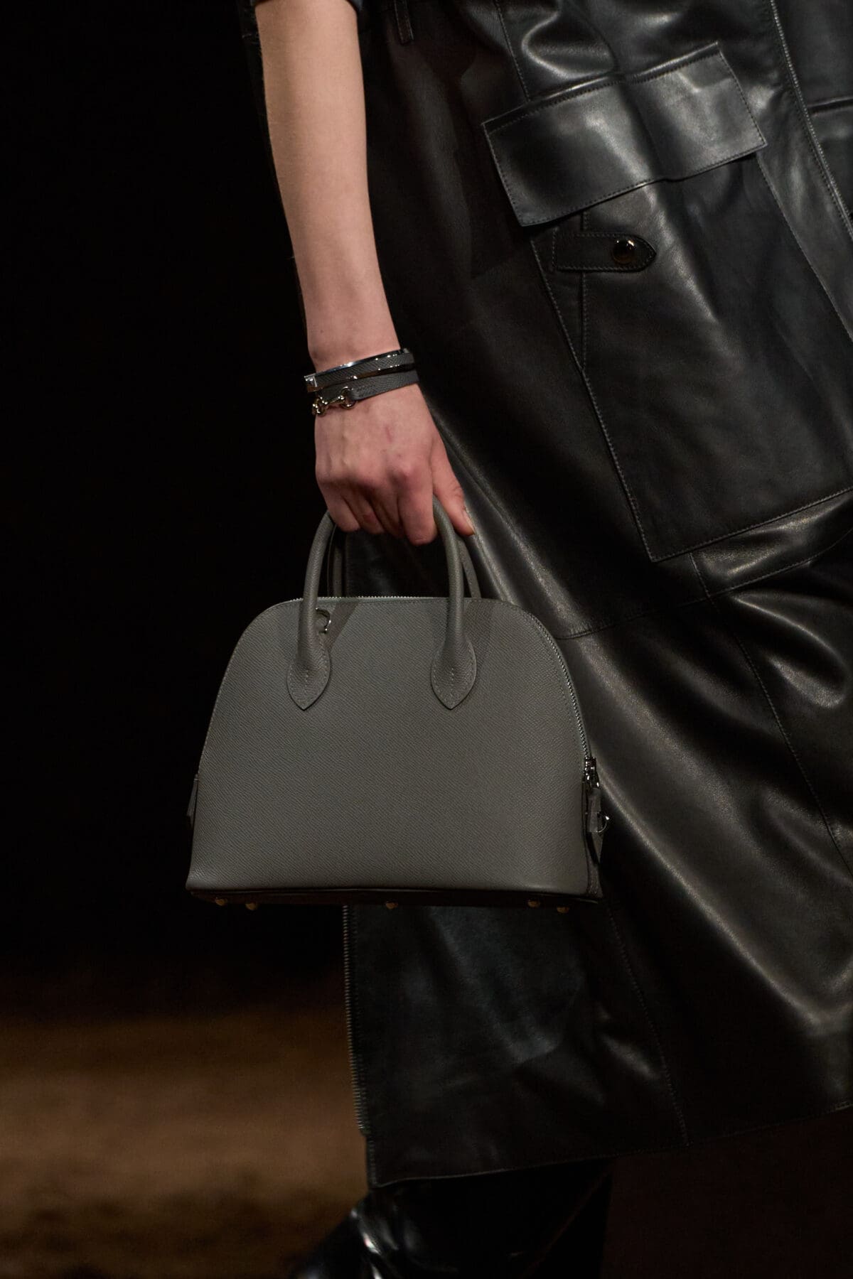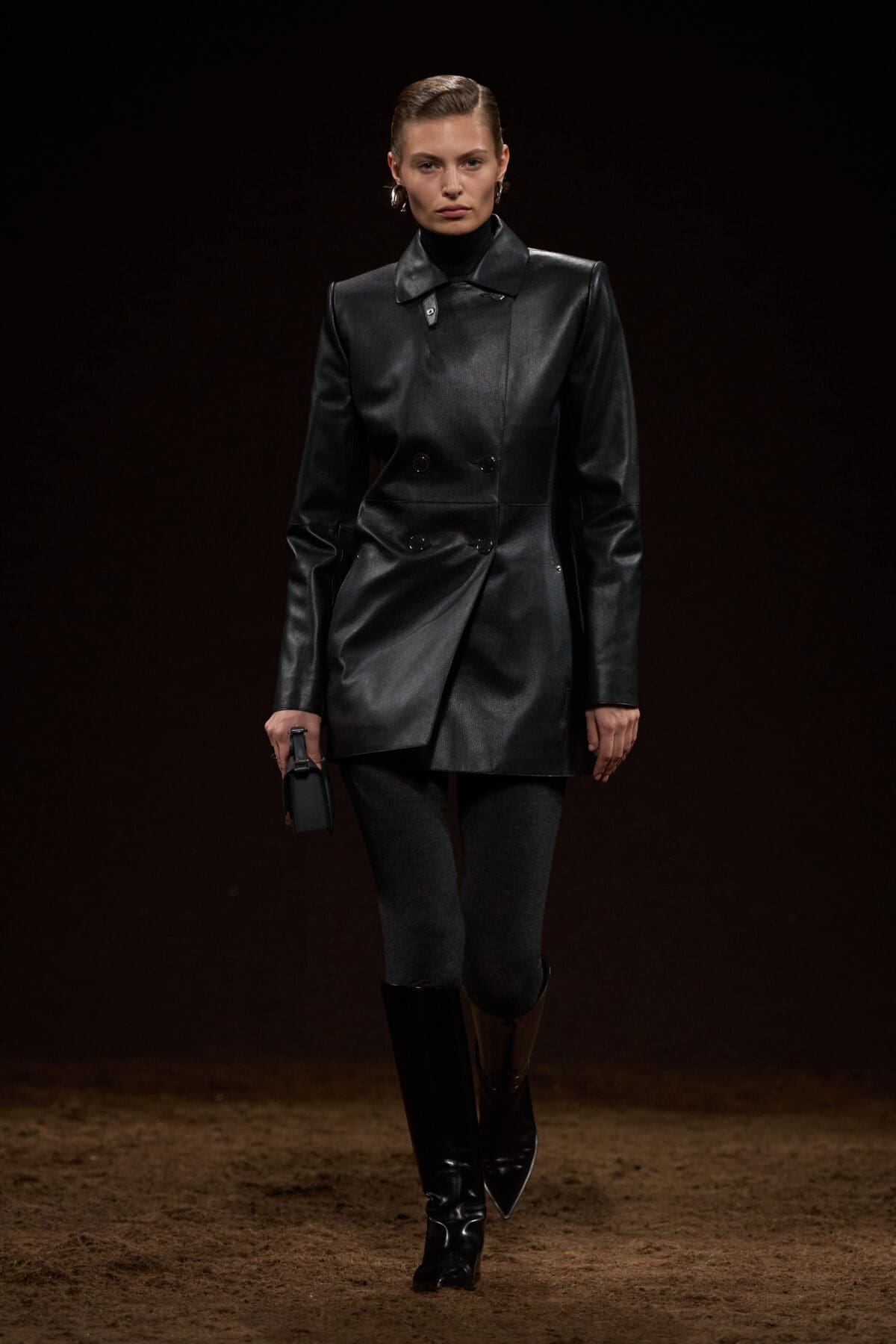 她將這個系列命名為 “Leather Dandy”。到了第六套造型——一件短版絎縫外套,拉鍊敞開露出黑色高領毛衣,搭配高腰窄褲,由光亮的黑色手套皮革製成,展現出一種「馬術騎士」風格——這已經成為Vanhée加入品牌十年來最出色的系列。為甚麼?因為Hermès的核心在於極致精緻的皮革材質與工藝,馬術元素的細膩詮釋,以及令收藏家心動的細節。Vanhée觸及了這些元素中略帶戀物癖的一面,並首次將其從中產階級的框架中解放出來。