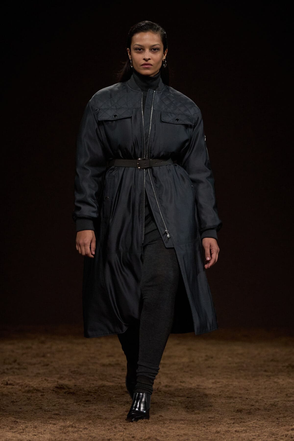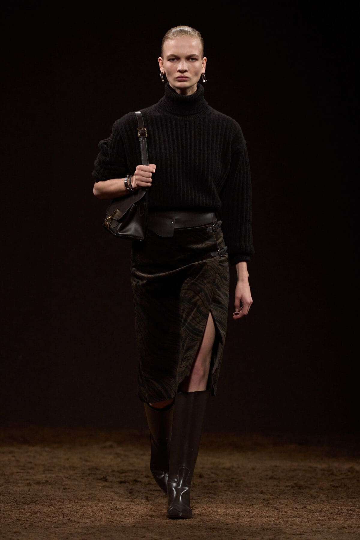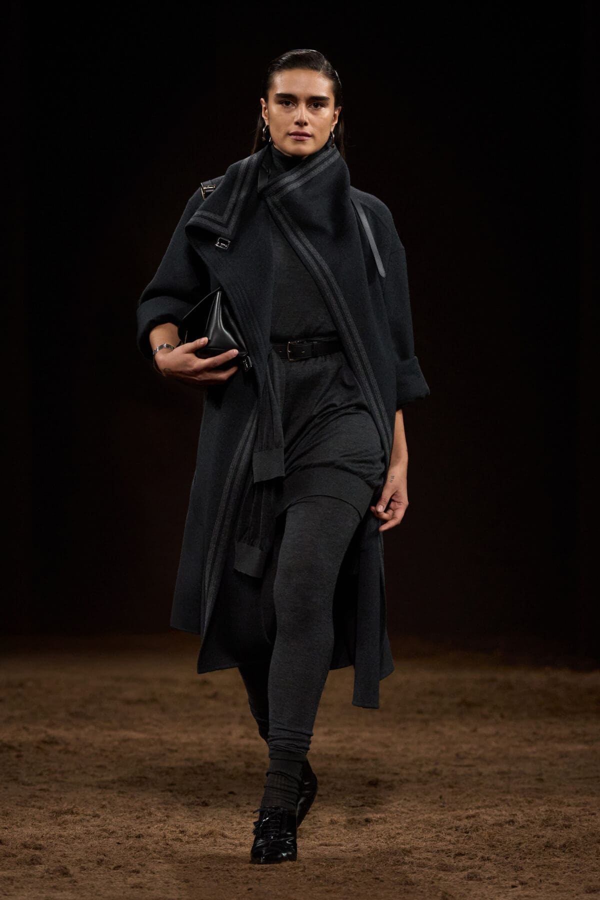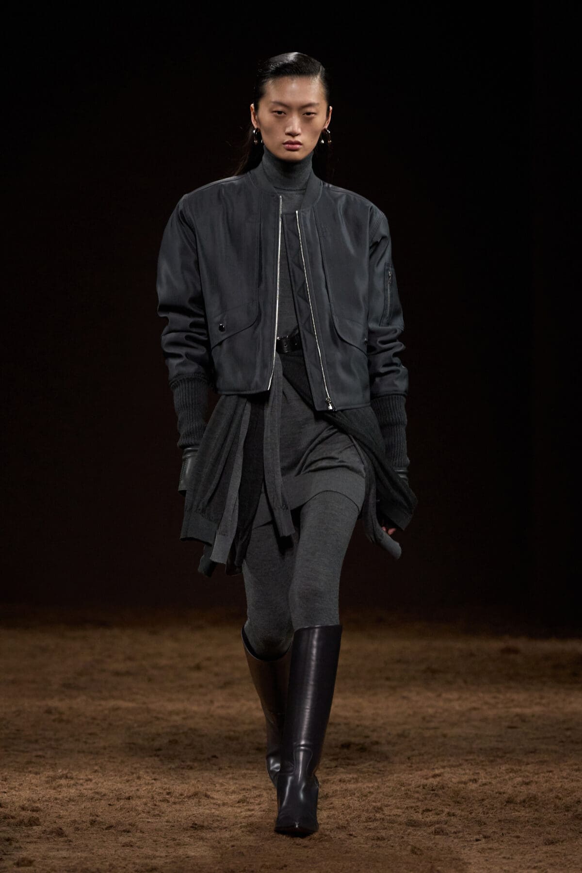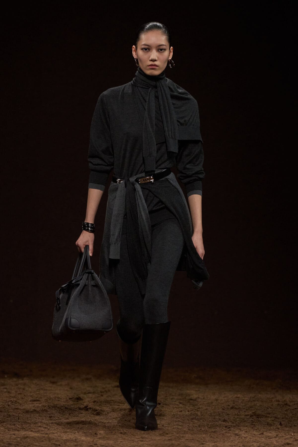 她將這個系列命名為 “Leather Dandy”。到了第六套造型——一件短版絎縫外套,拉鍊敞開露出黑色高領毛衣,搭配高腰窄褲,由光亮的黑色手套皮革製成,展現出一種「馬術騎士」風格——這已經成為Vanhée加入品牌十年來最出色的系列。為甚麼?因為Hermès的核心在於極致精緻的皮革材質與工藝,馬術元素的細膩詮釋,以及令收藏家心動的細節。Vanhée觸及了這些元素中略帶戀物癖的一面,並首次將其從中產階級的框架中解放出來。