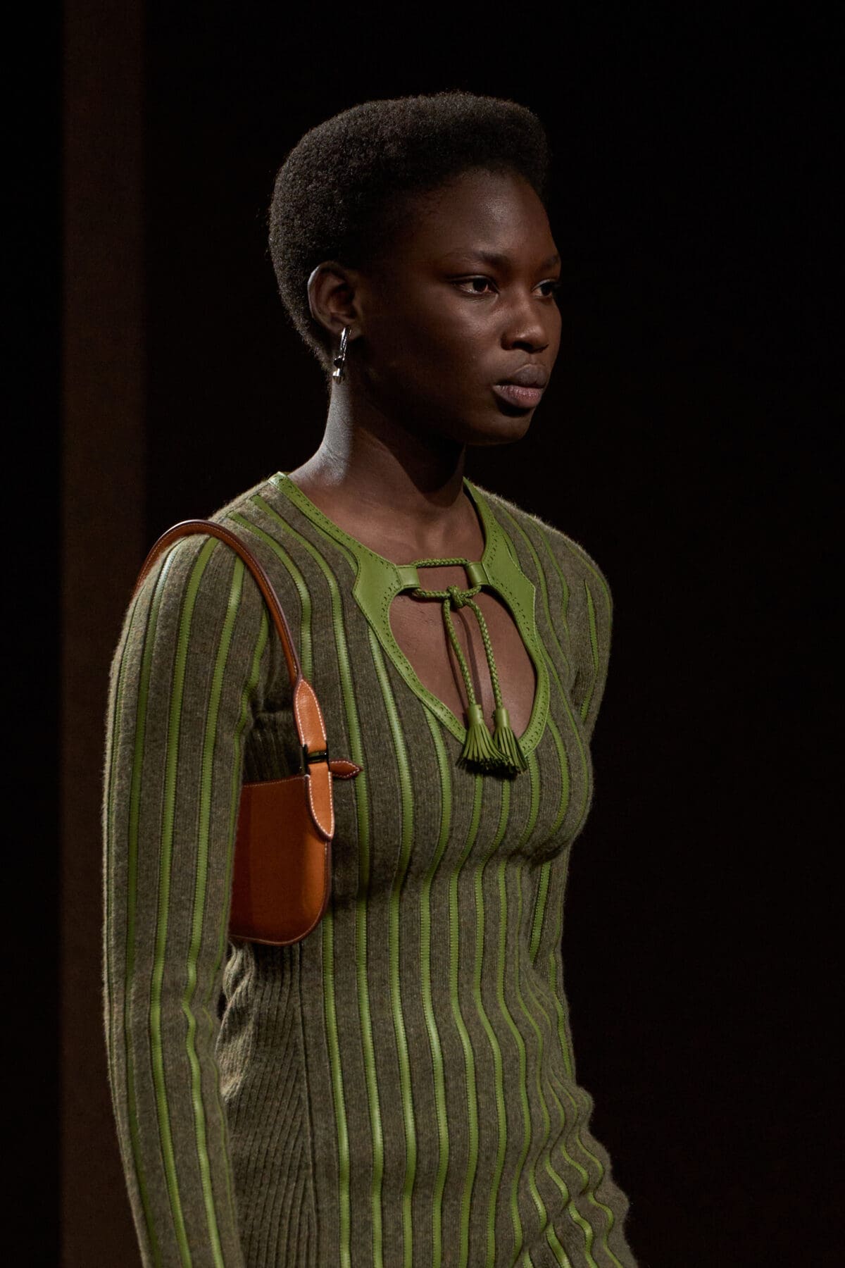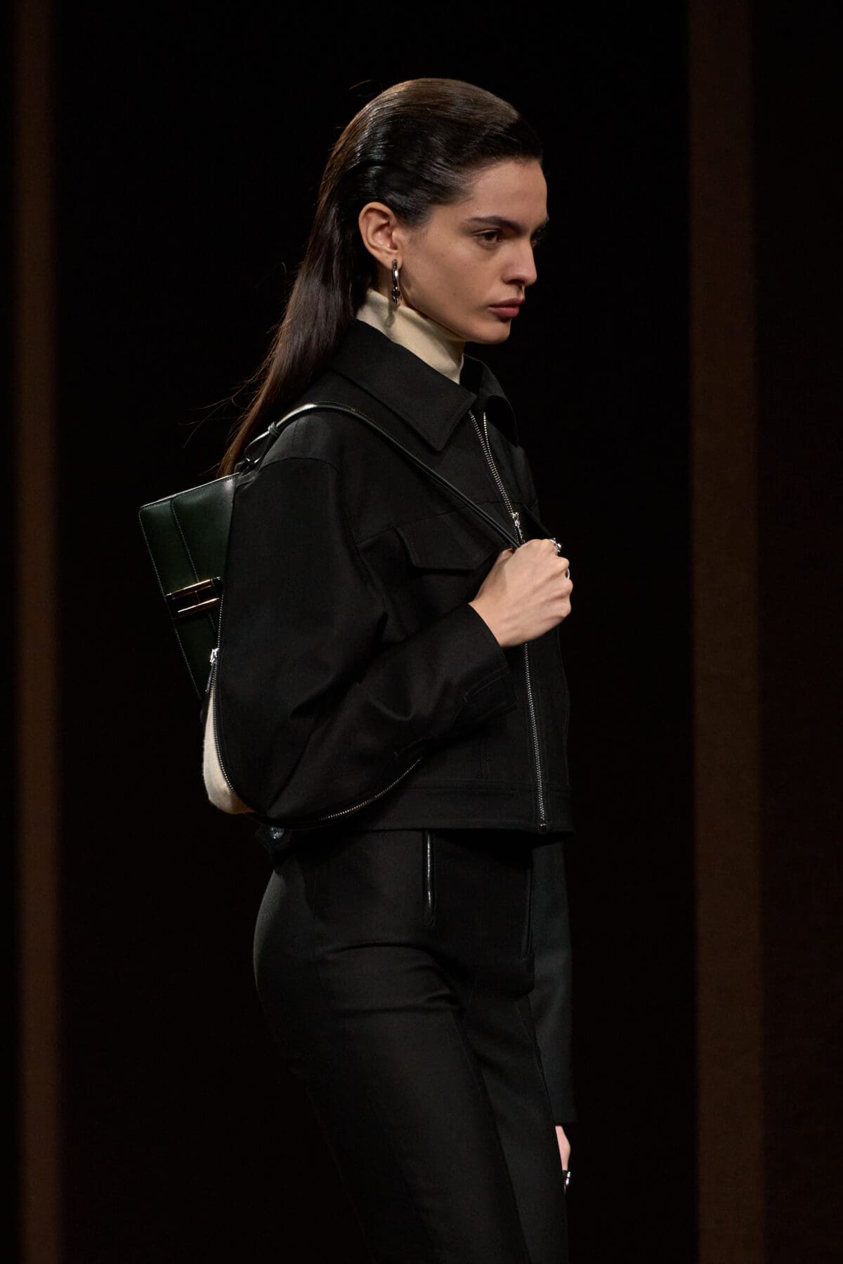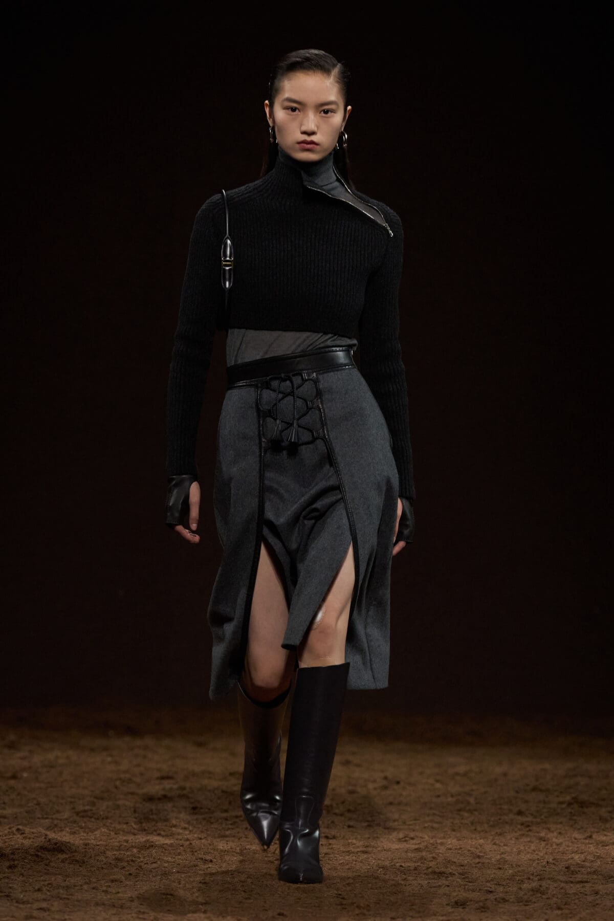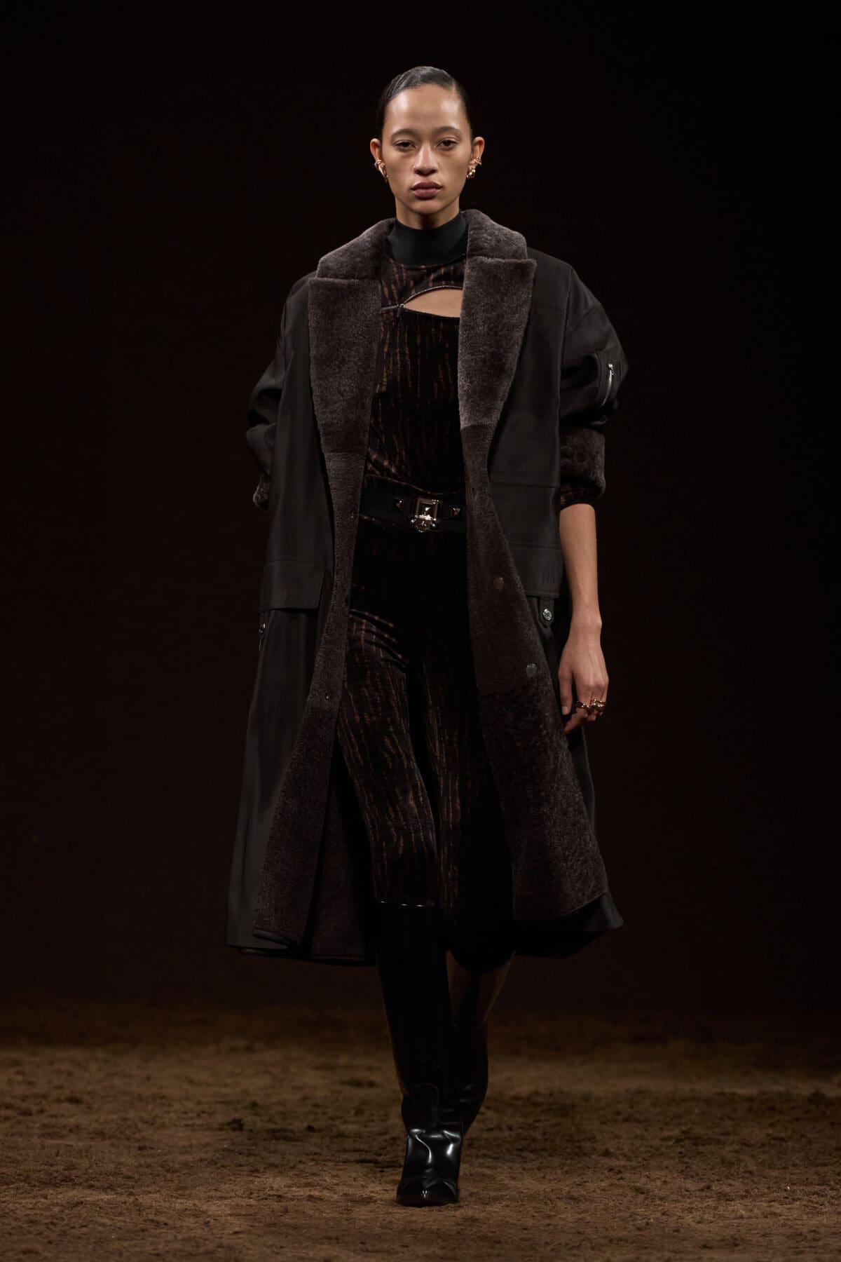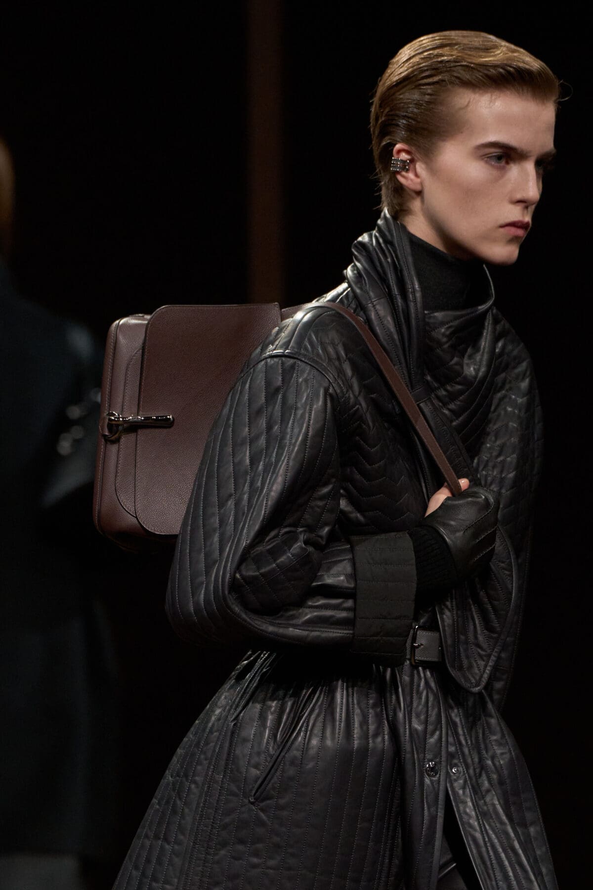 她將這個系列命名為 “Leather Dandy”。到了第六套造型——一件短版絎縫外套,拉鍊敞開露出黑色高領毛衣,搭配高腰窄褲,由光亮的黑色手套皮革製成,展現出一種「馬術騎士」風格——這已經成為Vanhée加入品牌十年來最出色的系列。為甚麼?因為Hermès的核心在於極致精緻的皮革材質與工藝,馬術元素的細膩詮釋,以及令收藏家心動的細節。Vanhée觸及了這些元素中略帶戀物癖的一面,並首次將其從中產階級的框架中解放出來。