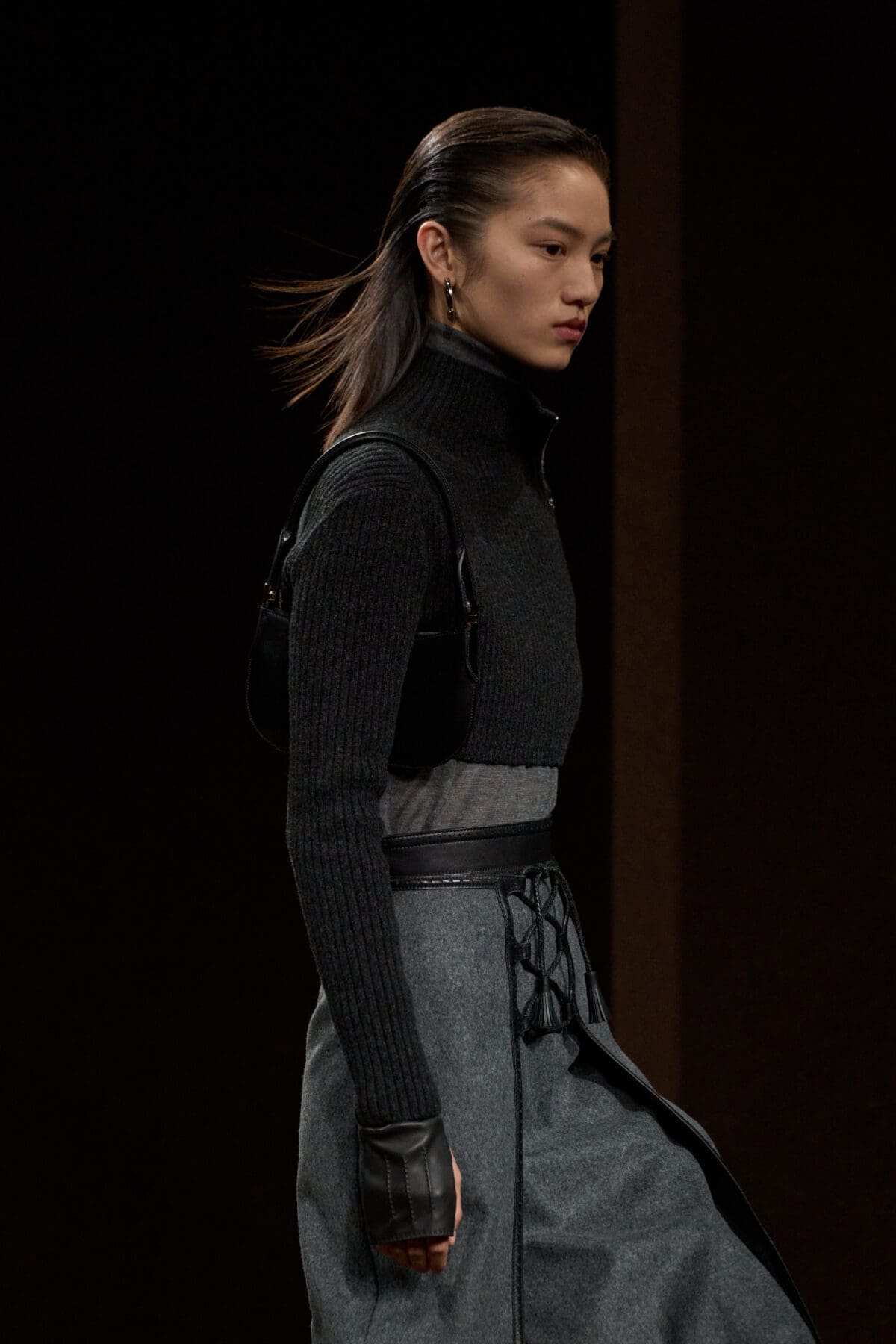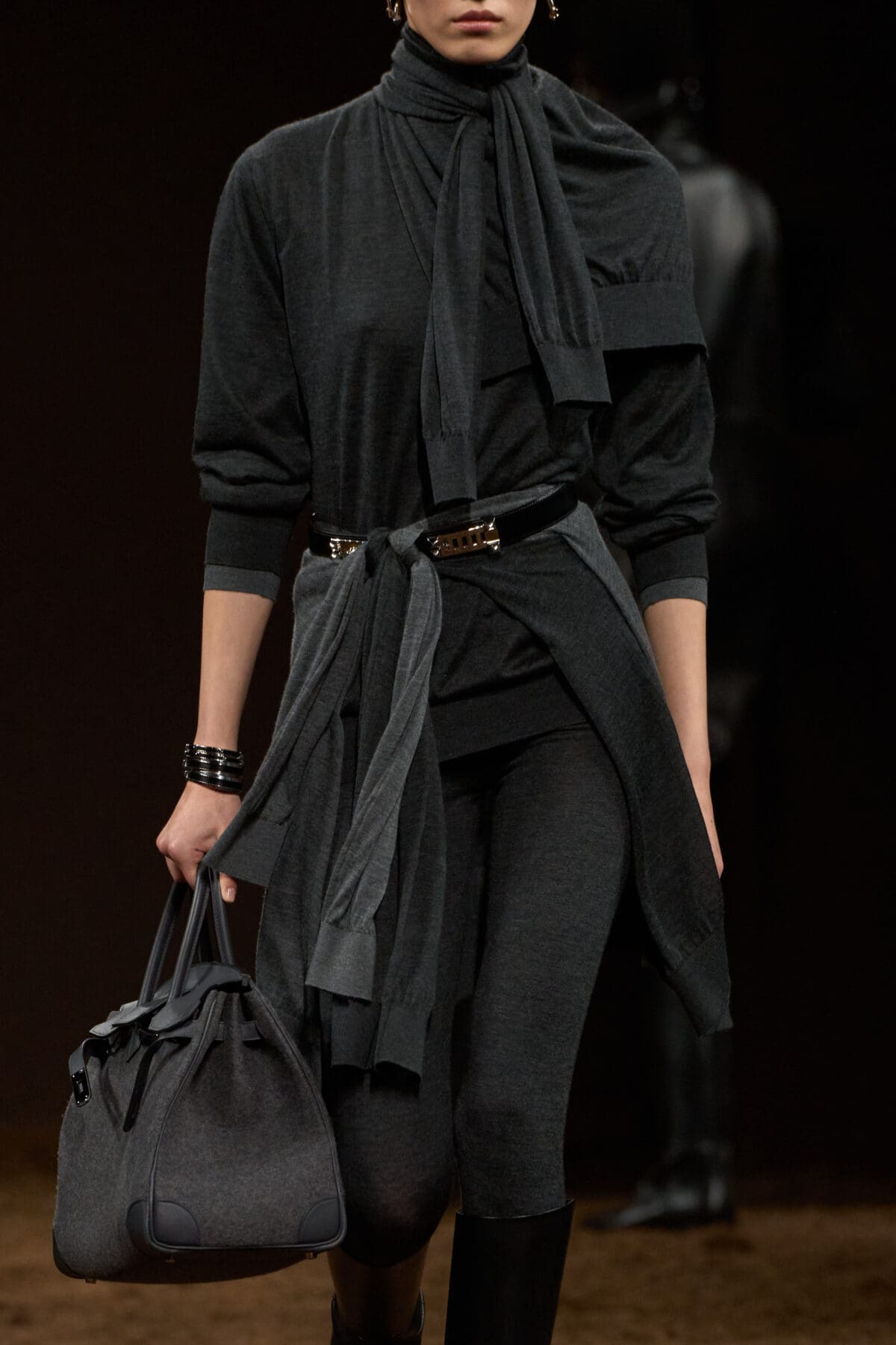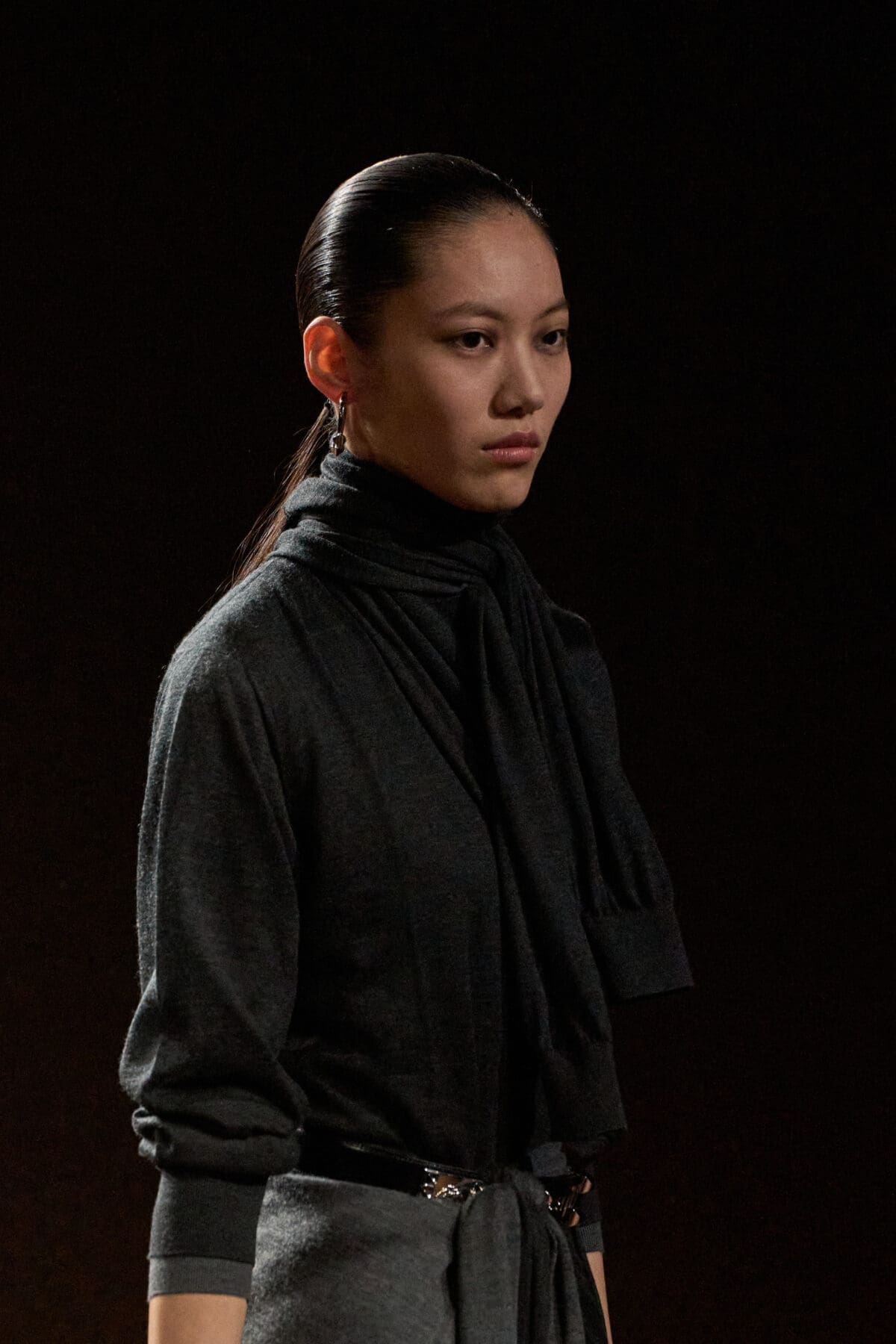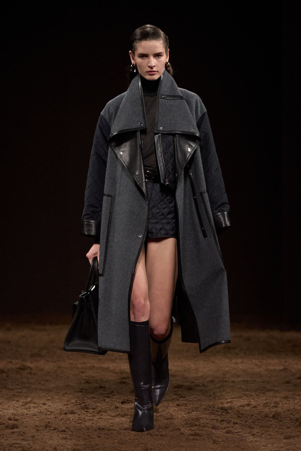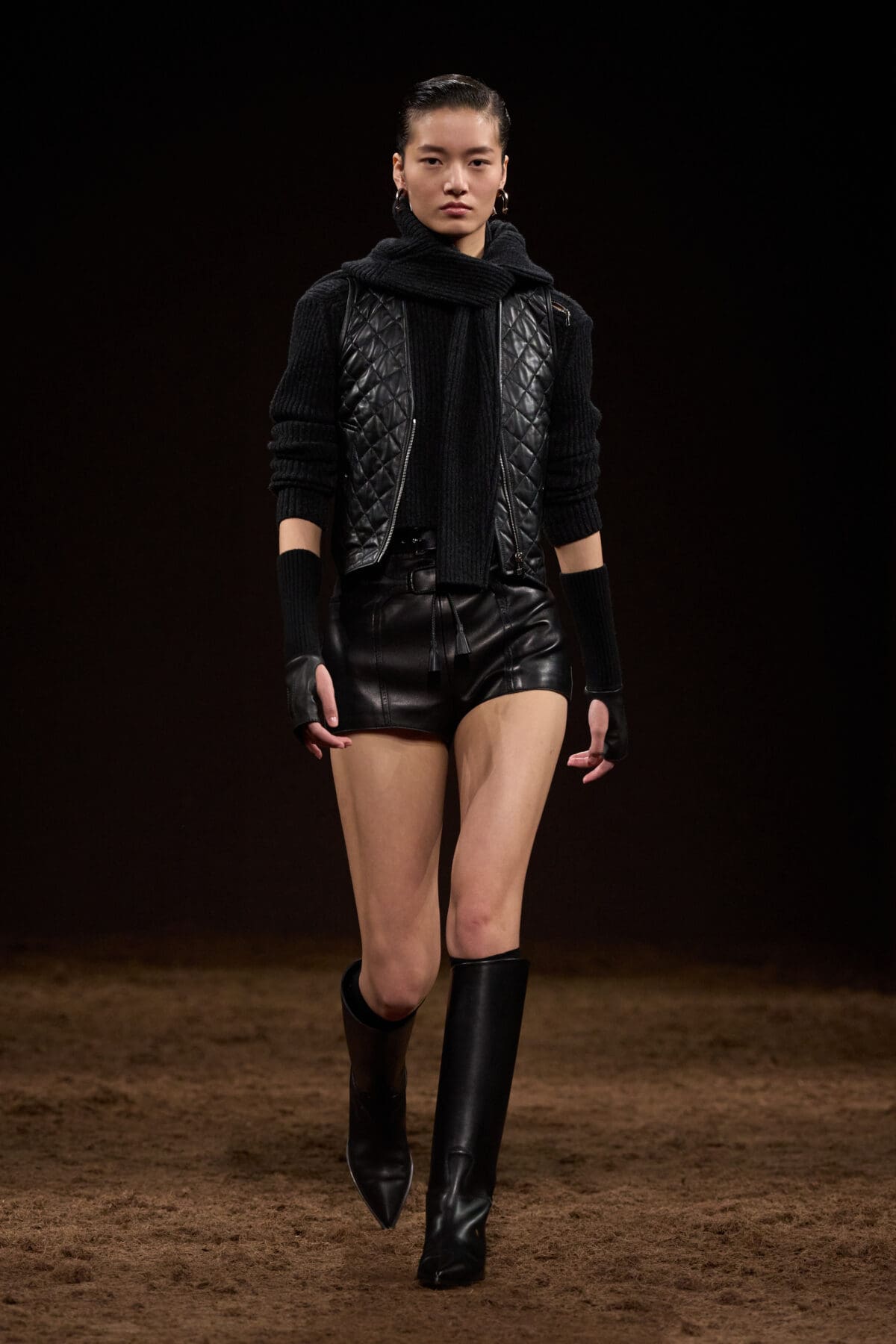 她將這個系列命名為 “Leather Dandy”。到了第六套造型——一件短版絎縫外套,拉鍊敞開露出黑色高領毛衣,搭配高腰窄褲,由光亮的黑色手套皮革製成,展現出一種「馬術騎士」風格——這已經成為Vanhée加入品牌十年來最出色的系列。為甚麼?因為Hermès的核心在於極致精緻的皮革材質與工藝,馬術元素的細膩詮釋,以及令收藏家心動的細節。Vanhée觸及了這些元素中略帶戀物癖的一面,並首次將其從中產階級的框架中解放出來。