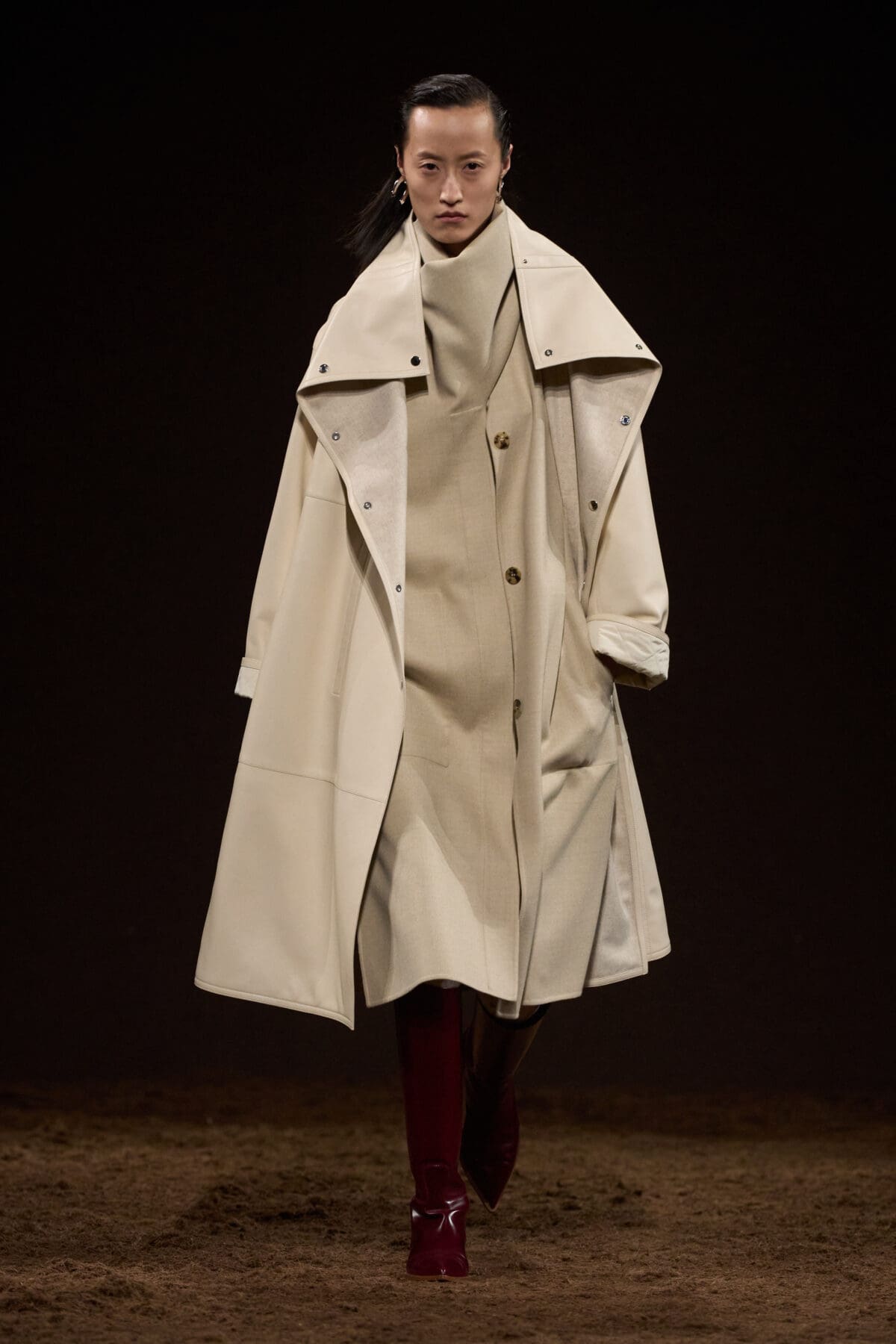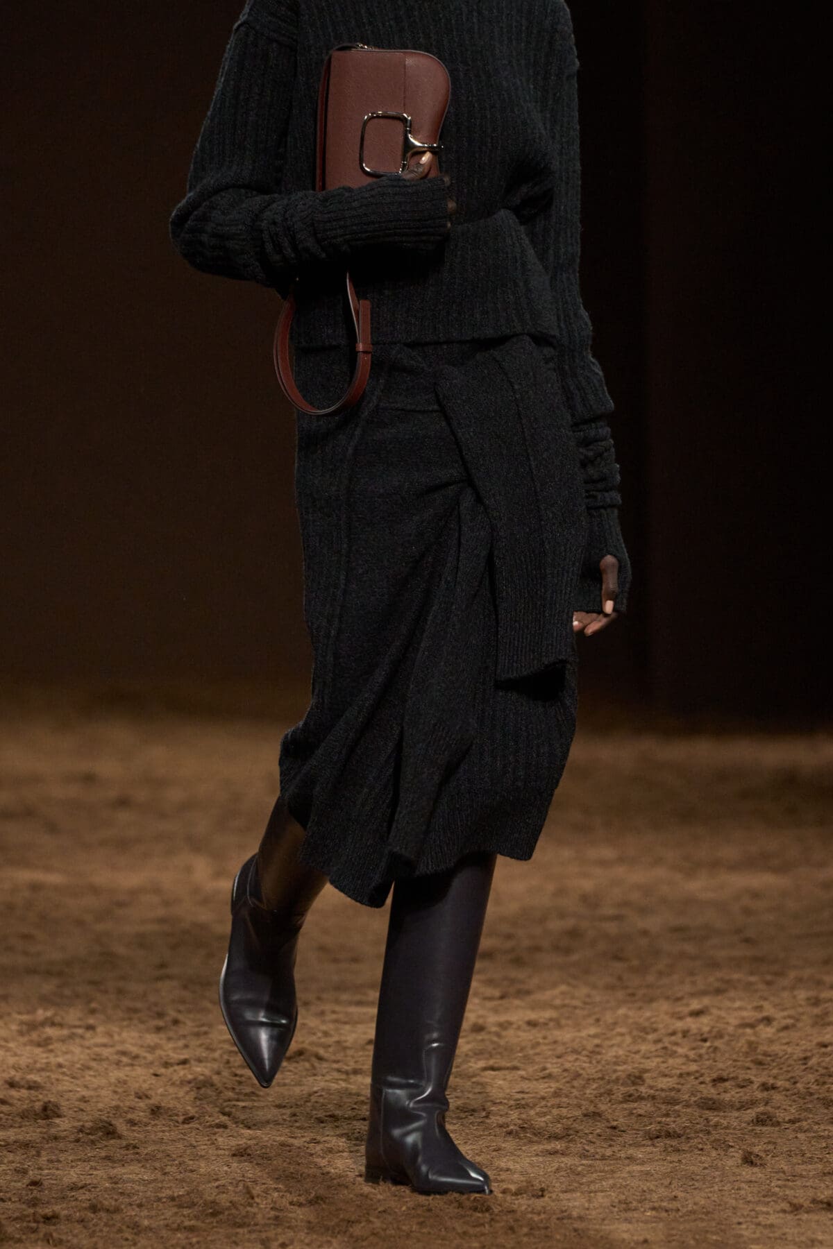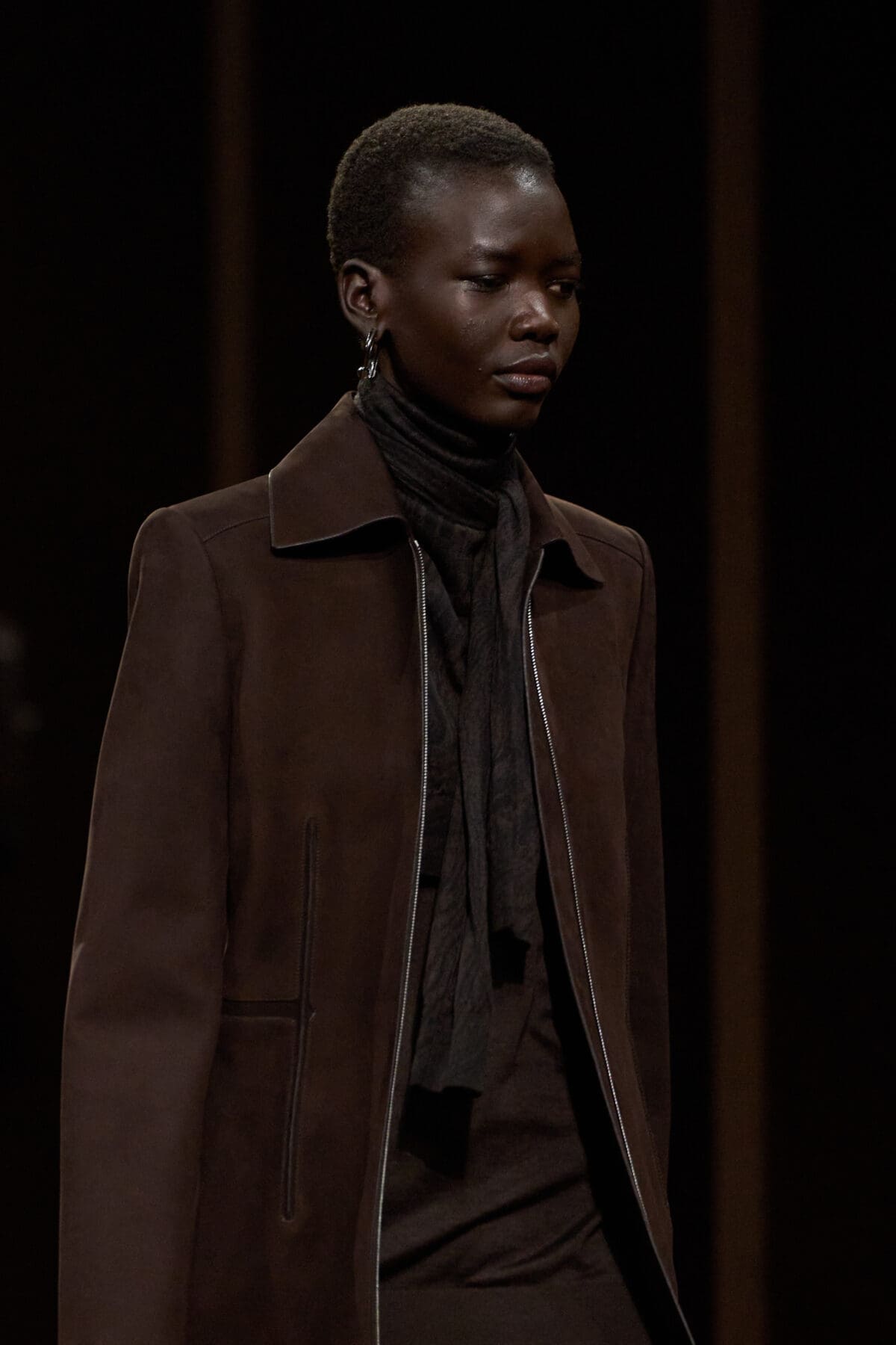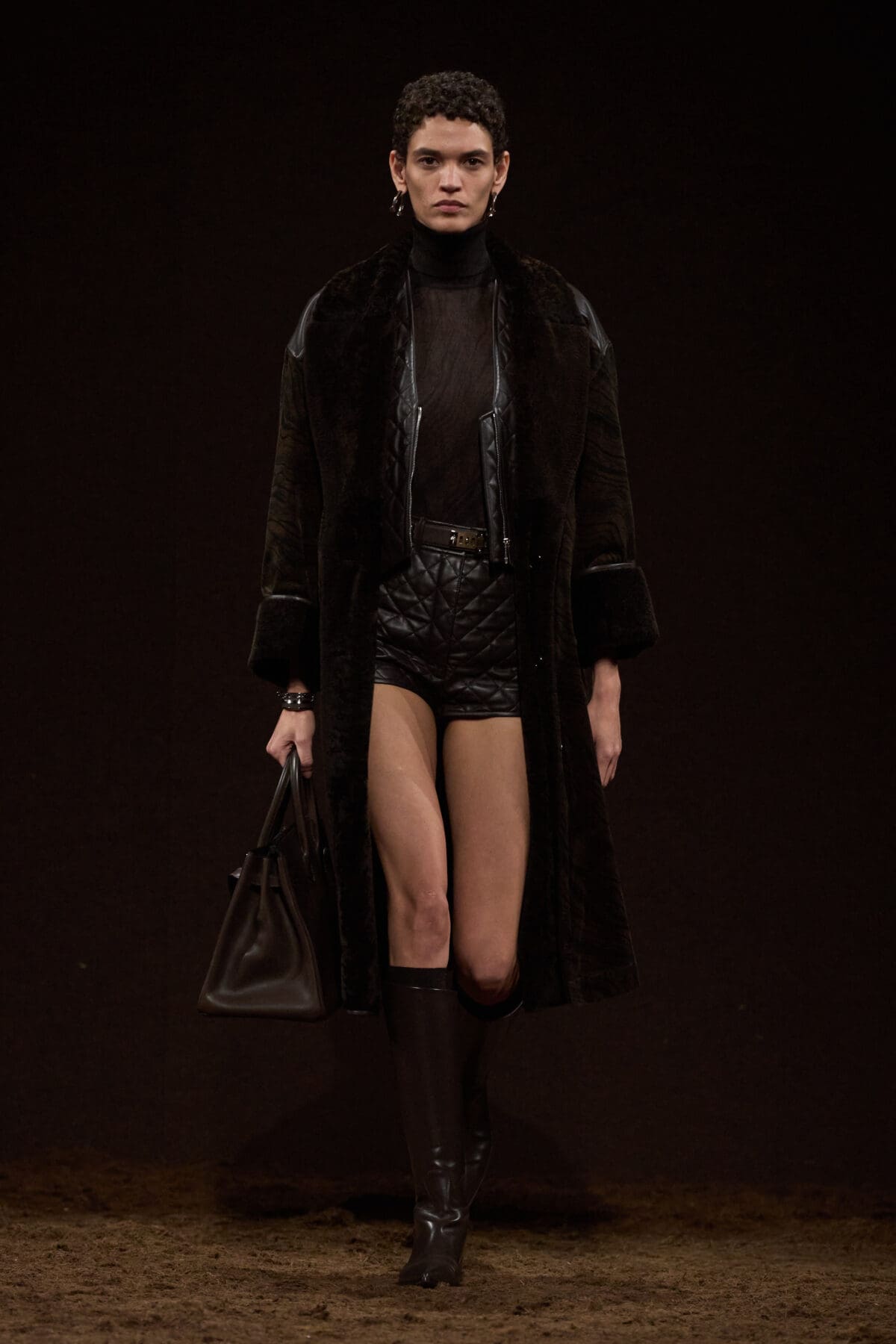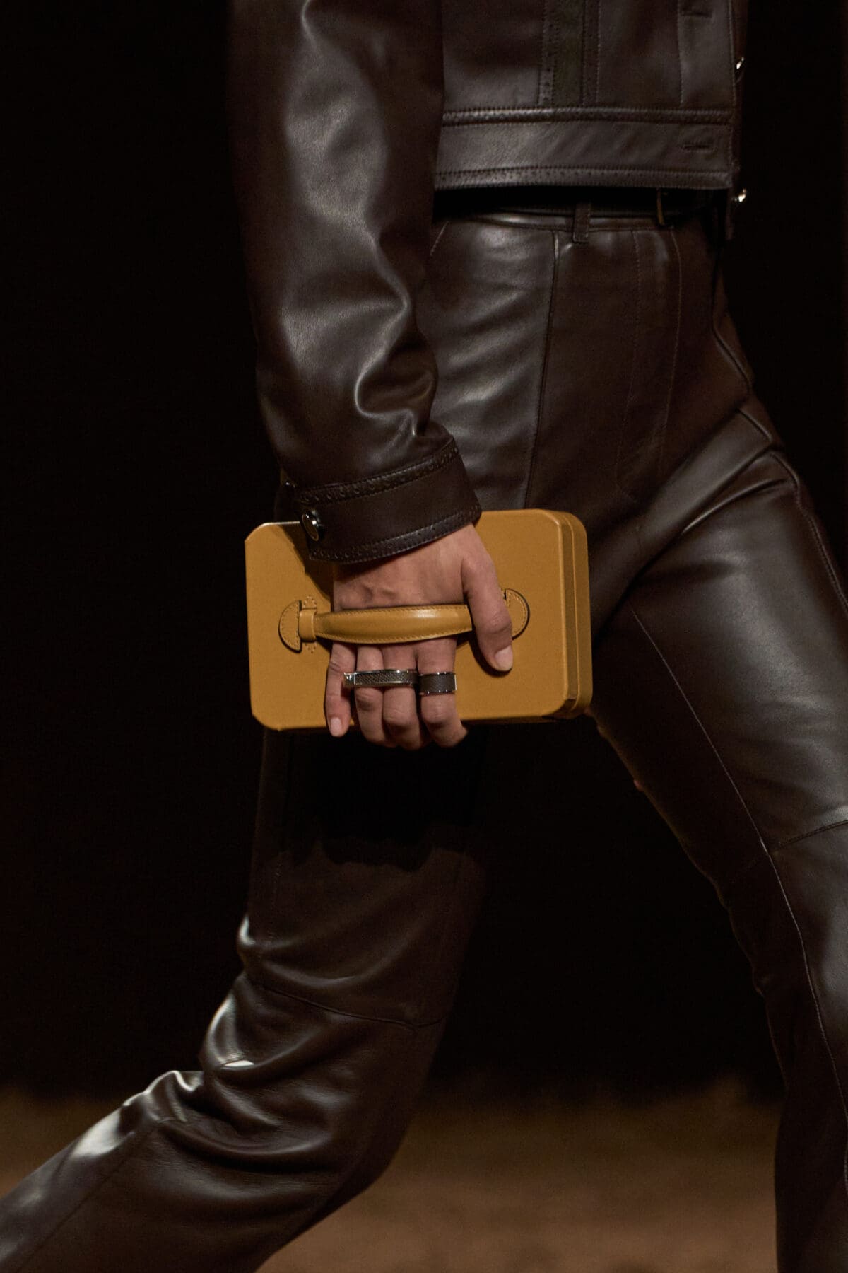 她將這個系列命名為 “Leather Dandy”。到了第六套造型——一件短版絎縫外套,拉鍊敞開露出黑色高領毛衣,搭配高腰窄褲,由光亮的黑色手套皮革製成,展現出一種「馬術騎士」風格——這已經成為Vanhée加入品牌十年來最出色的系列。為甚麼?因為Hermès的核心在於極致精緻的皮革材質與工藝,馬術元素的細膩詮釋,以及令收藏家心動的細節。Vanhée觸及了這些元素中略帶戀物癖的一面,並首次將其從中產階級的框架中解放出來。