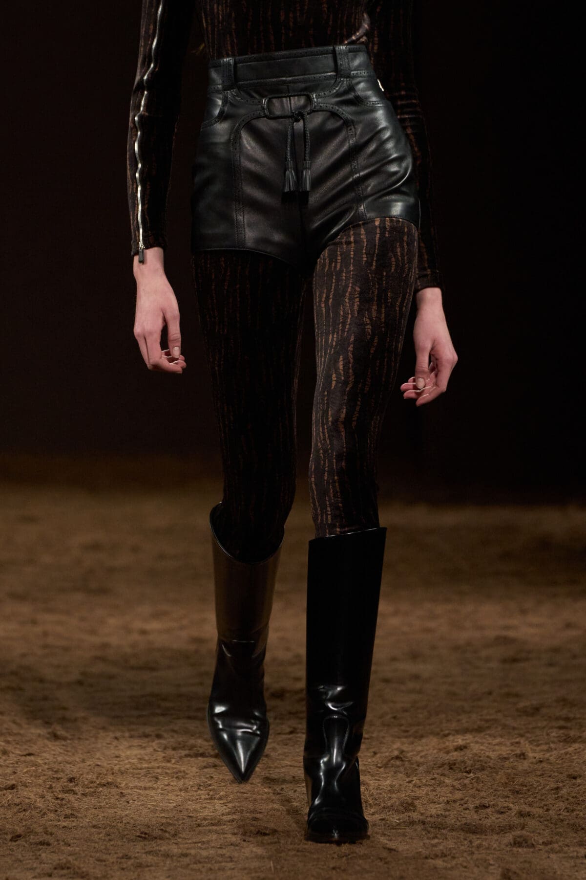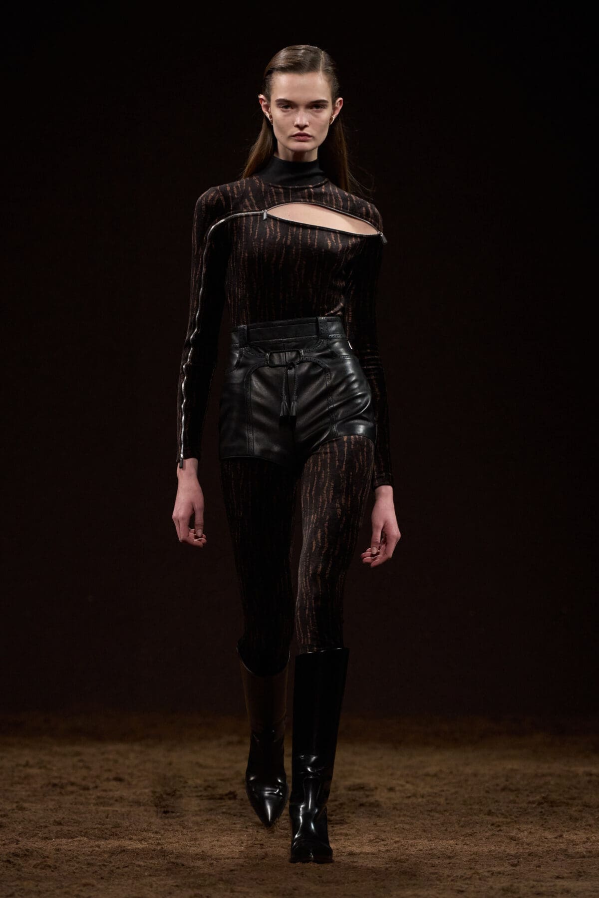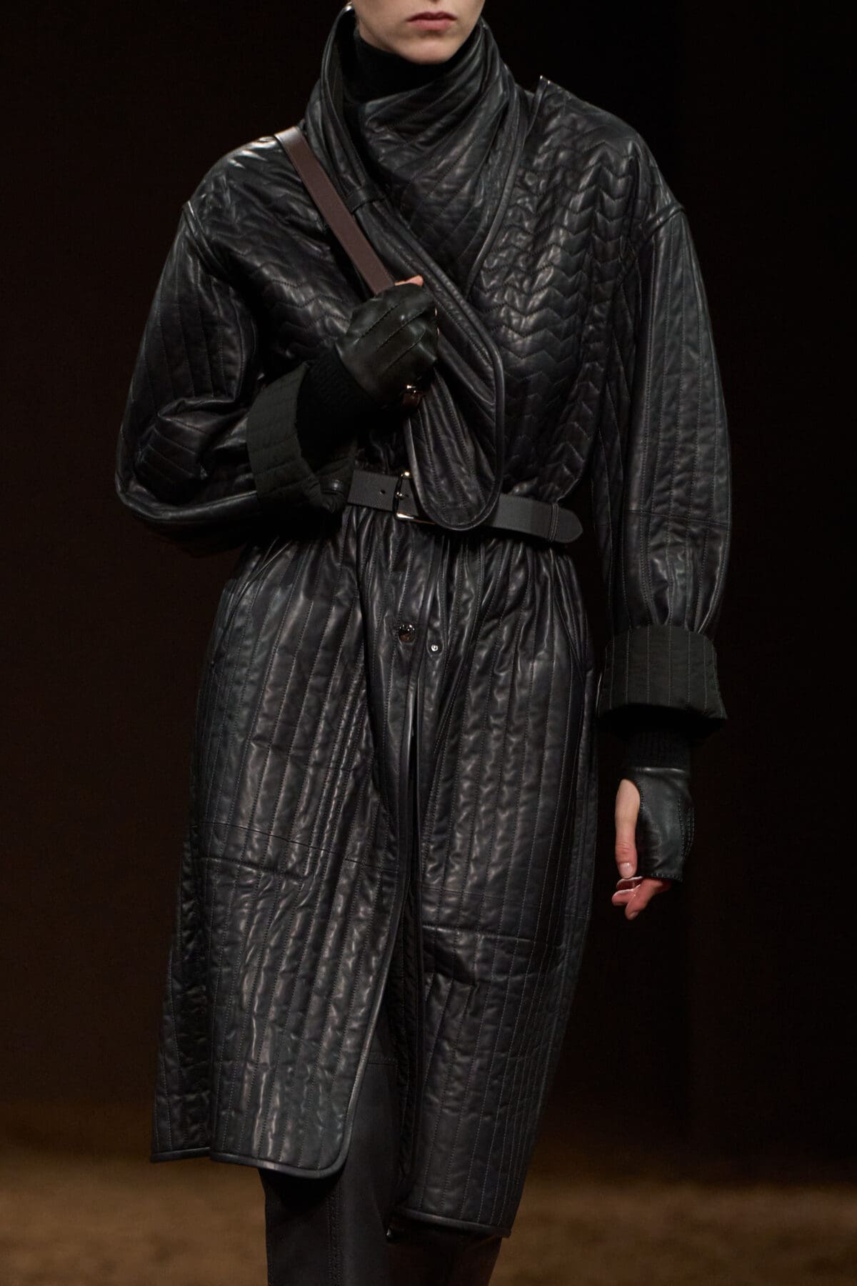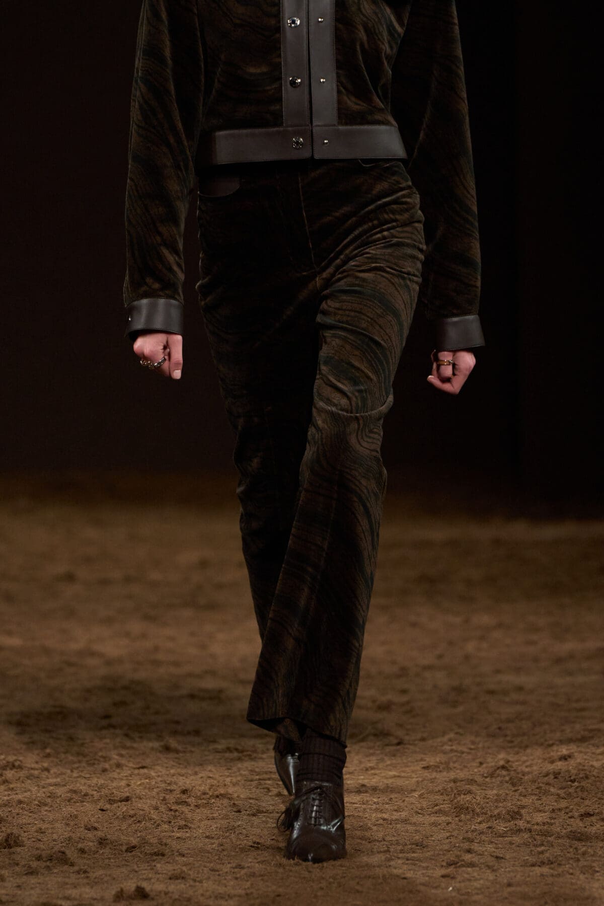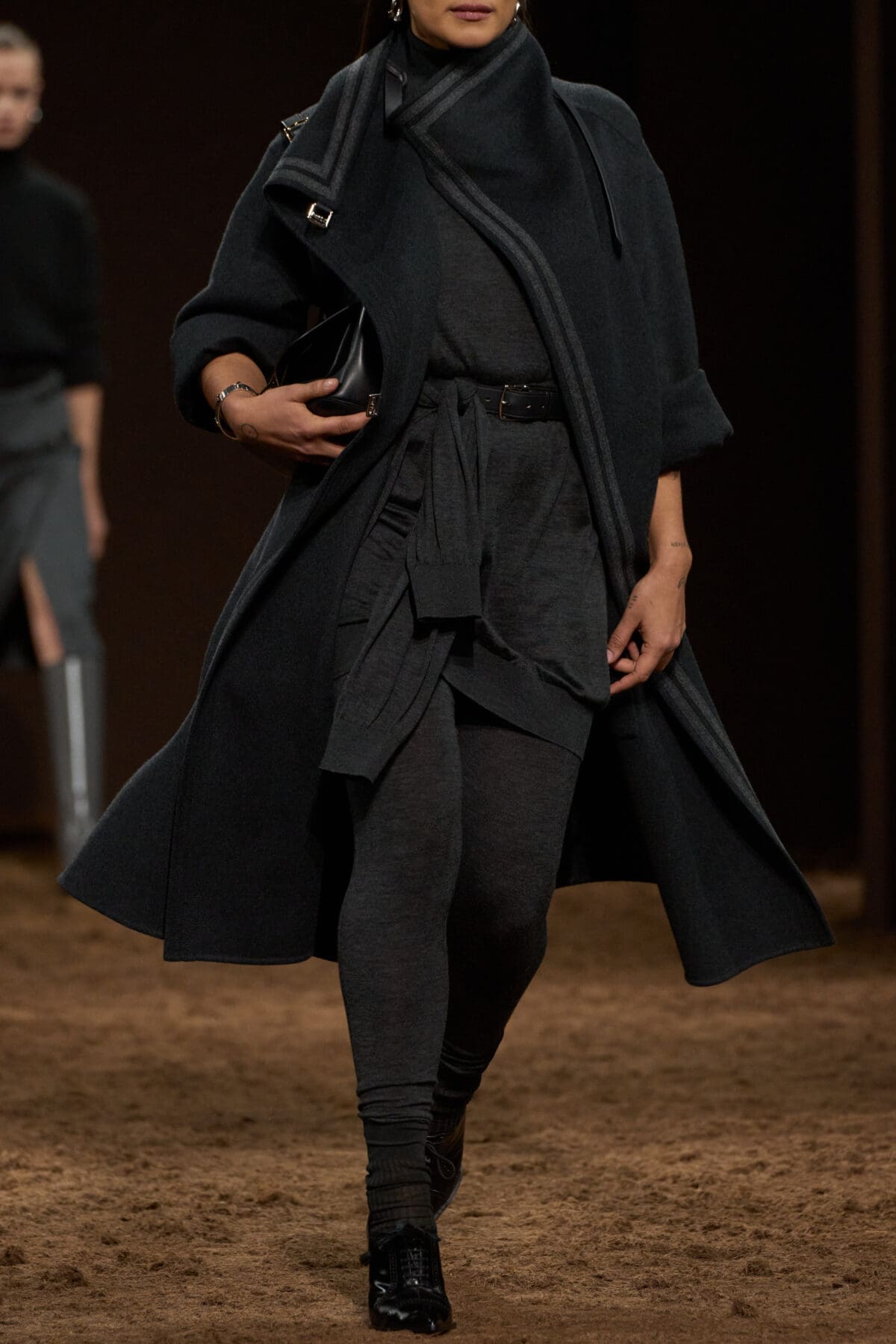 她將這個系列命名為 “Leather Dandy”。到了第六套造型——一件短版絎縫外套,拉鍊敞開露出黑色高領毛衣,搭配高腰窄褲,由光亮的黑色手套皮革製成,展現出一種「馬術騎士」風格——這已經成為Vanhée加入品牌十年來最出色的系列。為甚麼?因為Hermès的核心在於極致精緻的皮革材質與工藝,馬術元素的細膩詮釋,以及令收藏家心動的細節。Vanhée觸及了這些元素中略帶戀物癖的一面,並首次將其從中產階級的框架中解放出來。