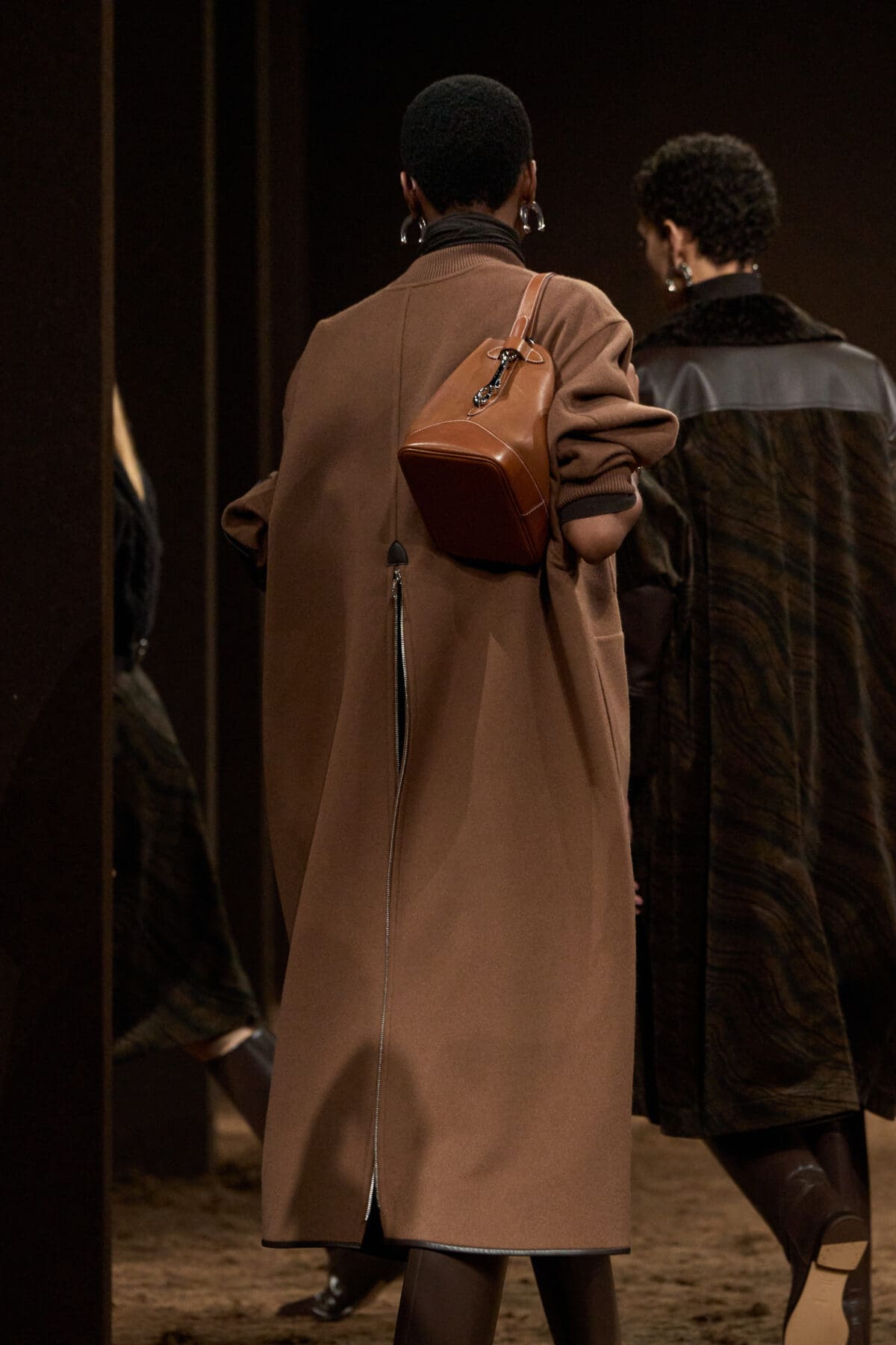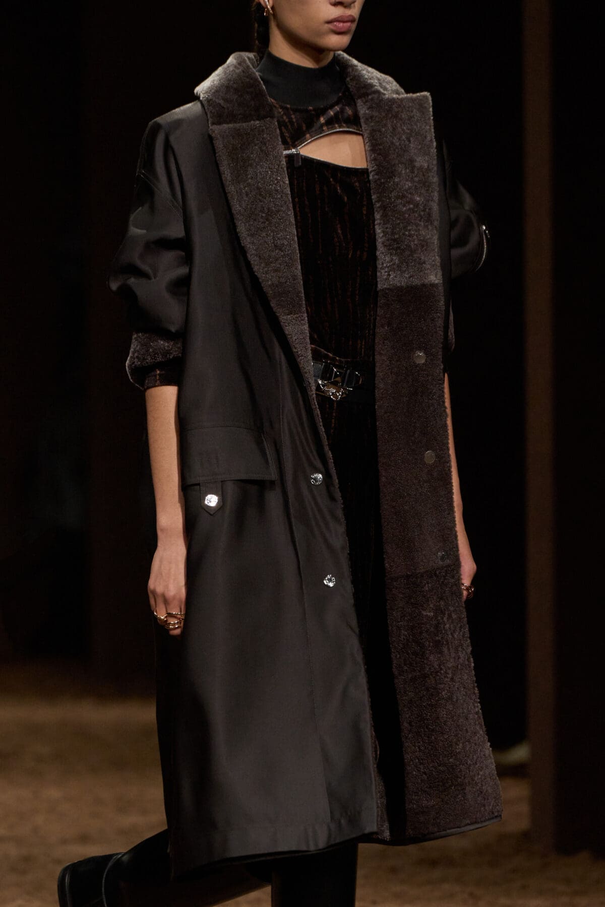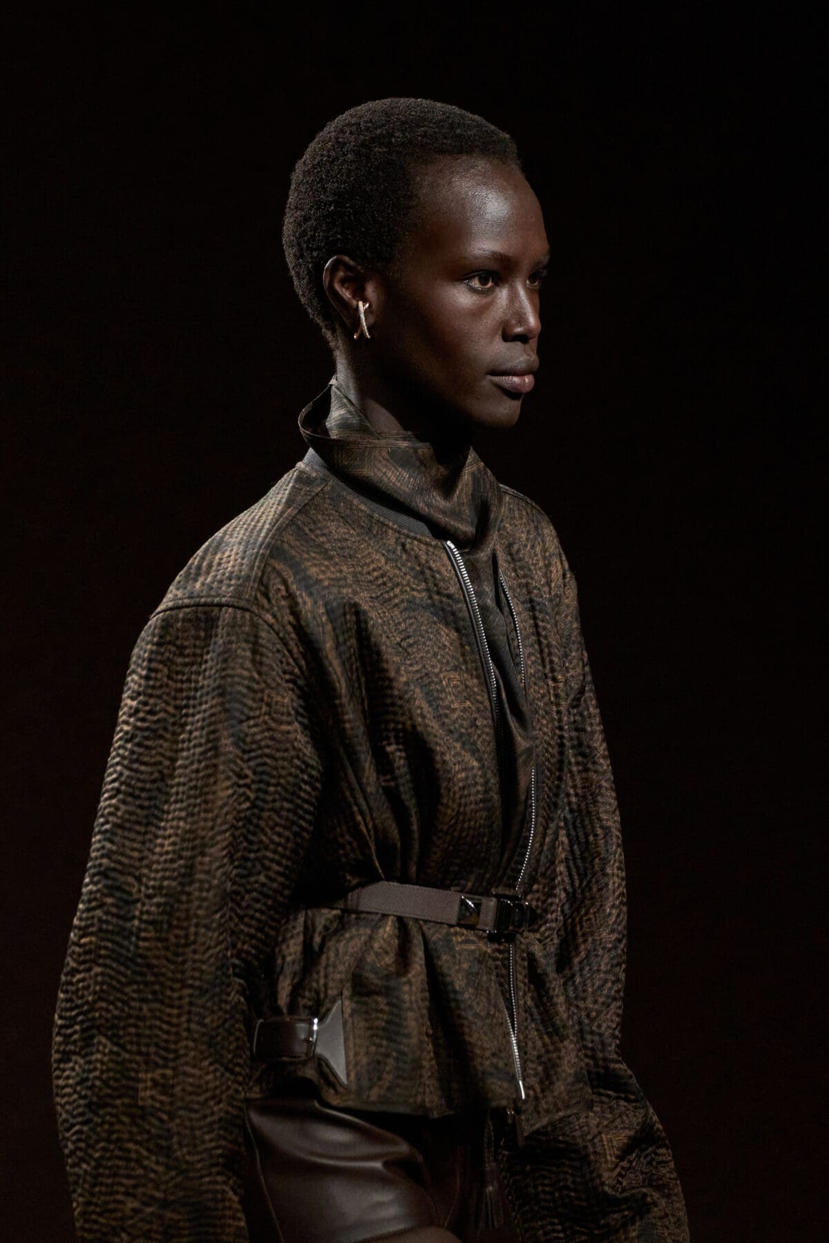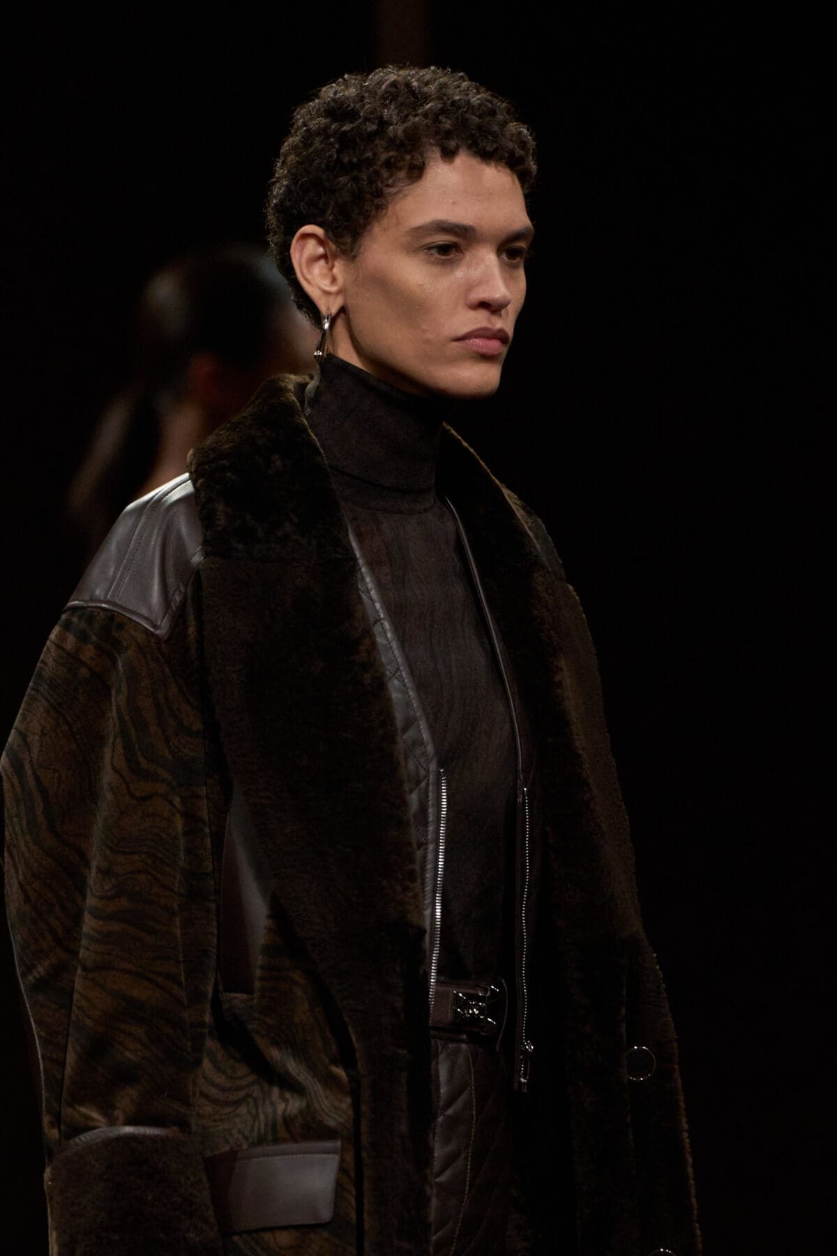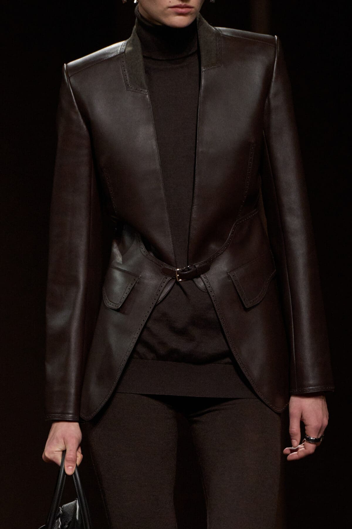 她將這個系列命名為 “Leather Dandy”。到了第六套造型——一件短版絎縫外套,拉鍊敞開露出黑色高領毛衣,搭配高腰窄褲,由光亮的黑色手套皮革製成,展現出一種「馬術騎士」風格——這已經成為Vanhée加入品牌十年來最出色的系列。為甚麼?因為Hermès的核心在於極致精緻的皮革材質與工藝,馬術元素的細膩詮釋,以及令收藏家心動的細節。Vanhée觸及了這些元素中略帶戀物癖的一面,並首次將其從中產階級的框架中解放出來。