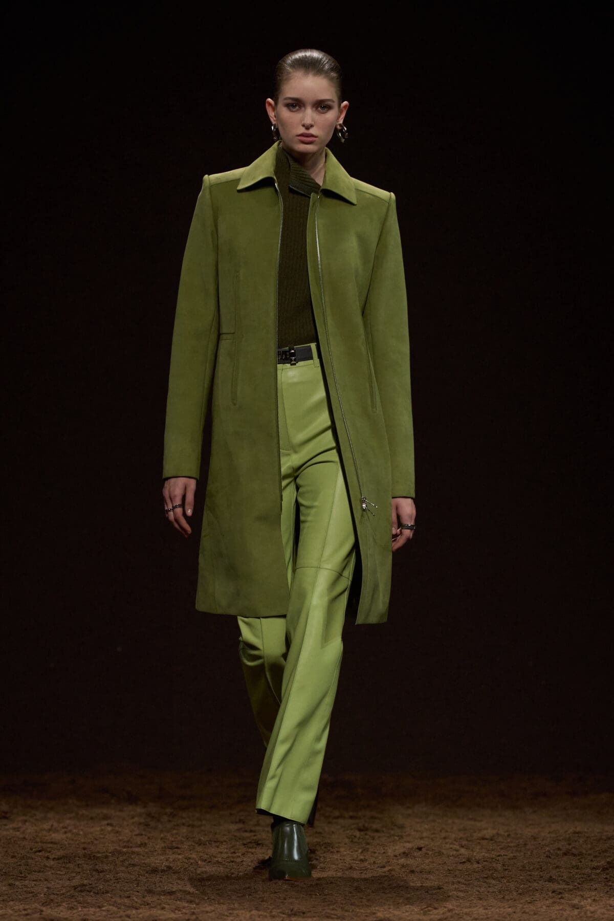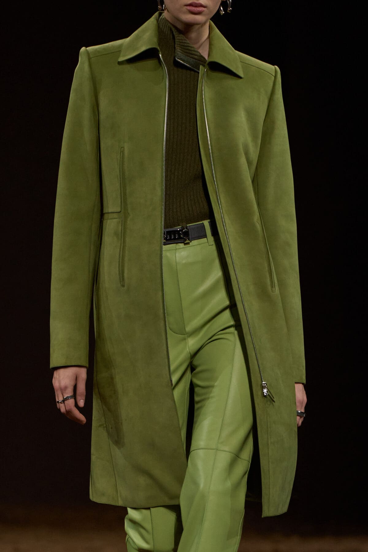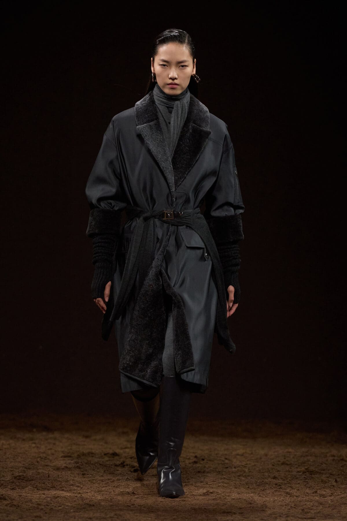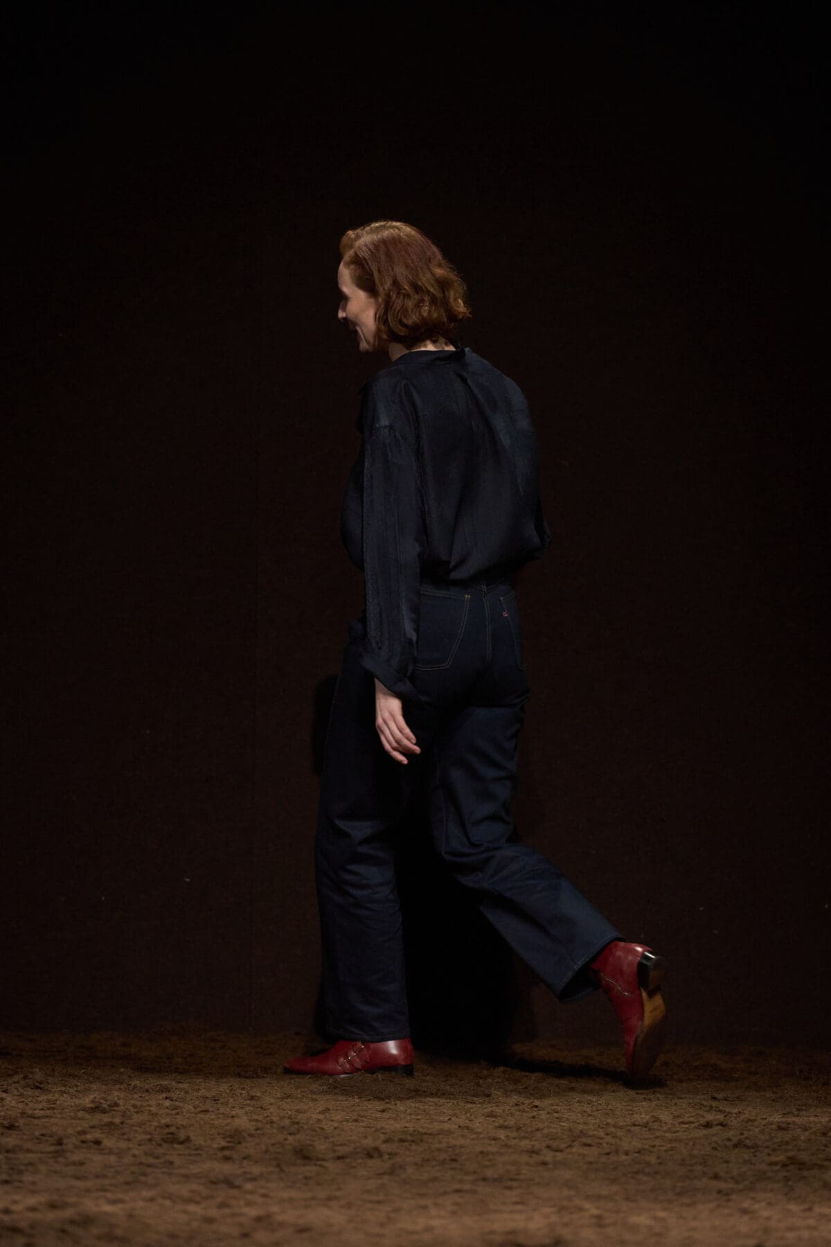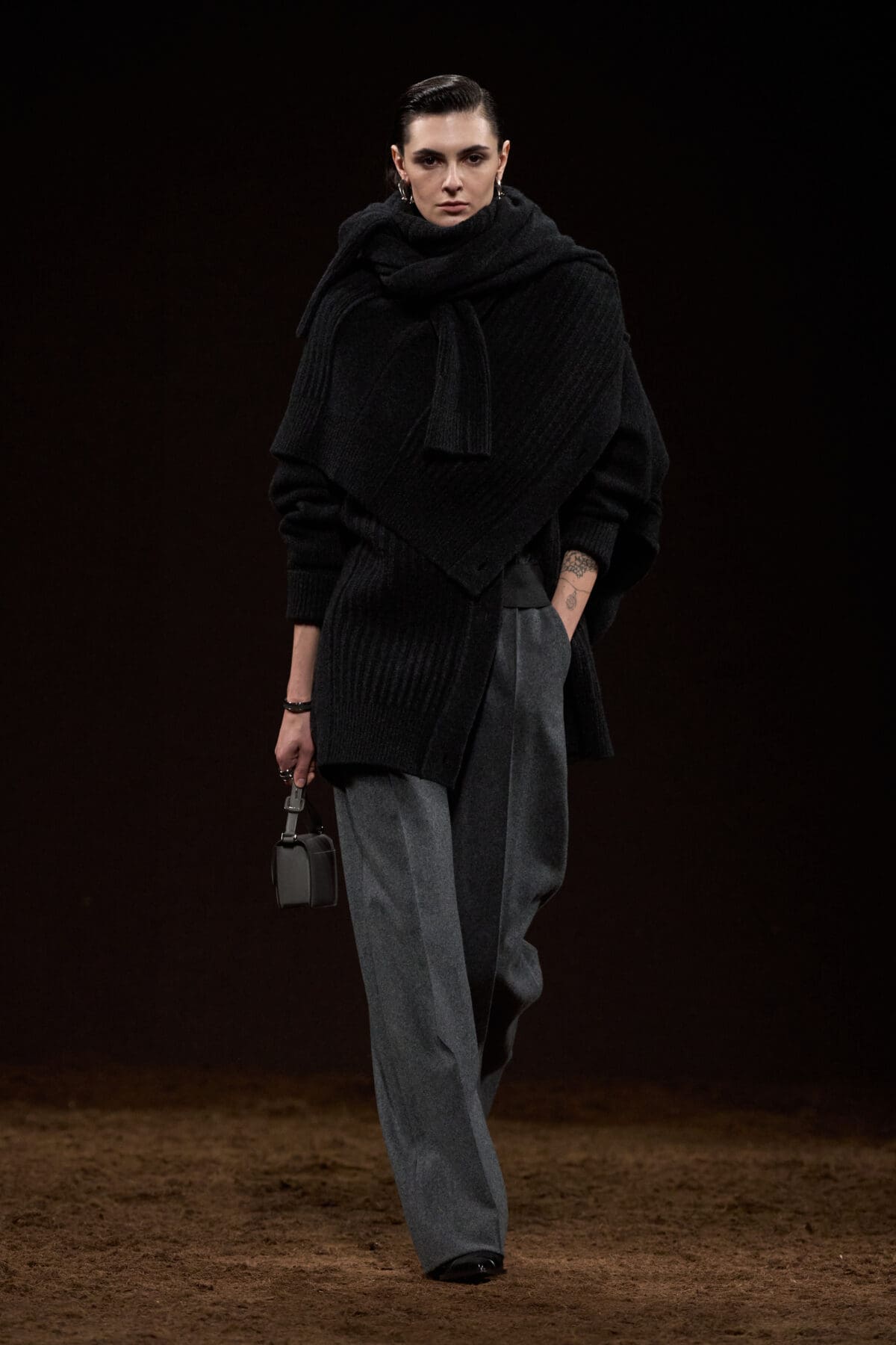 她將這個系列命名為 “Leather Dandy”。到了第六套造型——一件短版絎縫外套,拉鍊敞開露出黑色高領毛衣,搭配高腰窄褲,由光亮的黑色手套皮革製成,展現出一種「馬術騎士」風格——這已經成為Vanhée加入品牌十年來最出色的系列。為甚麼?因為Hermès的核心在於極致精緻的皮革材質與工藝,馬術元素的細膩詮釋,以及令收藏家心動的細節。Vanhée觸及了這些元素中略帶戀物癖的一面,並首次將其從中產階級的框架中解放出來。